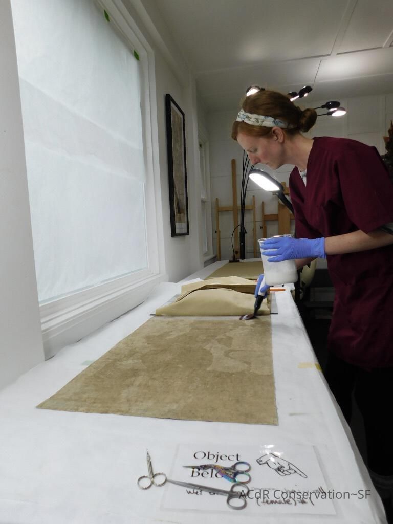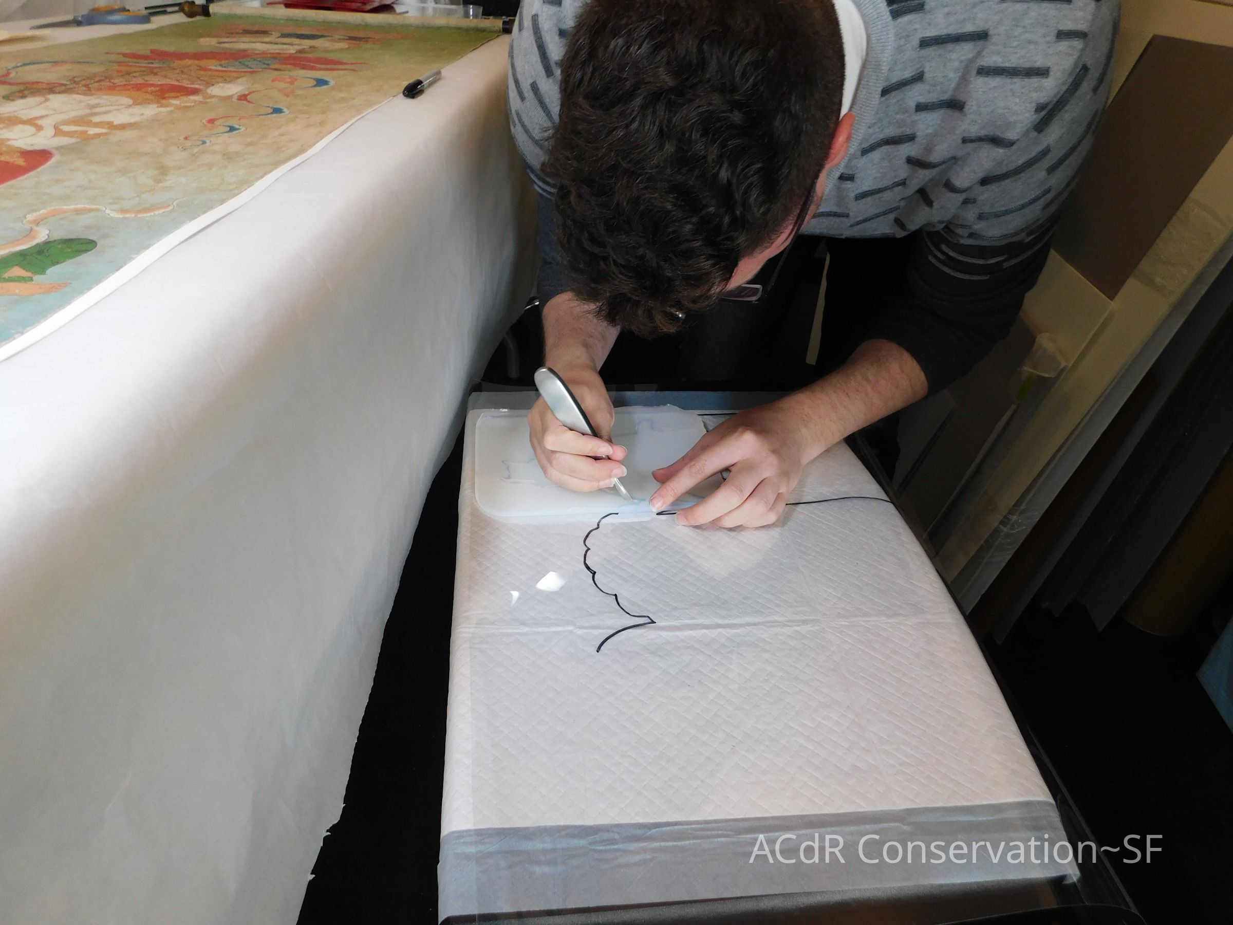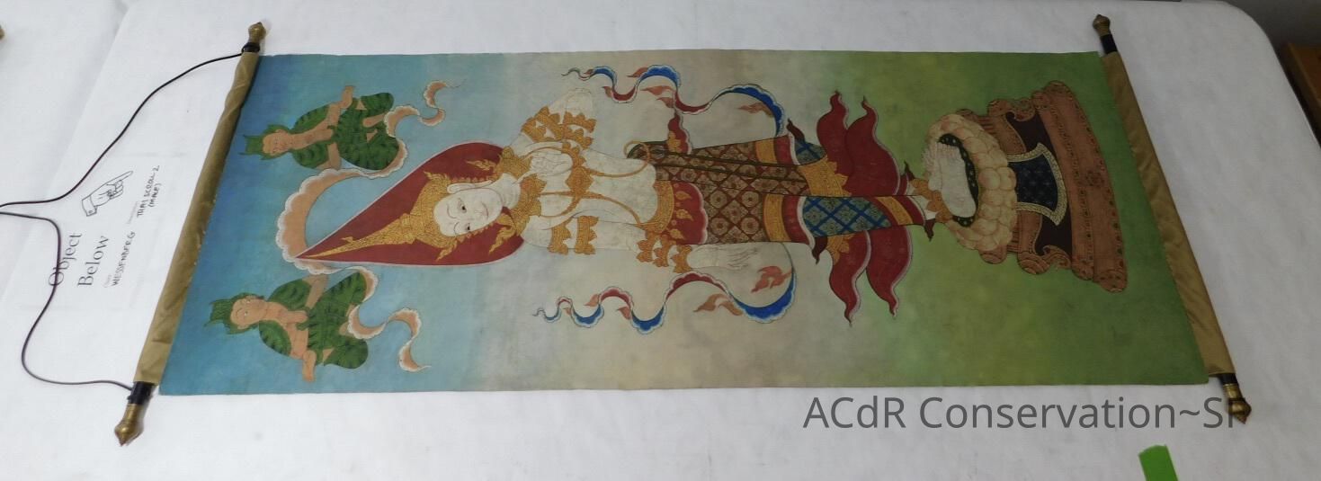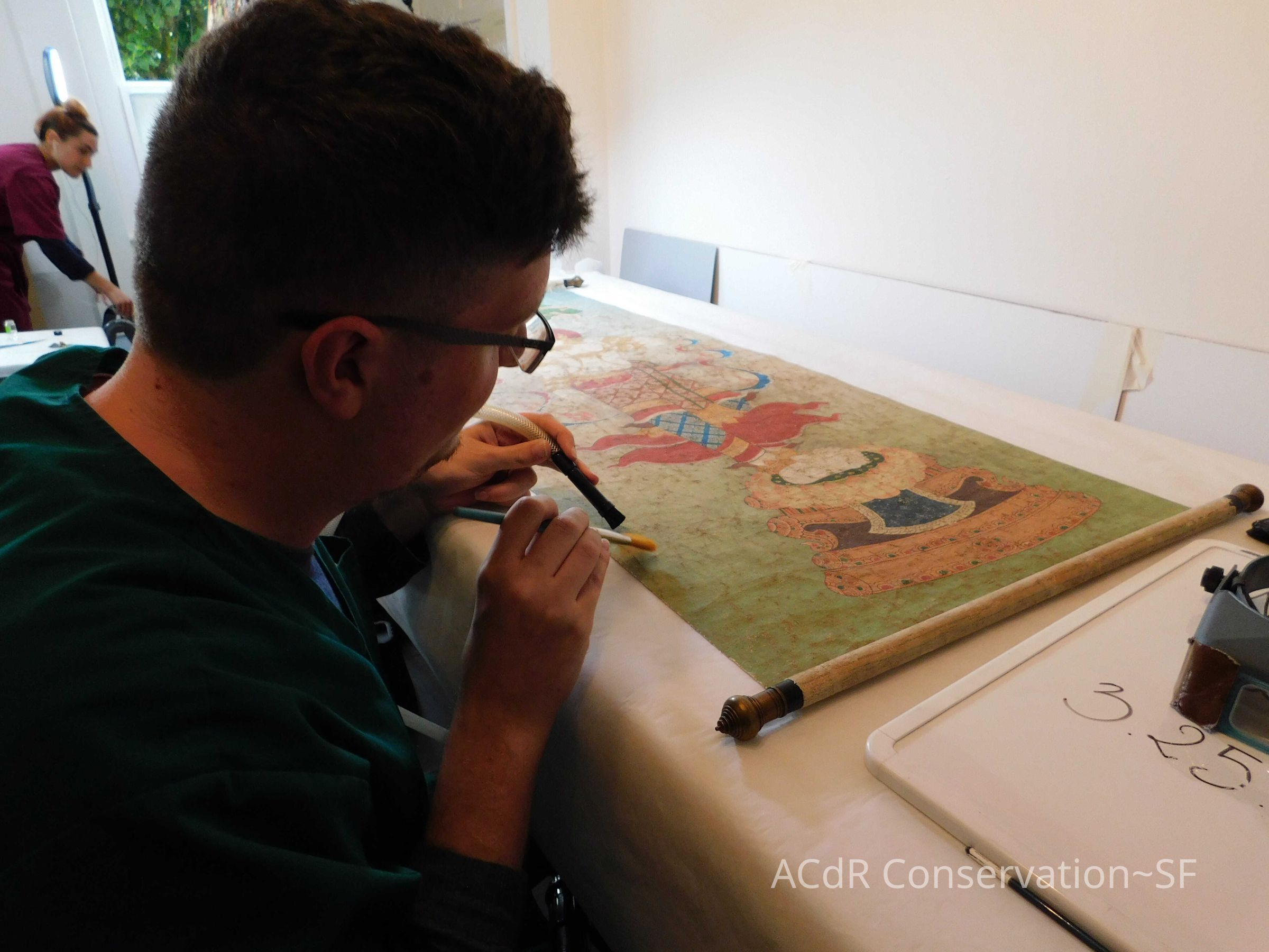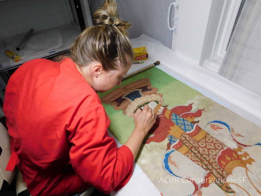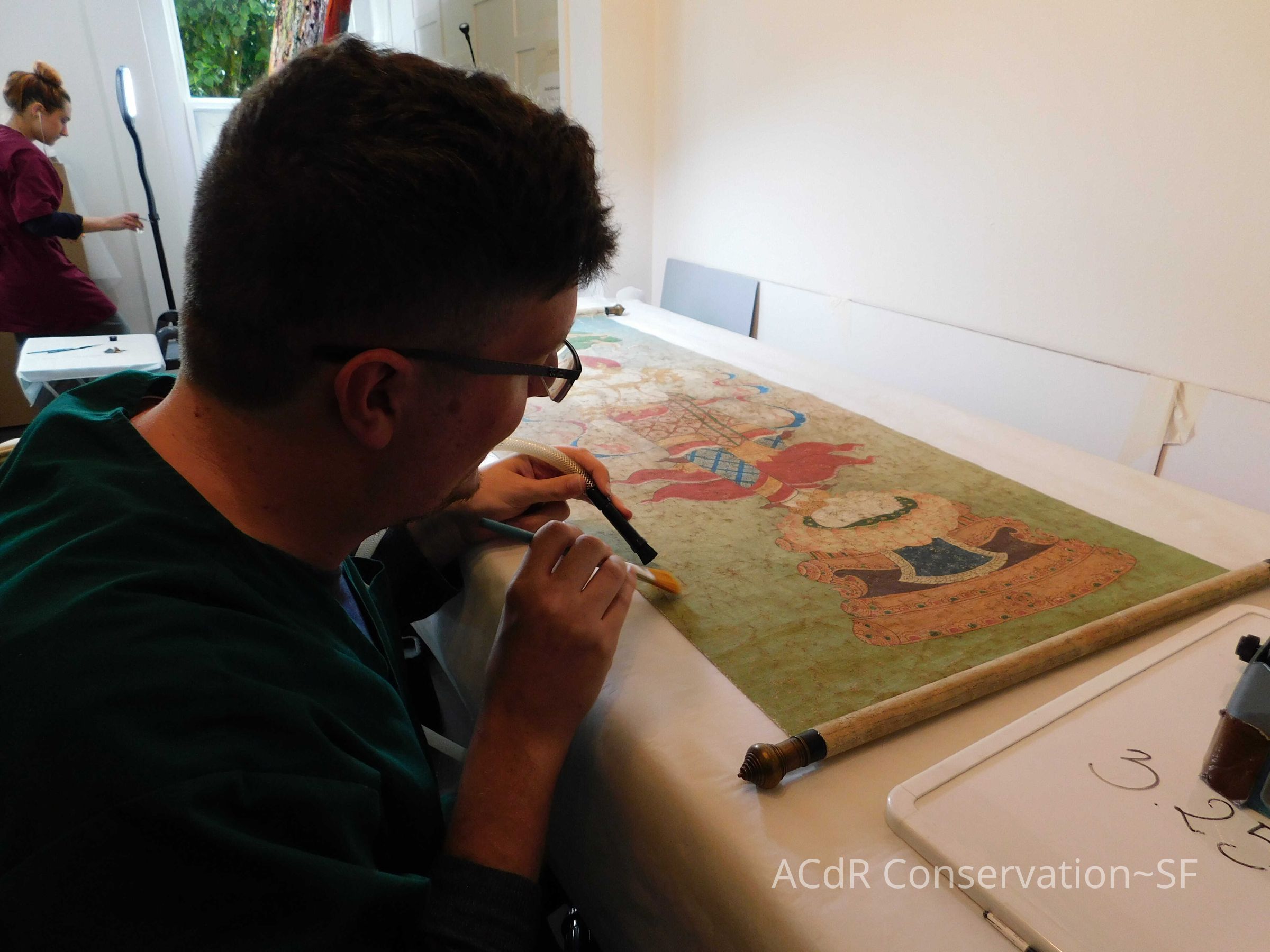 Paint layer consolidation with 3% Klucel in isoproyl on stand and feet area.