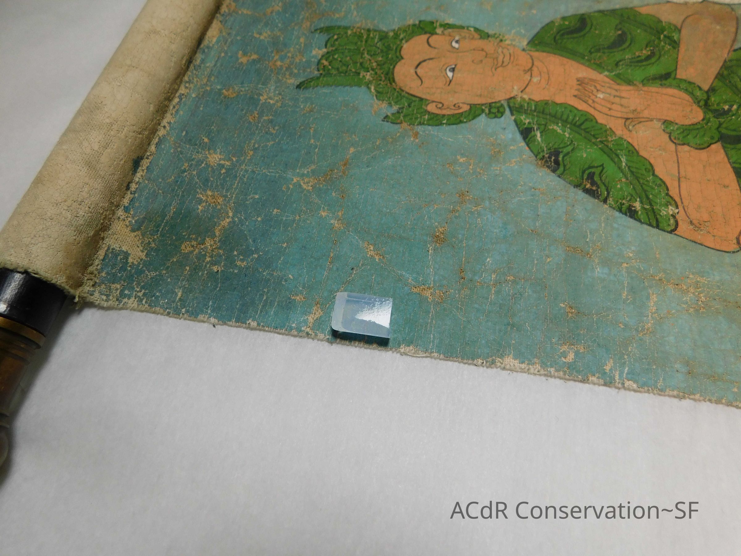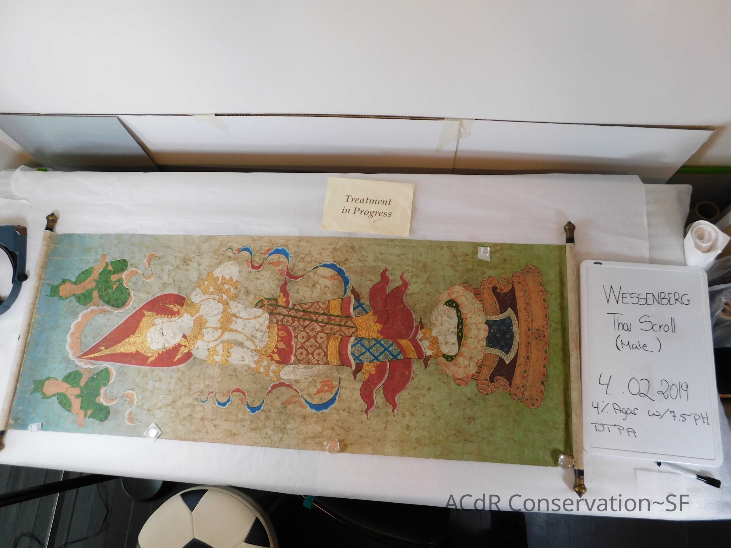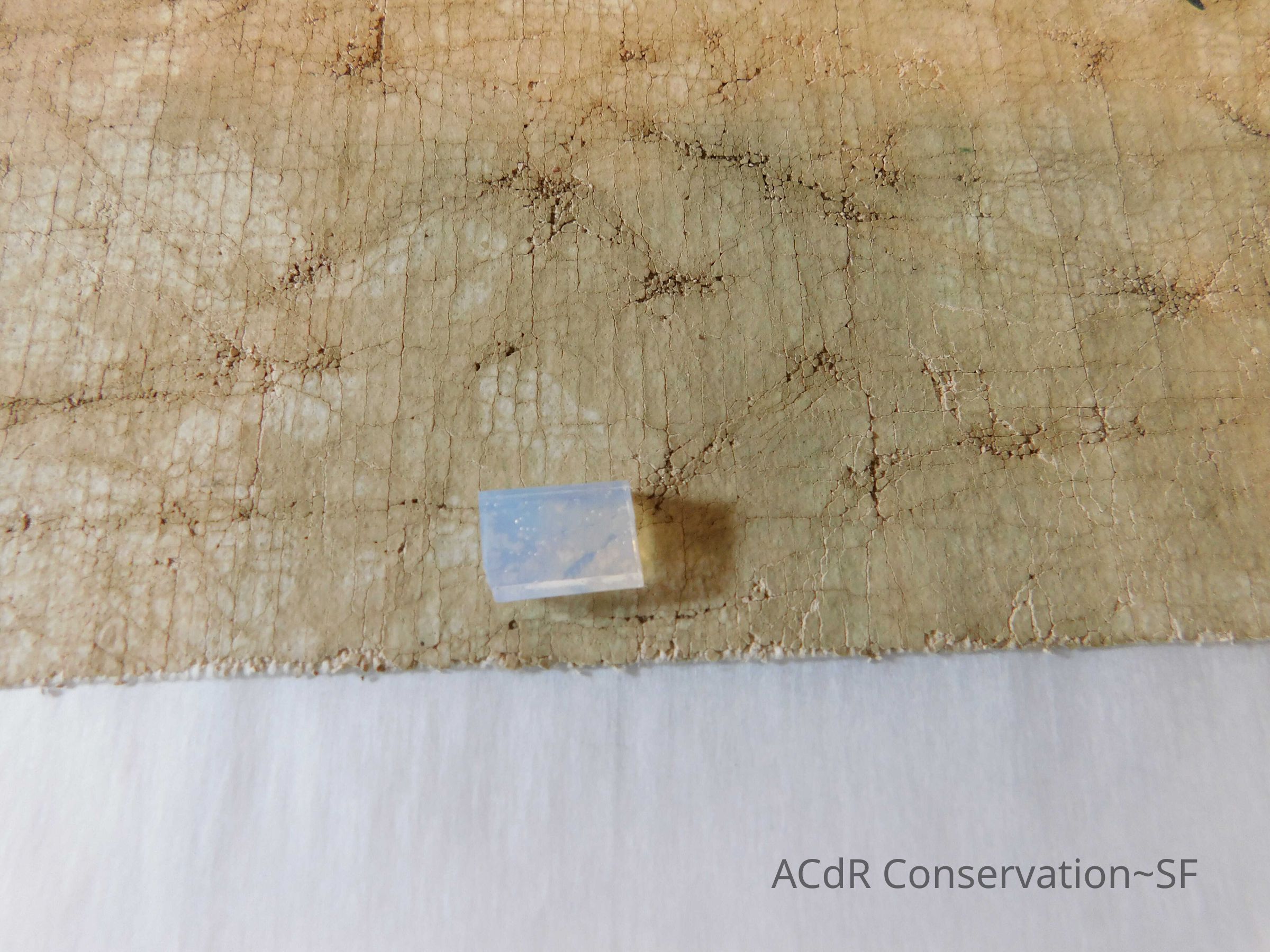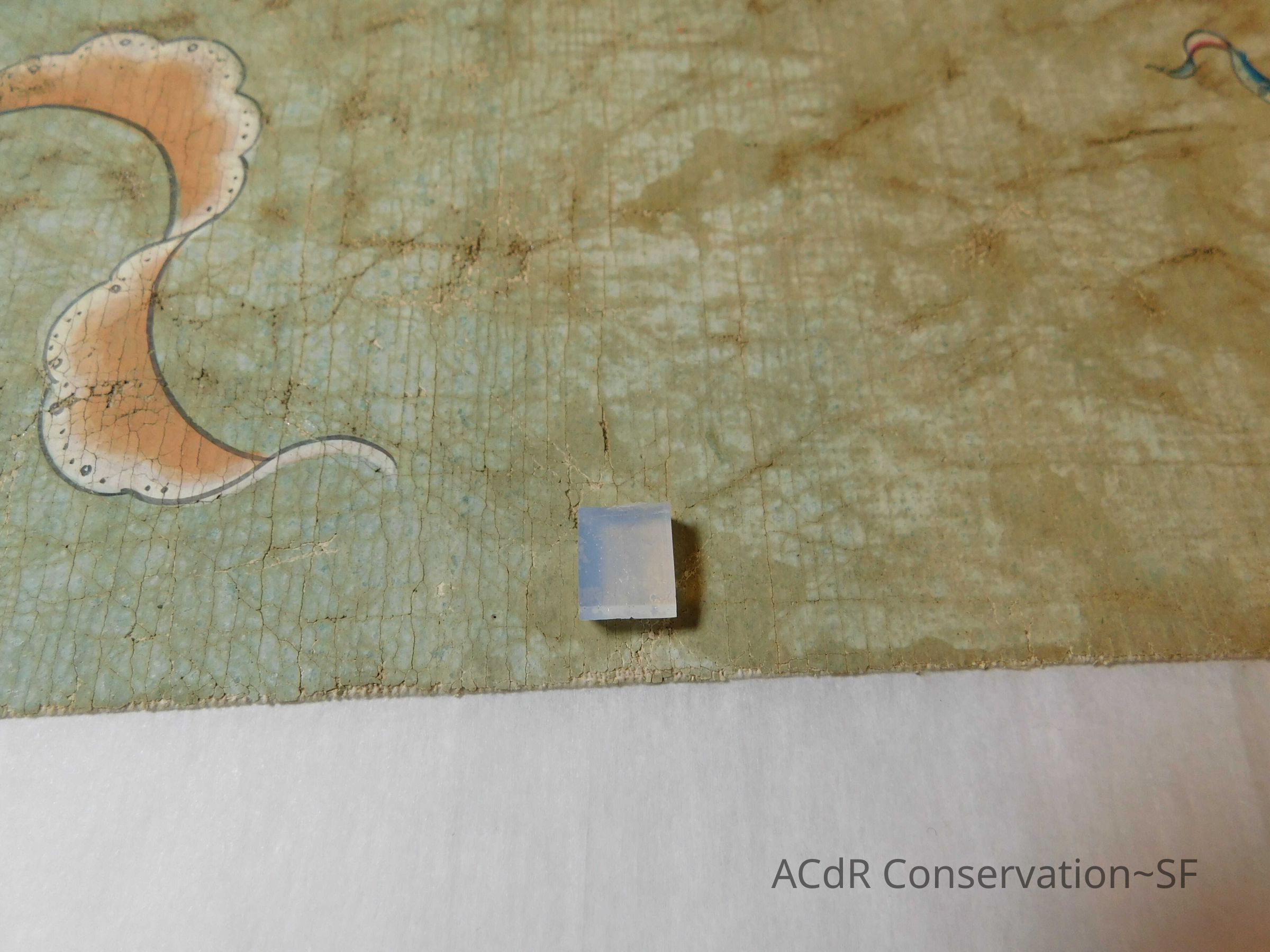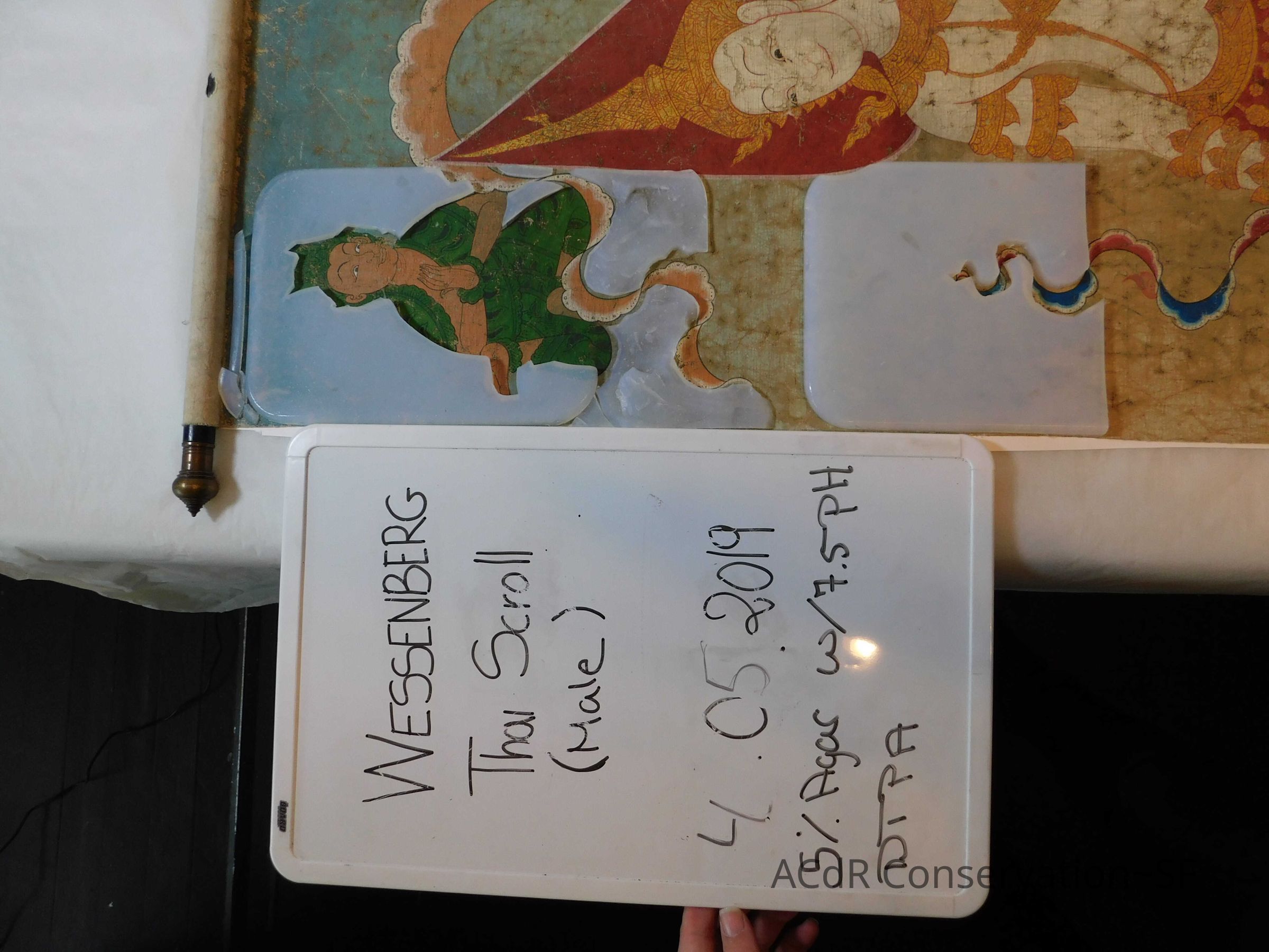 Created agar gel 5% agar, 7.5pH DTPA for cleaning. Made a stencil of mylar for the top third of the scroll to cut gels into same shape. Cut third sheet of gel to apply to upper proper left corner of the scroll - figures are not centered, so another sheet is required. Created more pH7.5 DTPA water for formation of gels. Created 3 sheets of gel and applied (4/8), then removed (4/15) - Swabs were removing blue pigment so it was decided gels were the best course regarless of streaks that would form. Using 7.5 pH DPTA water, applied via swabs to remove dirt from surface.