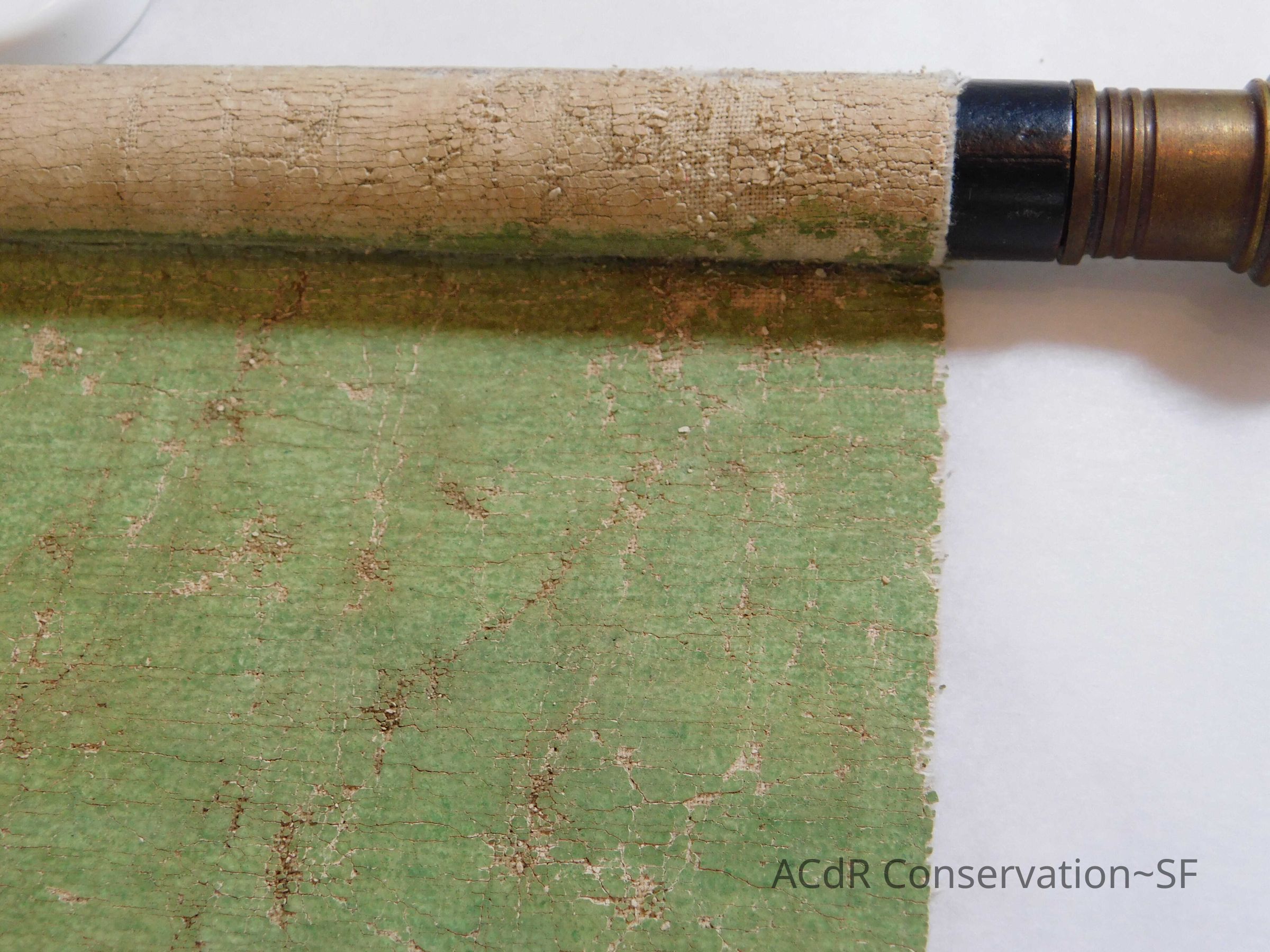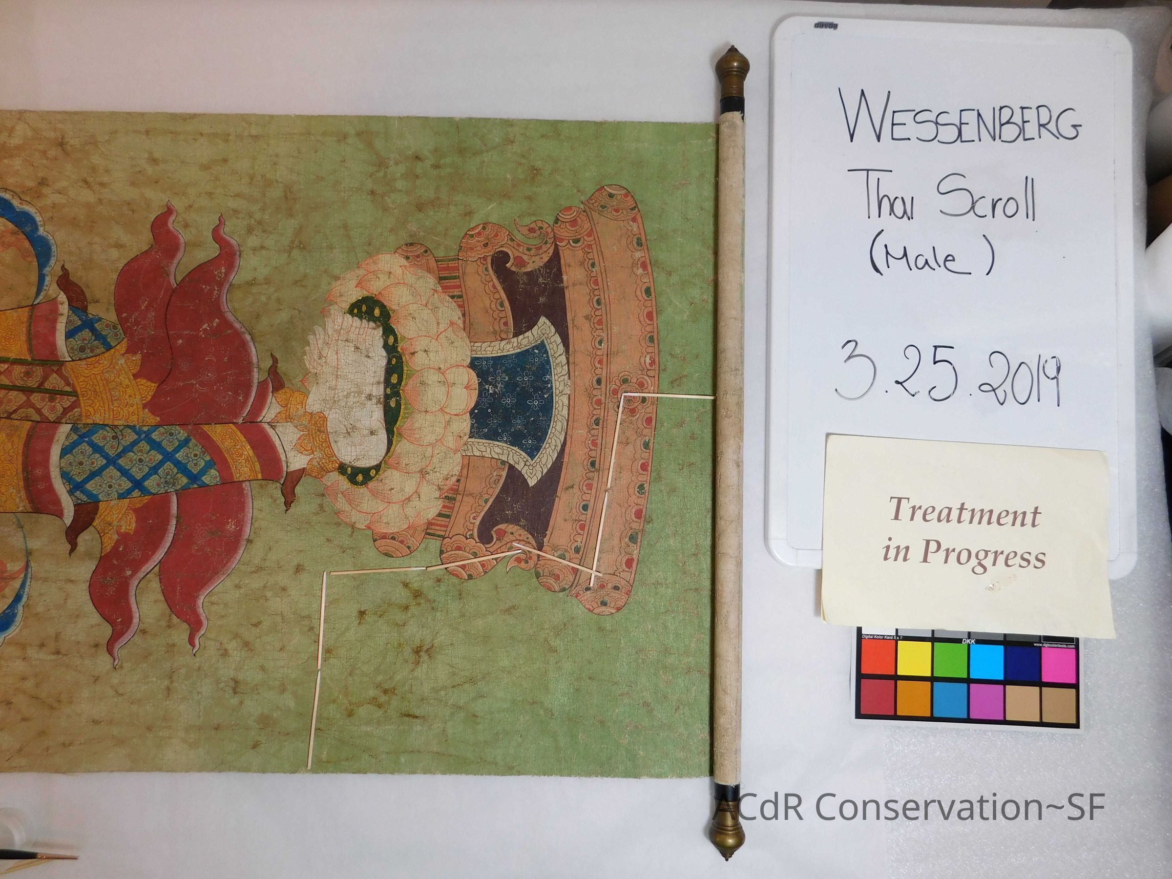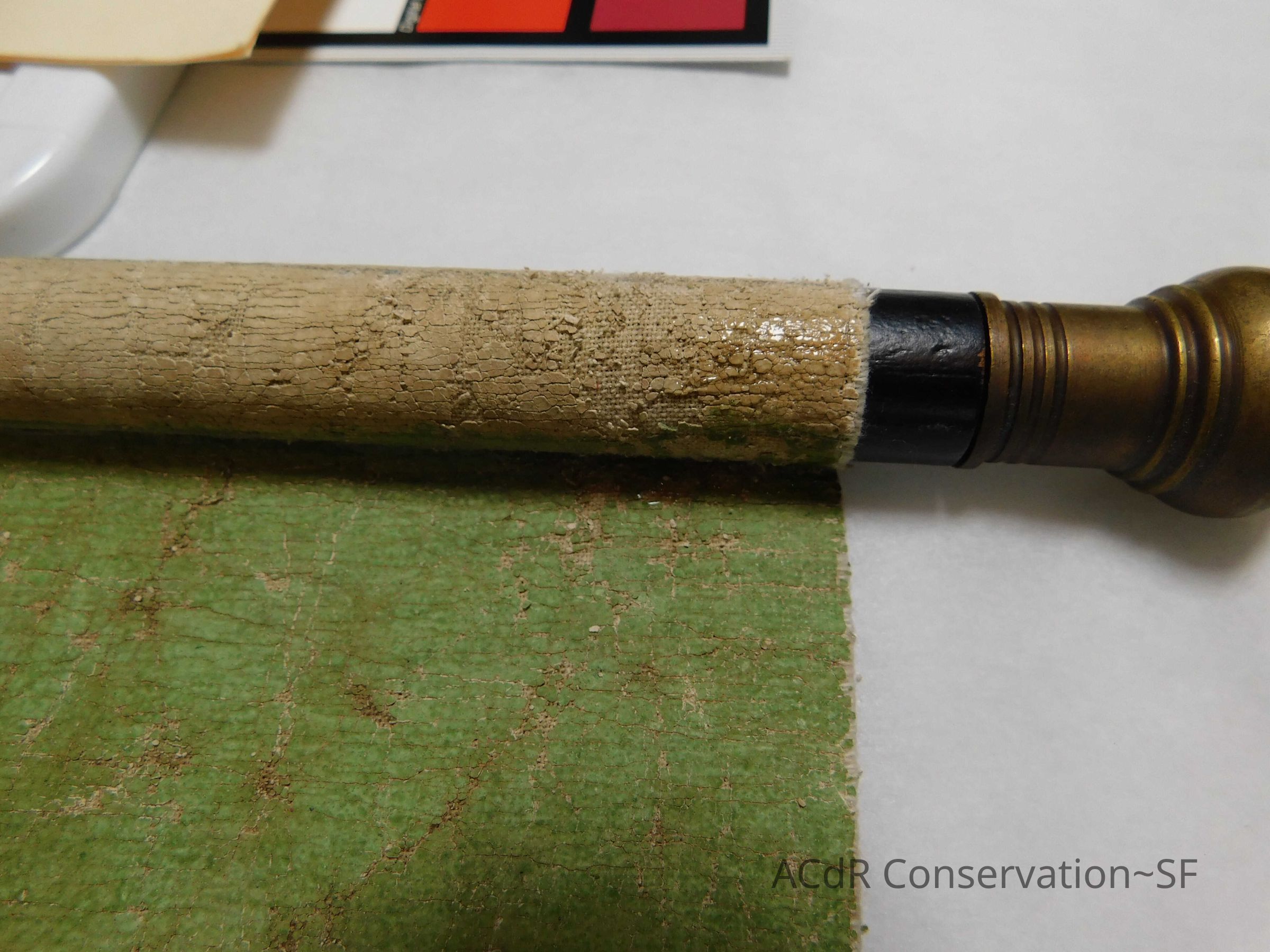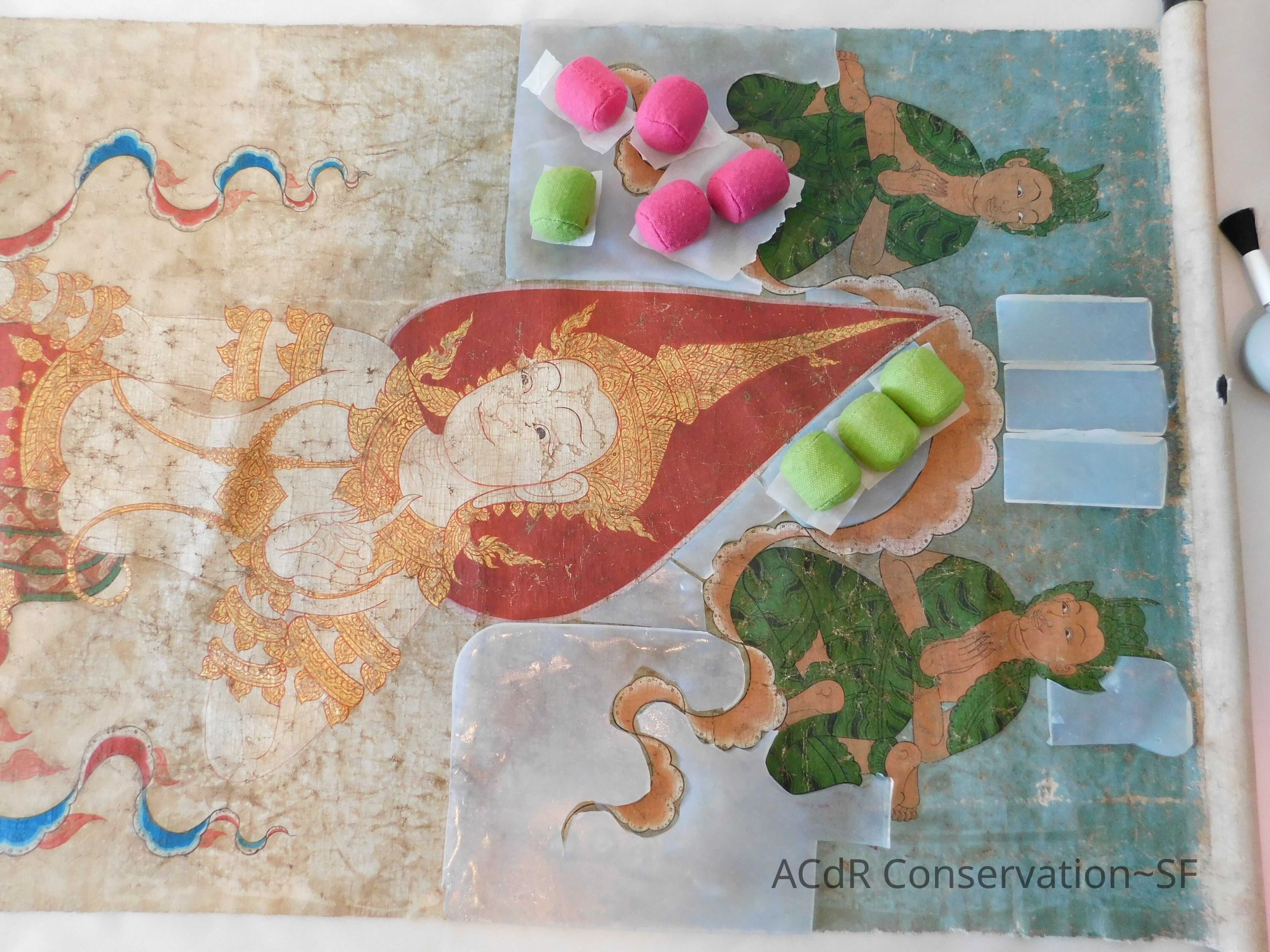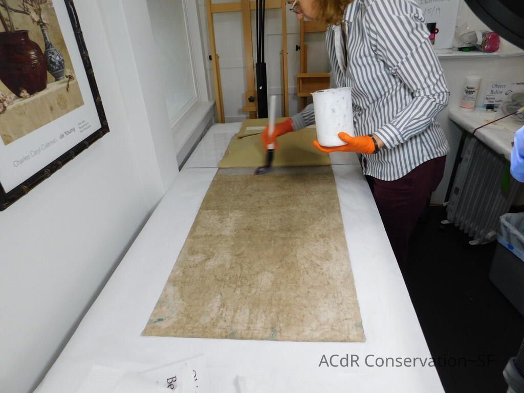 Created agar gel 5% agar, 7.5pH DTPA for cleaning. Made a stencil of mylar for the top third of the scroll to cut gels into same shape. Cut third sheet of gel to apply to upper proper left corner of the scroll - figures are not centered, so another sheet is required. Created more pH7.5 DTPA water for formation of gels. Created 3 sheets of gel and applied (4/8), then removed (4/15) - Swabs were removing blue pigment so it was decided gels were the best course regarless of streaks that would form. Using 7.5 pH DPTA water, applied via swabs to remove dirt from surface.