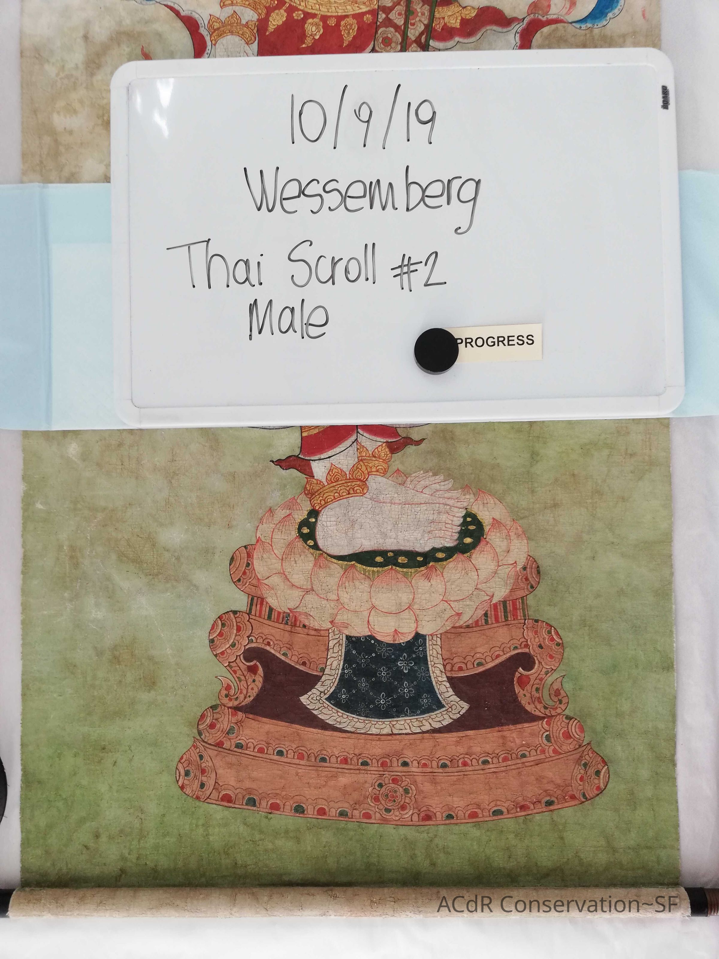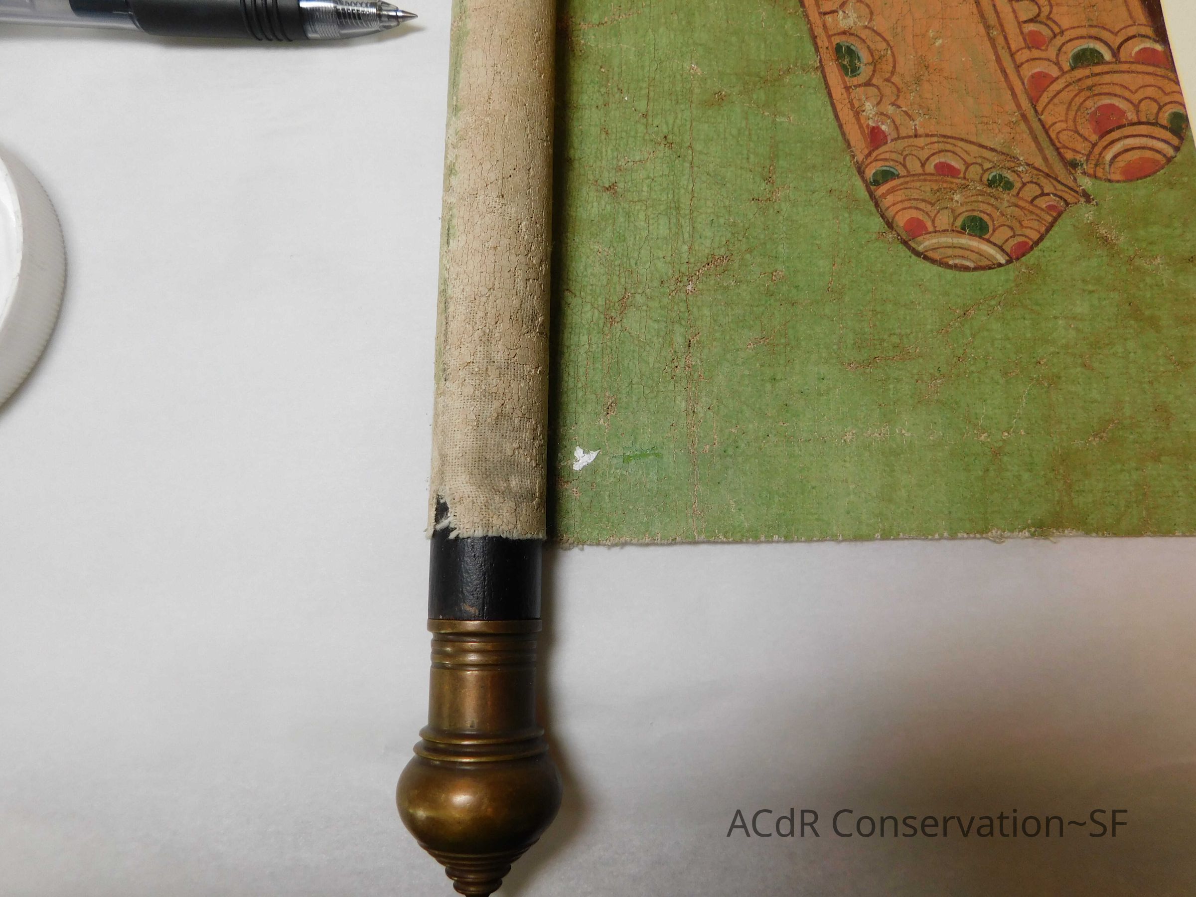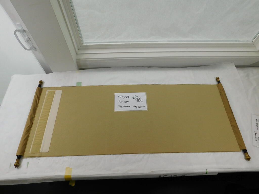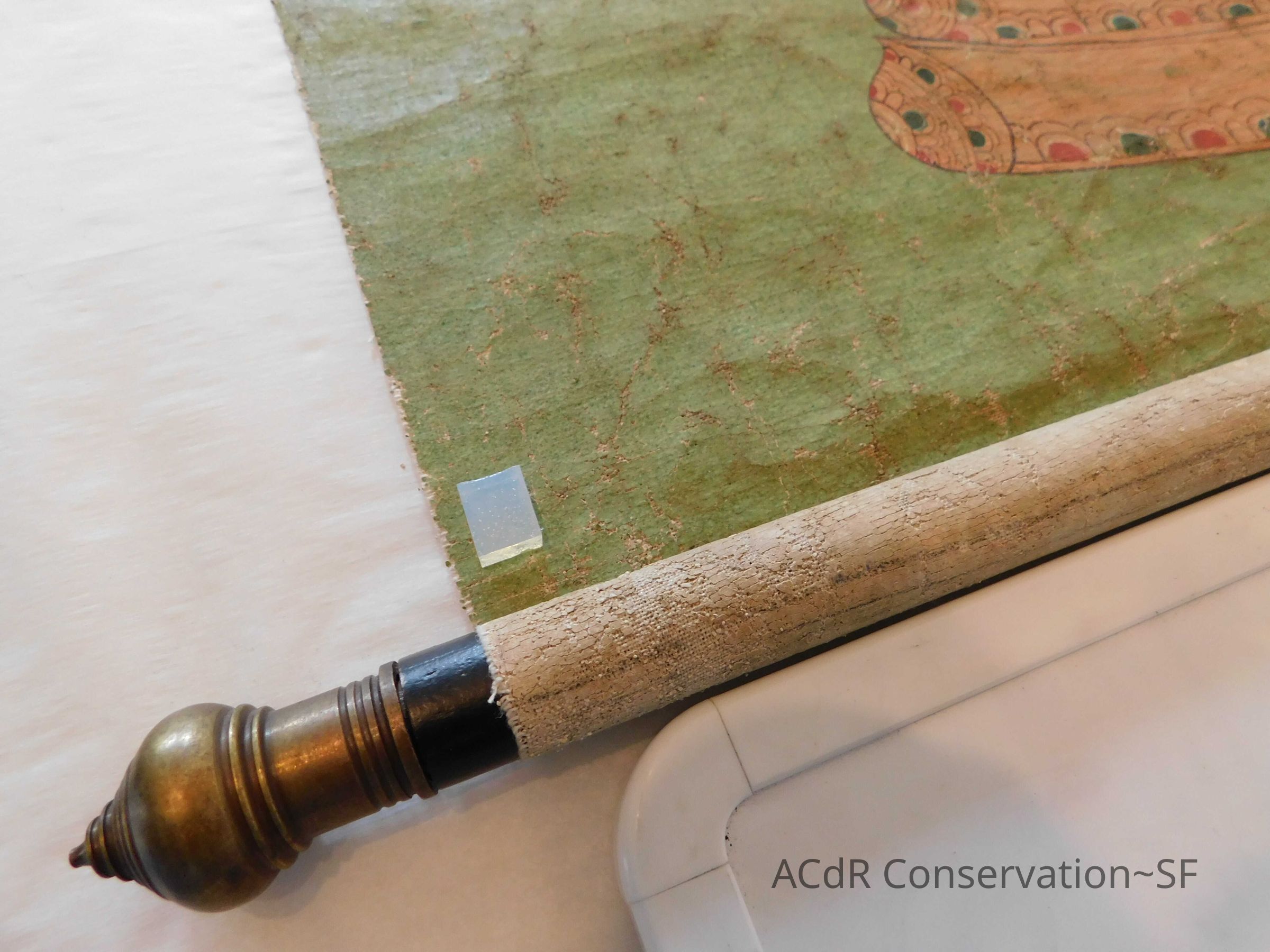 Created agar gel 5% agar, 7.5pH DTPA for cleaning. Made a stencil of mylar for the top third of the scroll to cut gels into same shape. Cut third sheet of gel to apply to upper proper left corner of the scroll - figures are not centered, so another sheet is required. Created more pH7.5 DTPA water for formation of gels. Created 3 sheets of gel and applied (4/8), then removed (4/15) - Swabs were removing blue pigment so it was decided gels were the best course regarless of streaks that would form. Using 7.5 pH DPTA water, applied via swabs to remove dirt from surface.