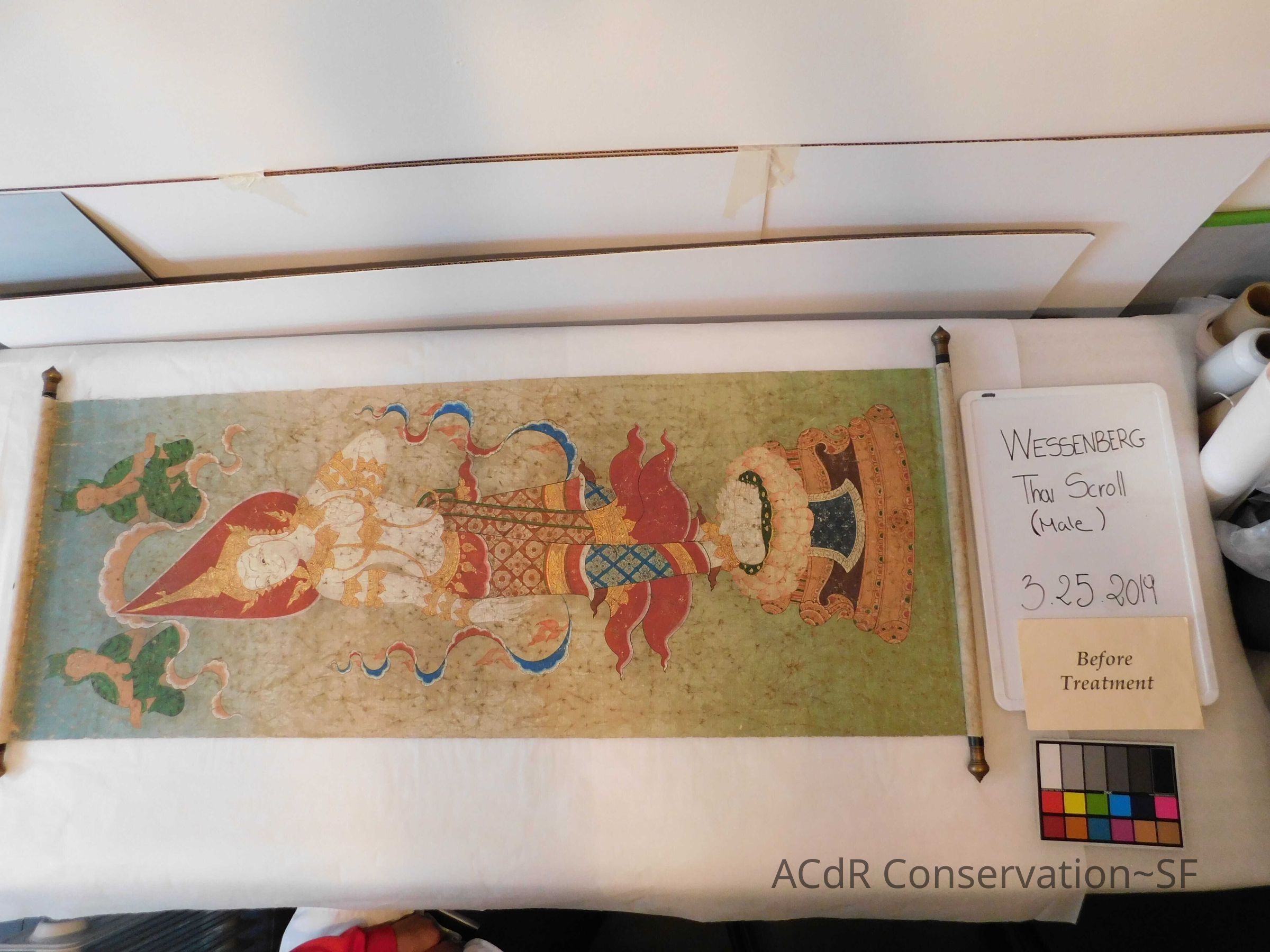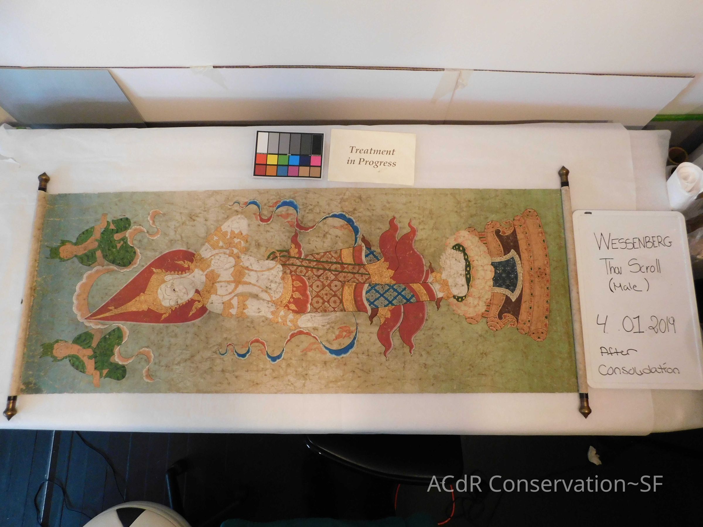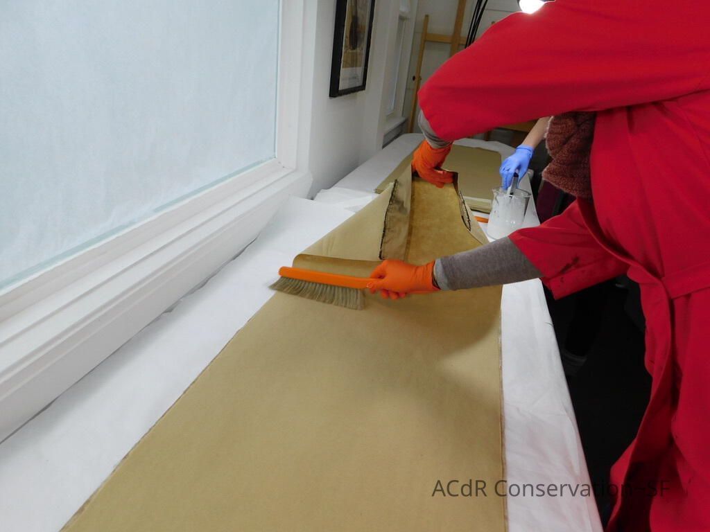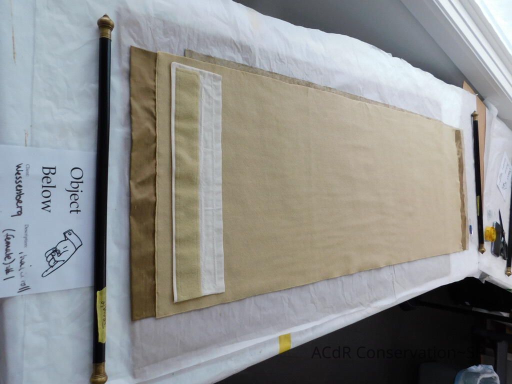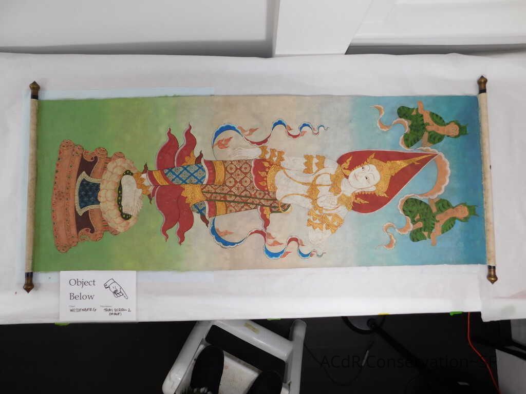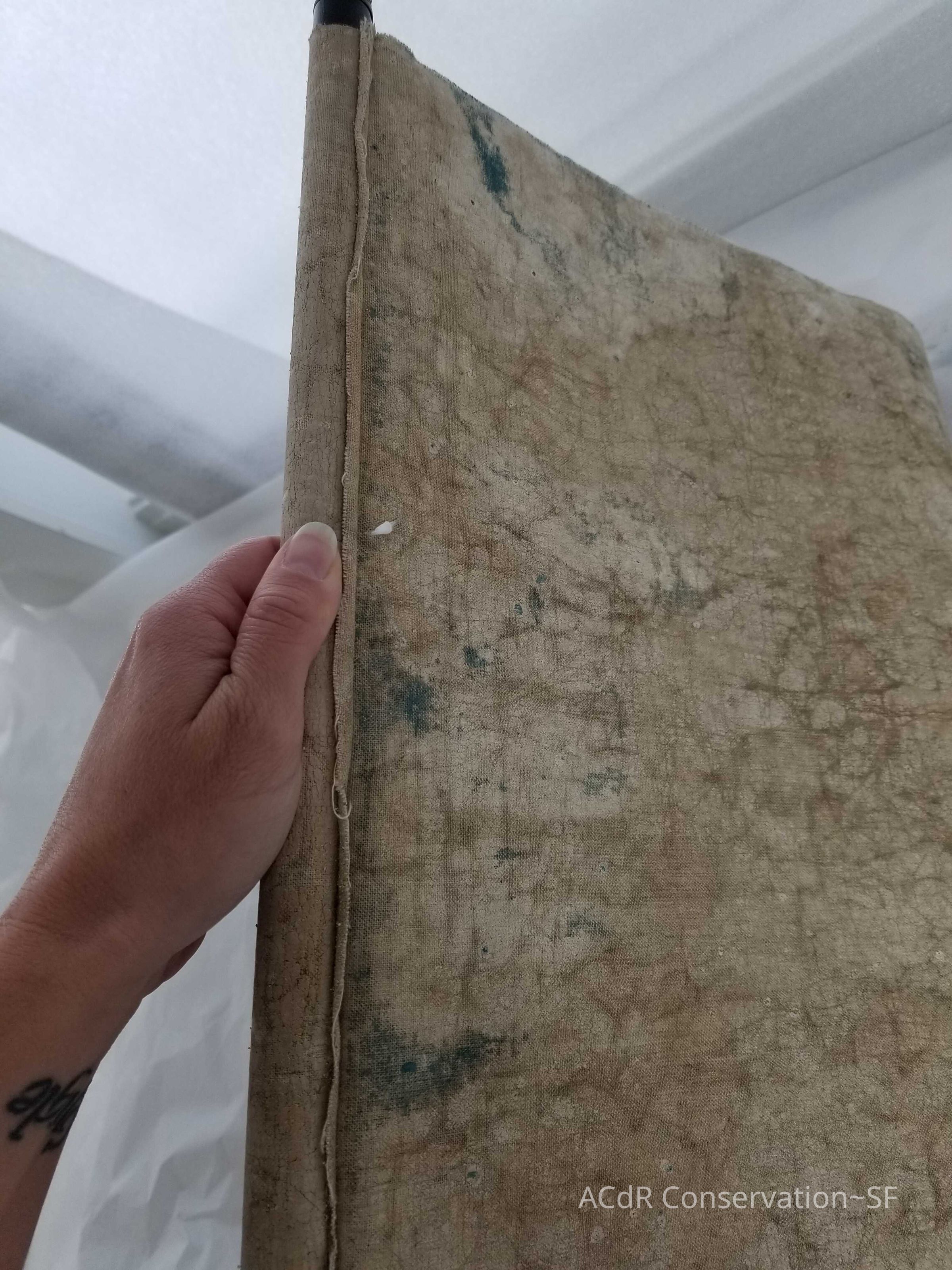 Created agar gel 5% agar, 7.5pH DTPA for cleaning. Made a stencil of mylar for the top third of the scroll to cut gels into same shape. Cut third sheet of gel to apply to upper proper left corner of the scroll - figures are not centered, so another sheet is required. Created more pH7.5 DTPA water for formation of gels. Created 3 sheets of gel and applied (4/8), then removed (4/15) - Swabs were removing blue pigment so it was decided gels were the best course regarless of streaks that would form. Using 7.5 pH DPTA water, applied via swabs to remove dirt from surface.