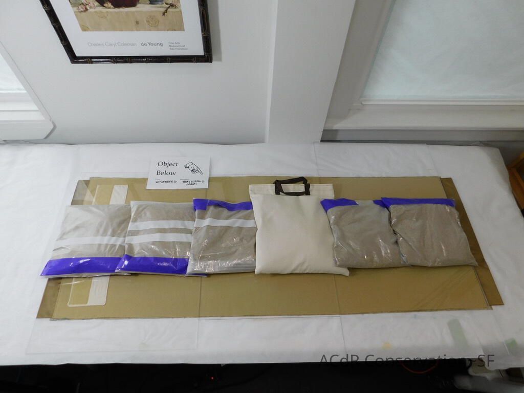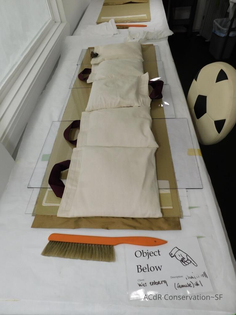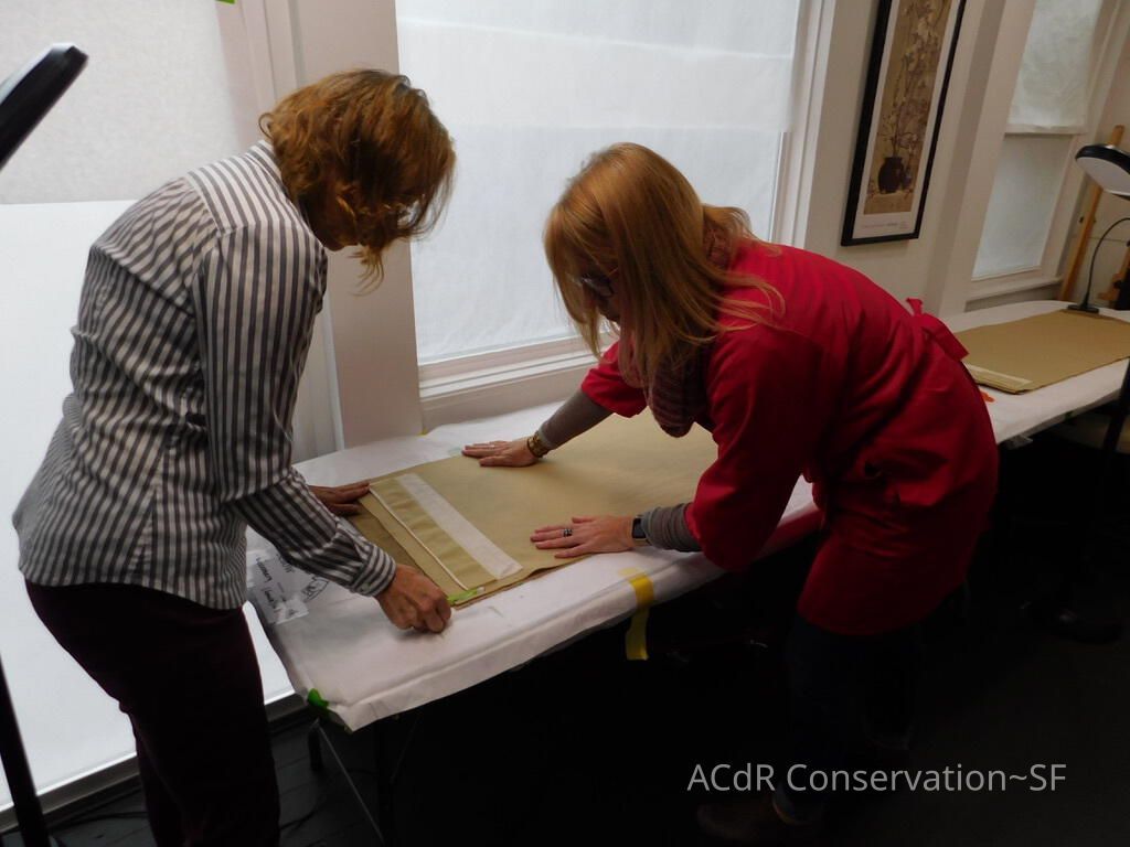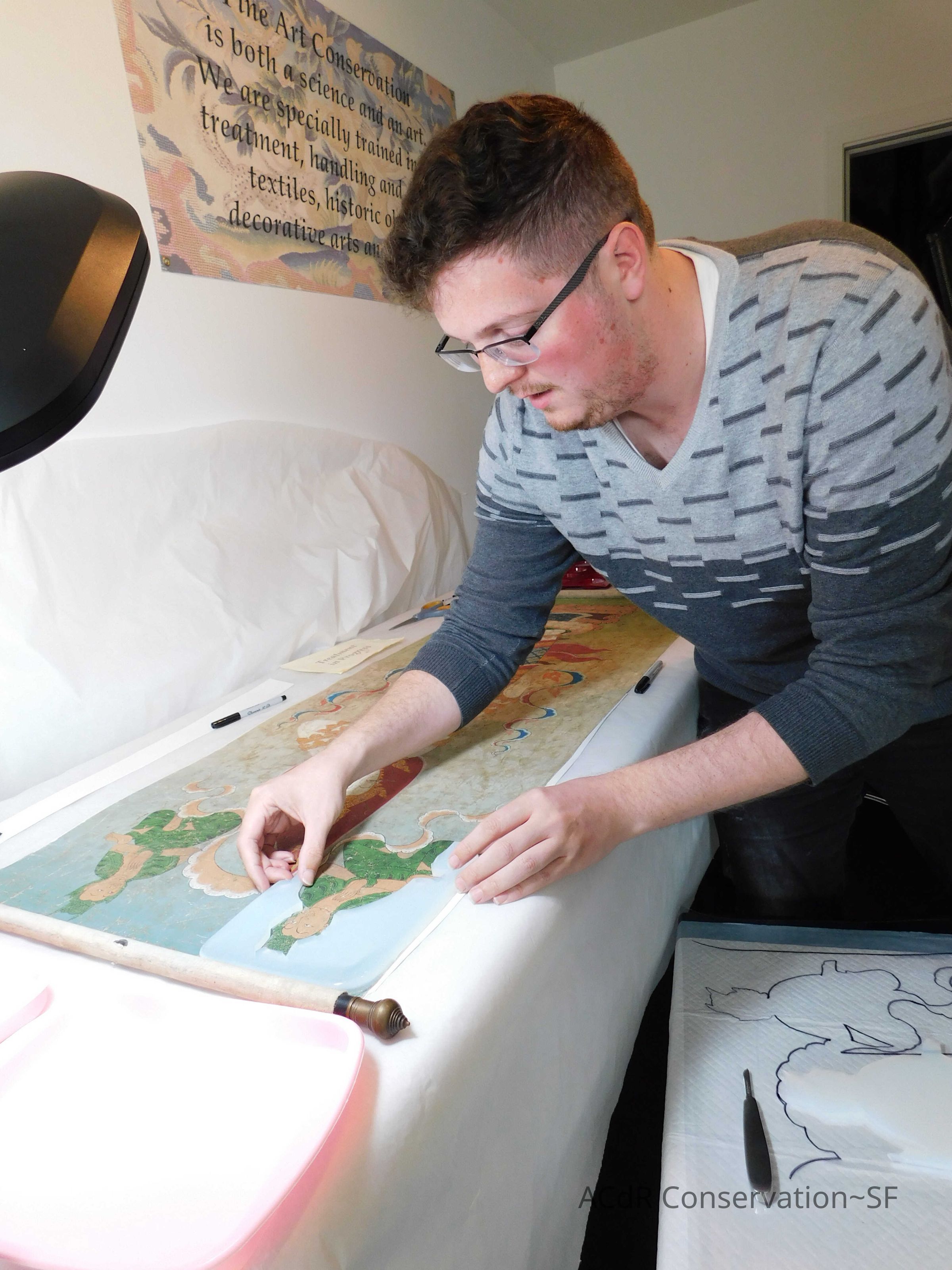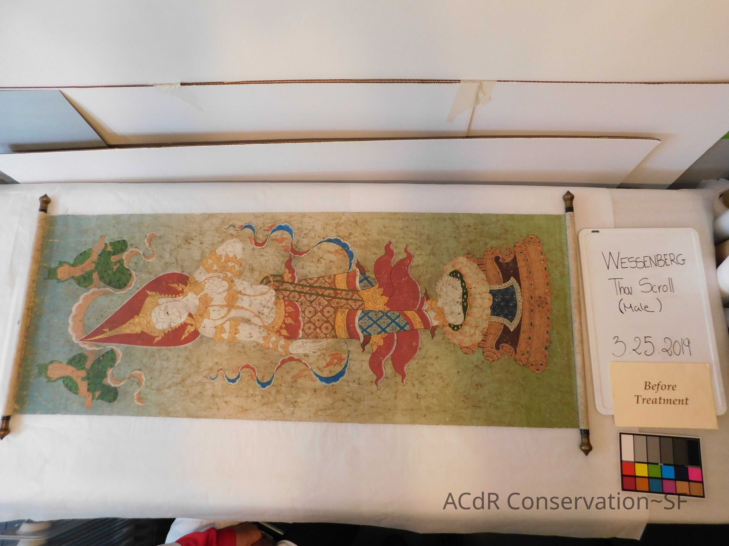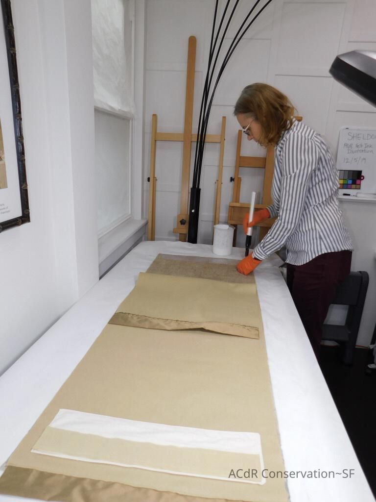 Created agar gel 5% agar, 7.5pH DTPA for cleaning. Made a stencil of mylar for the top third of the scroll to cut gels into same shape. Cut third sheet of gel to apply to upper proper left corner of the scroll - figures are not centered, so another sheet is required. Created more pH7.5 DTPA water for formation of gels. Created 3 sheets of gel and applied (4/8), then removed (4/15) - Swabs were removing blue pigment so it was decided gels were the best course regarless of streaks that would form. Using 7.5 pH DPTA water, applied via swabs to remove dirt from surface.