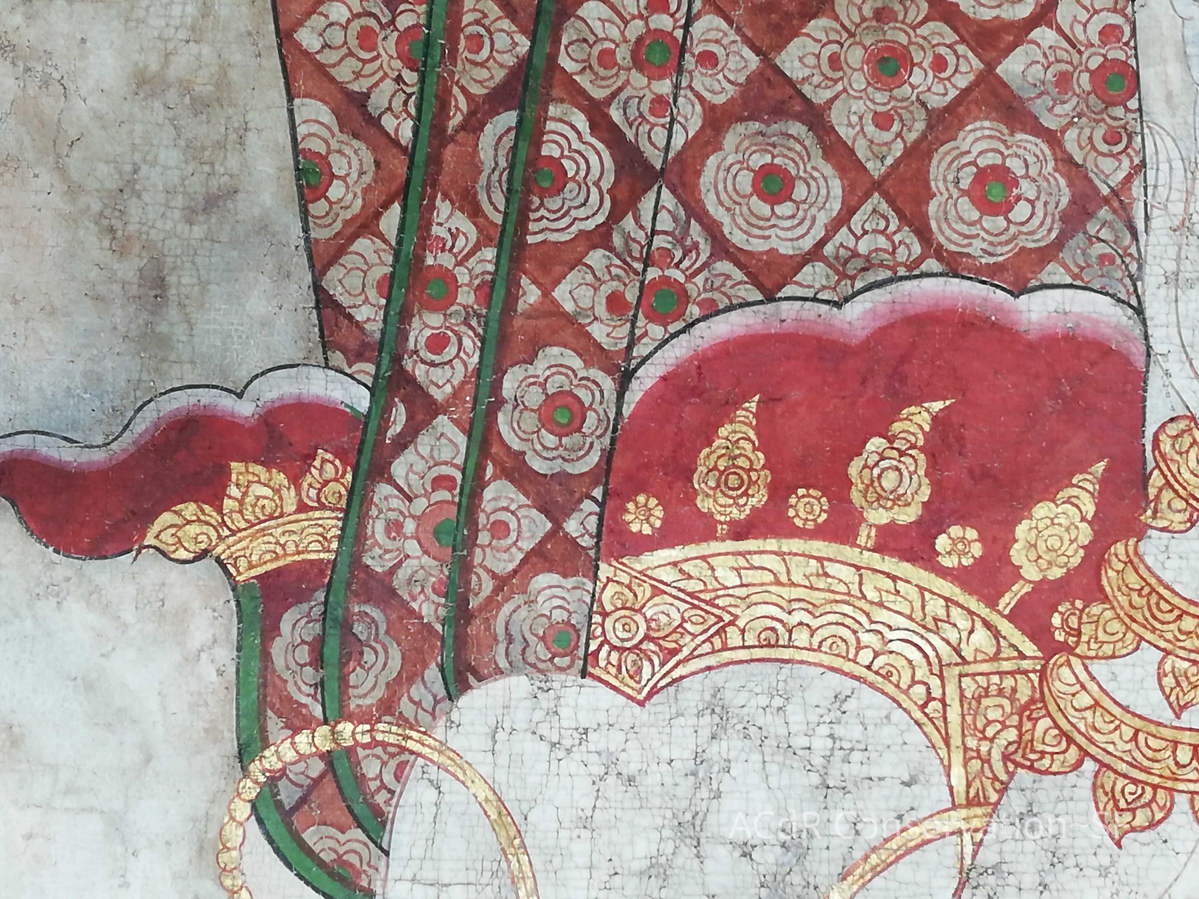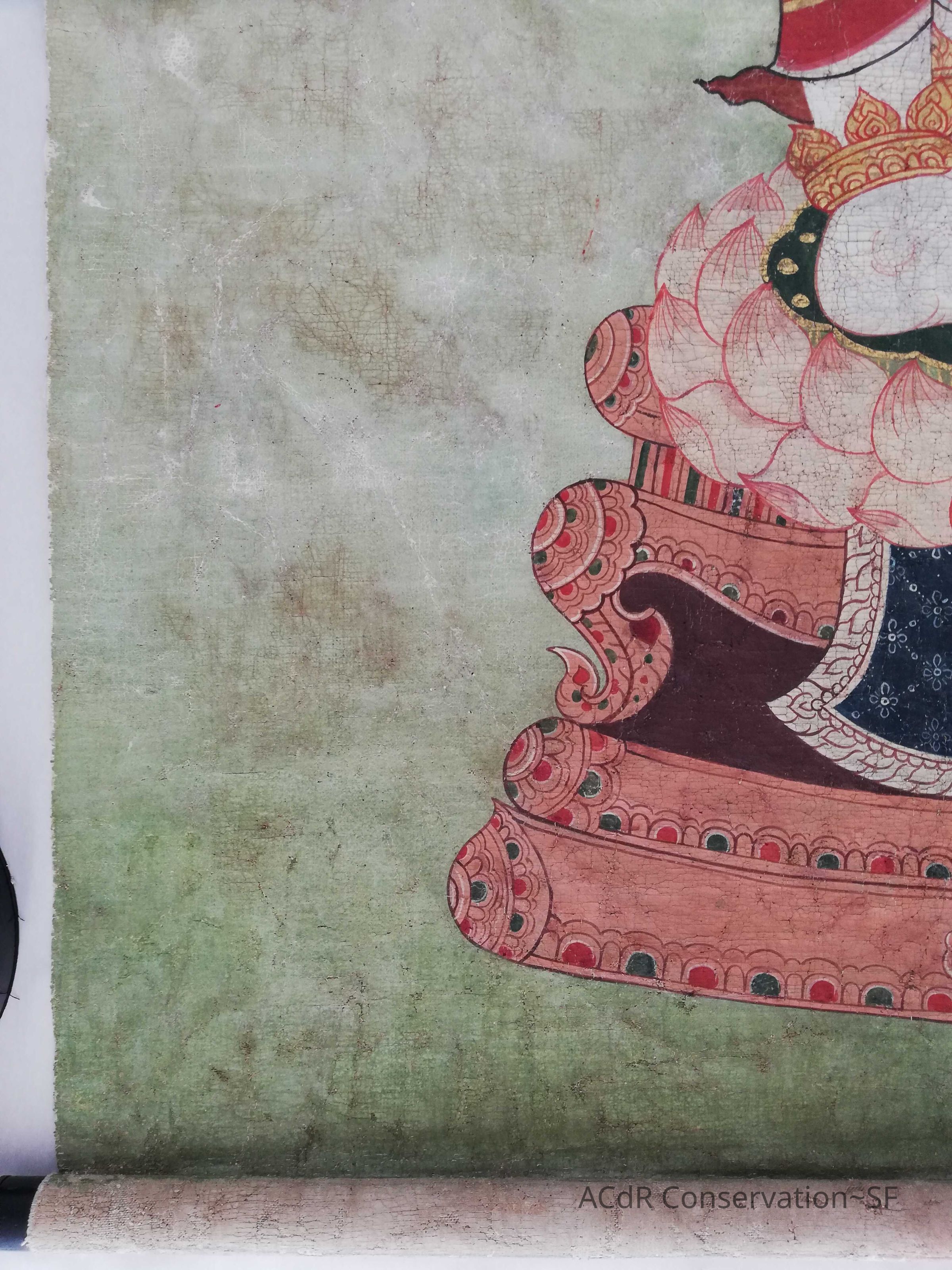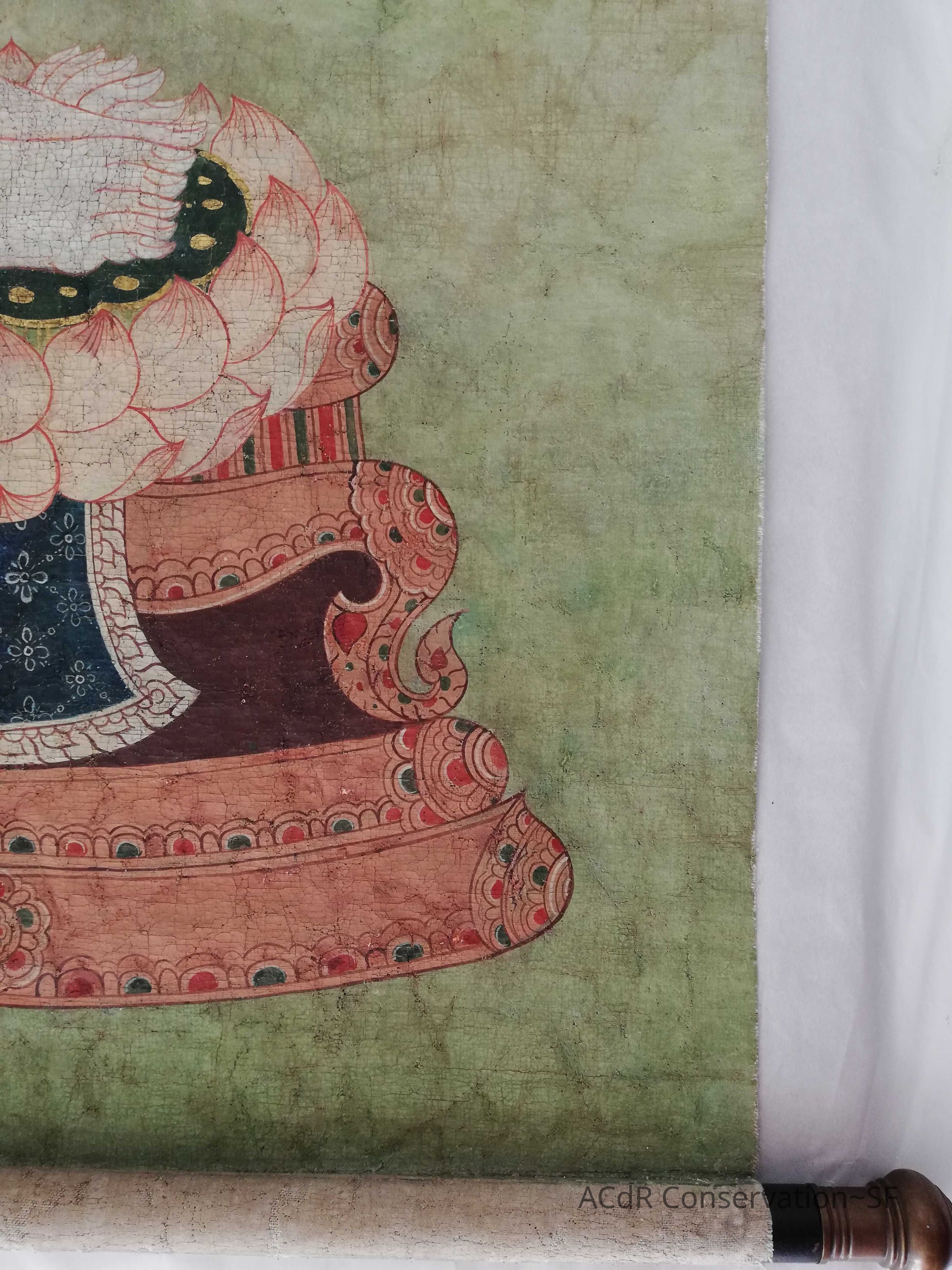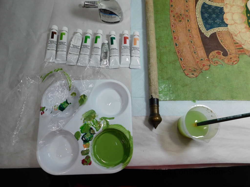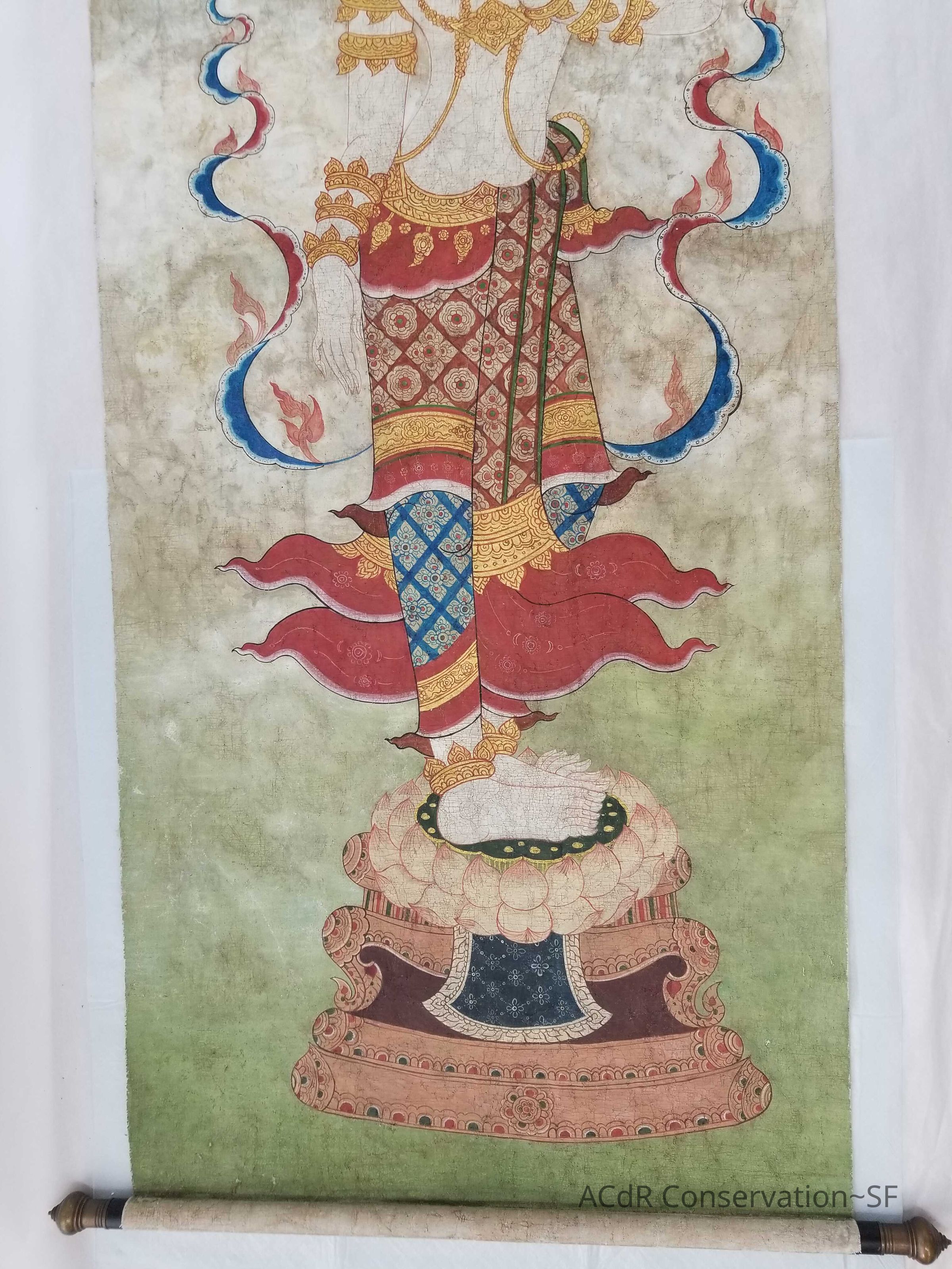 Filling and retouching feet. Removed some of the previous darker in-painting and retouching again, near the base. Rouched base and green background. Filled body and face with clear gesso, retouching golden parts, starting from bottom. Finished retouching golden parts, retouched body and face. Retouched red dress part. Retouched throughout figure.