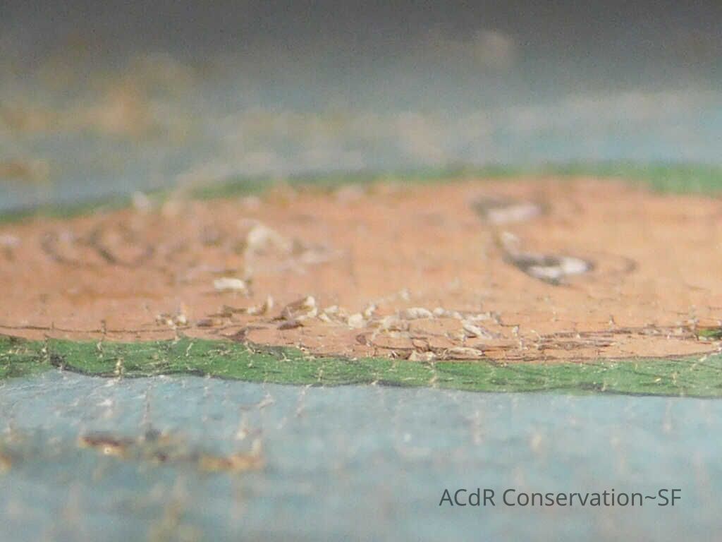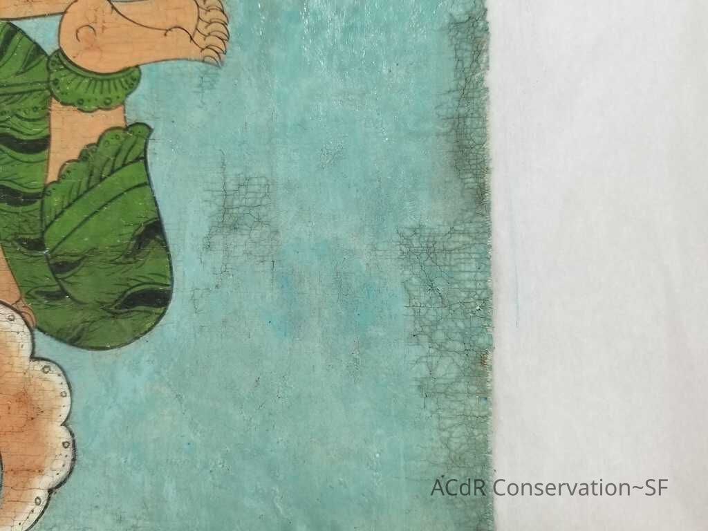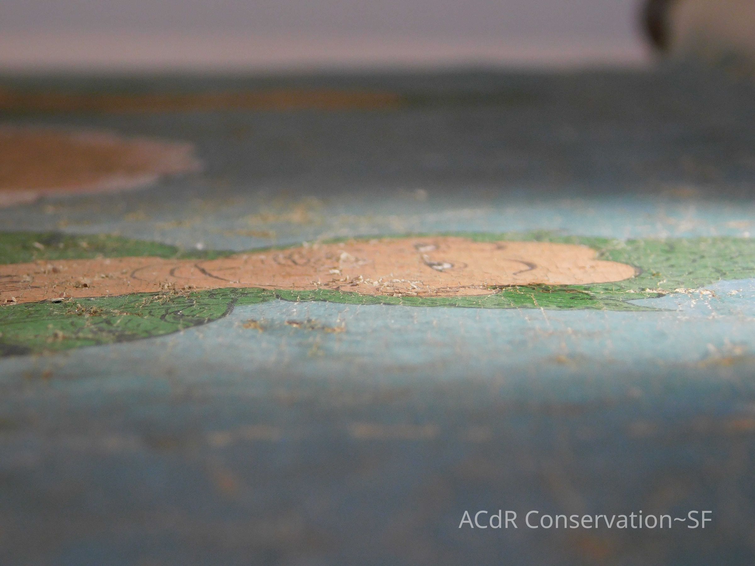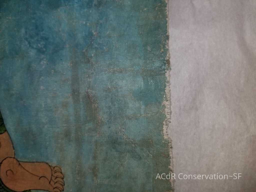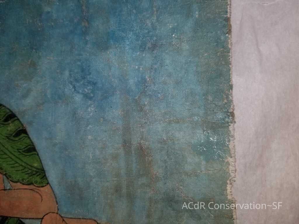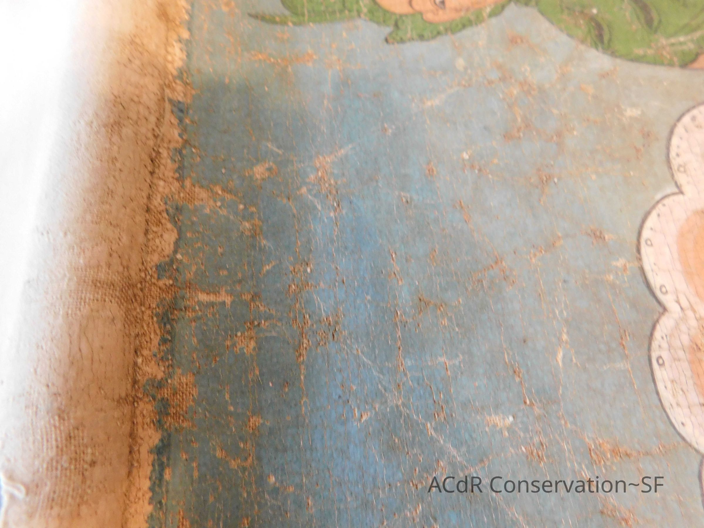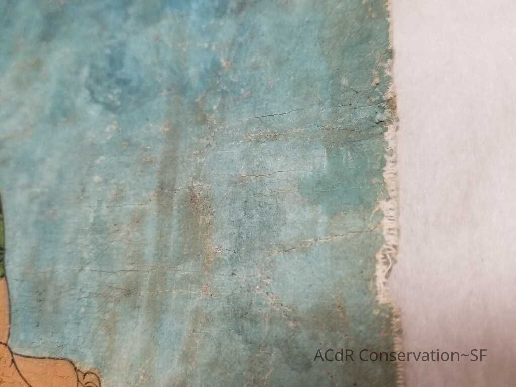 Color matched for background color with a wash of blue lake, yellow ochre, chinese white, ivory black, davy's gray. Clear gesso applied in small areas of loss. Color matched and smoothed background with wash.