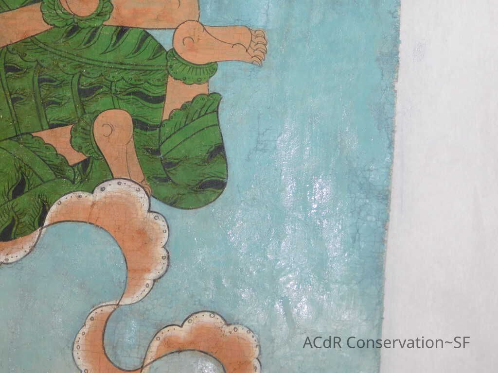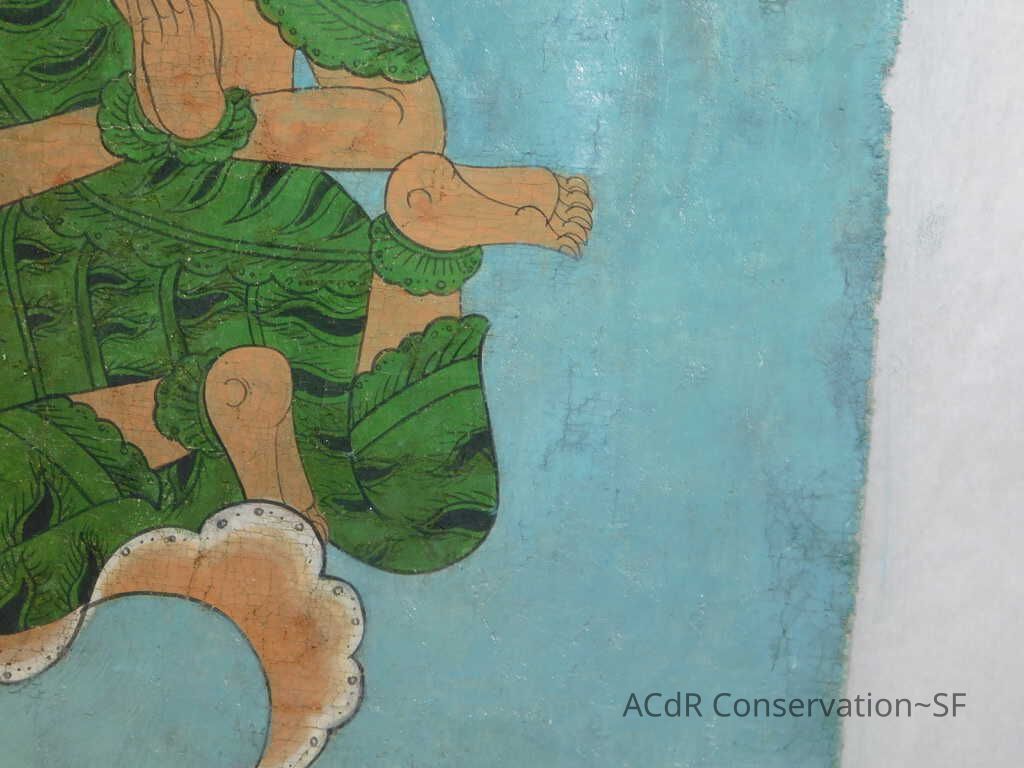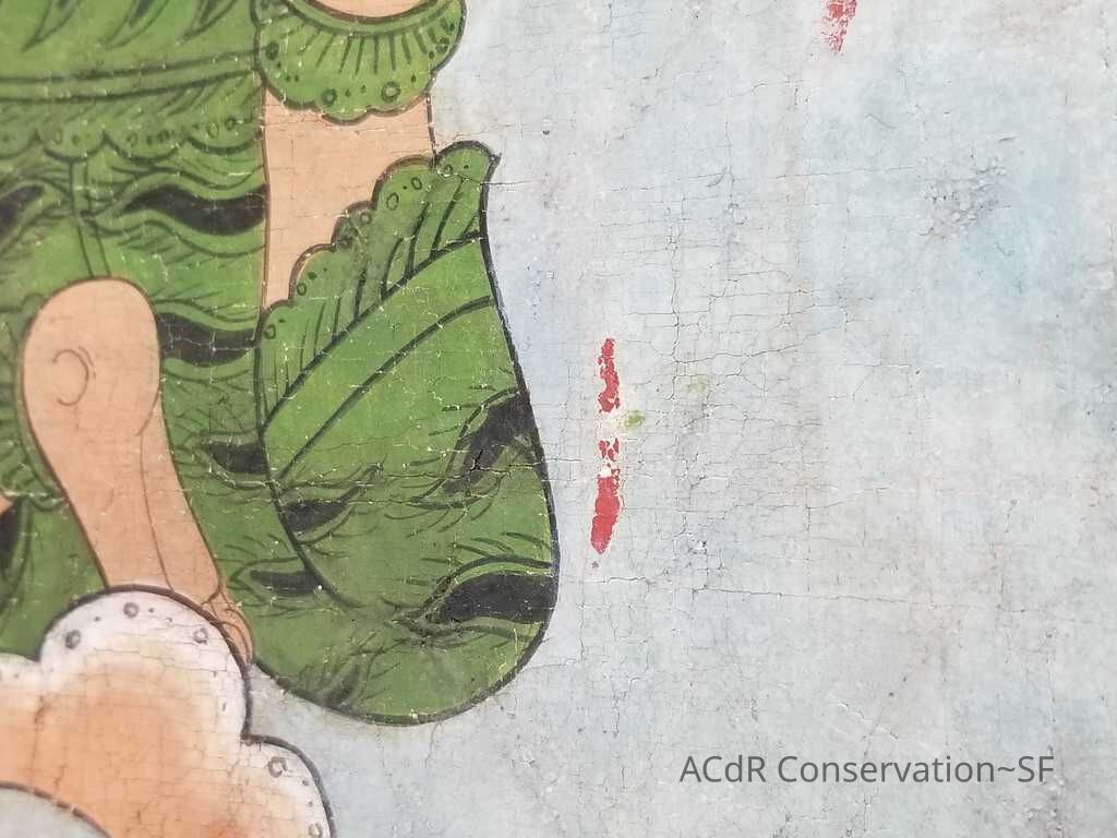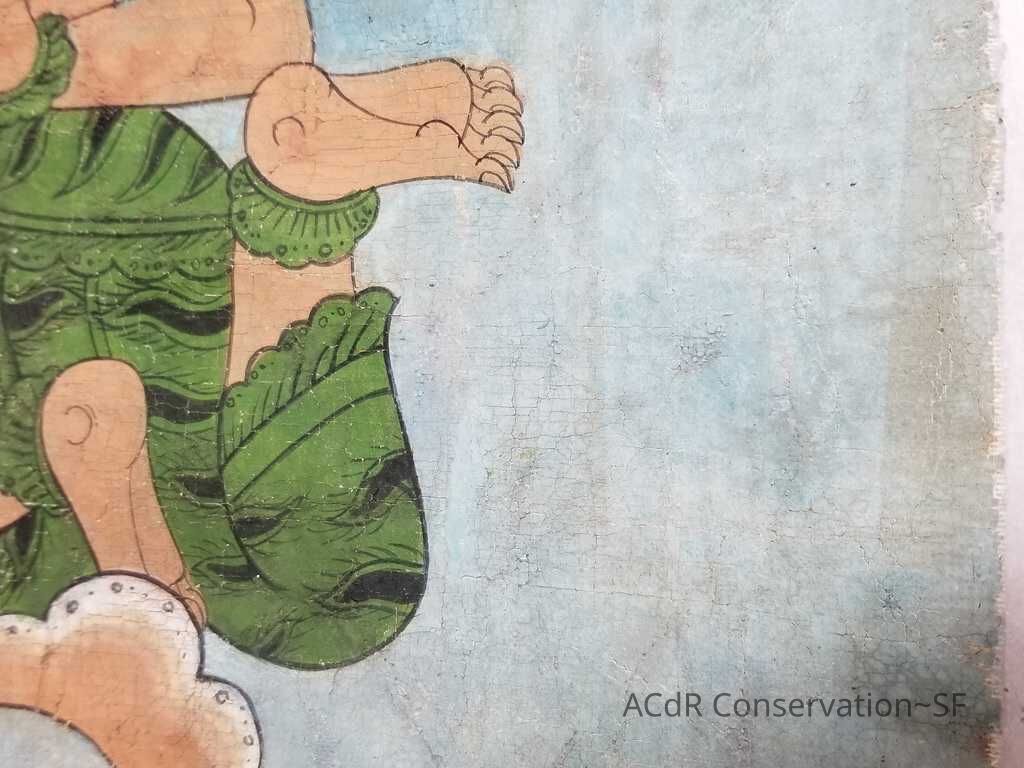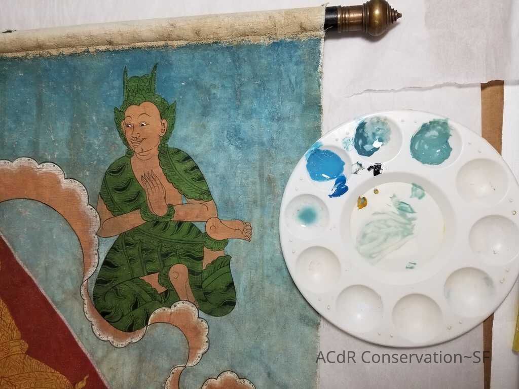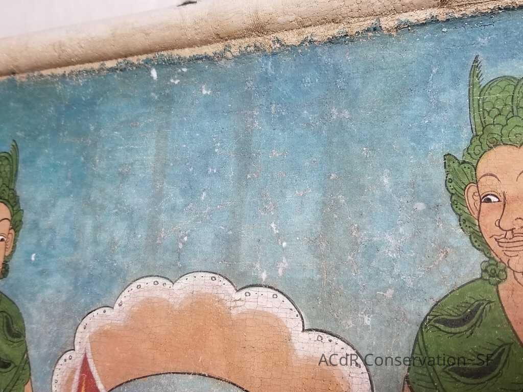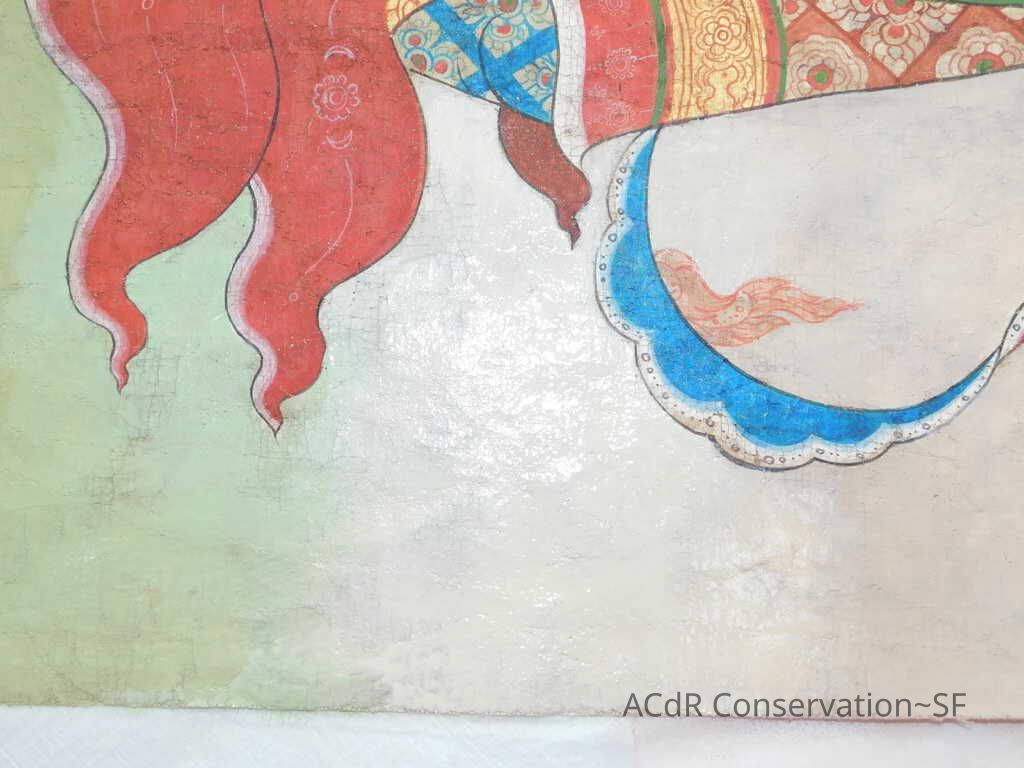 Color matched for background color with a wash of blue lake, yellow ochre, chinese white, ivory black, davy's gray. Clear gesso applied in small areas of loss. Color matched and smoothed background with wash.