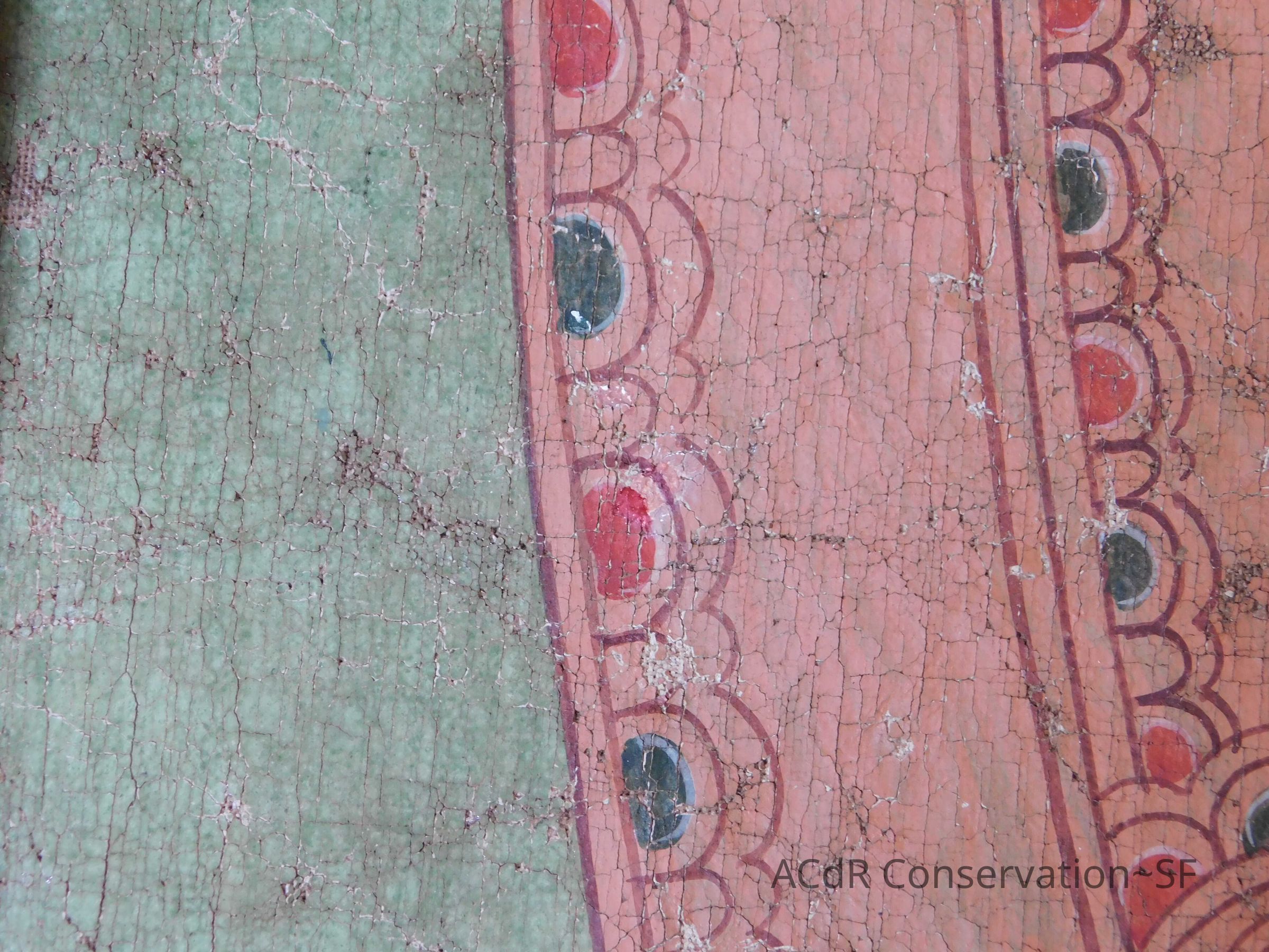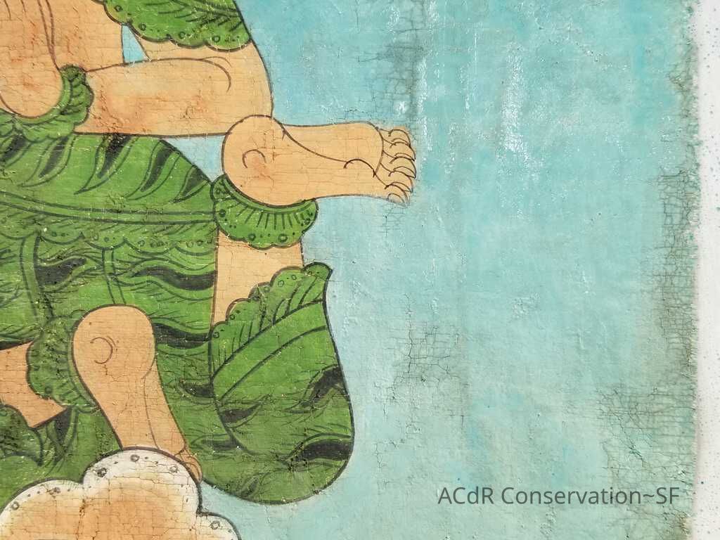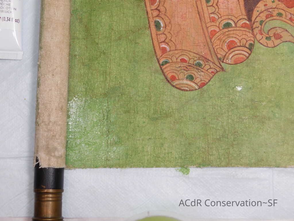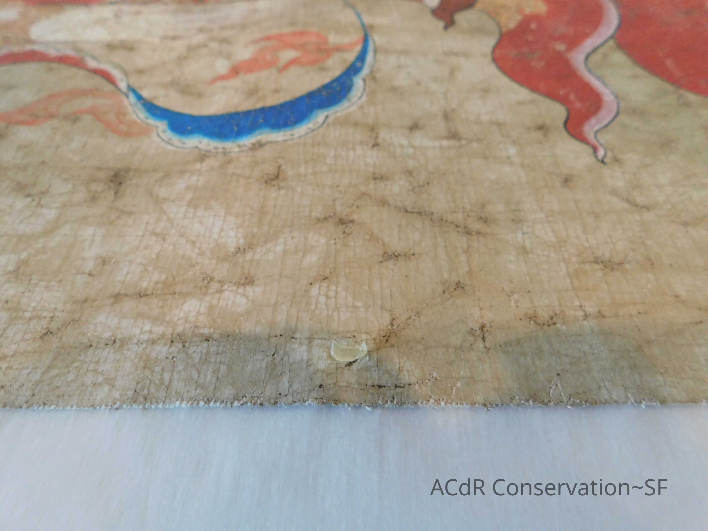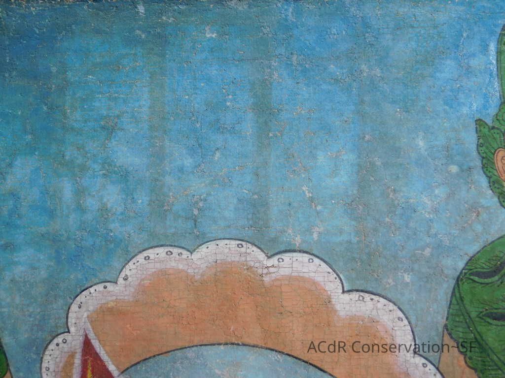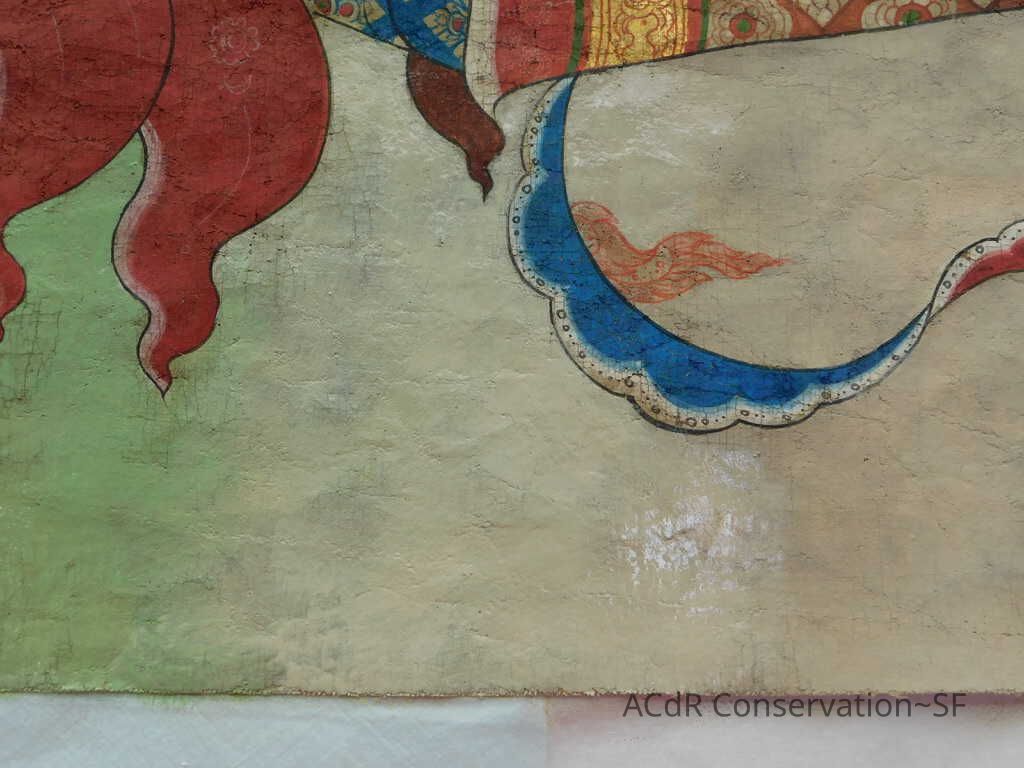 Color matched for background color with a wash of blue lake, yellow ochre, chinese white, ivory black, davy's gray. Clear gesso applied in small areas of loss. Color matched and smoothed background with wash.