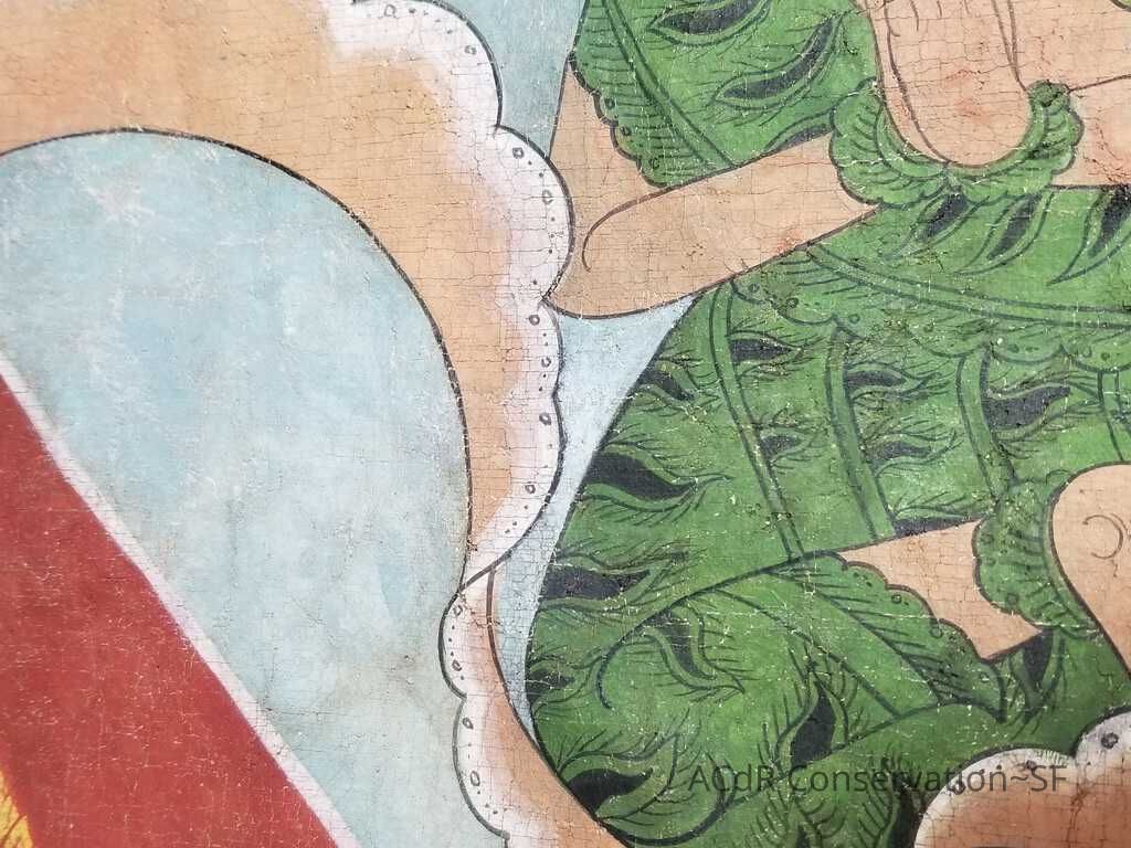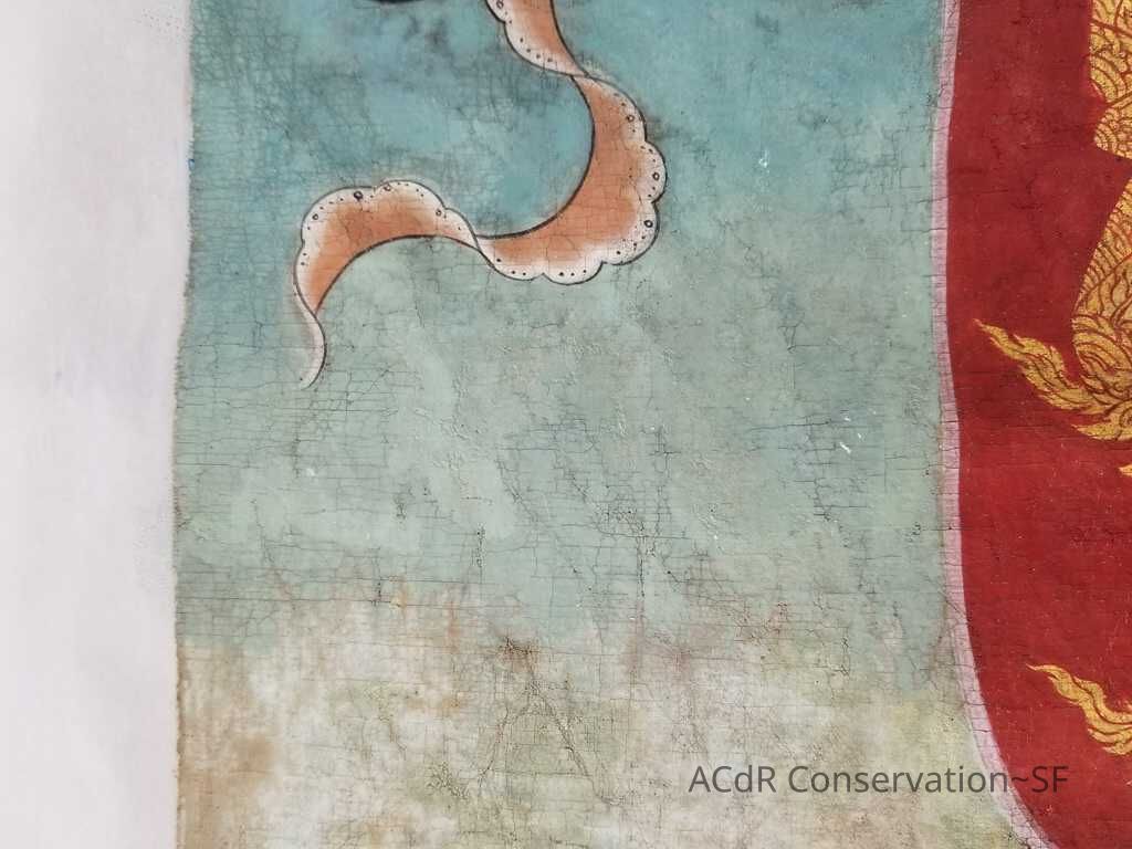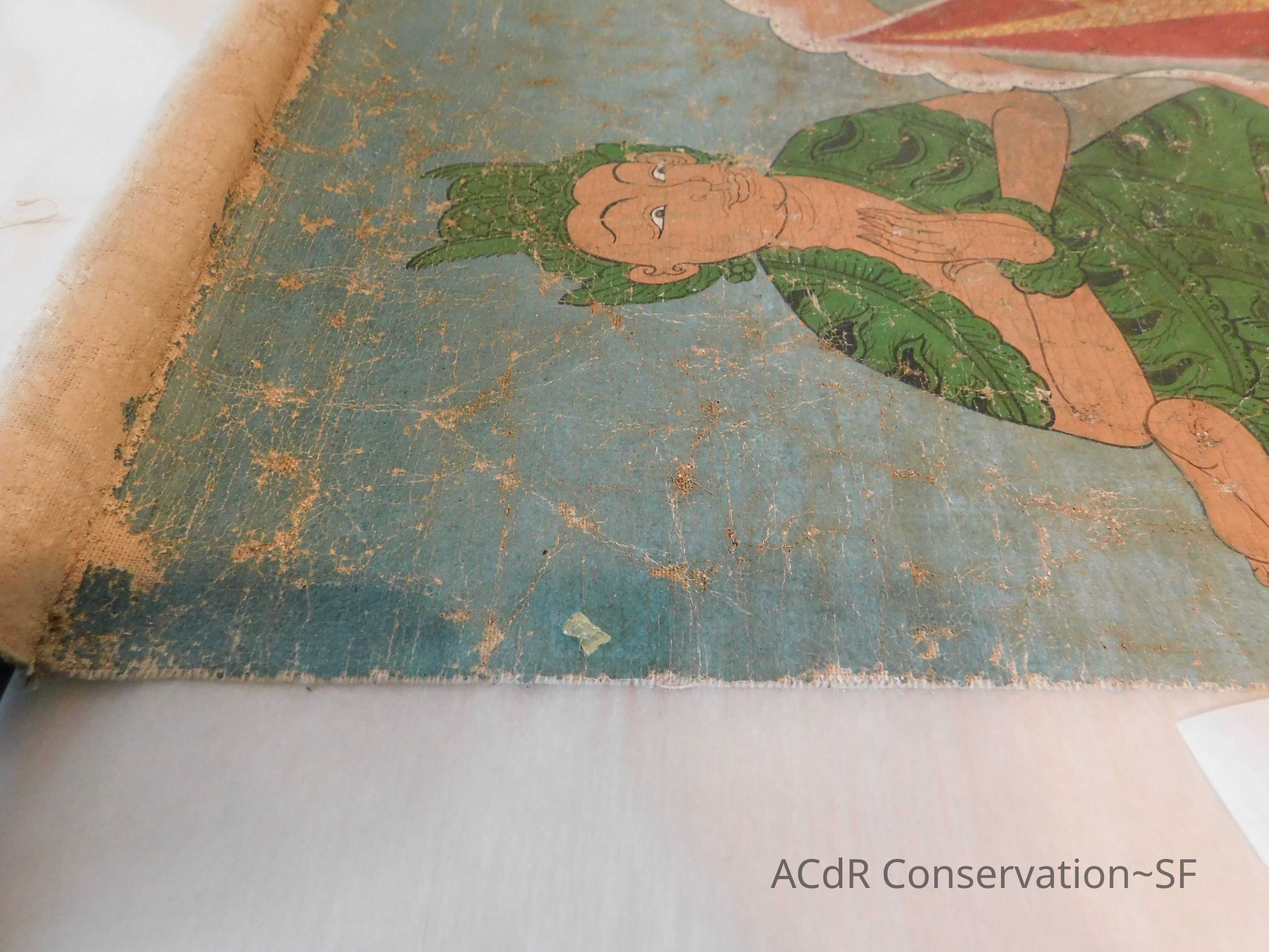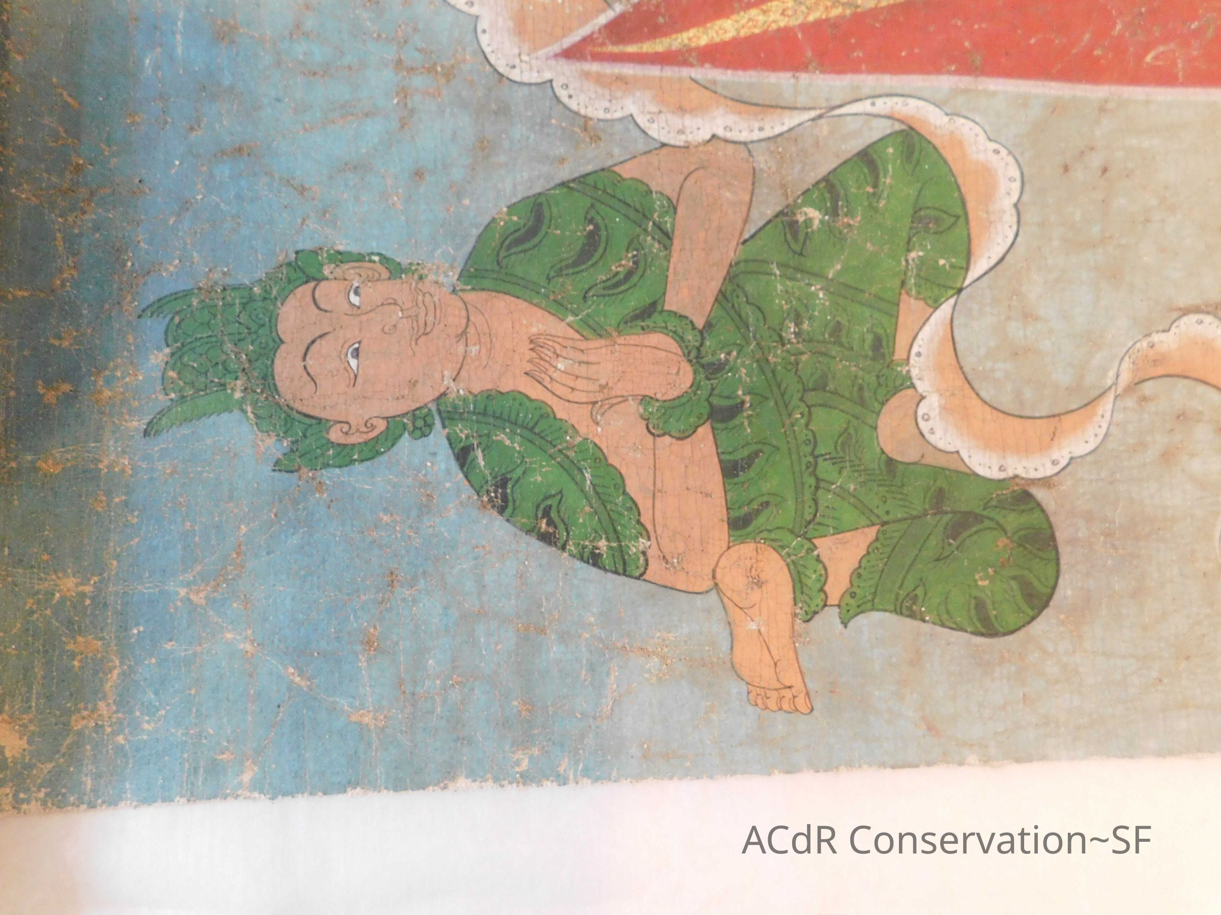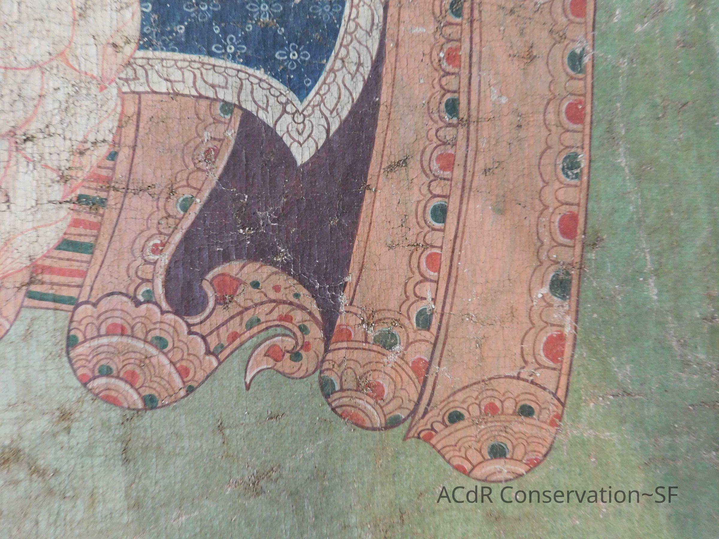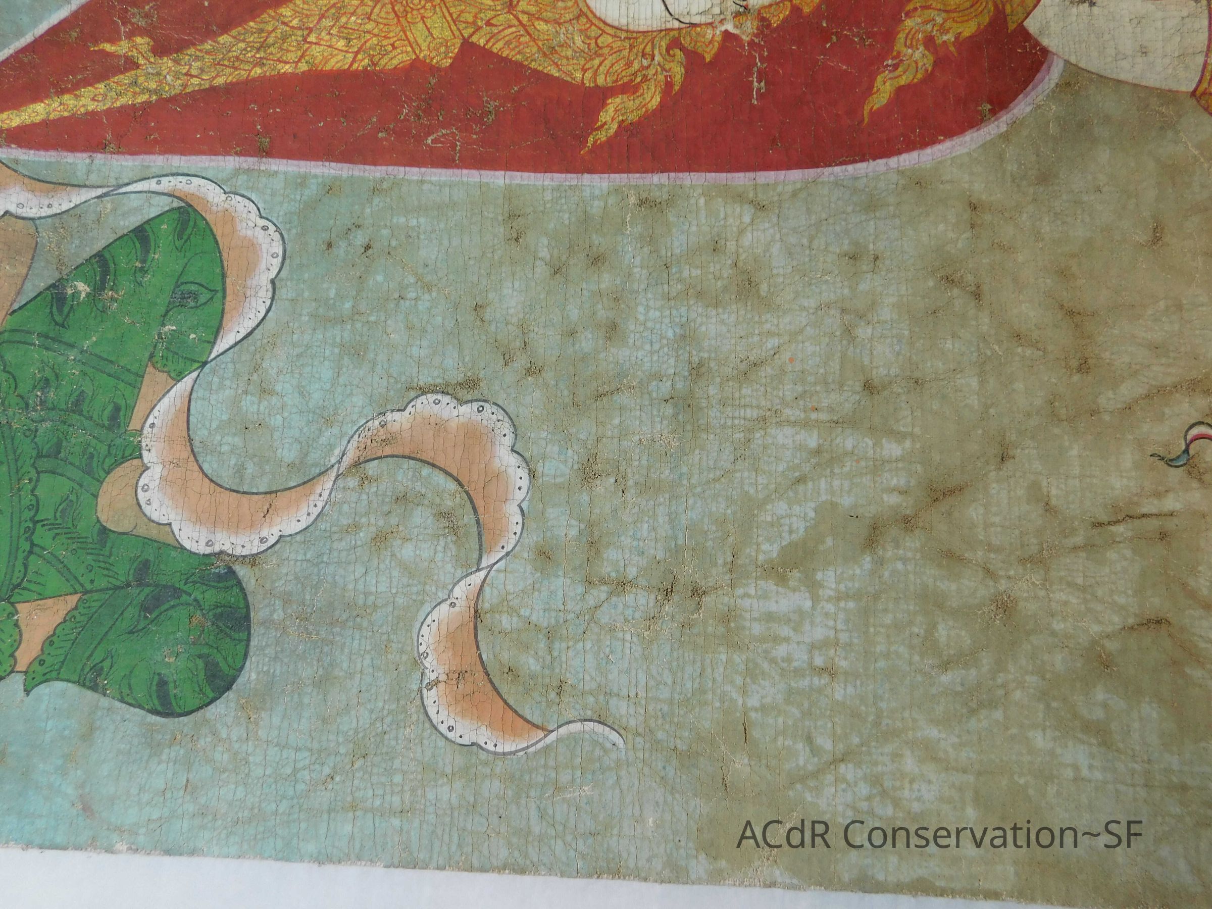 Color matched for background color with a wash of blue lake, yellow ochre, chinese white, ivory black, davy's gray. Clear gesso applied in small areas of loss. Color matched and smoothed background with wash.