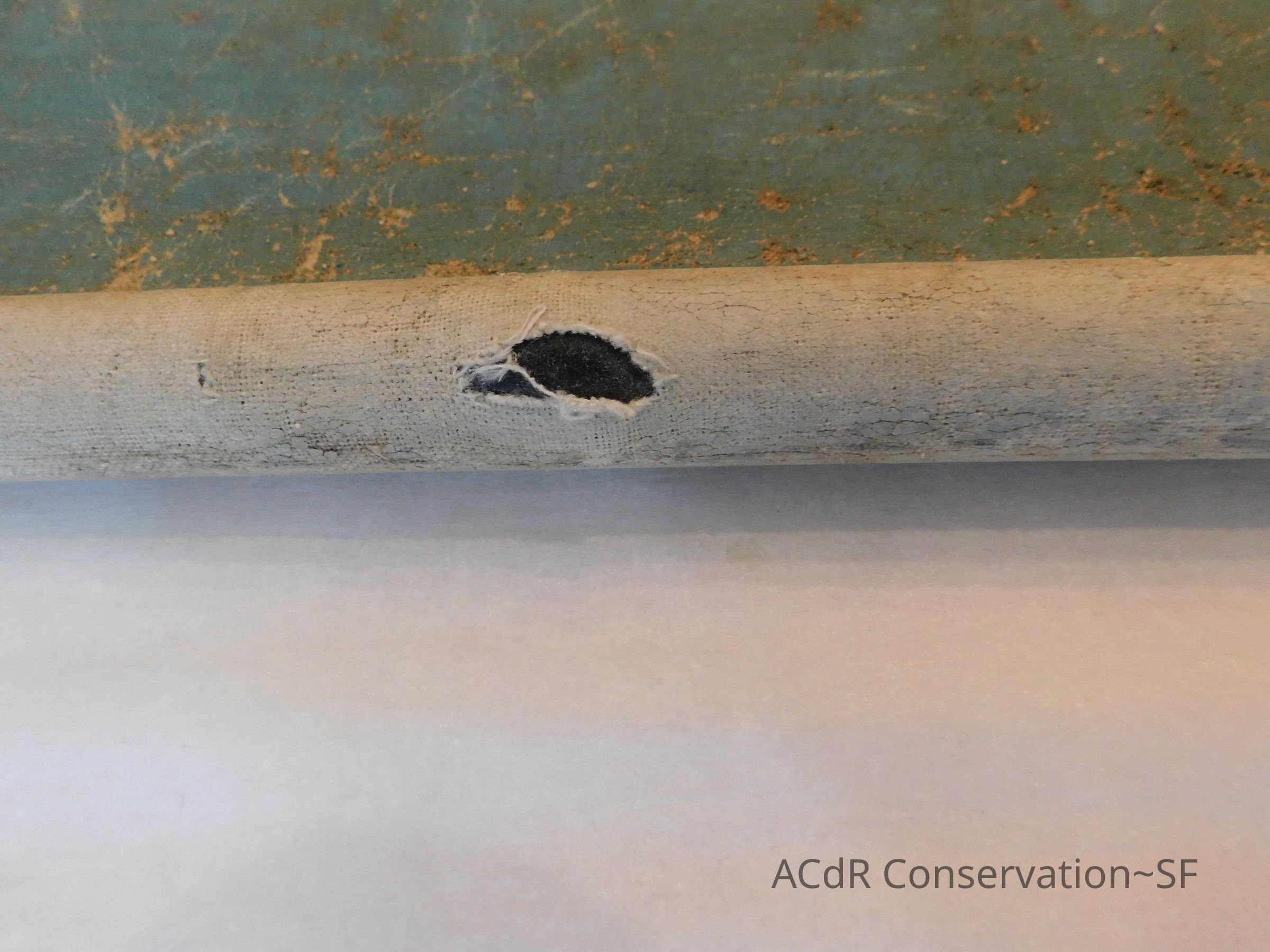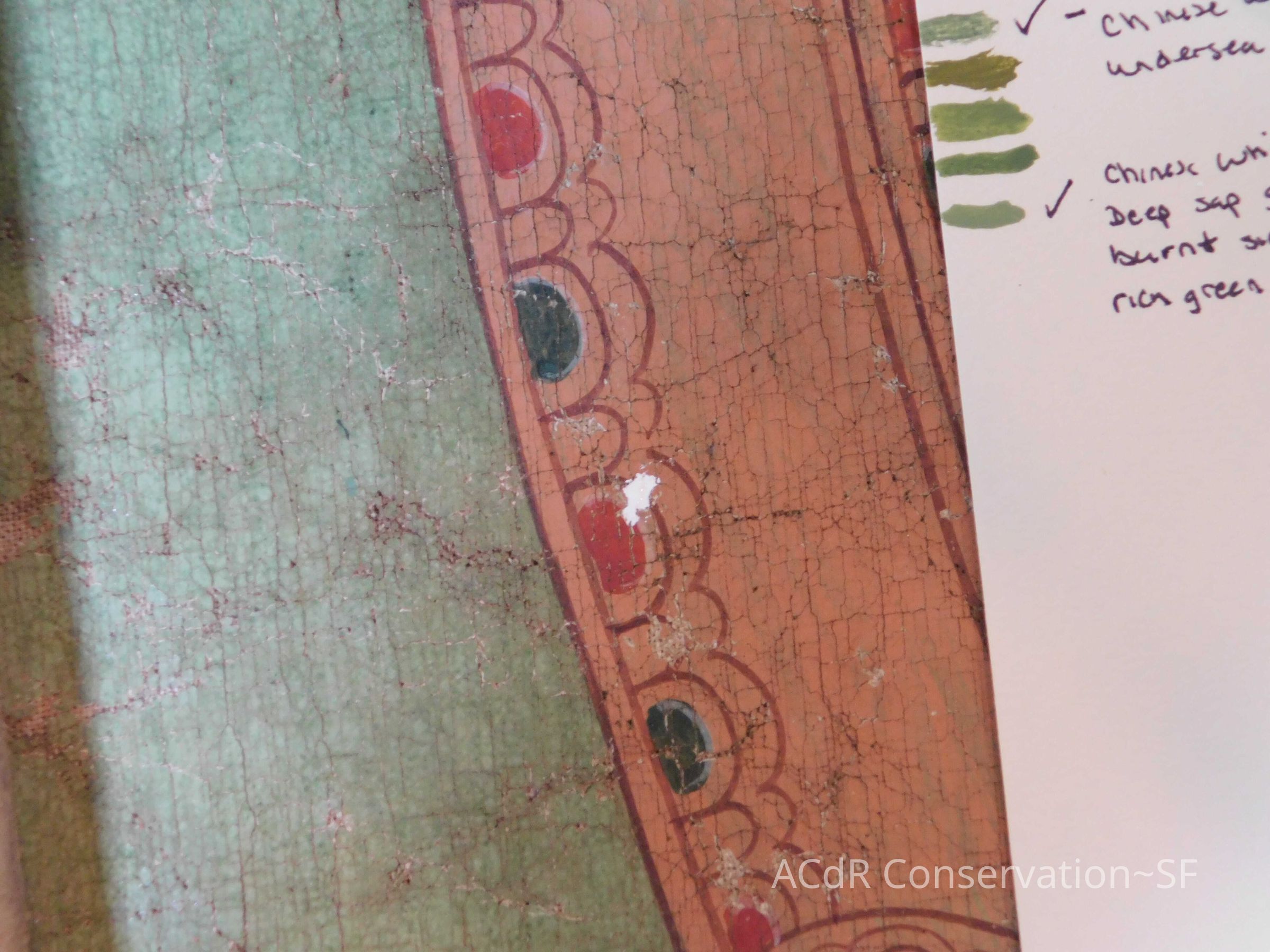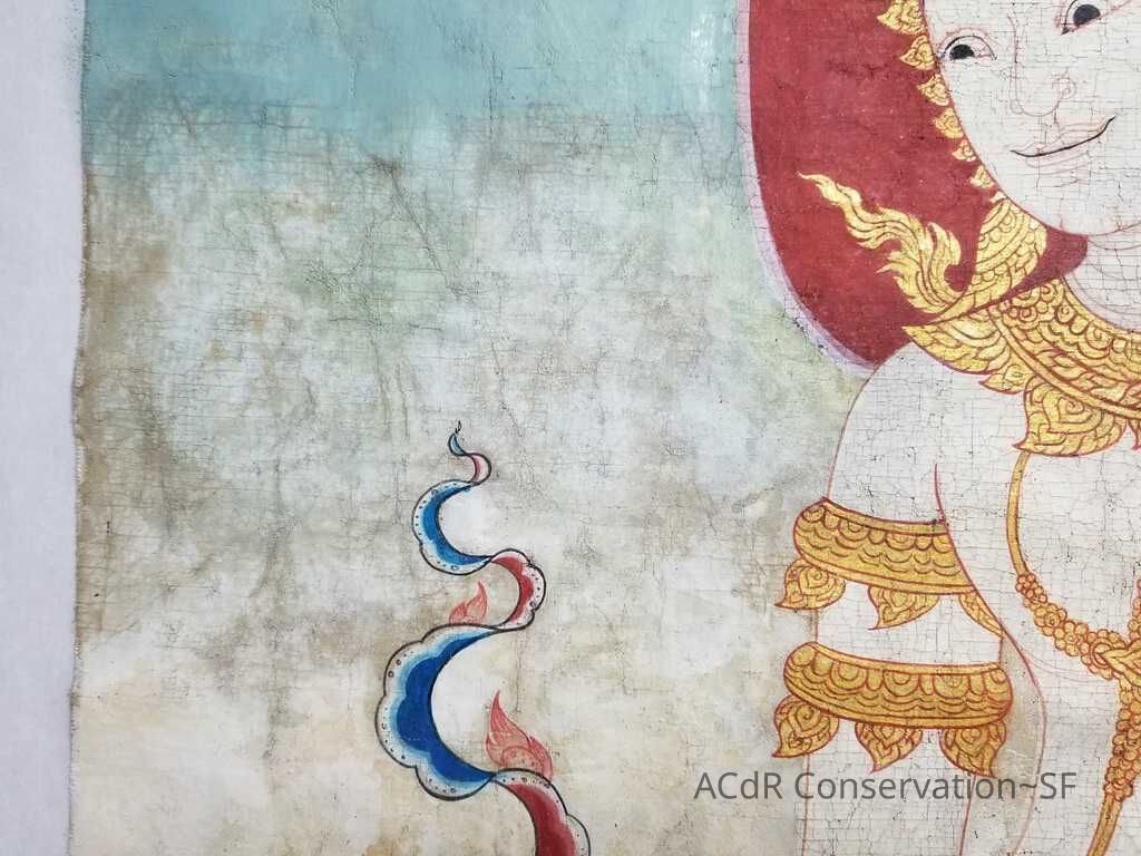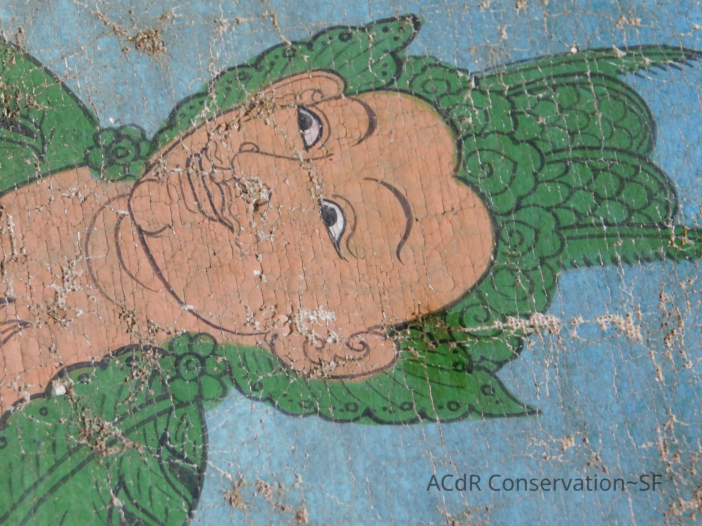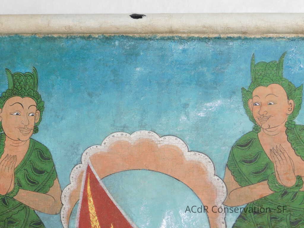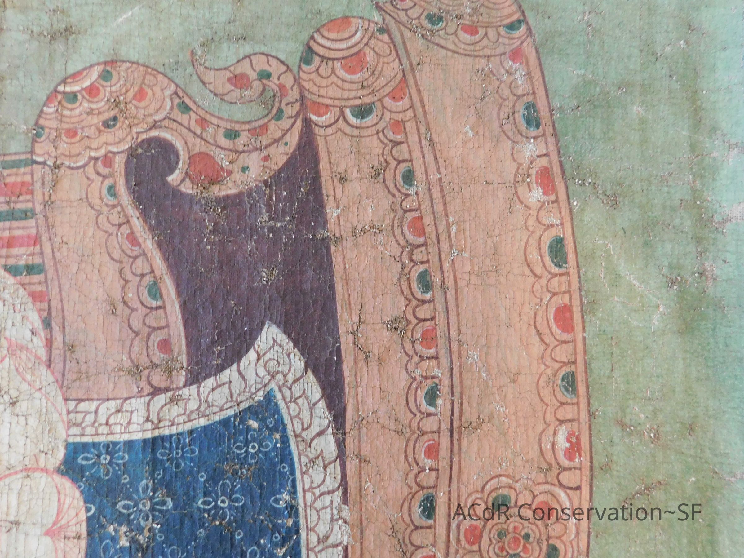Color matched for background color with a wash of blue lake, yellow ochre, chinese white, ivory black, davy's gray. Clear gesso applied in small areas of loss. Color matched and smoothed background with wash.