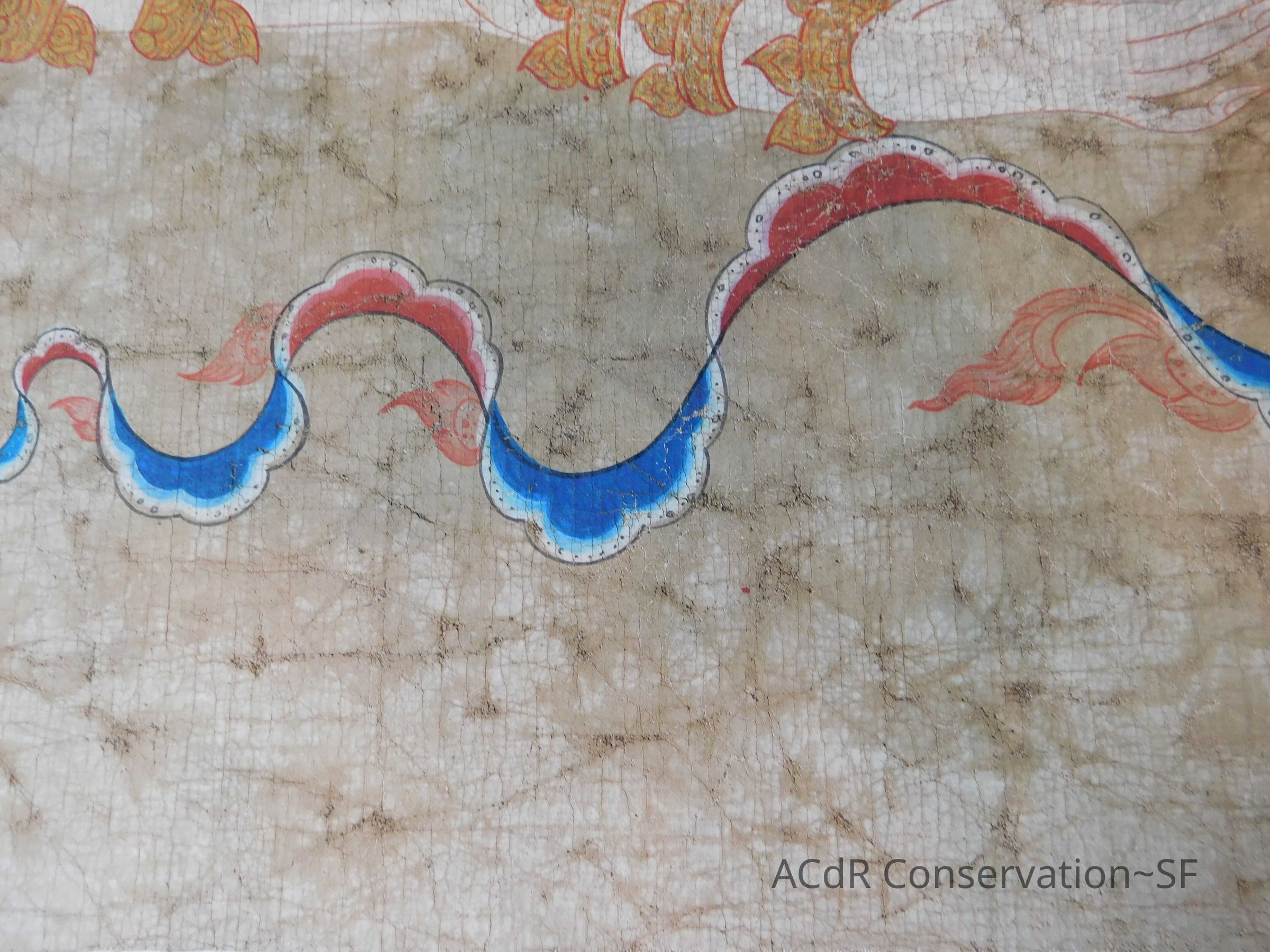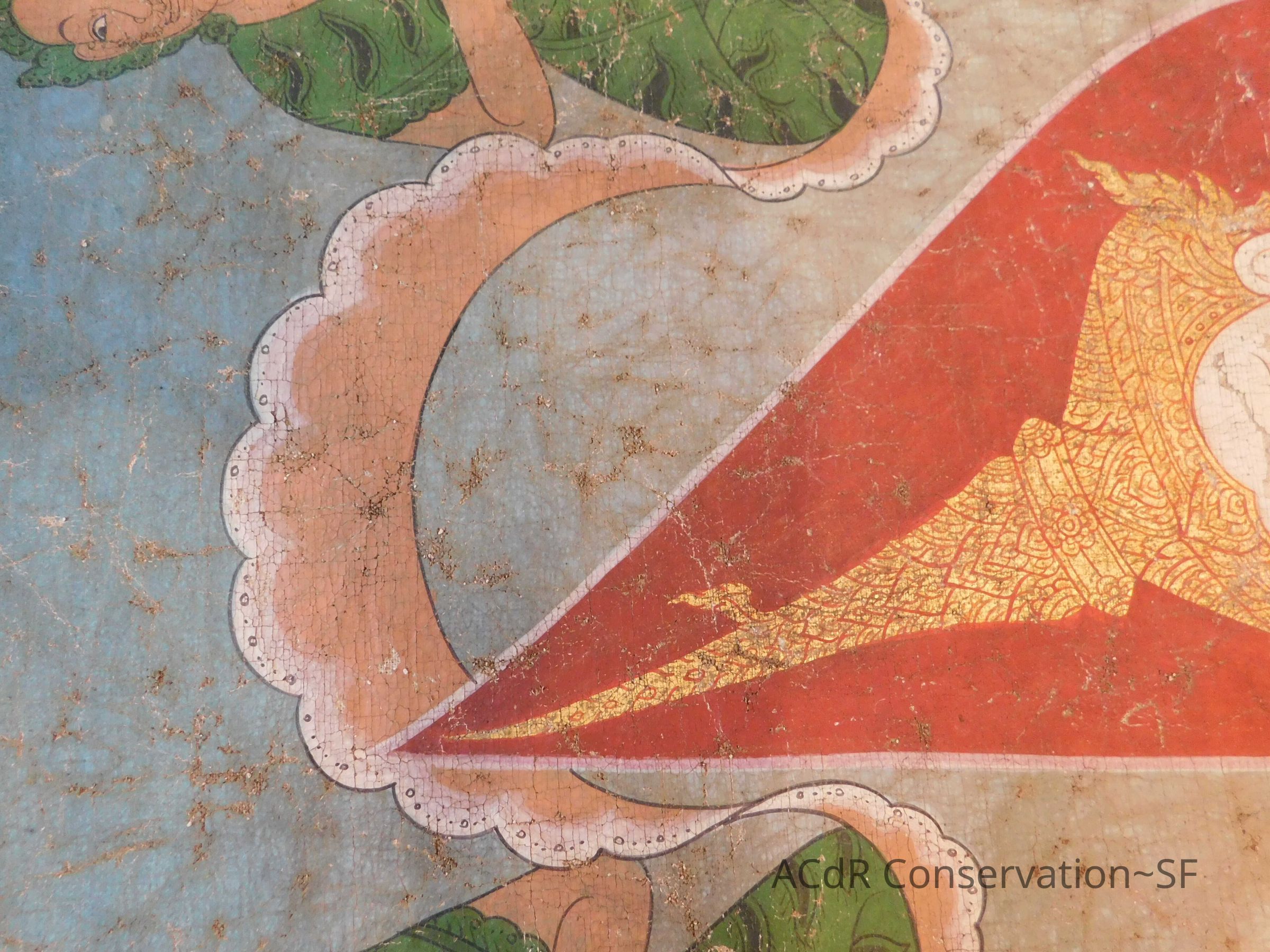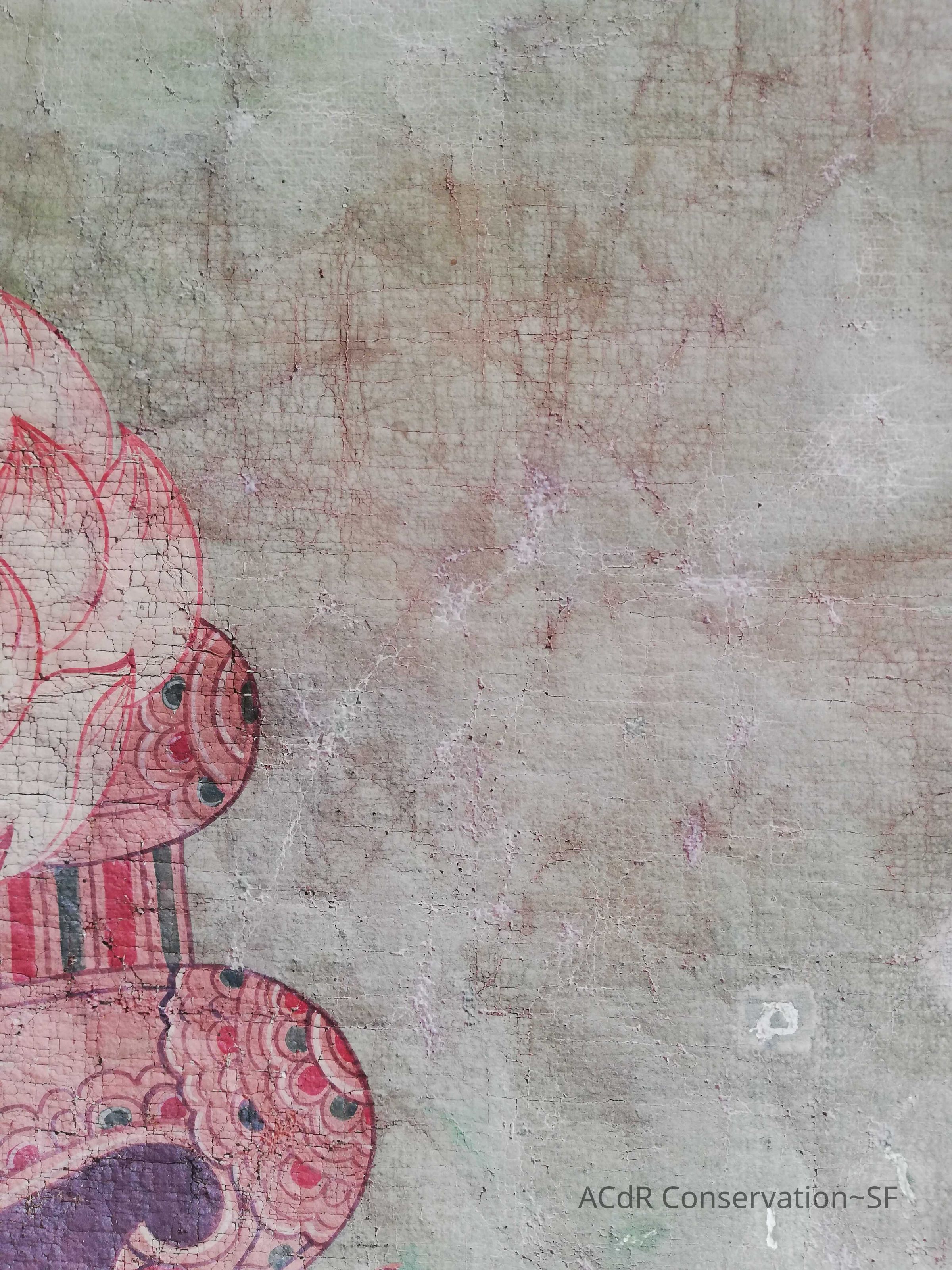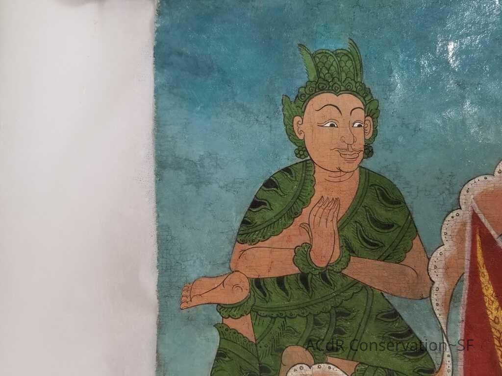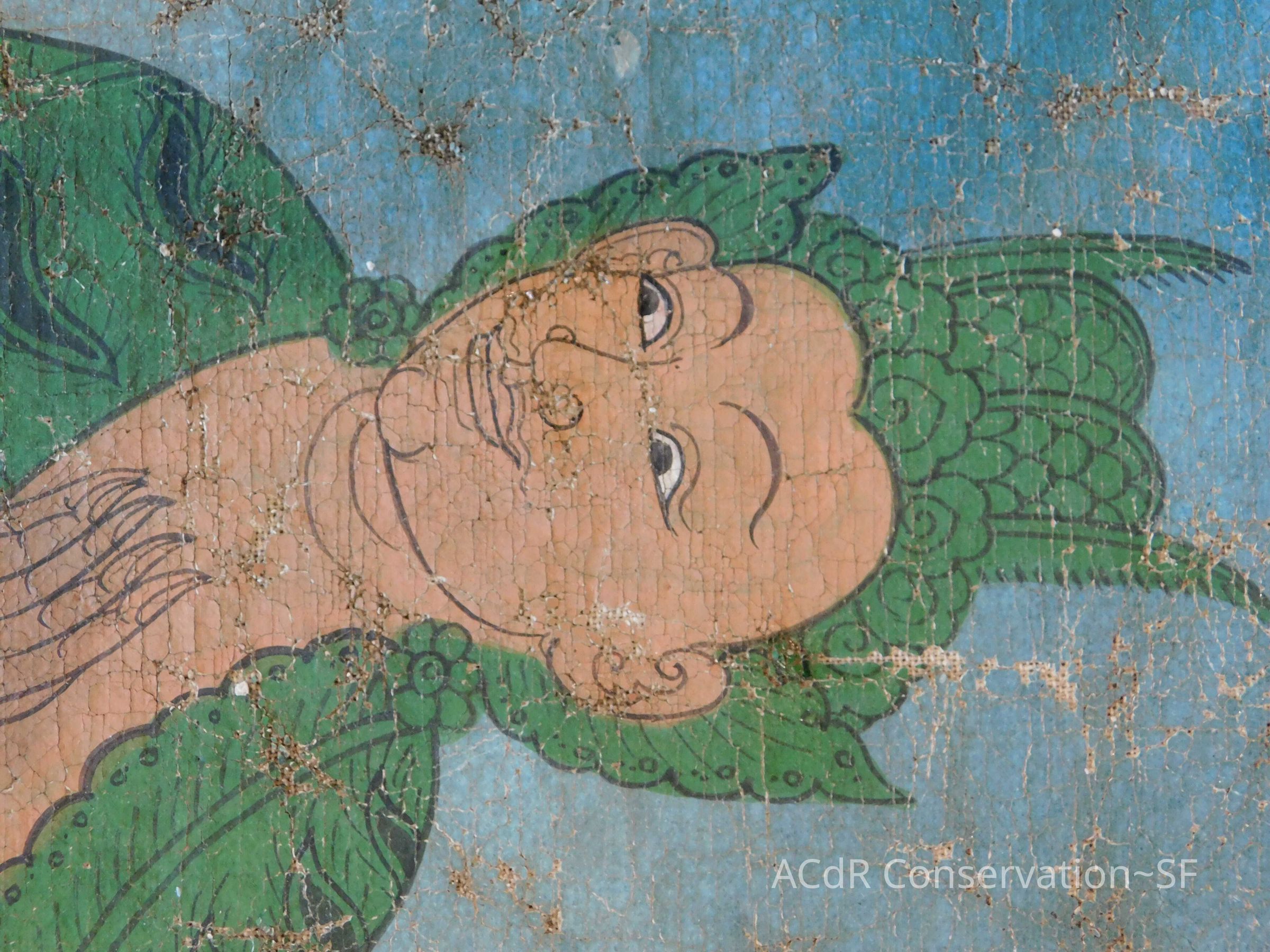 Color matched for background color with a wash of blue lake, yellow ochre, chinese white, ivory black, davy's gray. Clear gesso applied in small areas of loss. Color matched and smoothed background with wash.