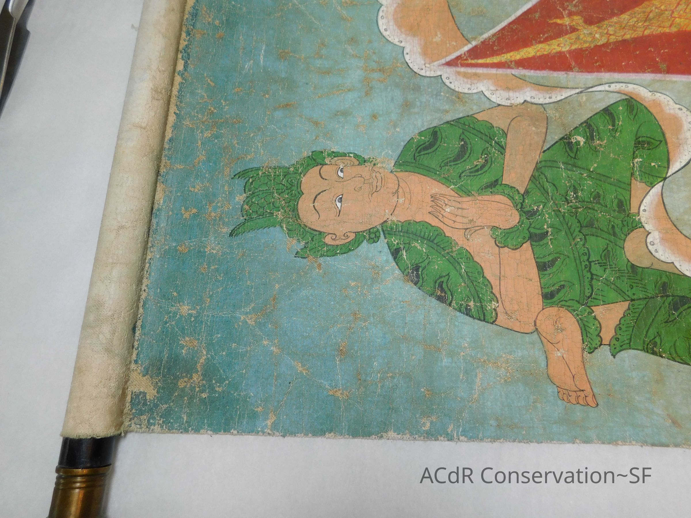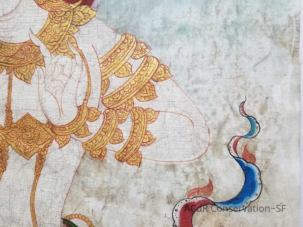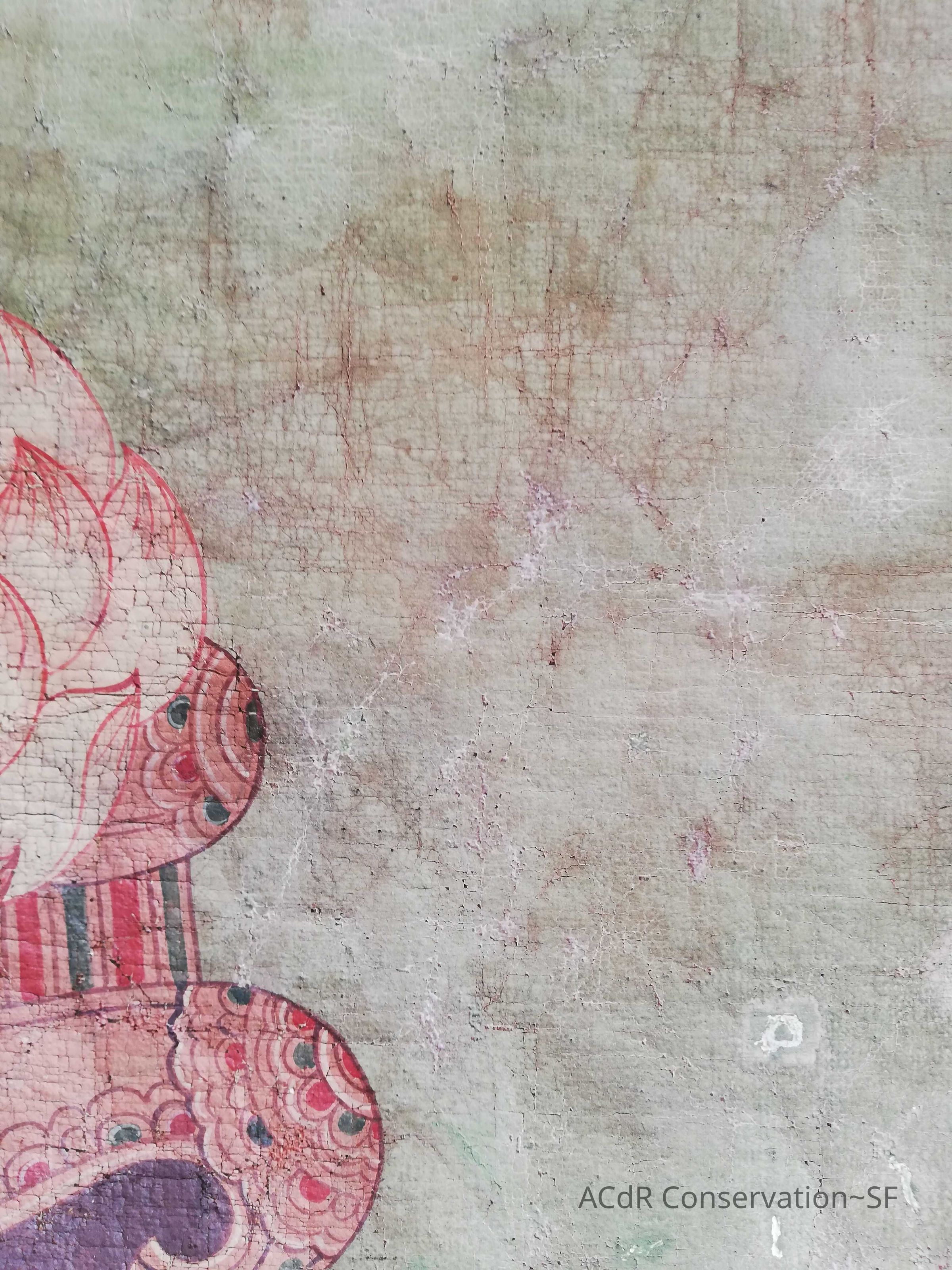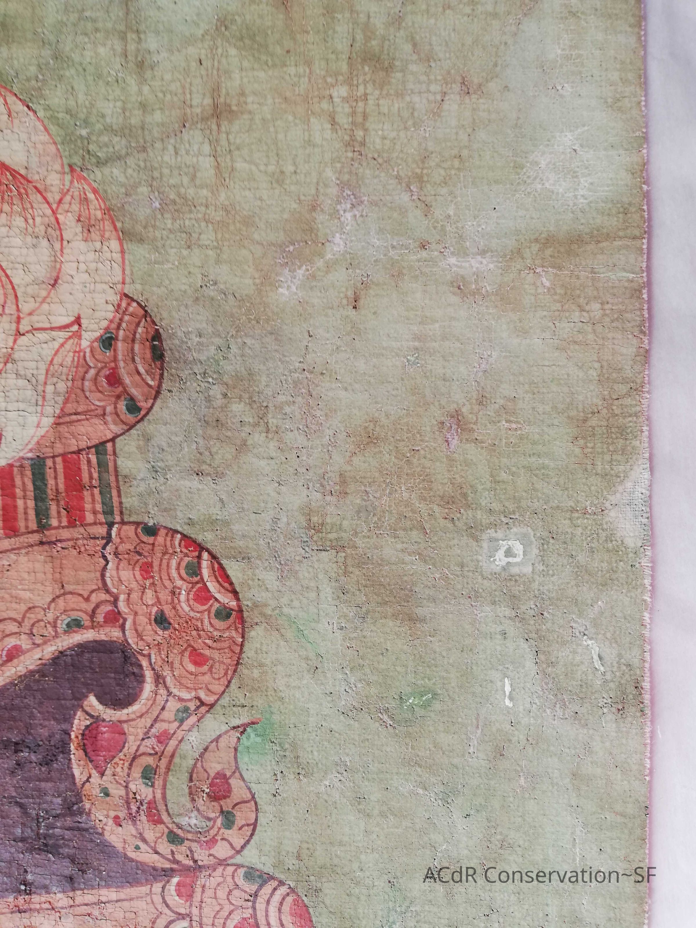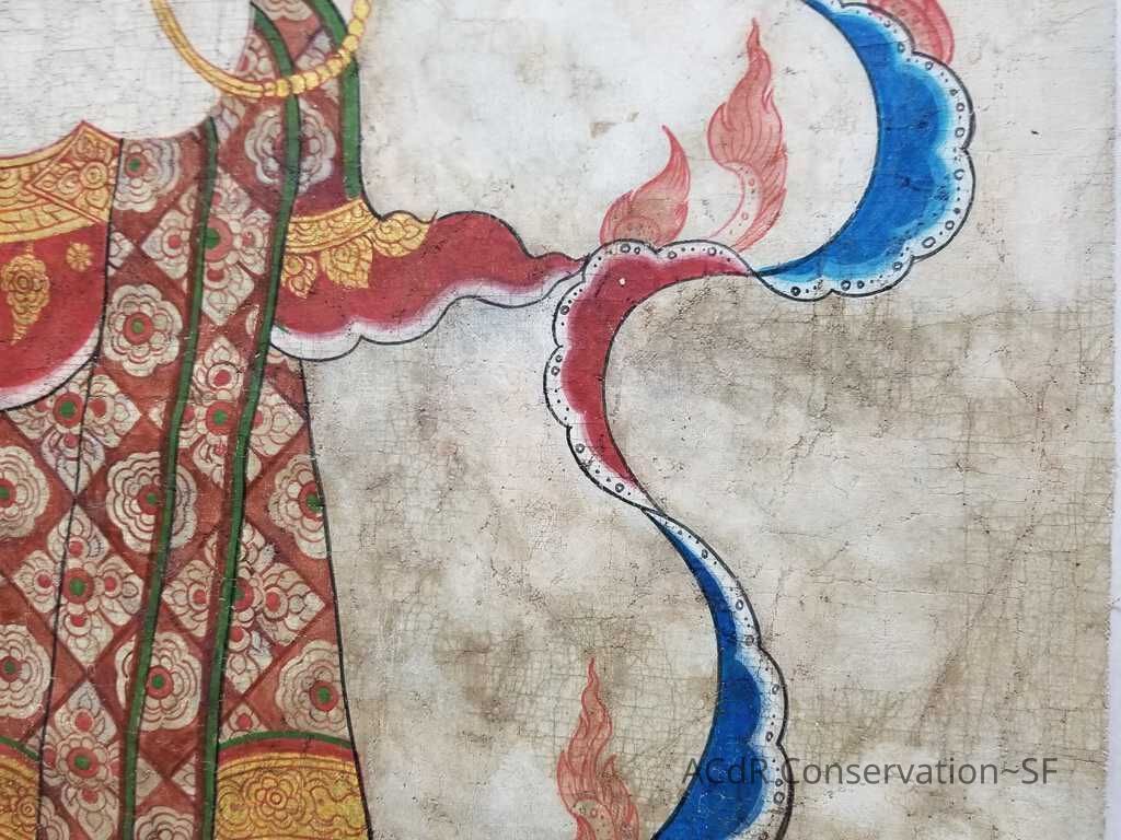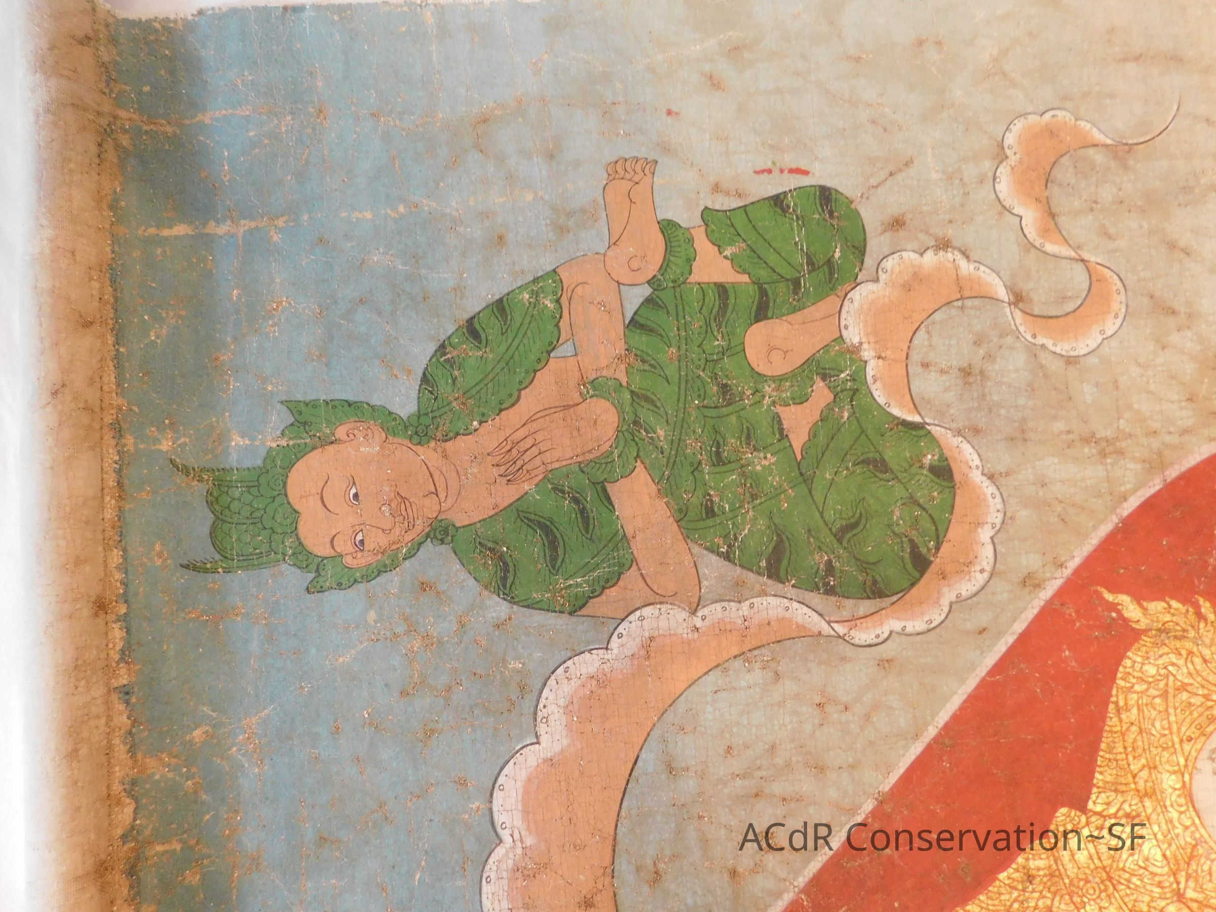 Color matched for background color with a wash of blue lake, yellow ochre, chinese white, ivory black, davy's gray. Clear gesso applied in small areas of loss. Color matched and smoothed background with wash.