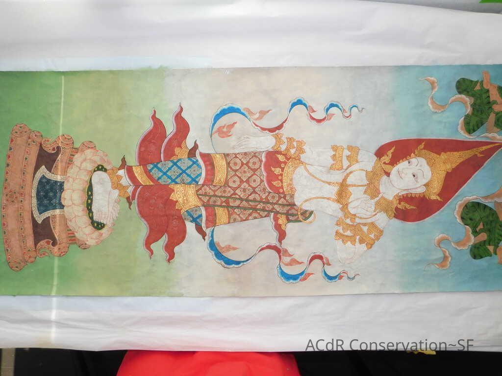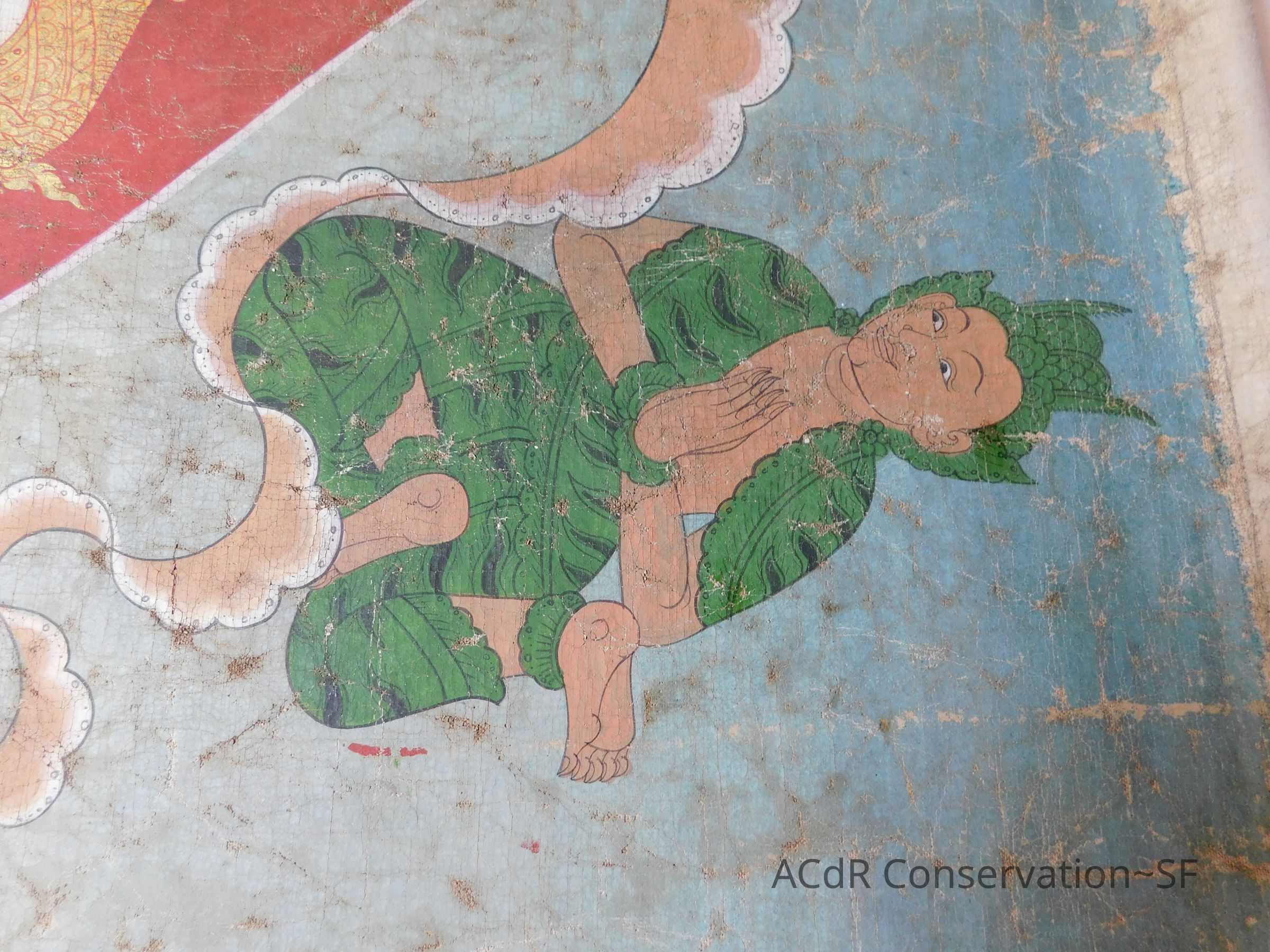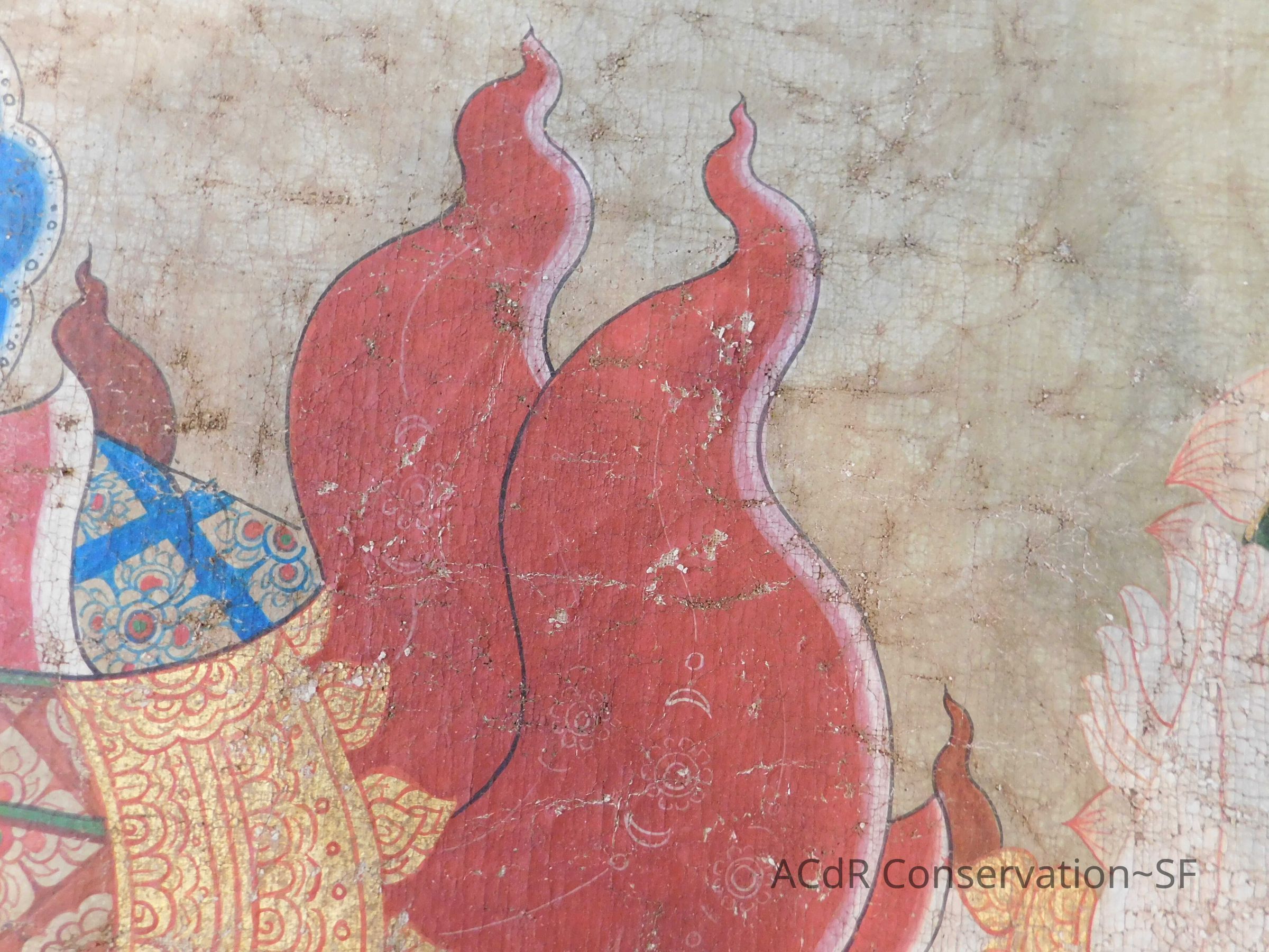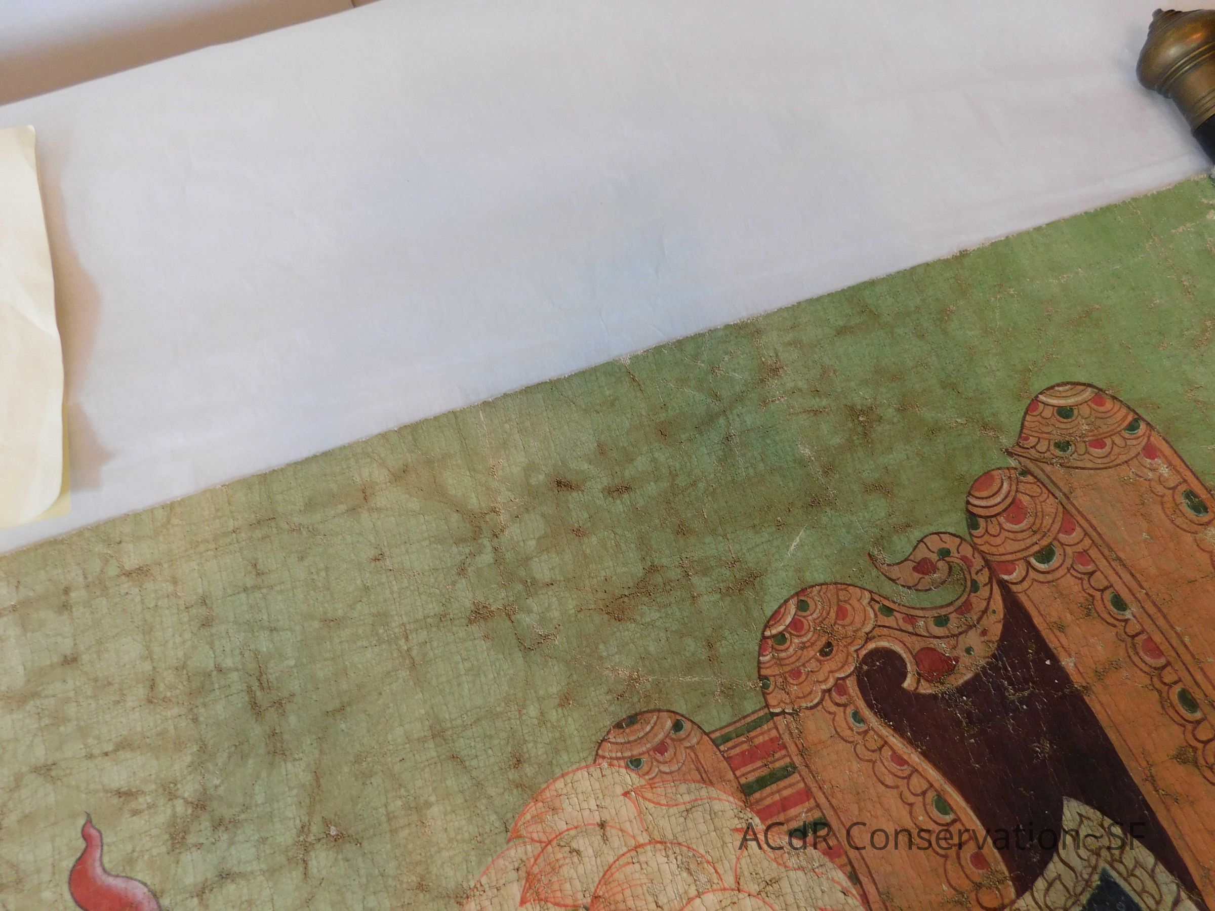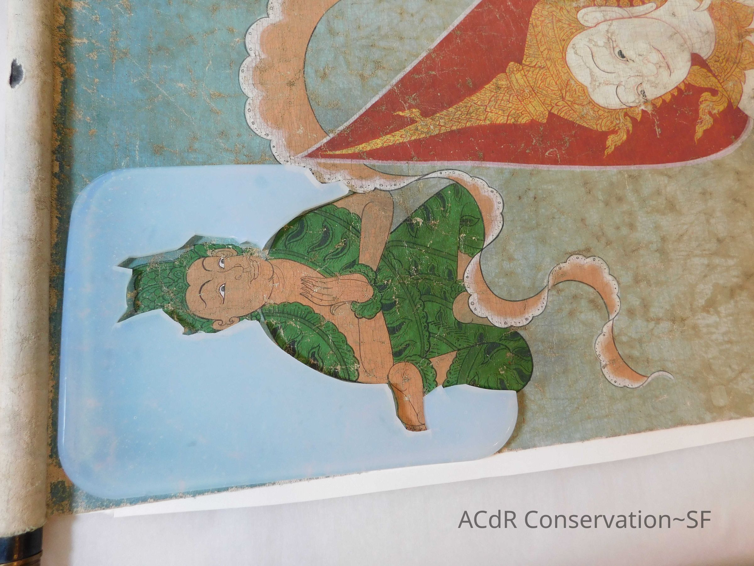 Color matched for background color with a wash of blue lake, yellow ochre, chinese white, ivory black, davy's gray. Clear gesso applied in small areas of loss. Color matched and smoothed background with wash.