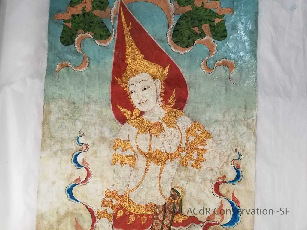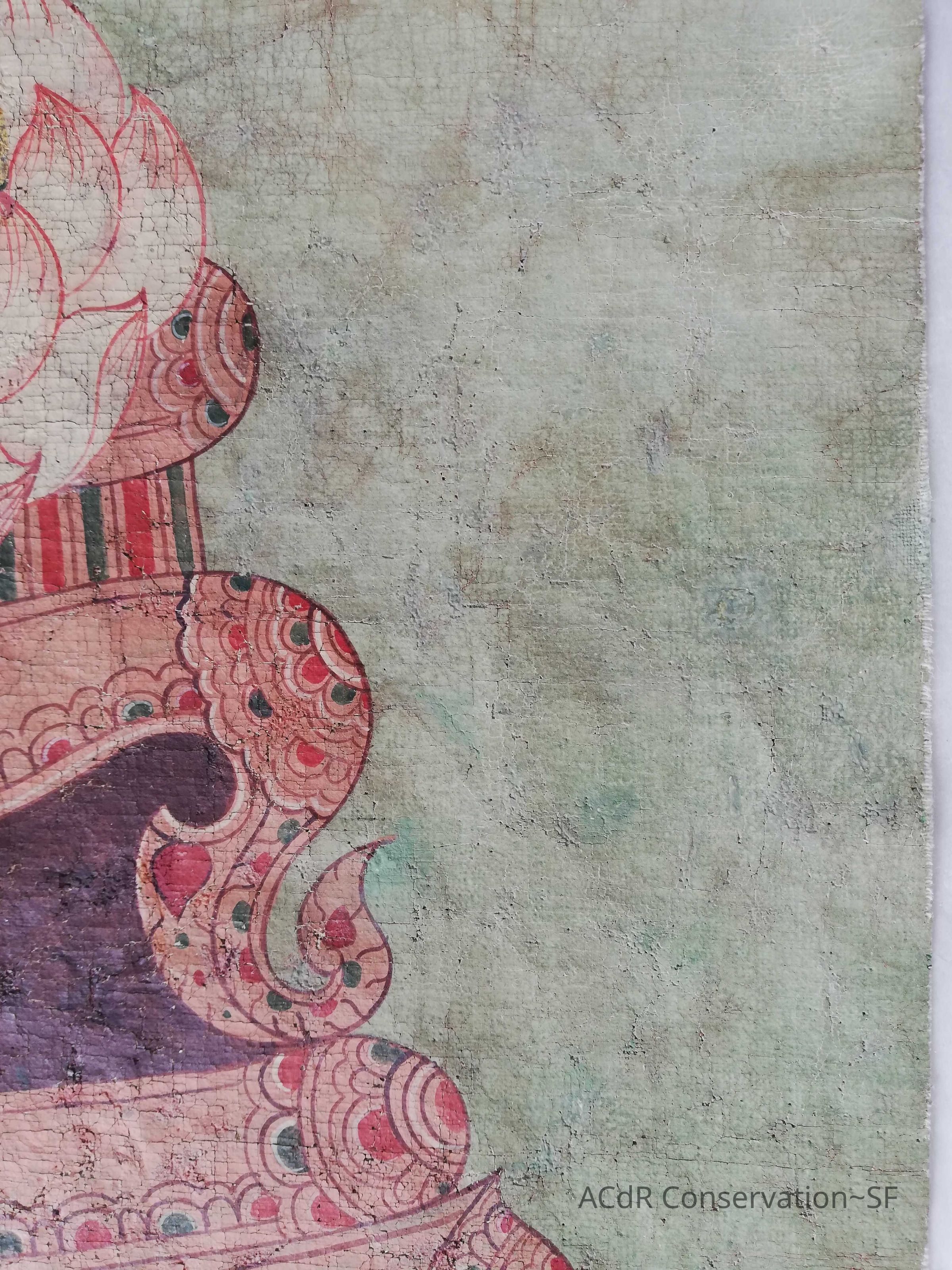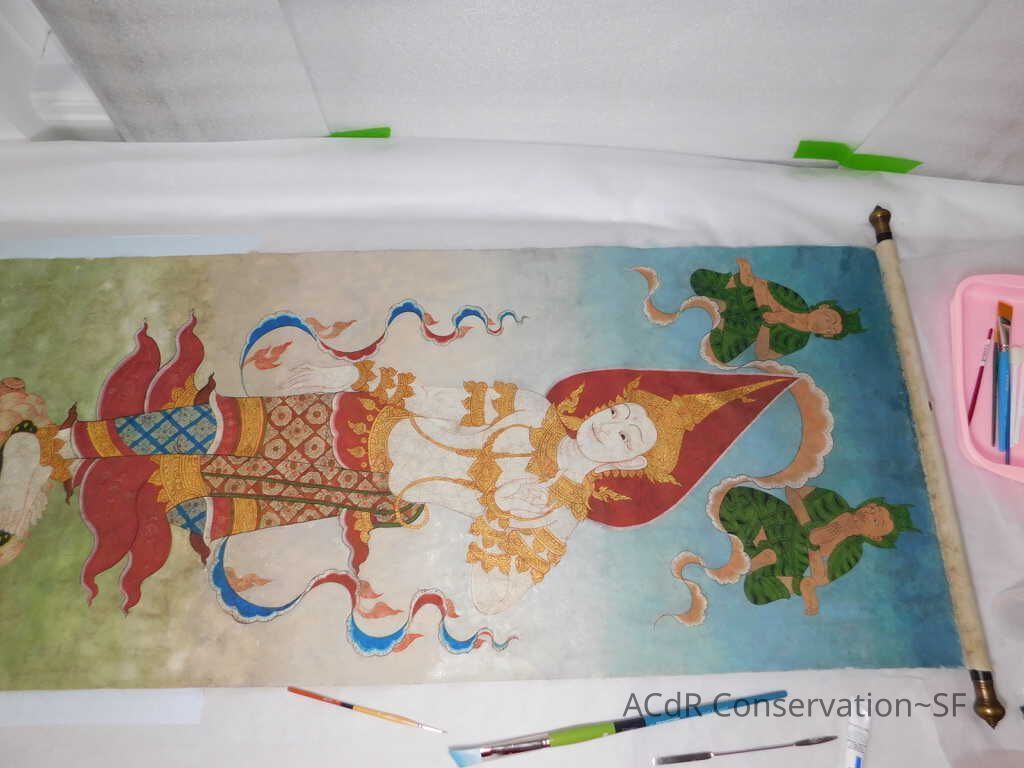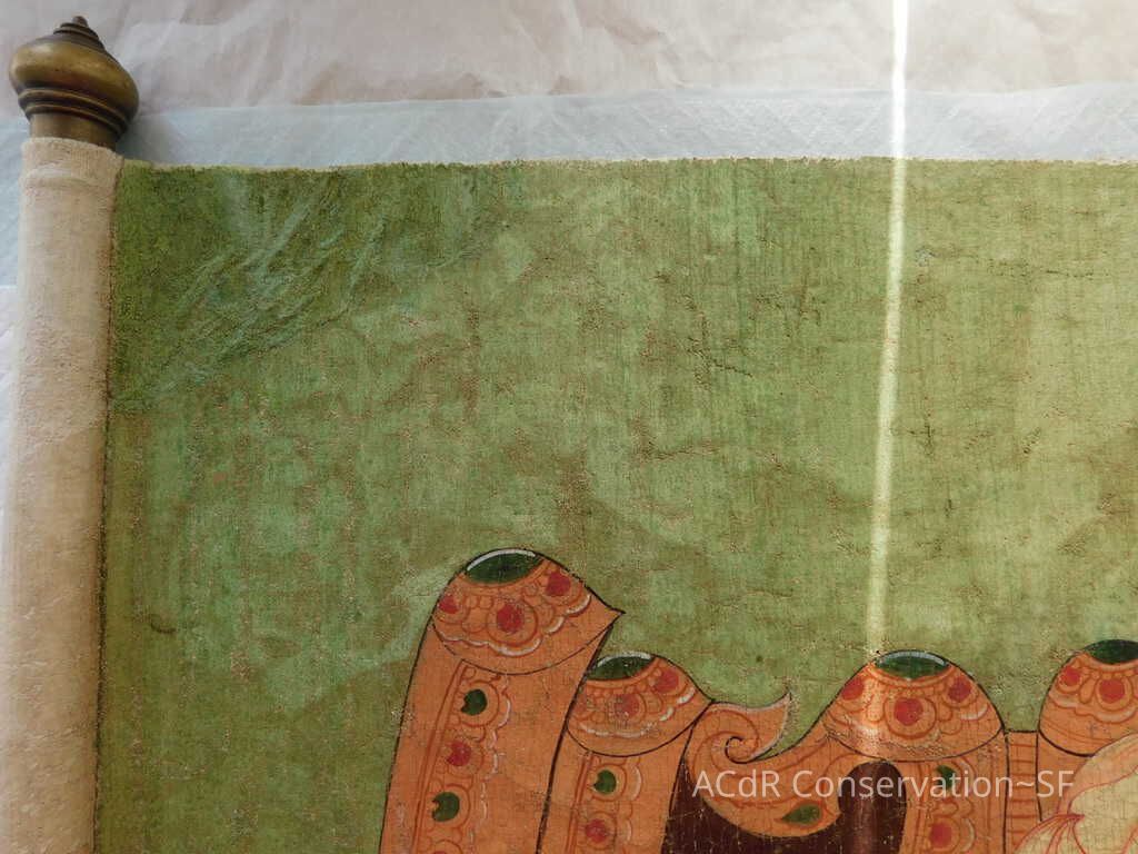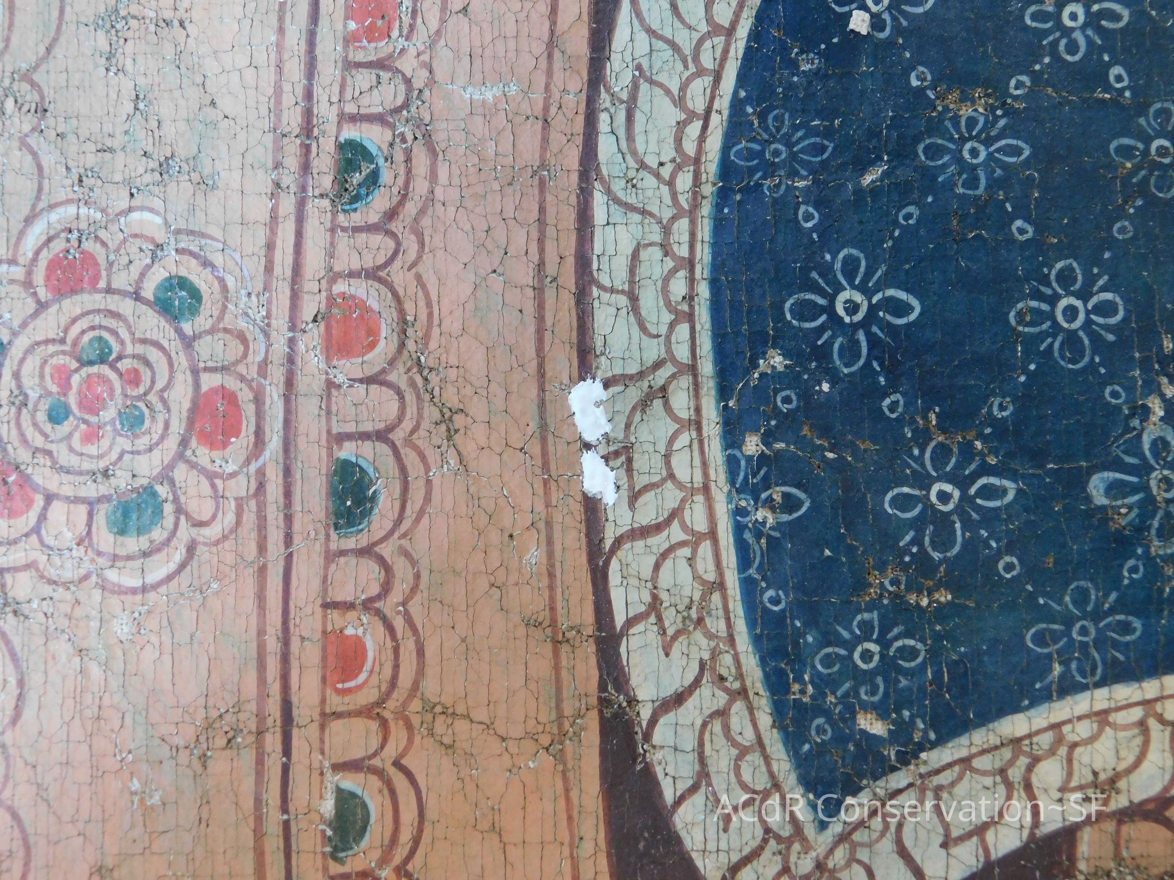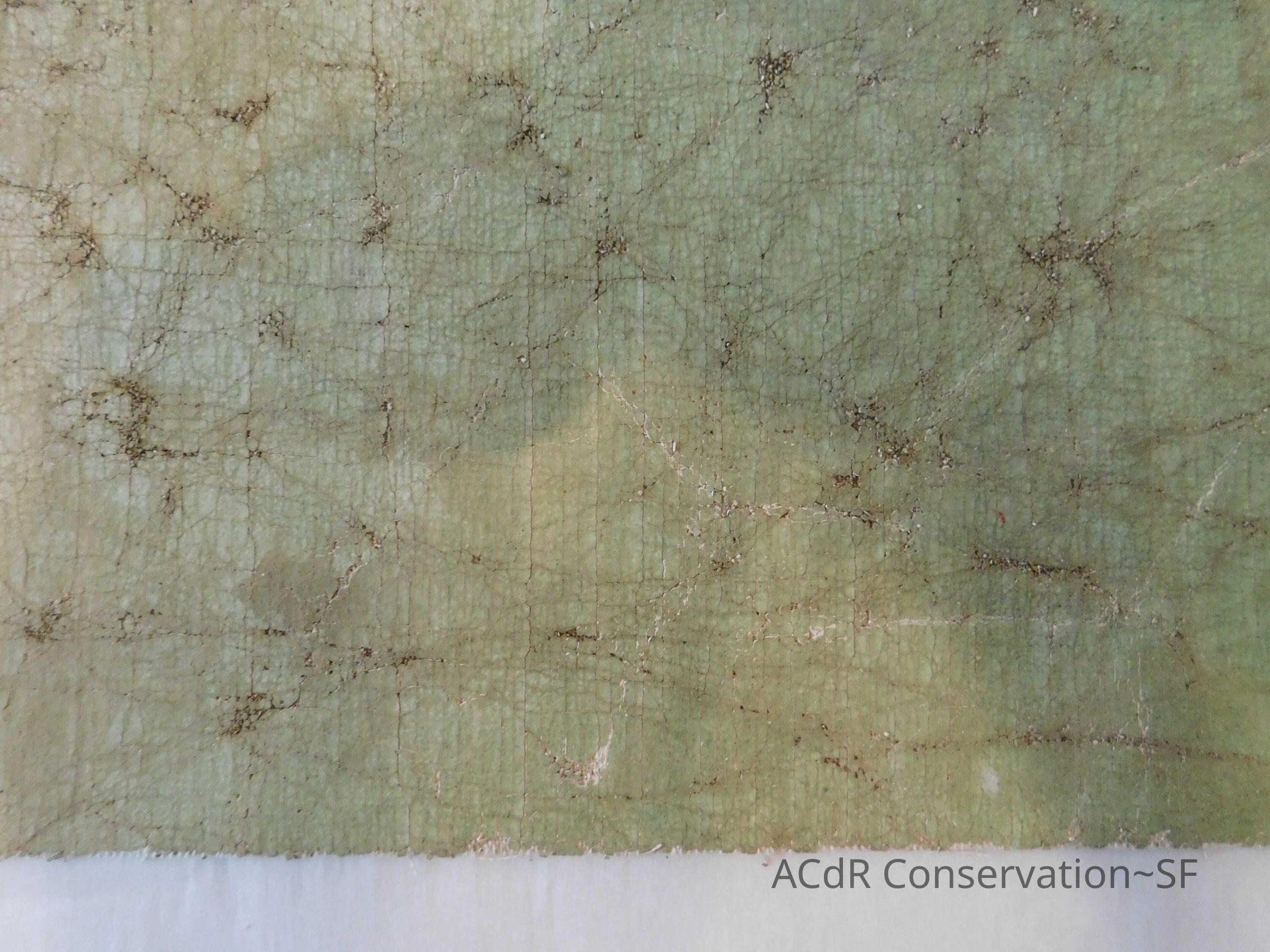 Color matched for background color with a wash of blue lake, yellow ochre, chinese white, ivory black, davy's gray. Clear gesso applied in small areas of loss. Color matched and smoothed background with wash.