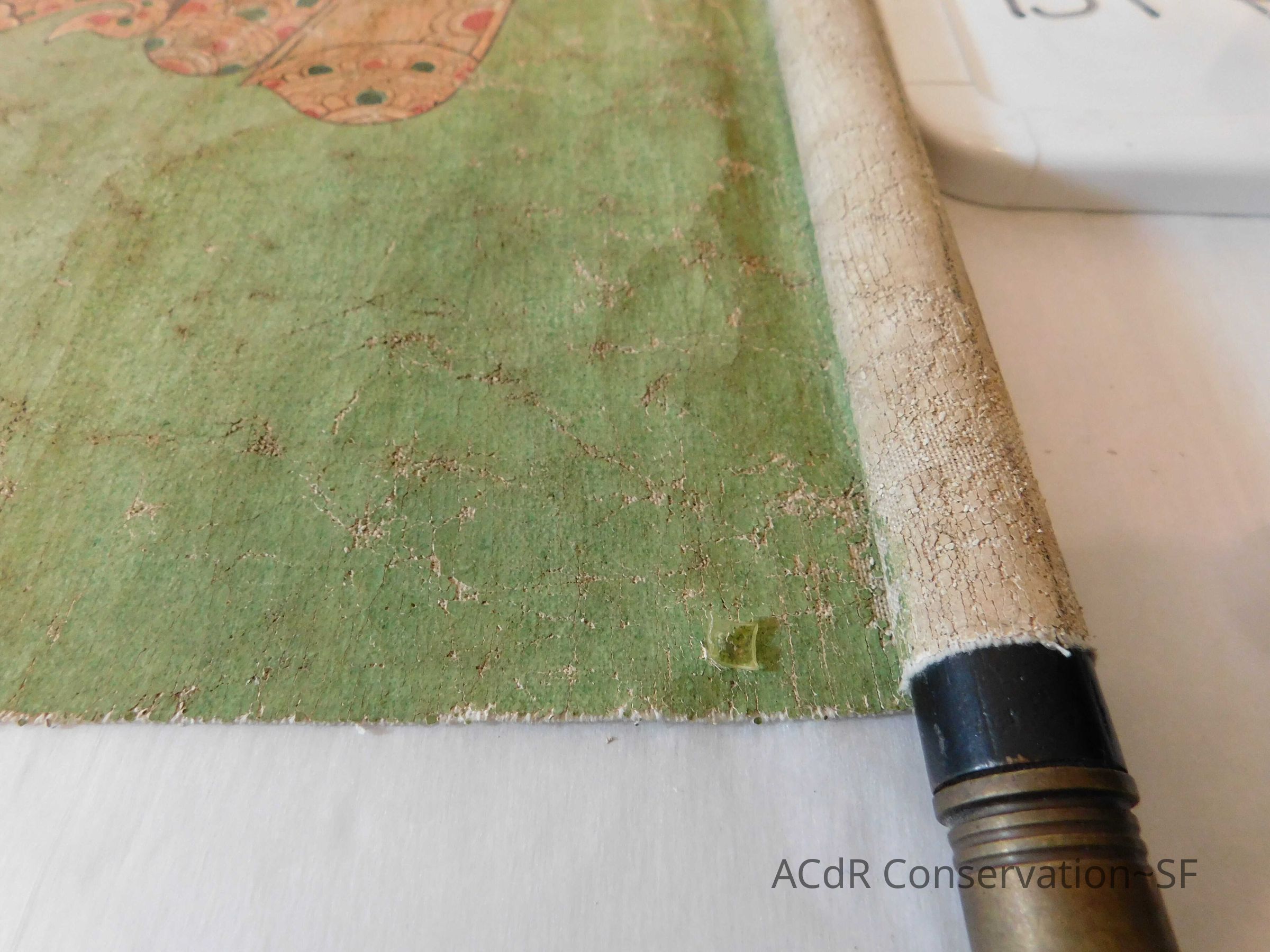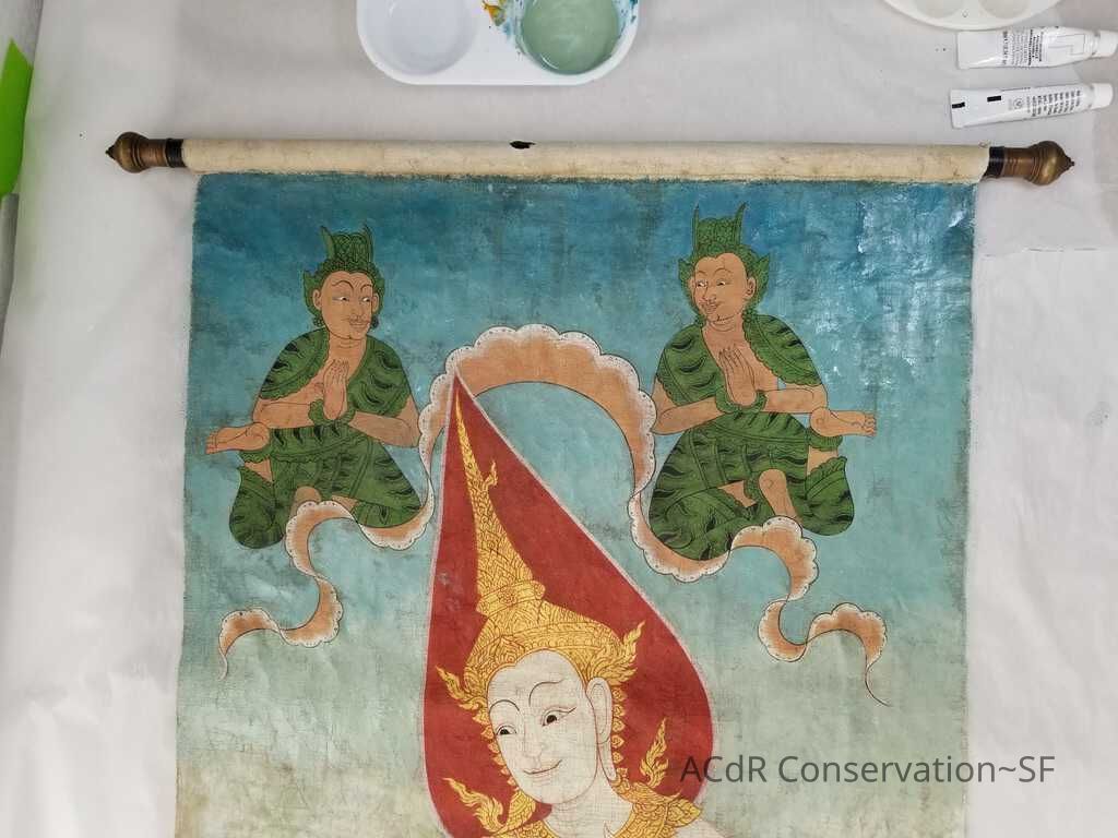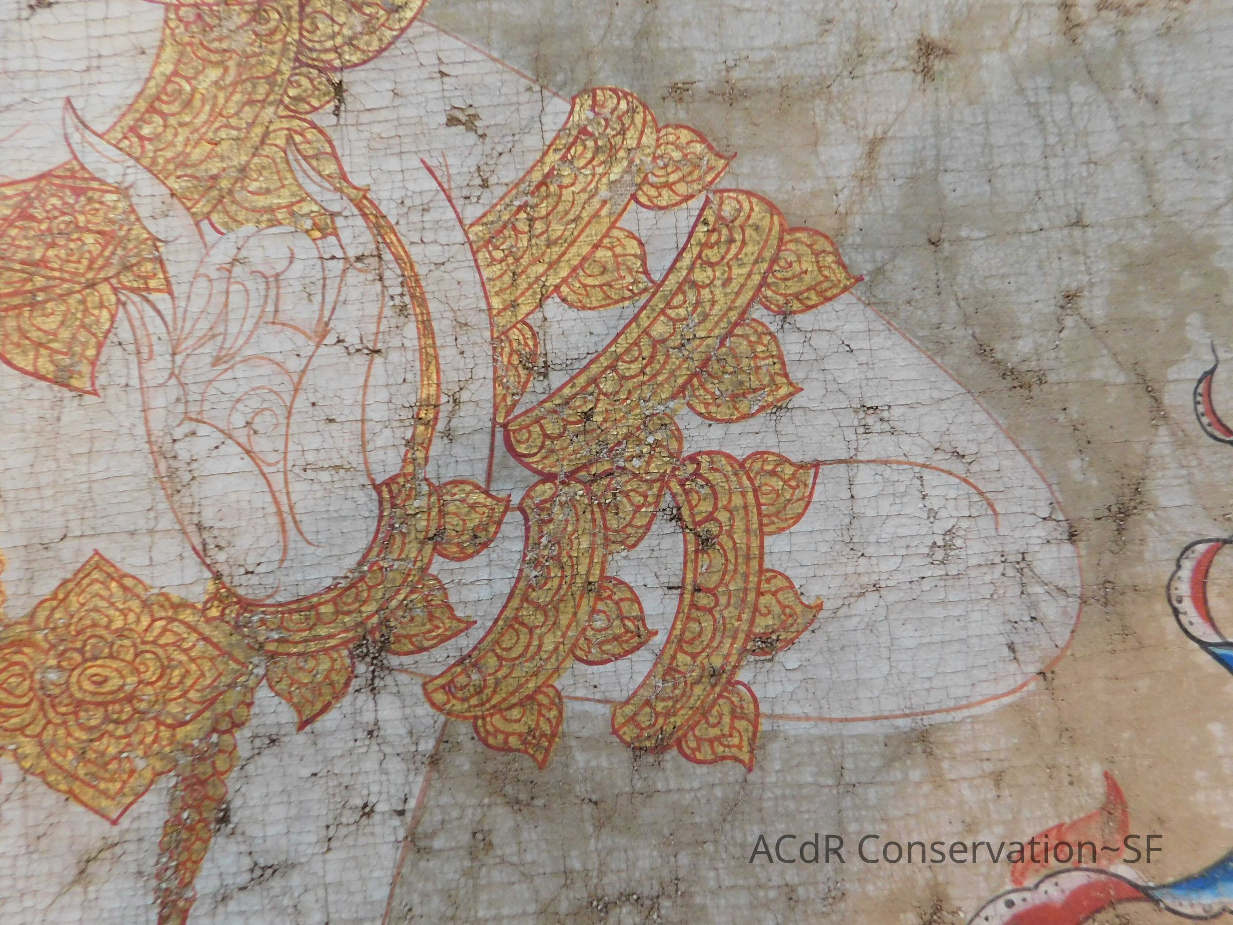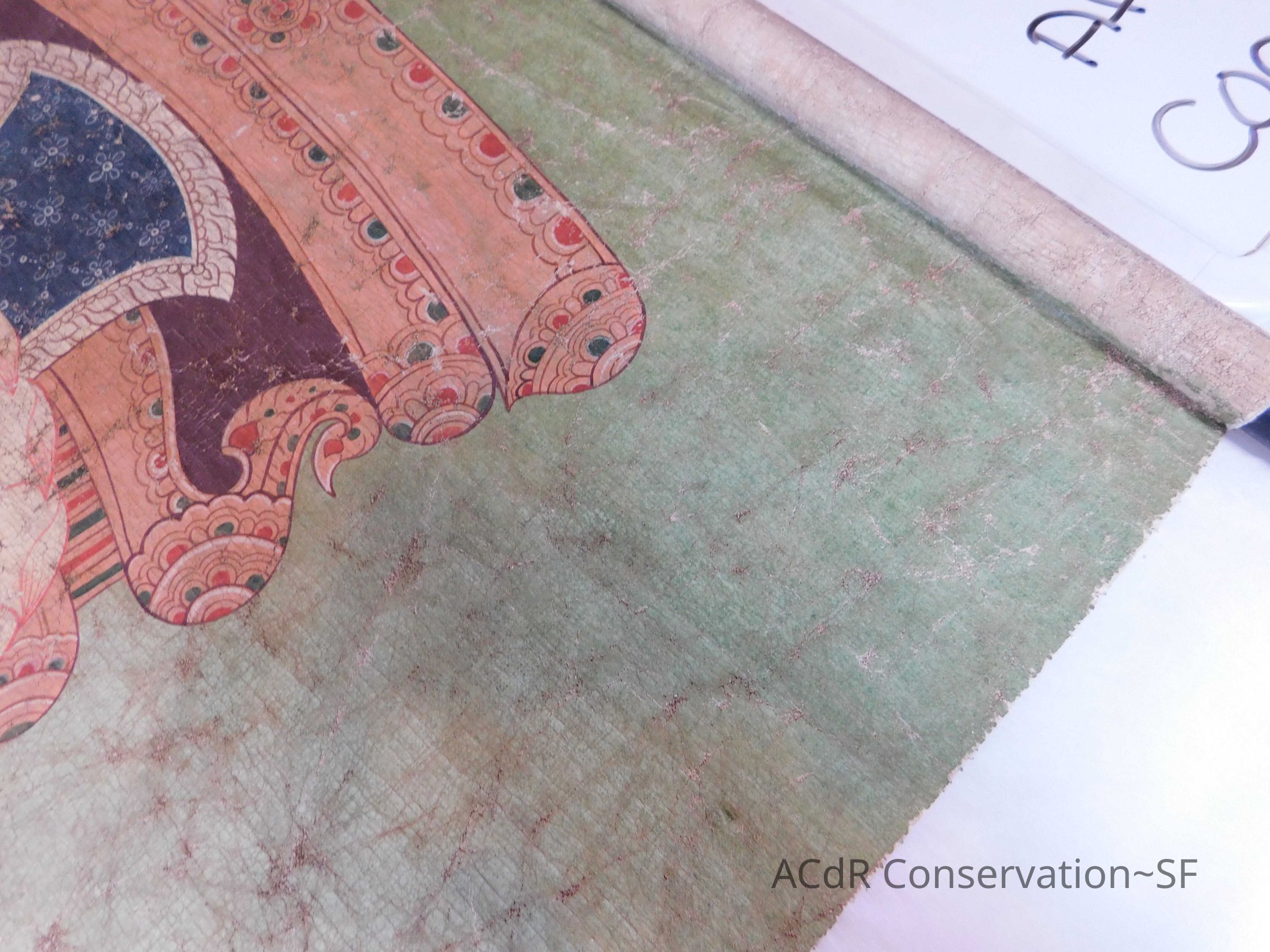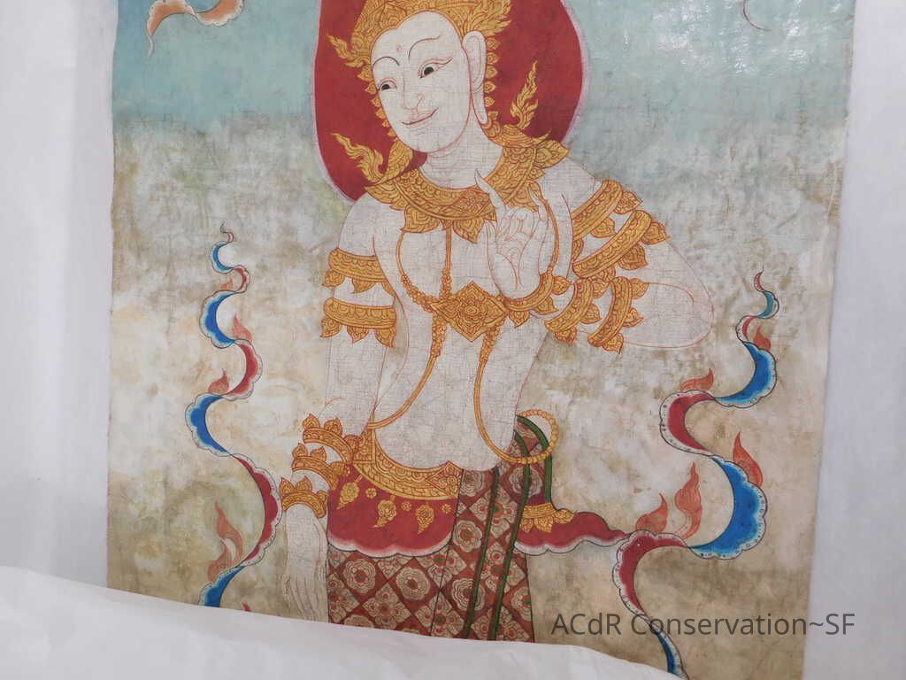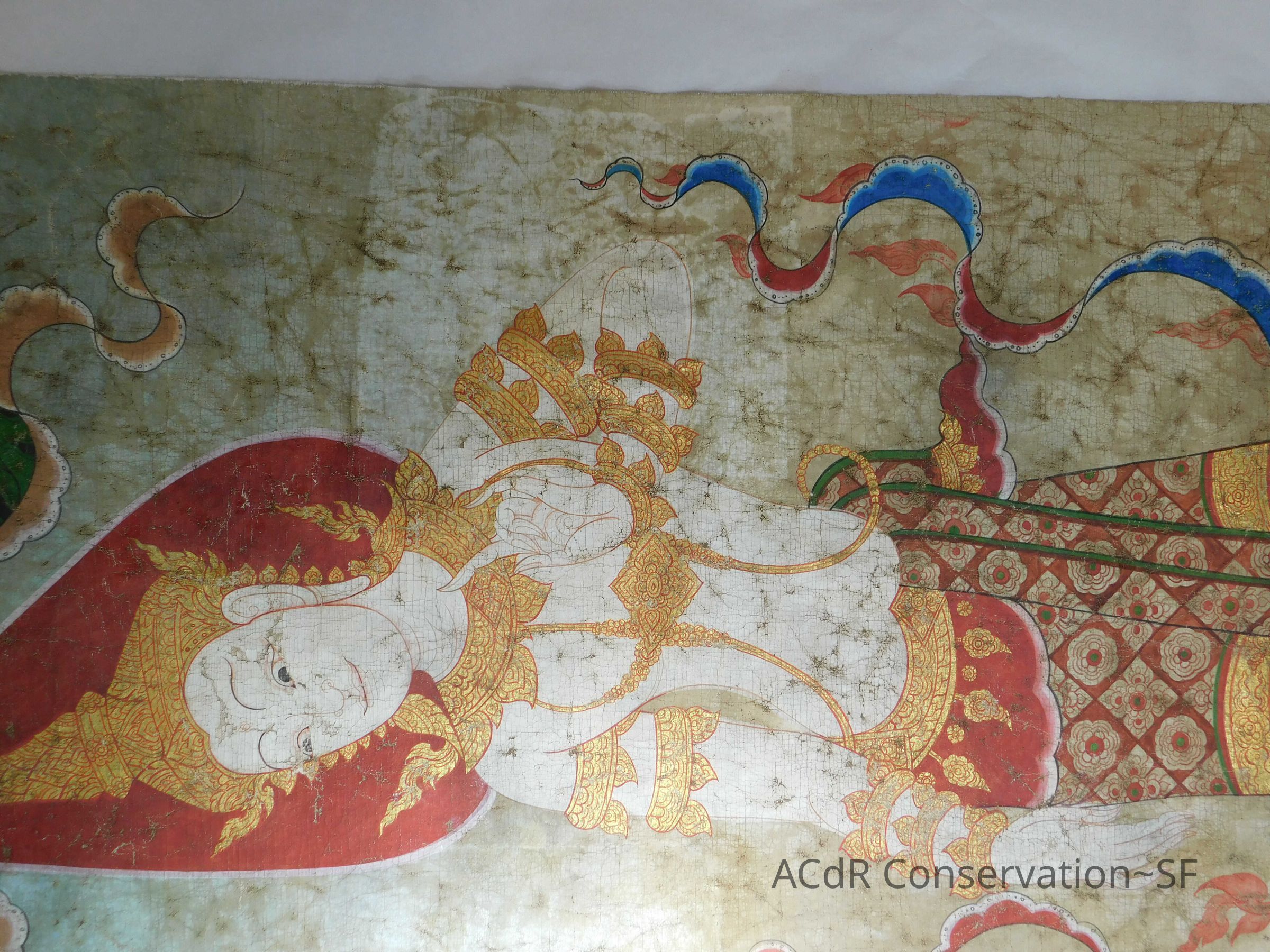 Color matched for background color with a wash of blue lake, yellow ochre, chinese white, ivory black, davy's gray. Clear gesso applied in small areas of loss. Color matched and smoothed background with wash.