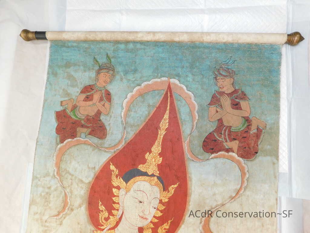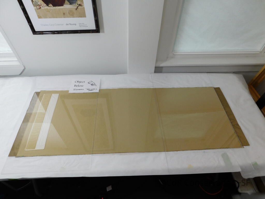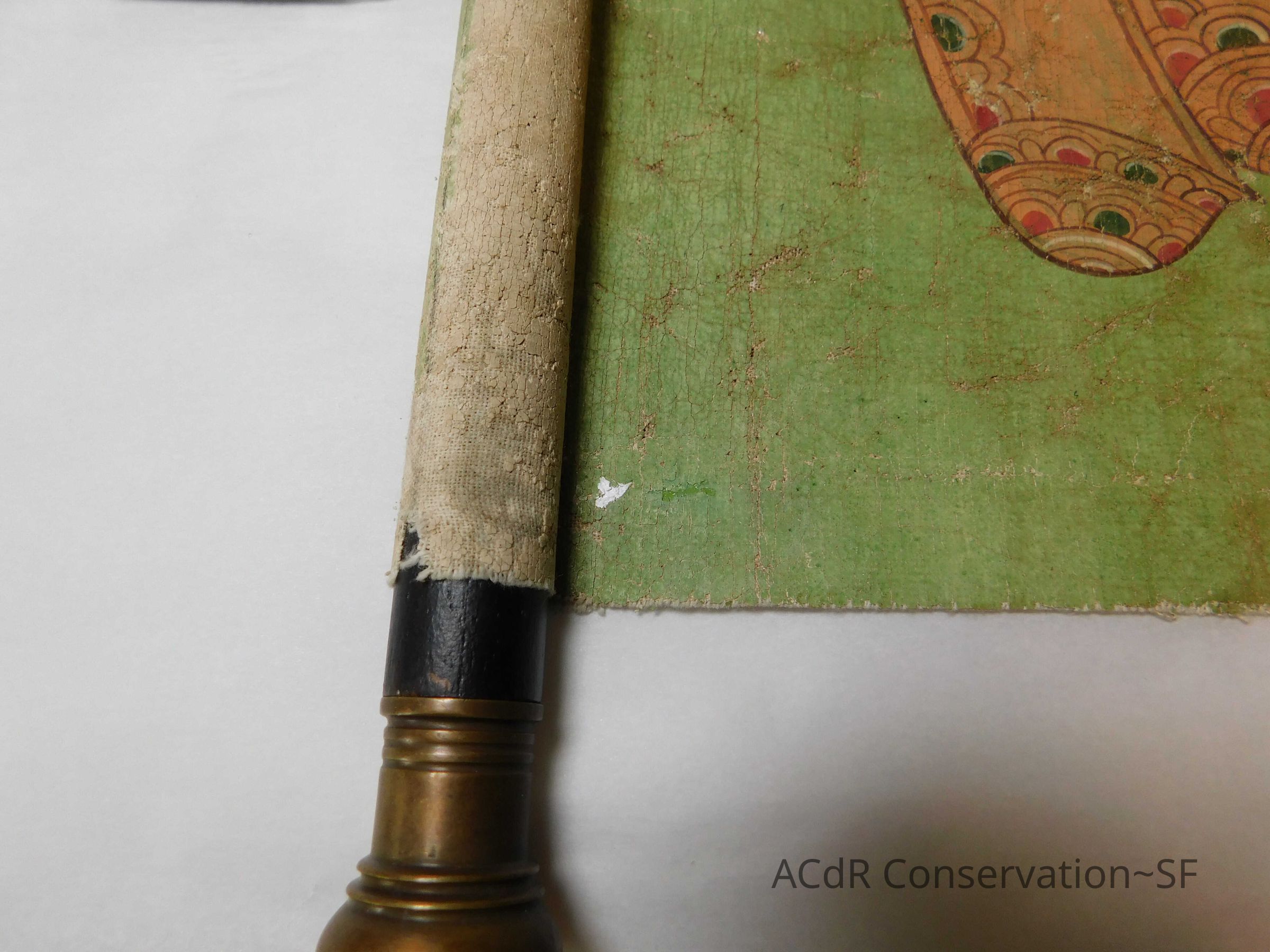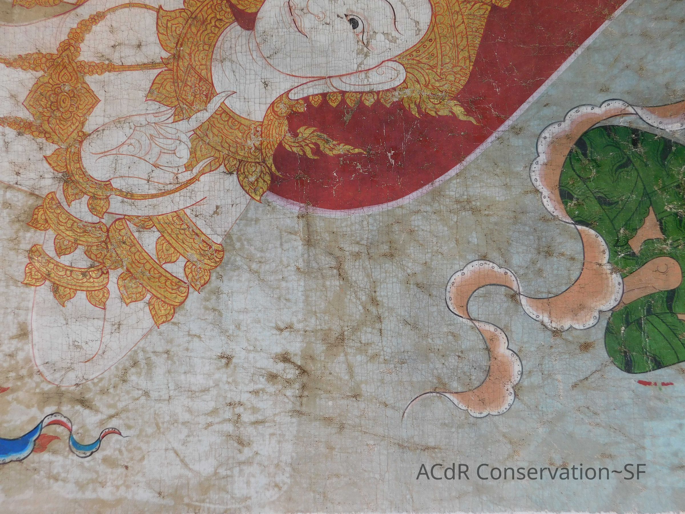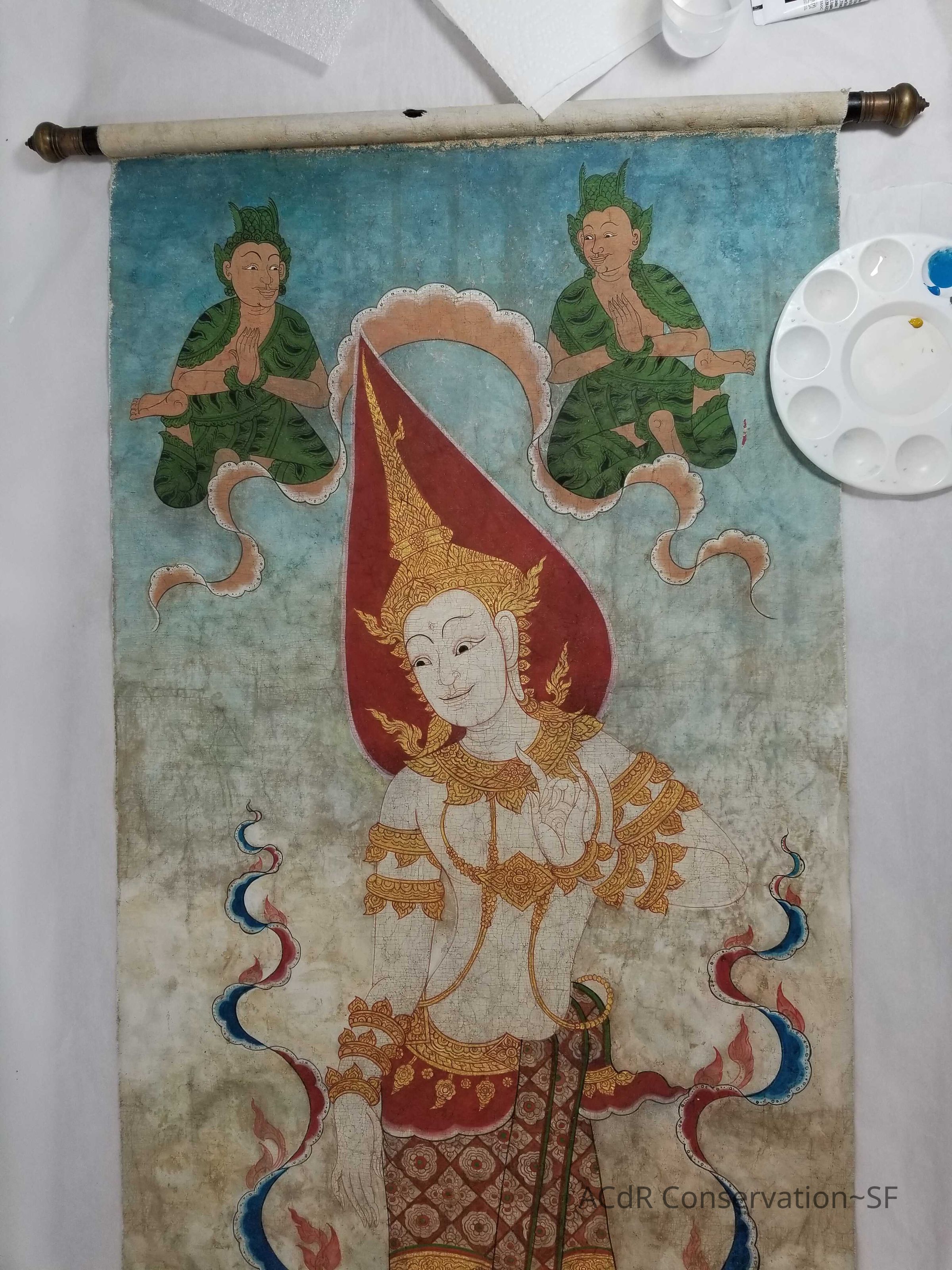 Color matched for background color with a wash of blue lake, yellow ochre, chinese white, ivory black, davy's gray. Clear gesso applied in small areas of loss. Color matched and smoothed background with wash.