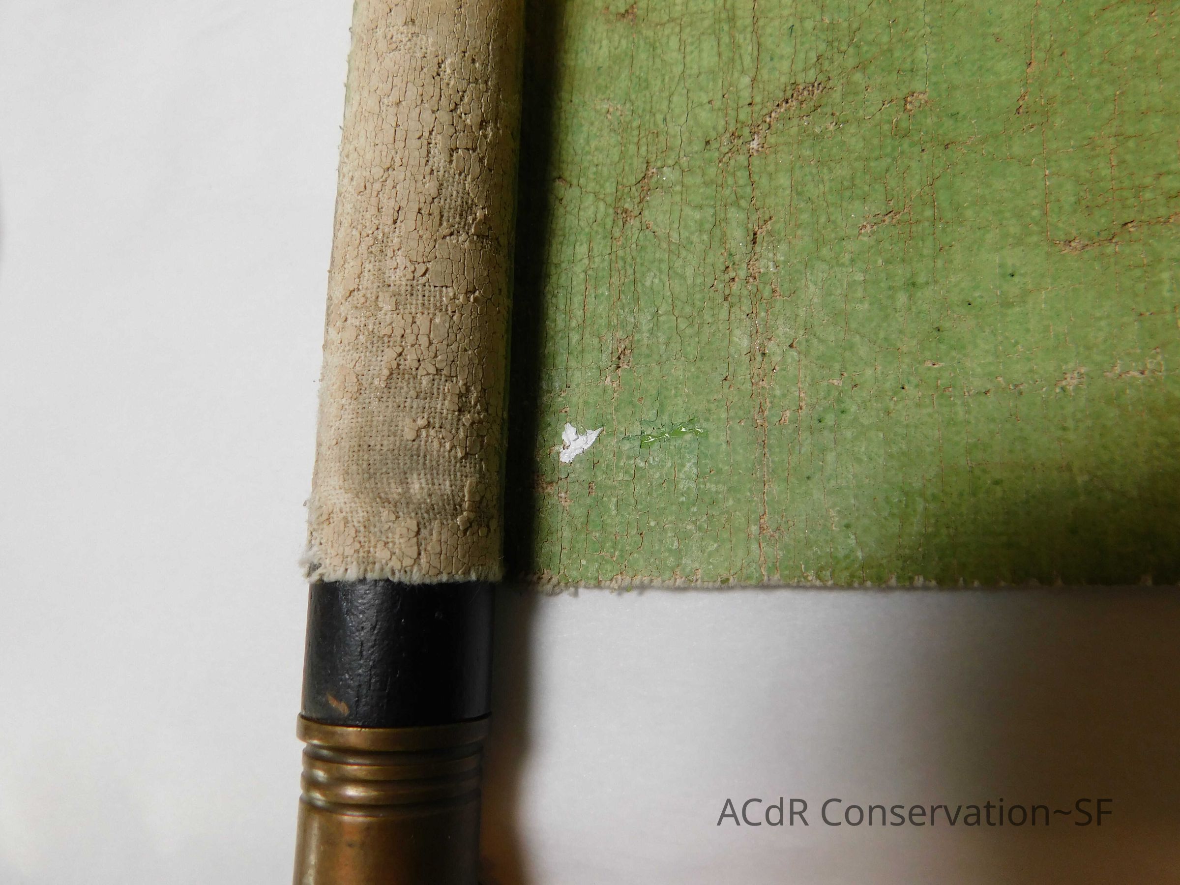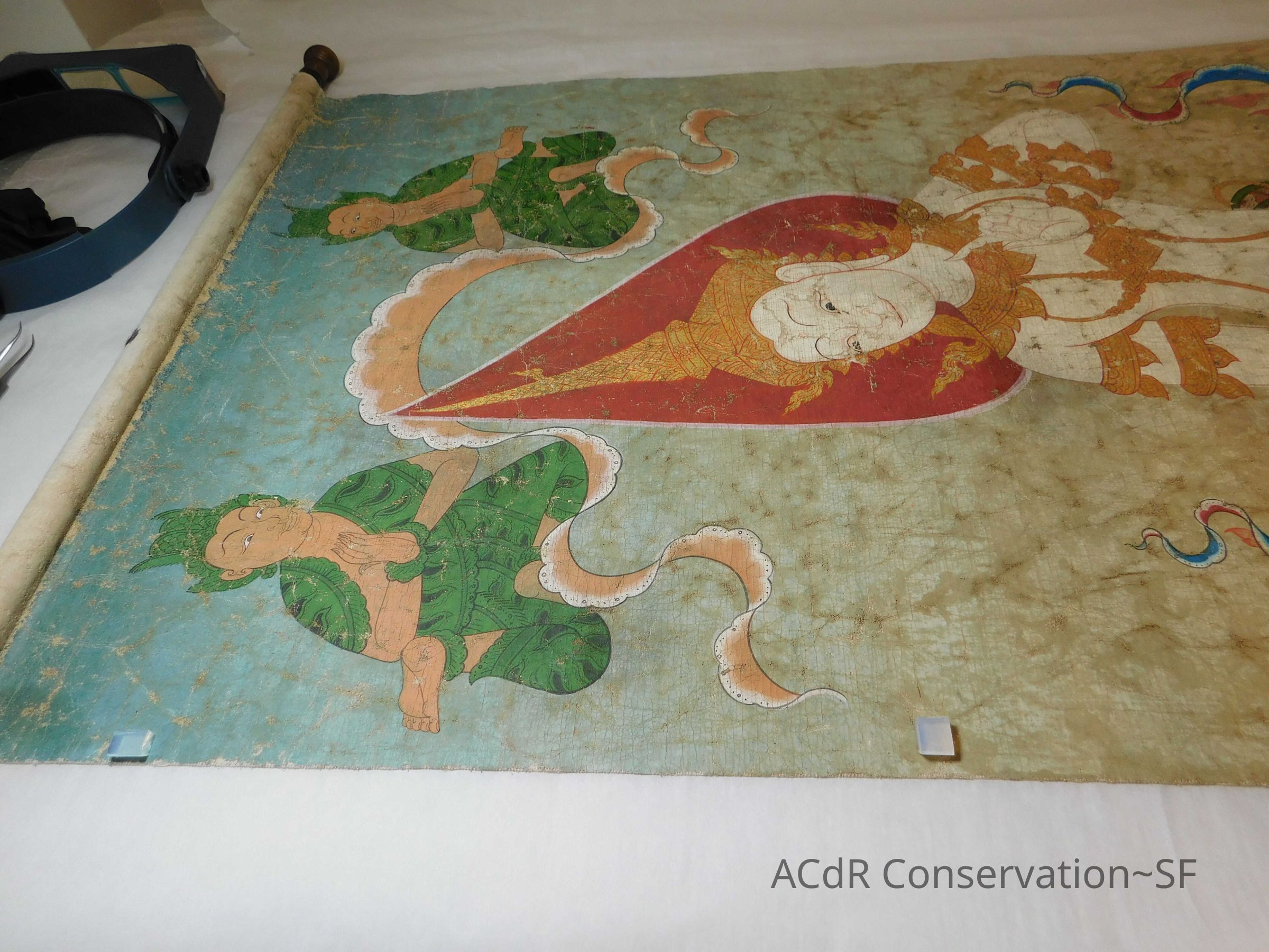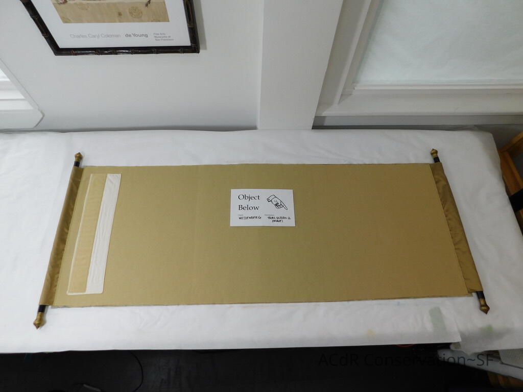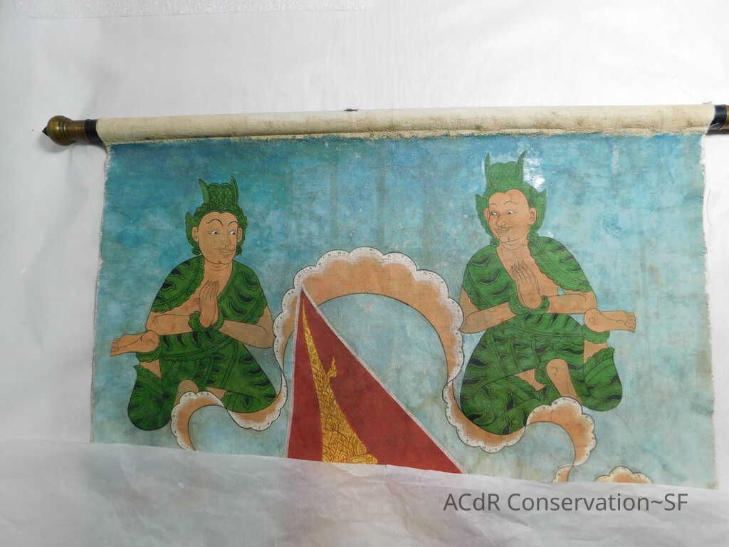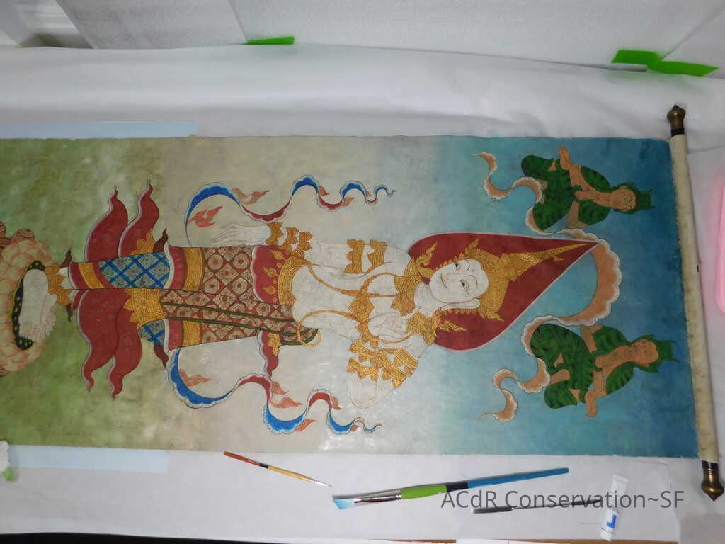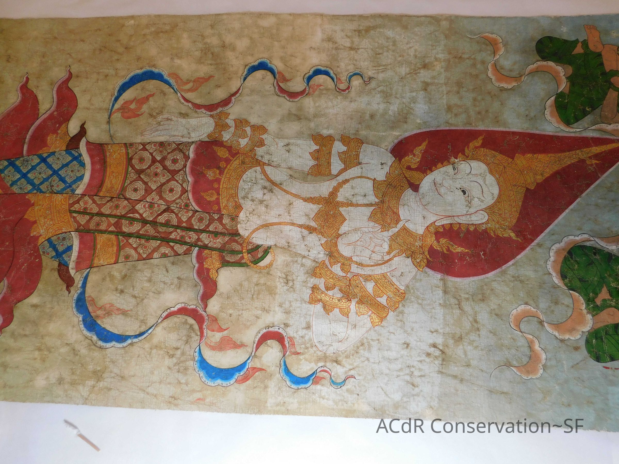 Color matched for background color with a wash of blue lake, yellow ochre, chinese white, ivory black, davy's gray. Clear gesso applied in small areas of loss. Color matched and smoothed background with wash.