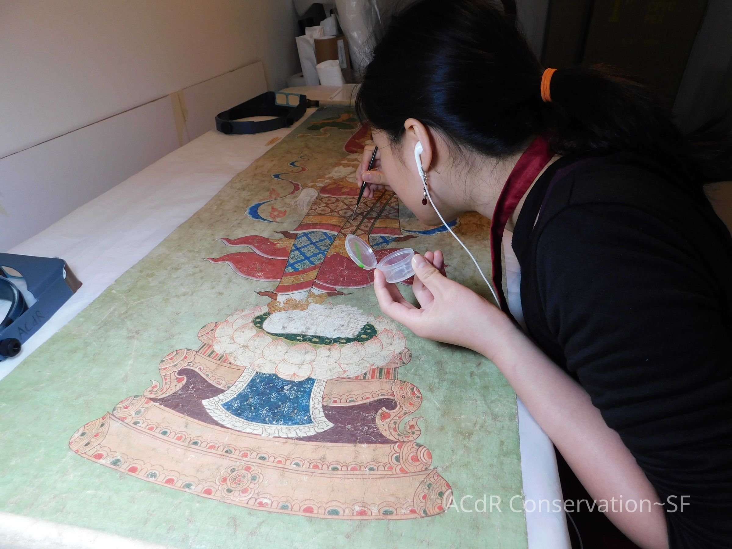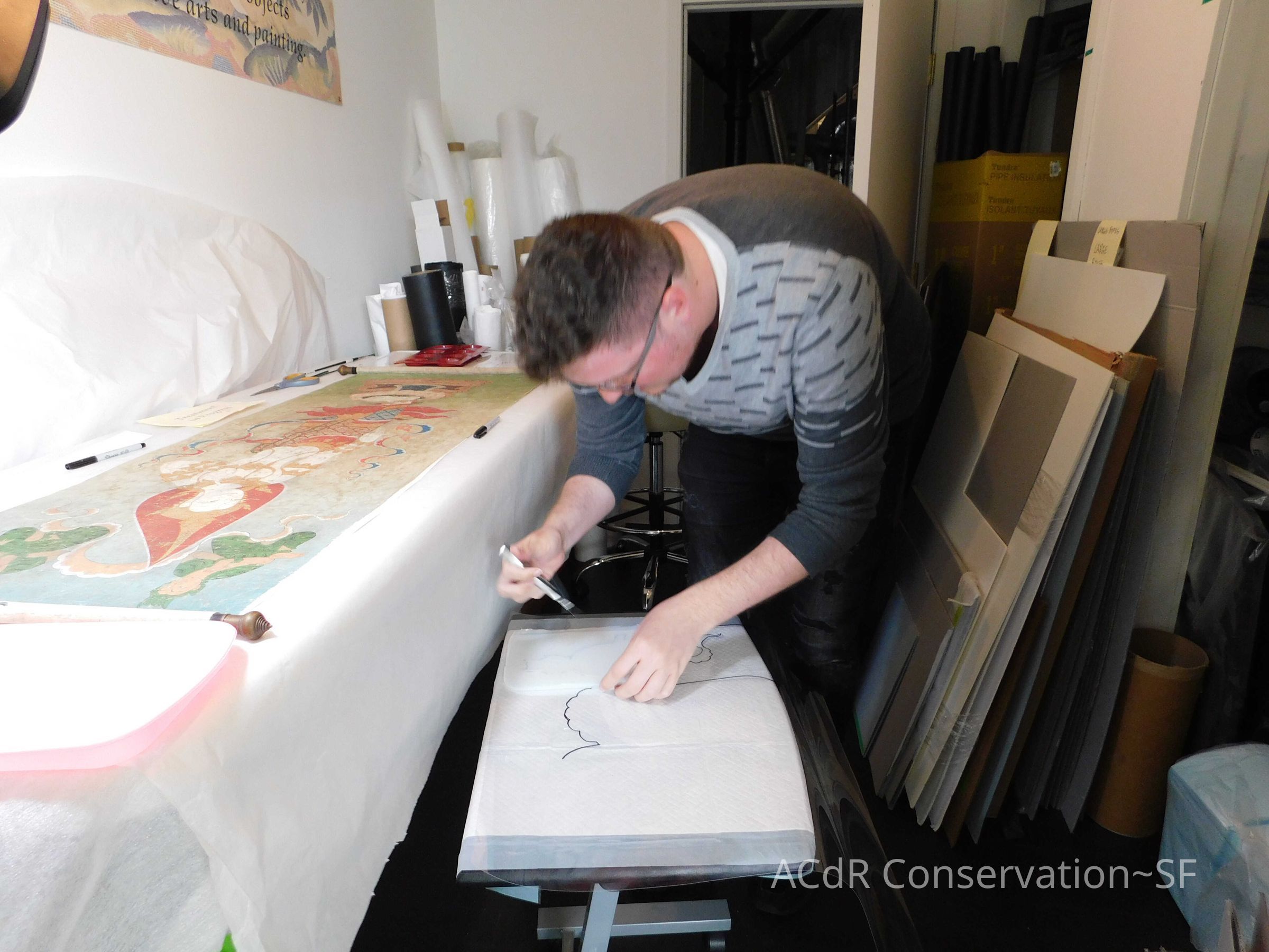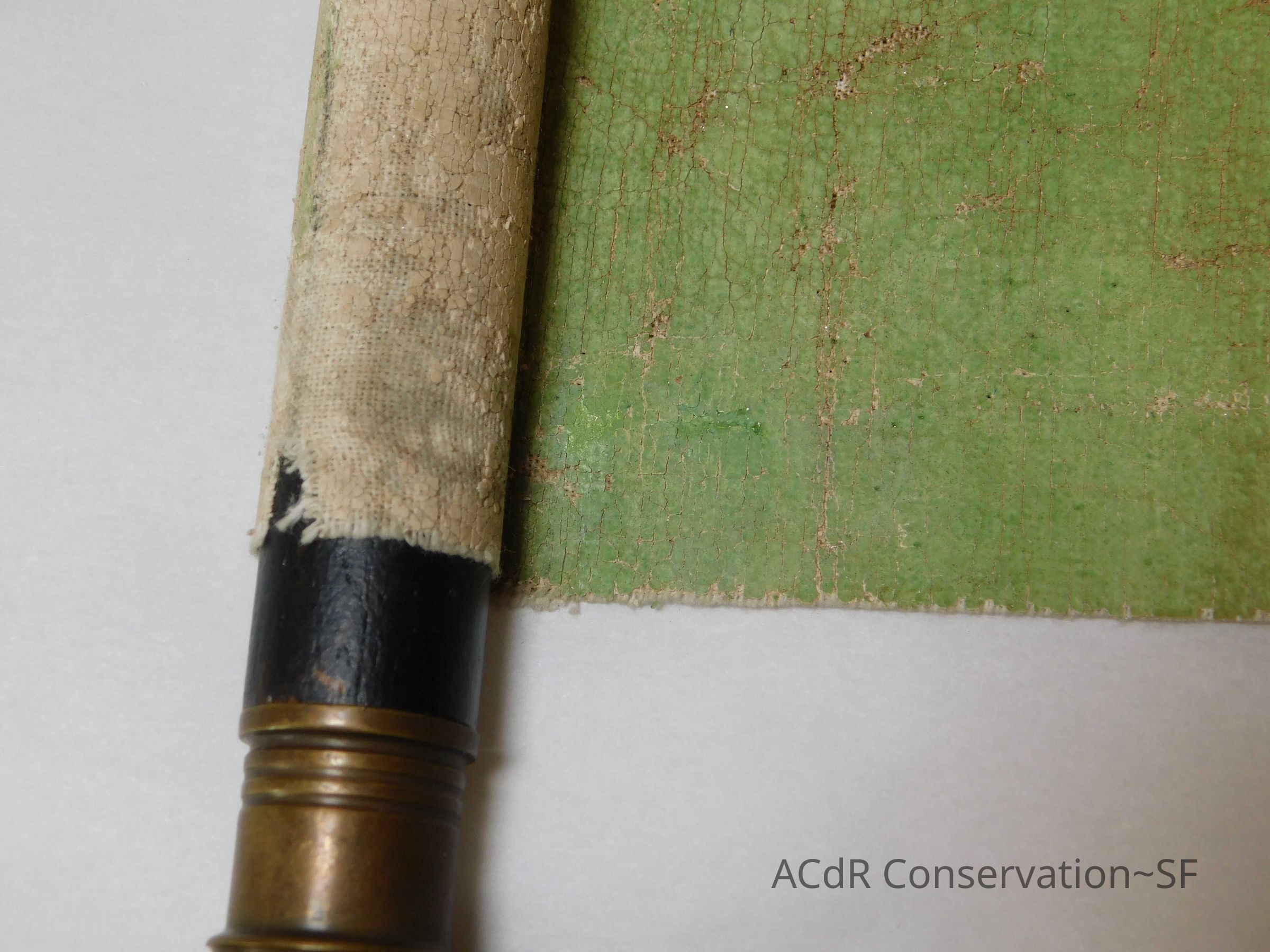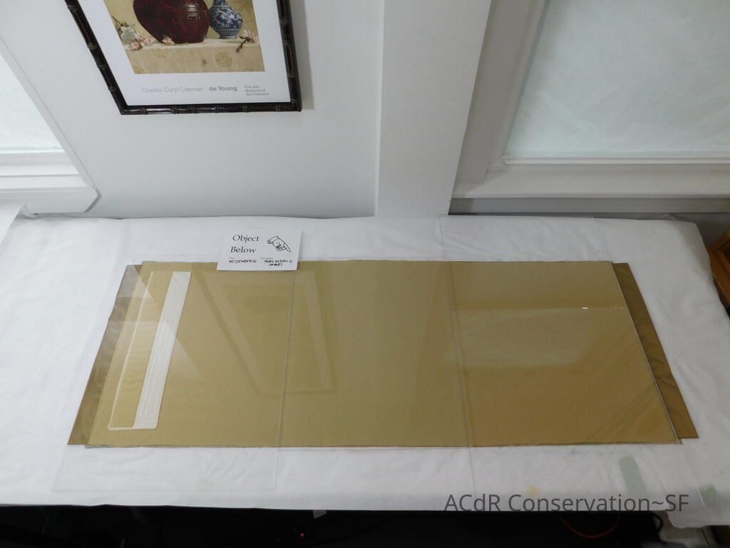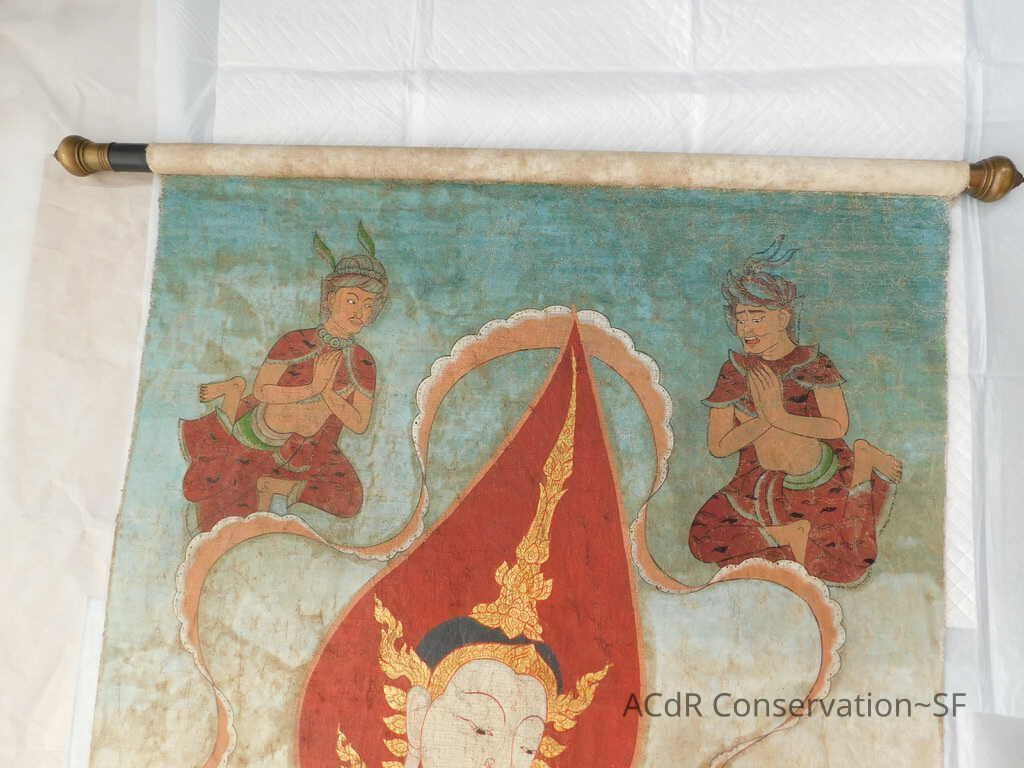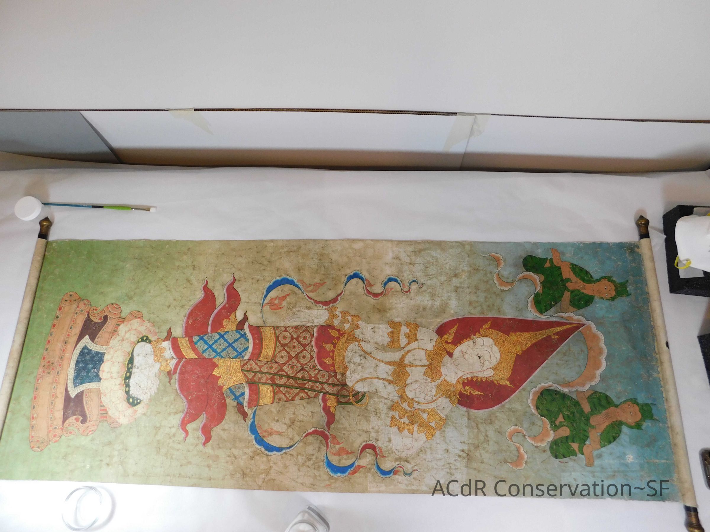Color matched for background color with a wash of blue lake, yellow ochre, chinese white, ivory black, davy's gray. Clear gesso applied in small areas of loss. Color matched and smoothed background with wash.