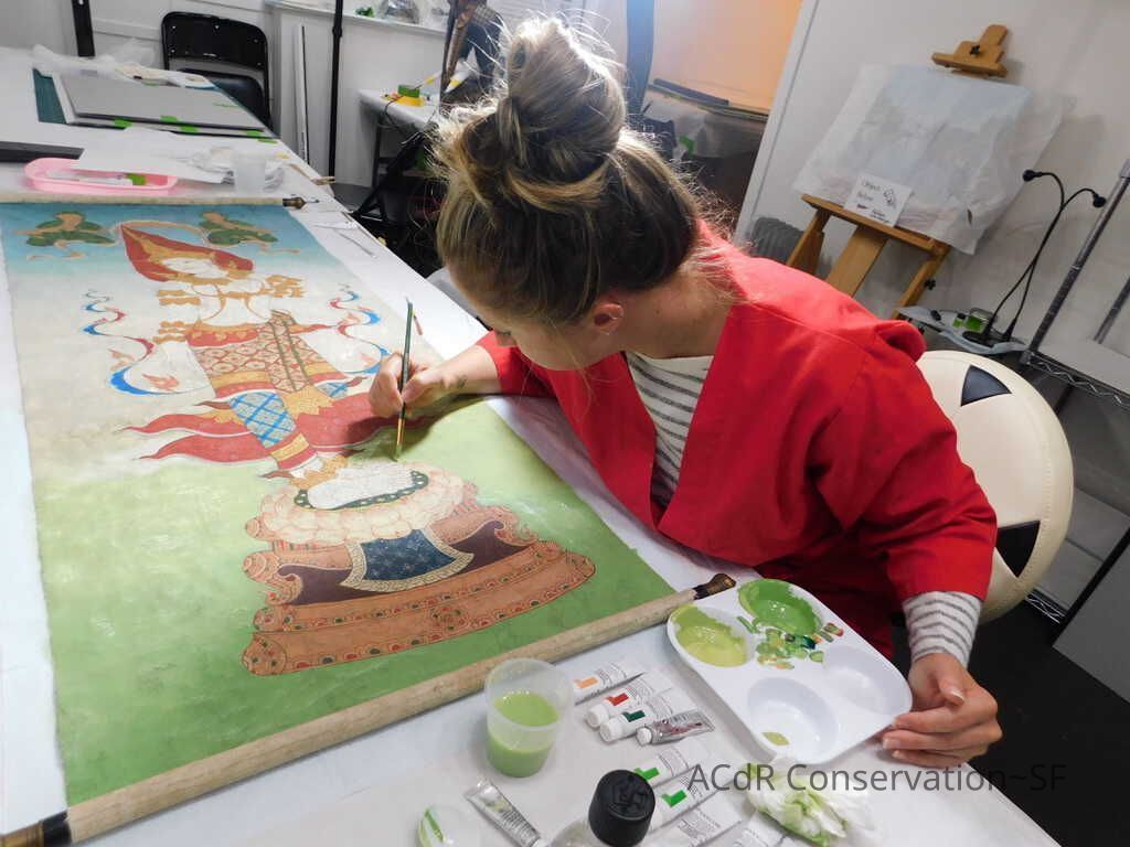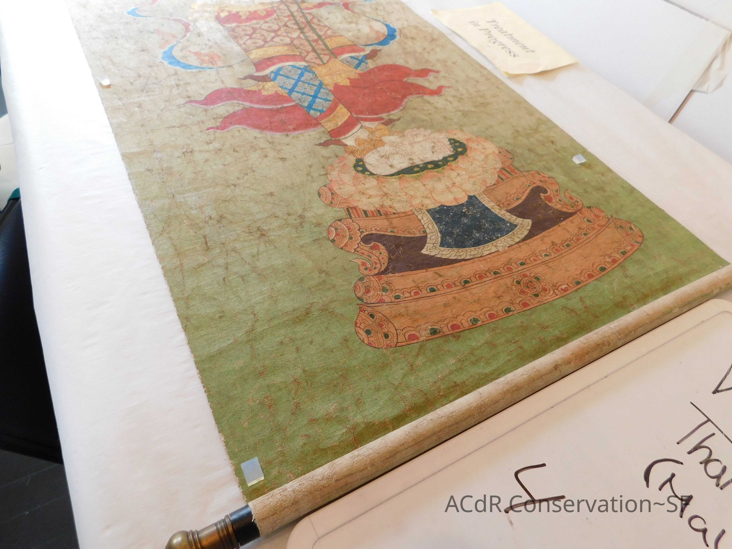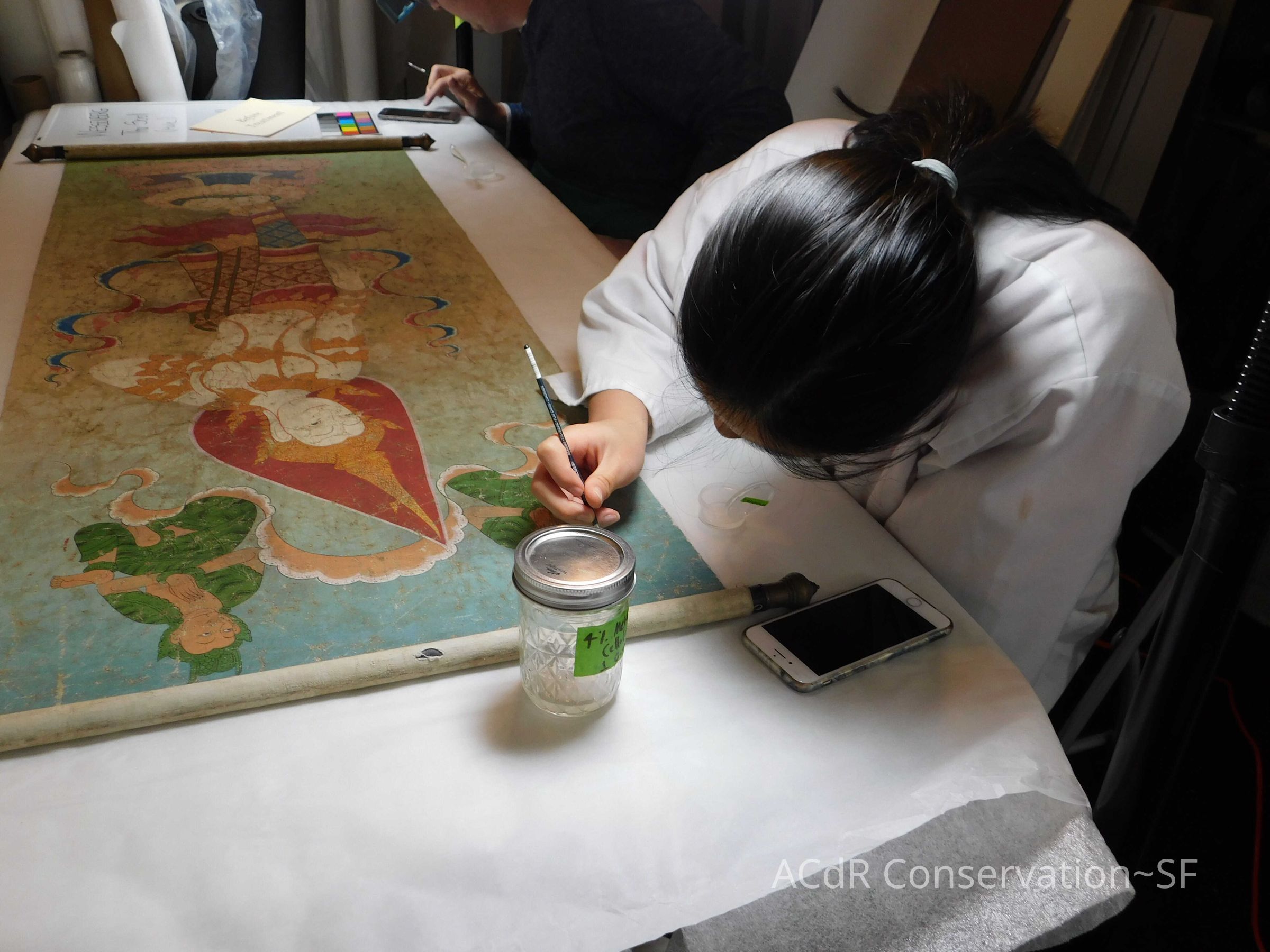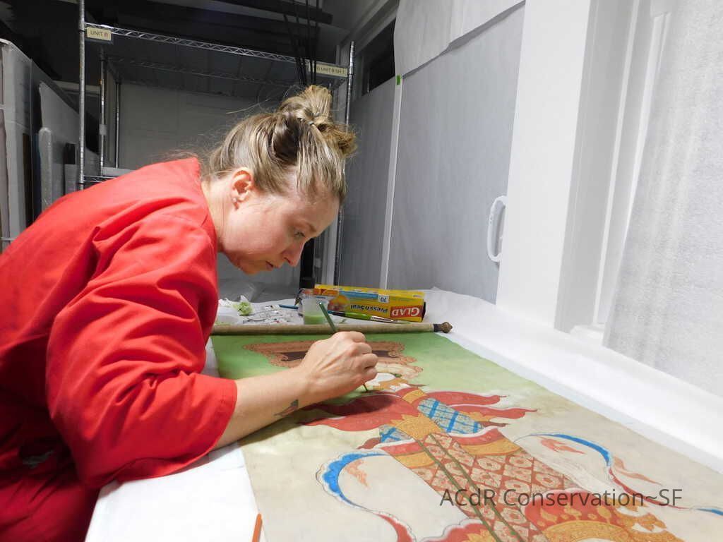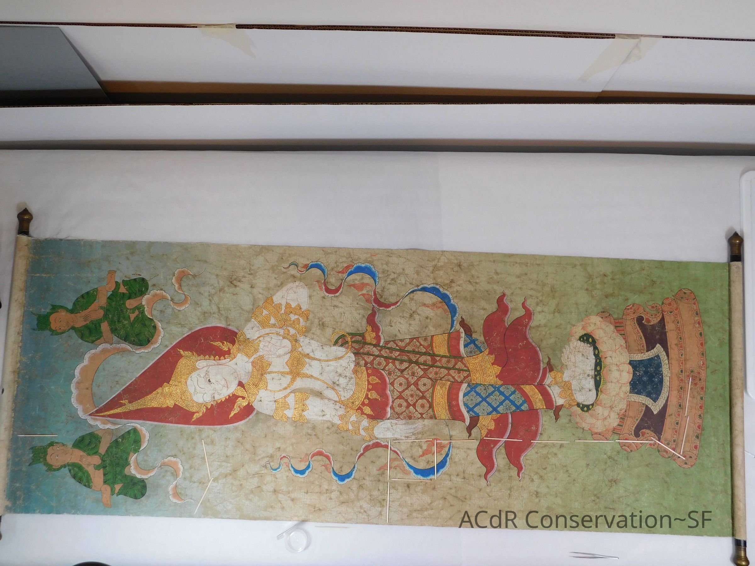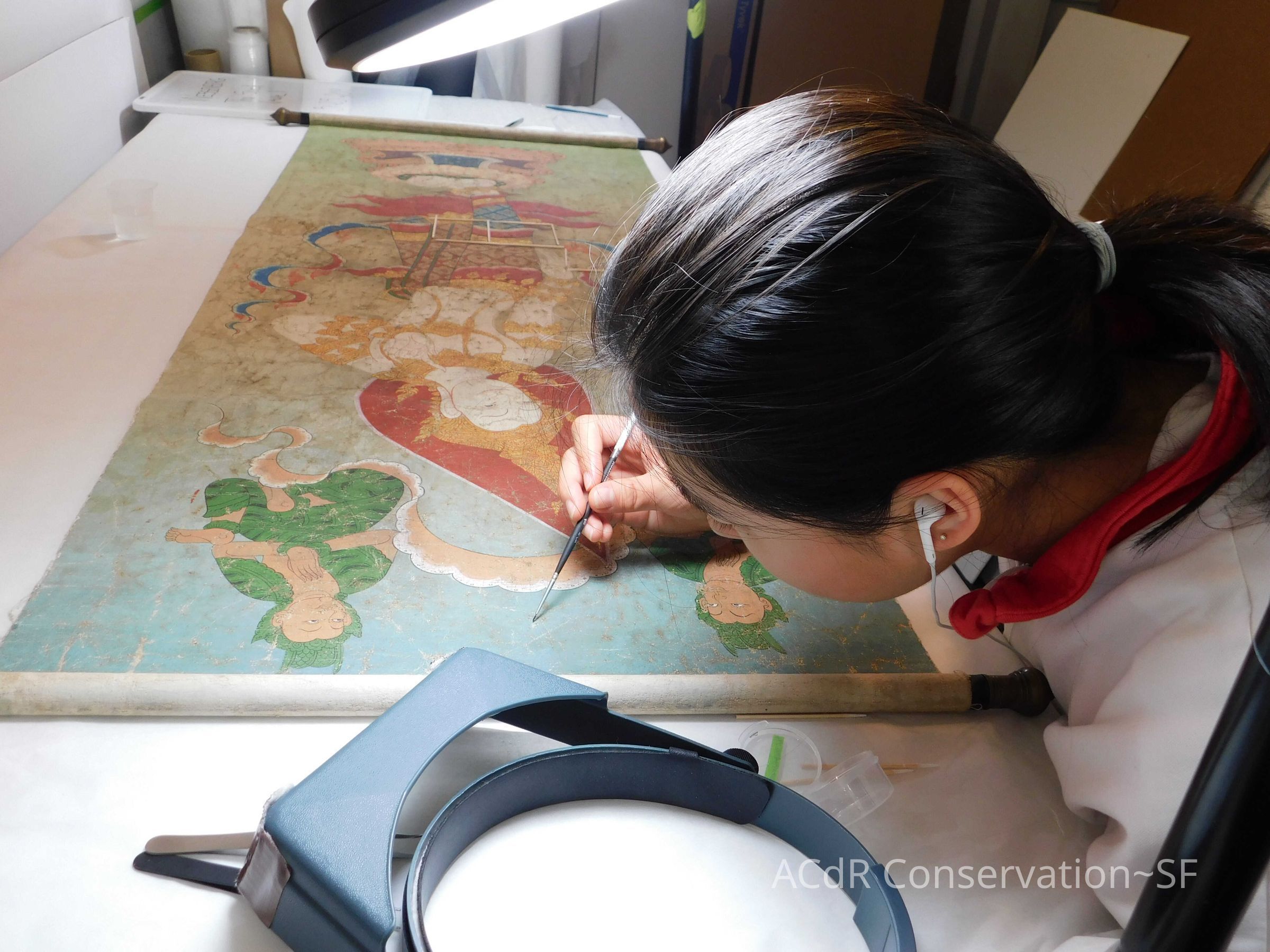 Color matched for background color with a wash of blue lake, yellow ochre, chinese white, ivory black, davy's gray. Clear gesso applied in small areas of loss. Color matched and smoothed background with wash.