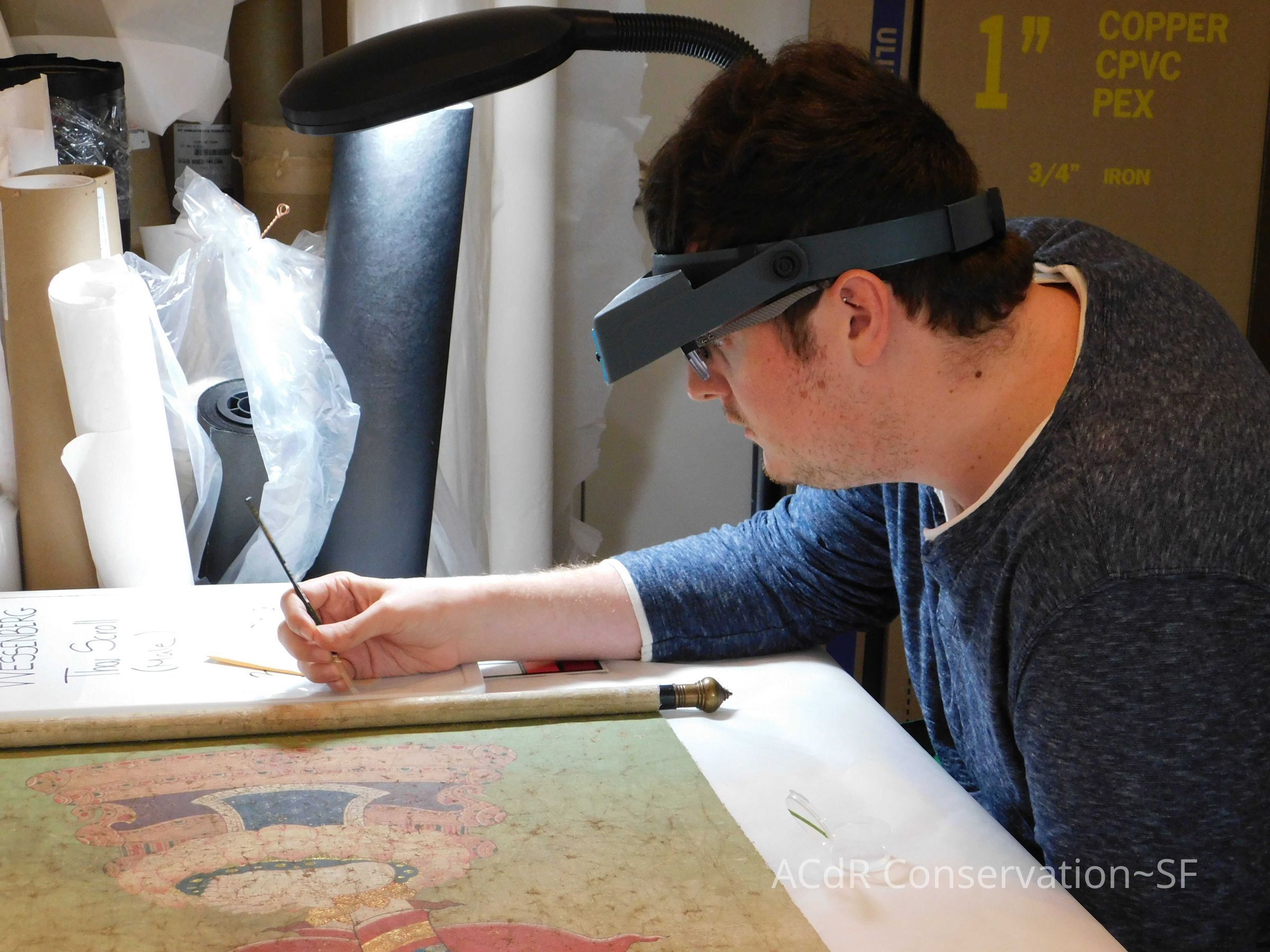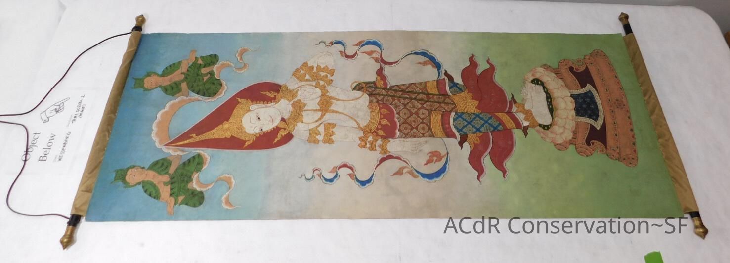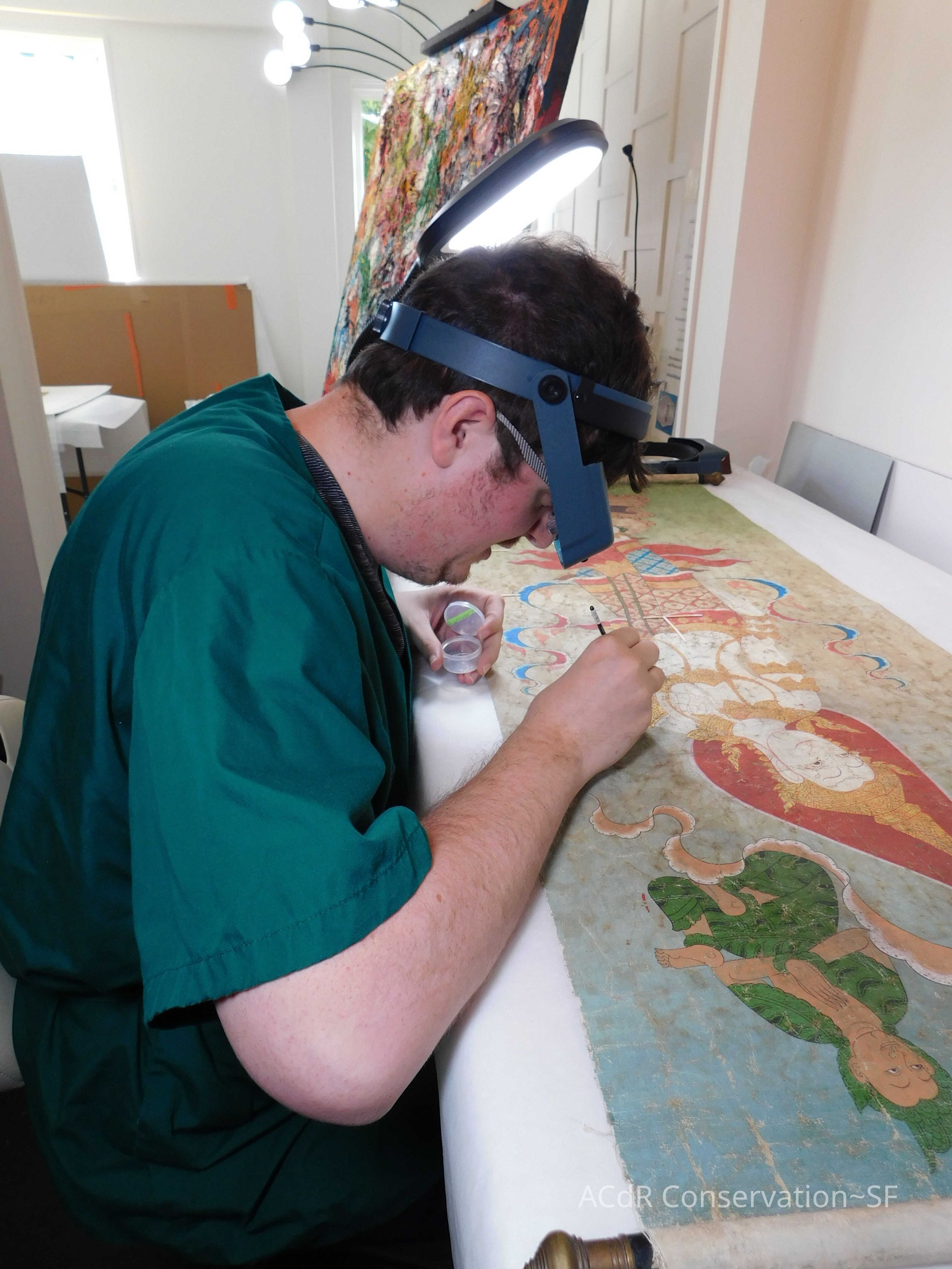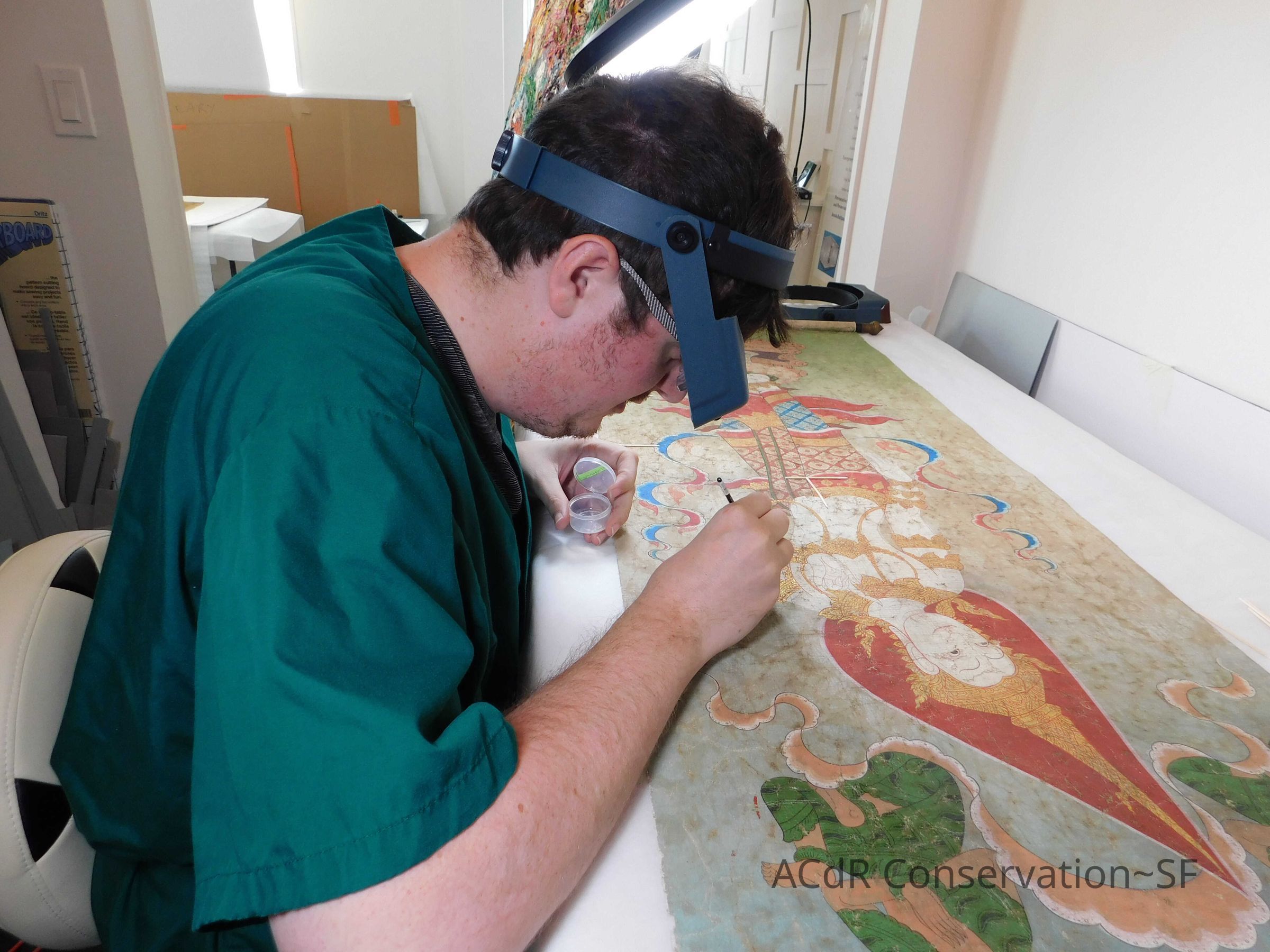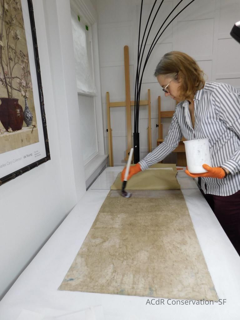 Color matched for background color with a wash of blue lake, yellow ochre, chinese white, ivory black, davy's gray. Clear gesso applied in small areas of loss. Color matched and smoothed background with wash.
