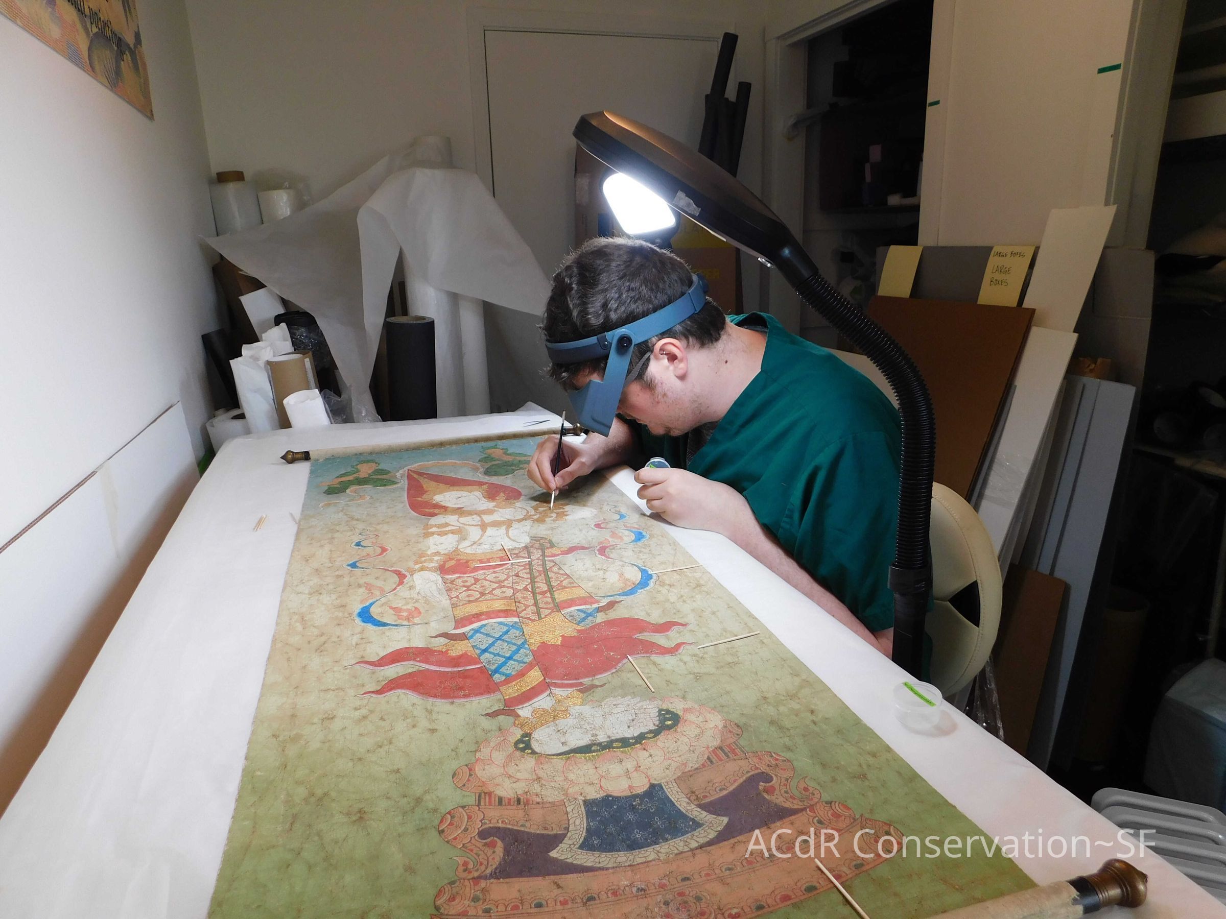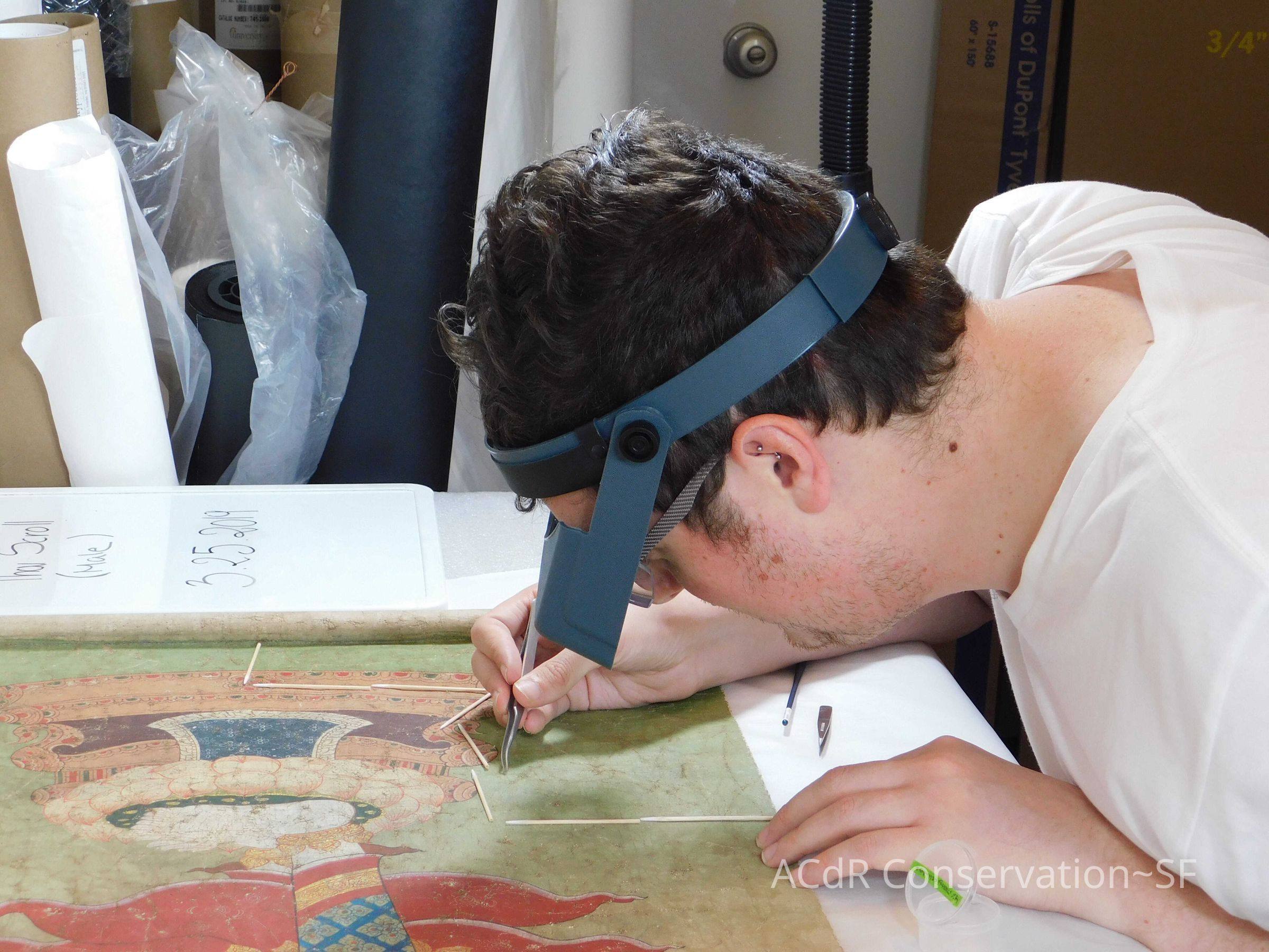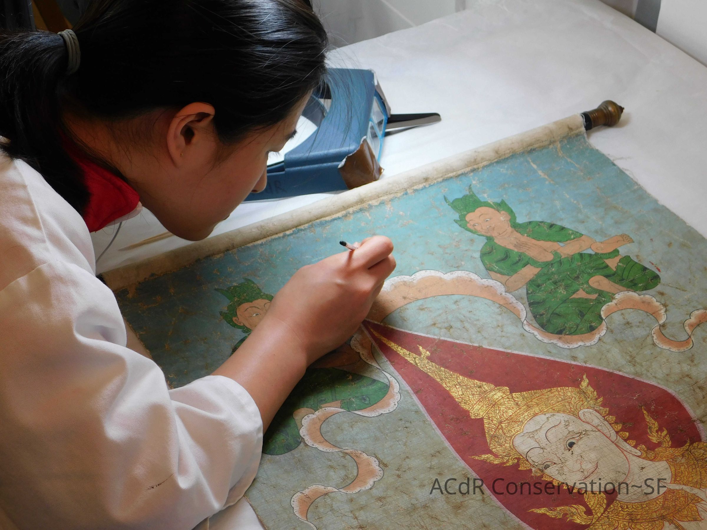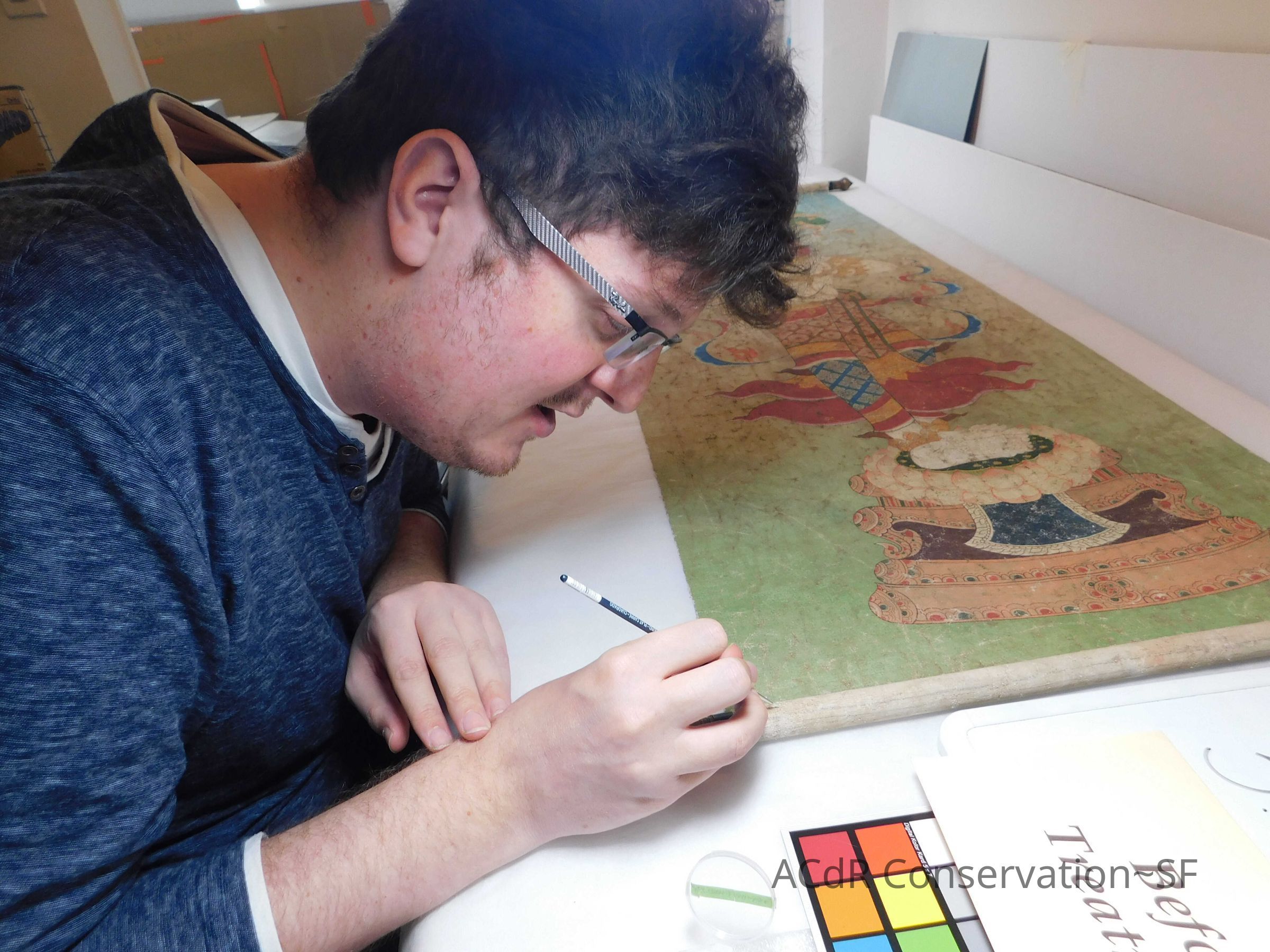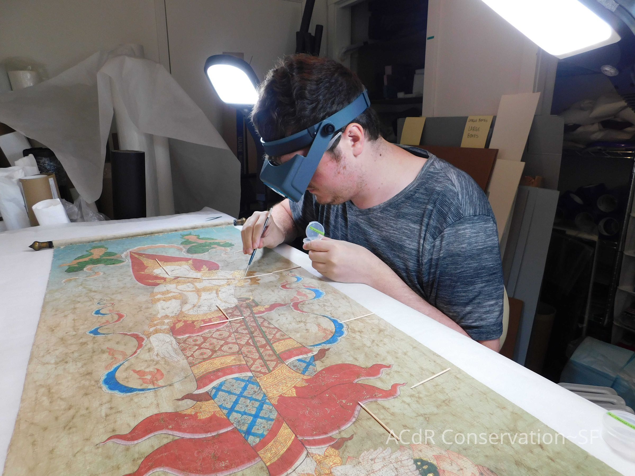 Color matched for background color with a wash of blue lake, yellow ochre, chinese white, ivory black, davy's gray. Clear gesso applied in small areas of loss. Color matched and smoothed background with wash.