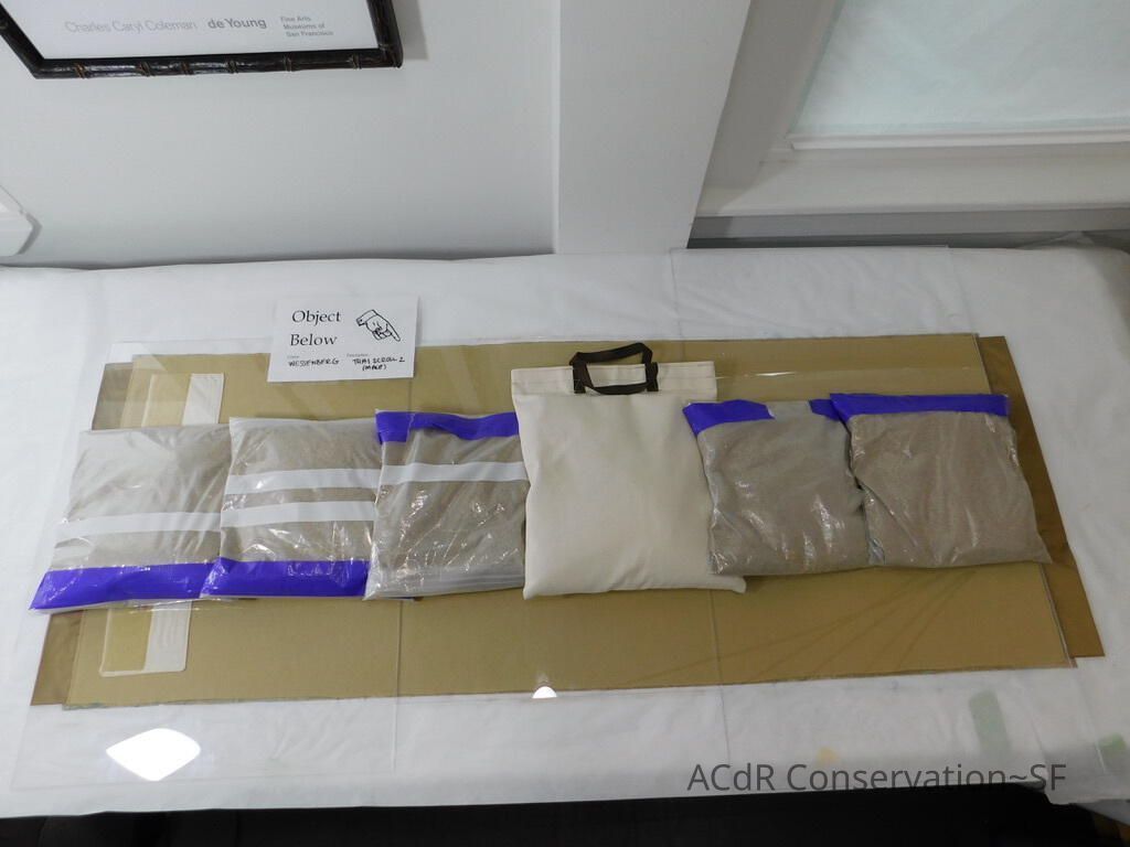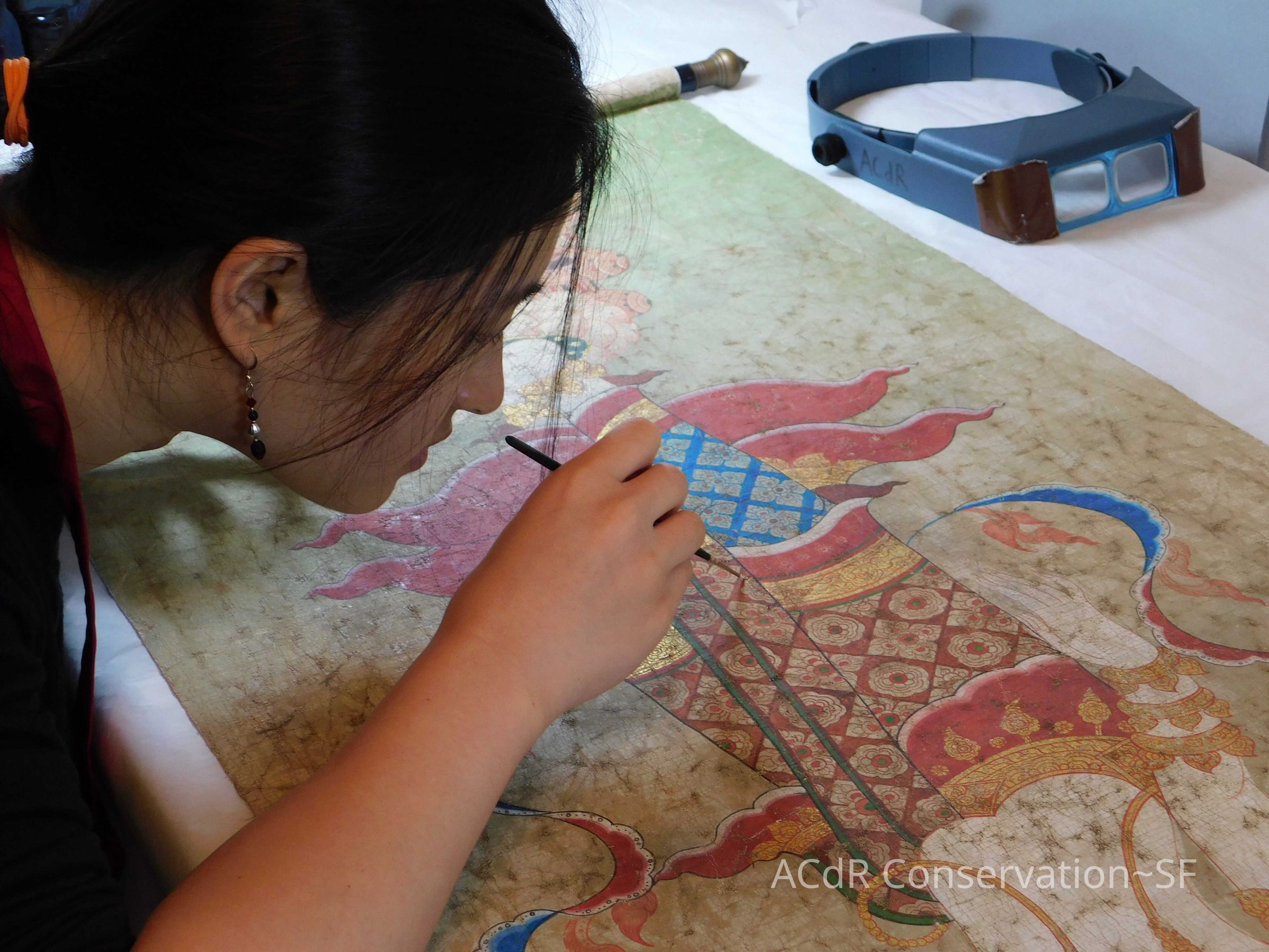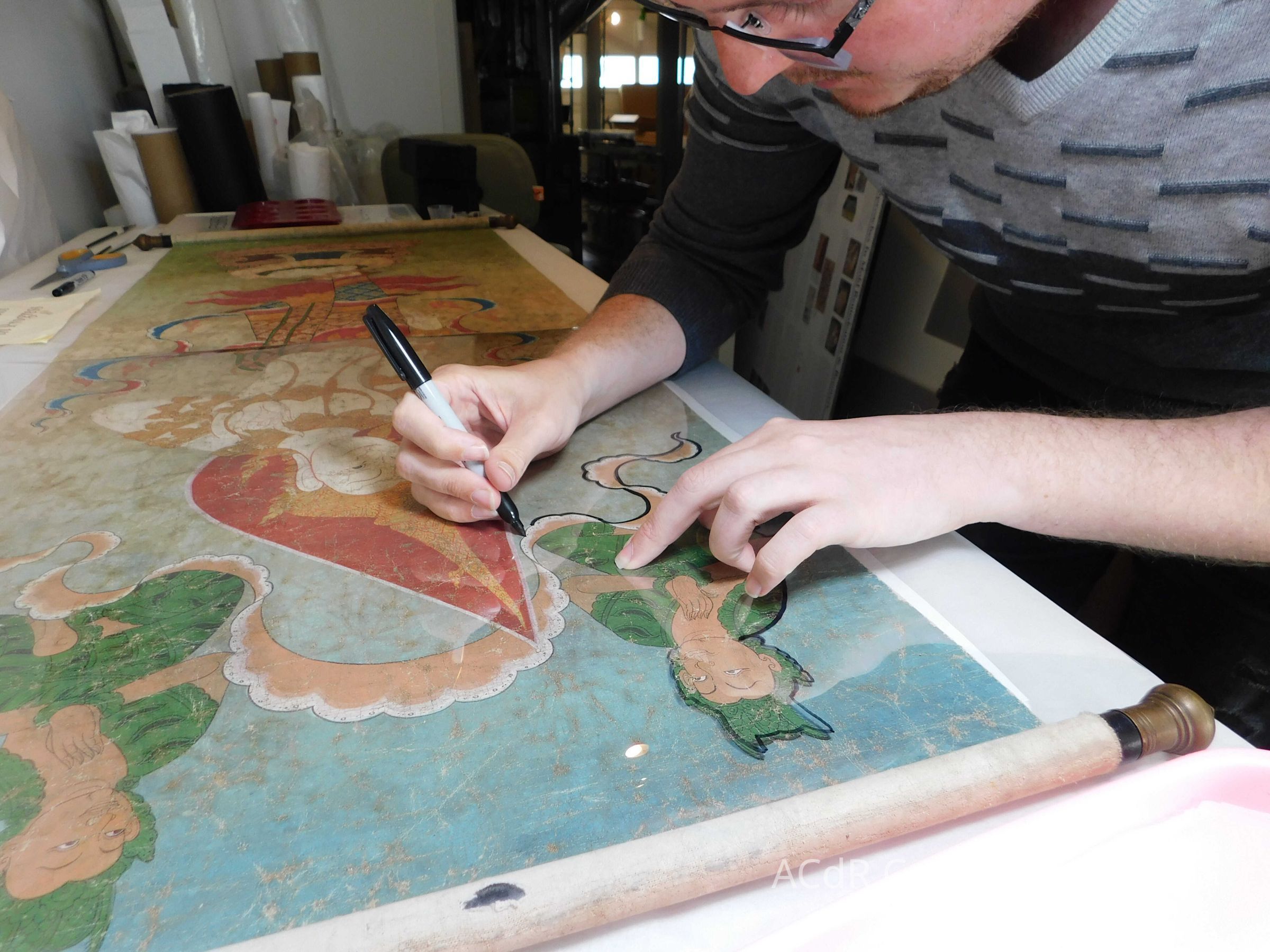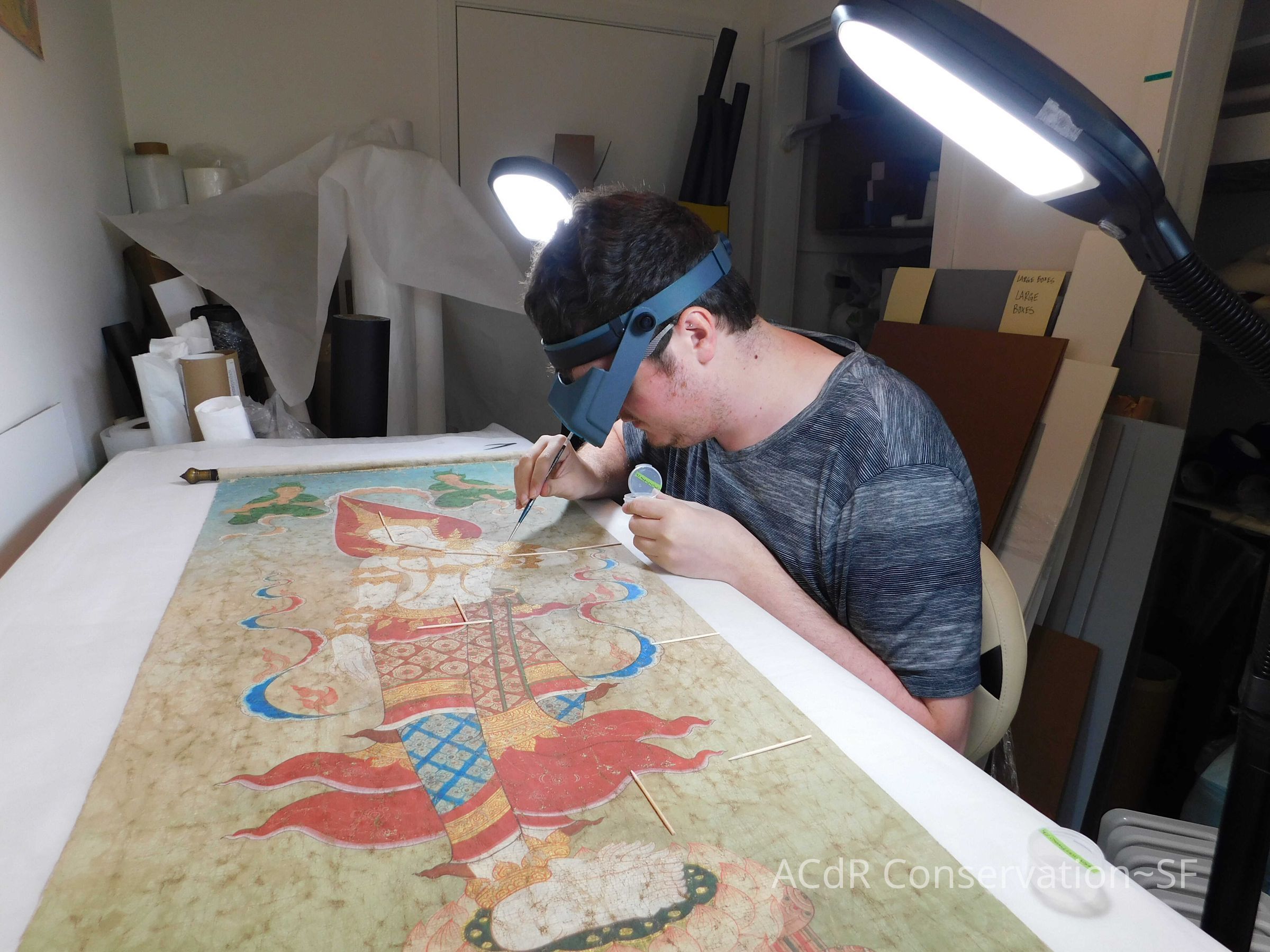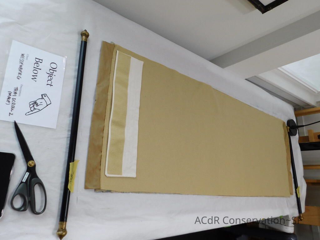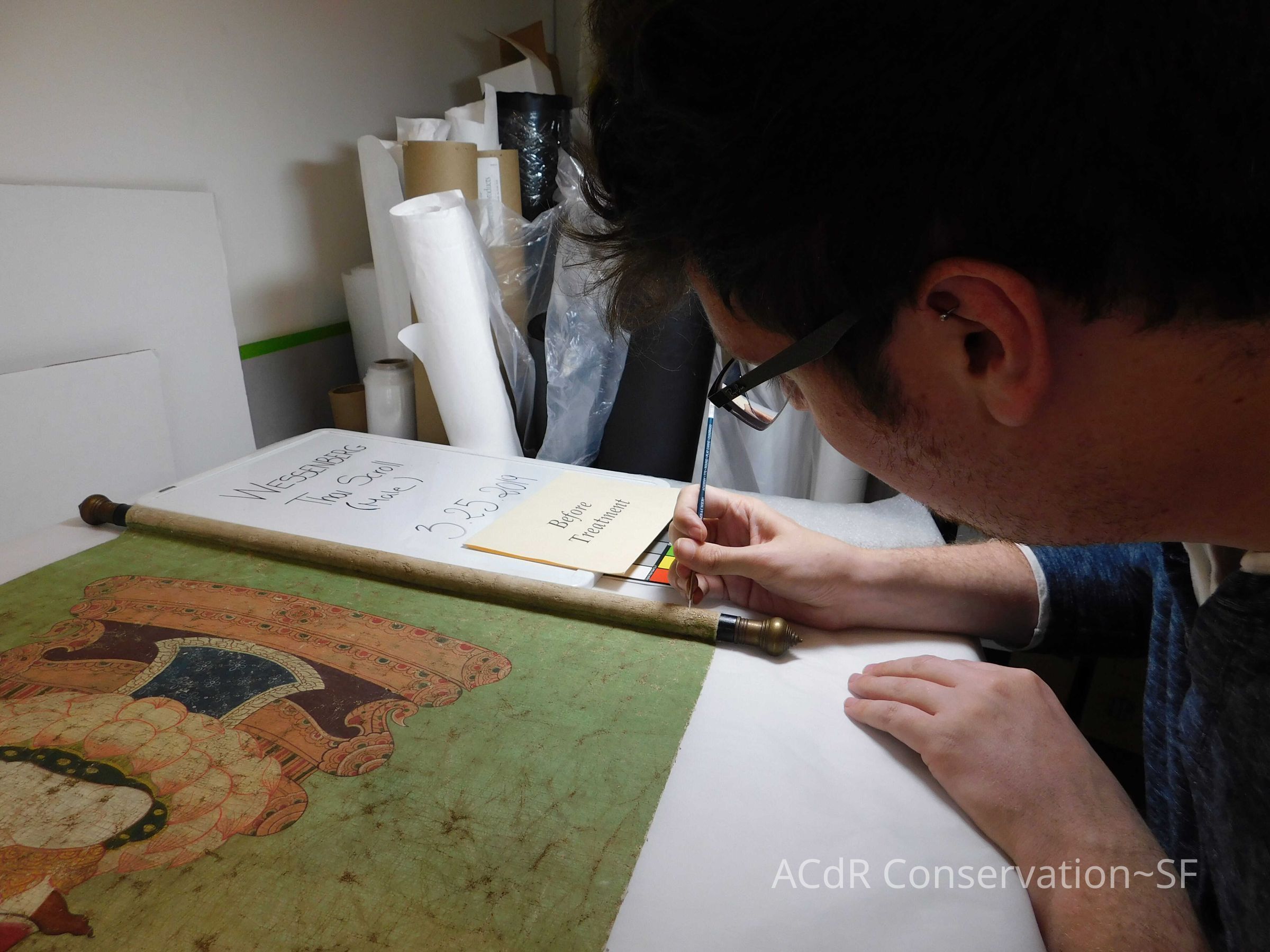 Color matched for background color with a wash of blue lake, yellow ochre, chinese white, ivory black, davy's gray. Clear gesso applied in small areas of loss. Color matched and smoothed background with wash.