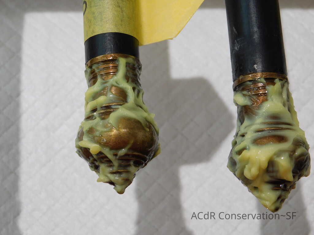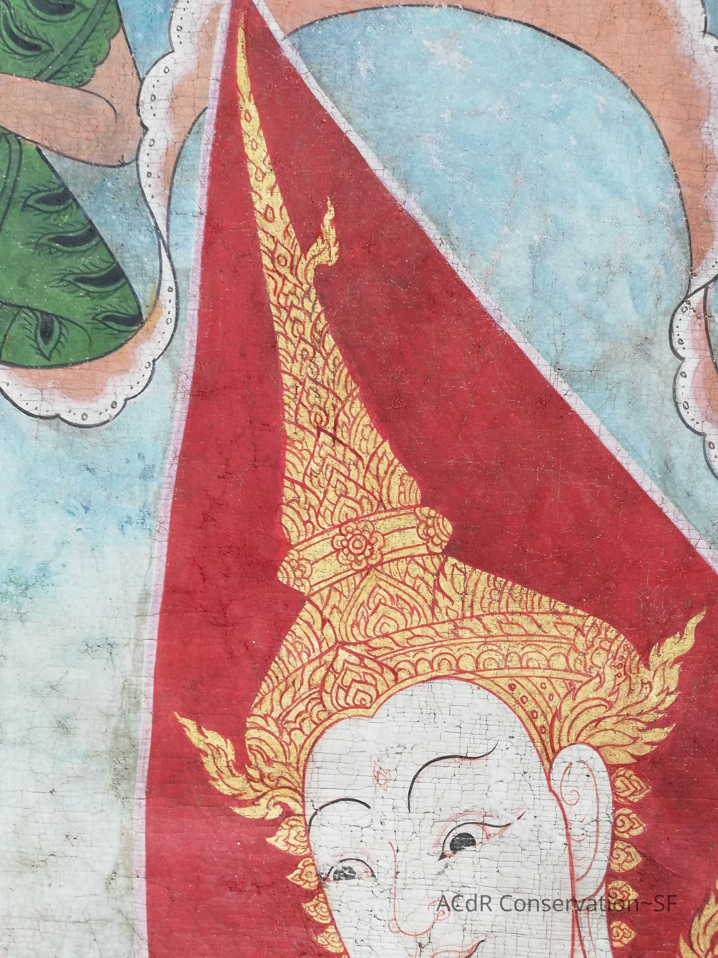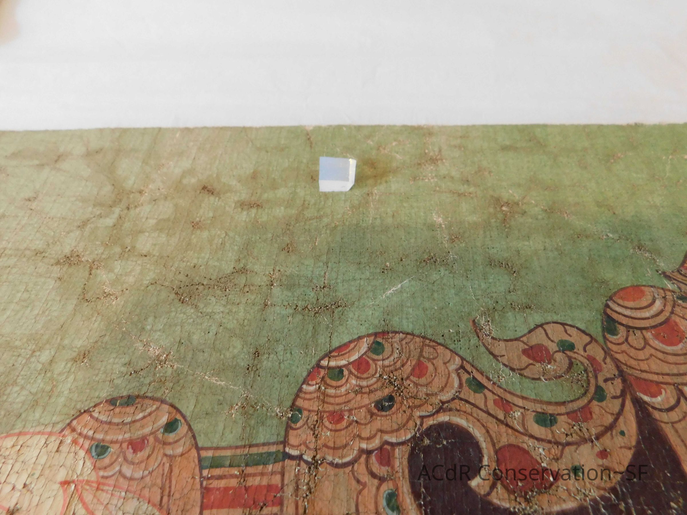Tested 4% gel with DTPA at 7.5 pH. Test showed good cleaning quality to all areas of color on the background. In areas of green coloration a small amount of paint loss occurred. A barrier layer is needed for these areas.