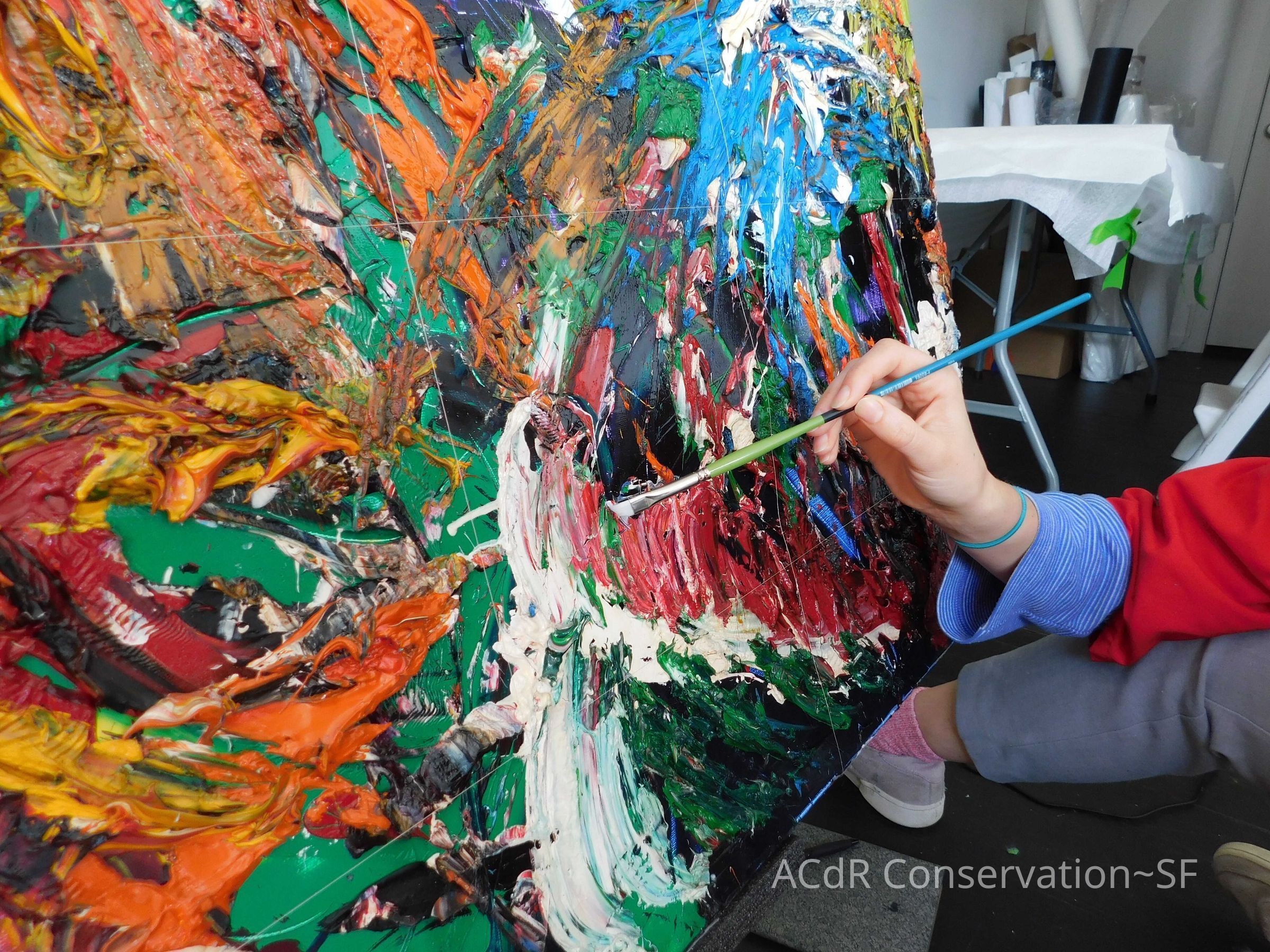 Saturated surface with D4. Cleaned with ME and then rinsed with D4 (D4 with brush/ME with brush/D4 with cotton swab). Red paint is very sensitive to ME. Red and other sensitive paints were cleaned with Velvesil Plus + 40% adjusted water (5.00 pH/6.000mS). The gel was removed with cotton swab and surface rinsed with D4. Cleaned lint and dust using cotton swabs and sponge swabs. Flipped the painting on its side and removed paper from two edges. Saturated paper with D4 and with cotton swabs with pH 5.0/6.000mS adjusted water to pull paper off. Continued cleaning painting as above. Cleaning edges with Velvesil Plus and 5.0 pH solution.