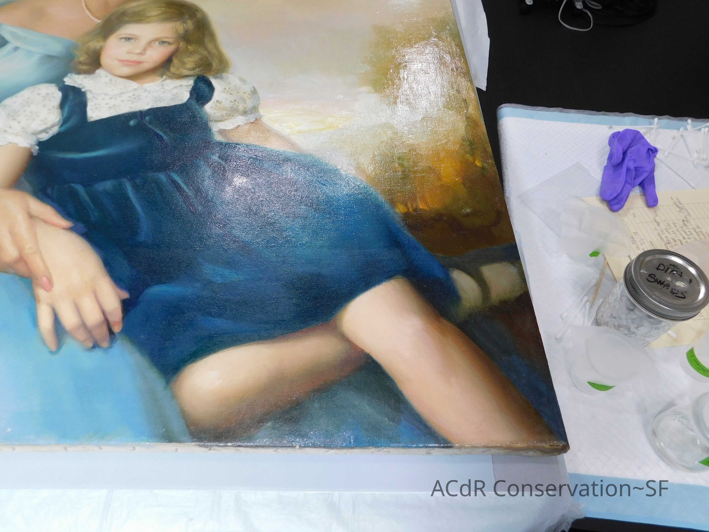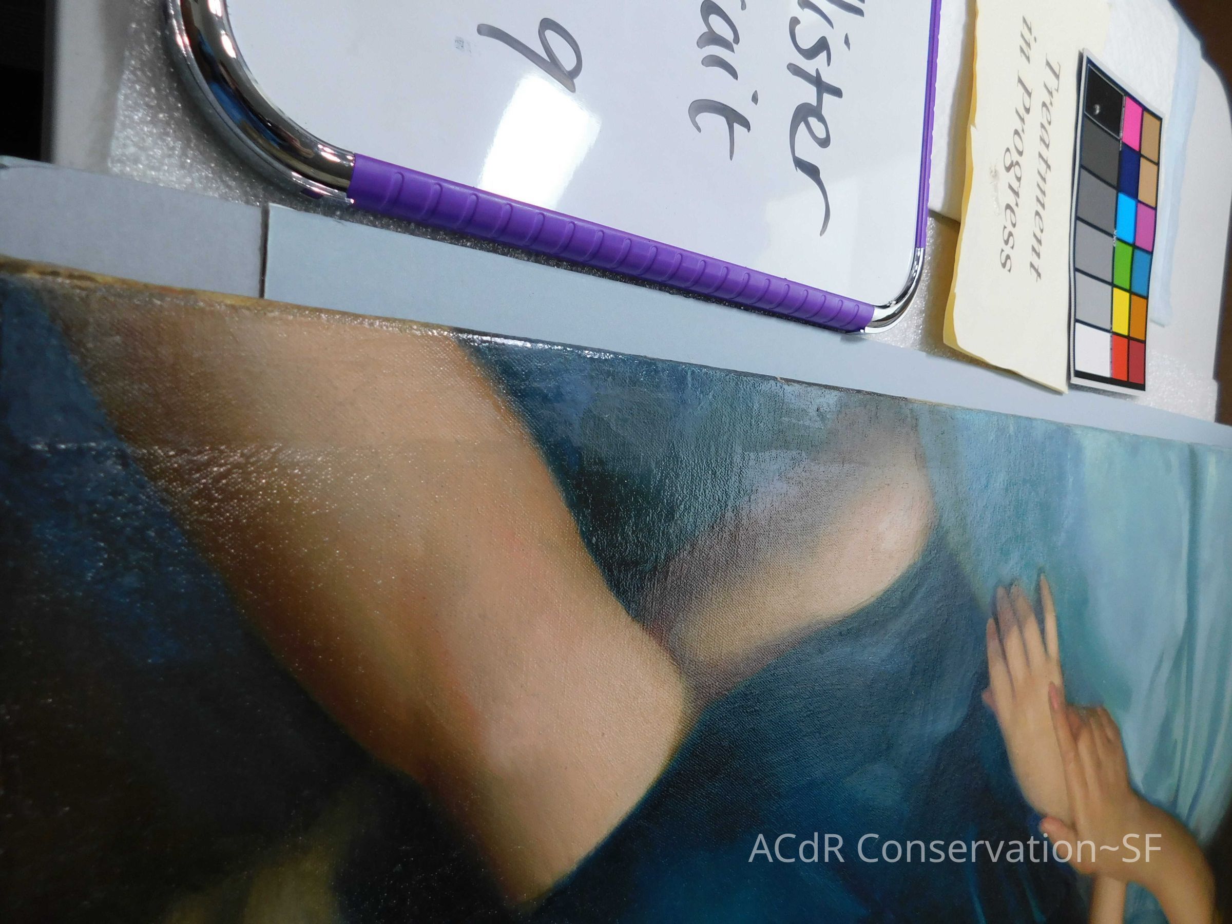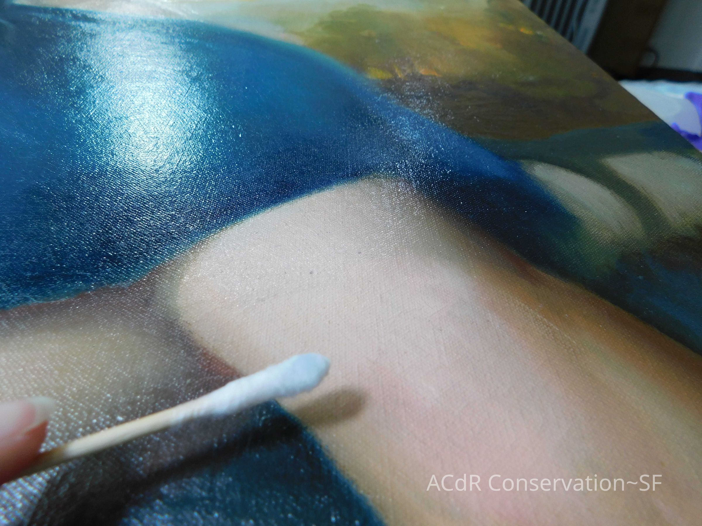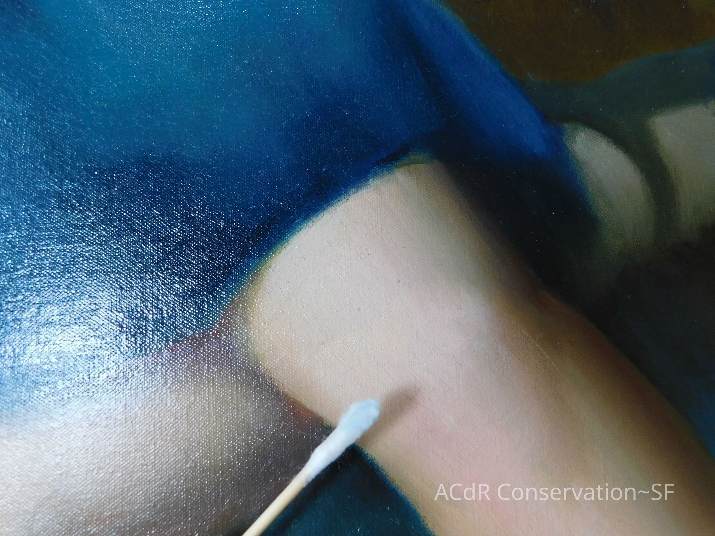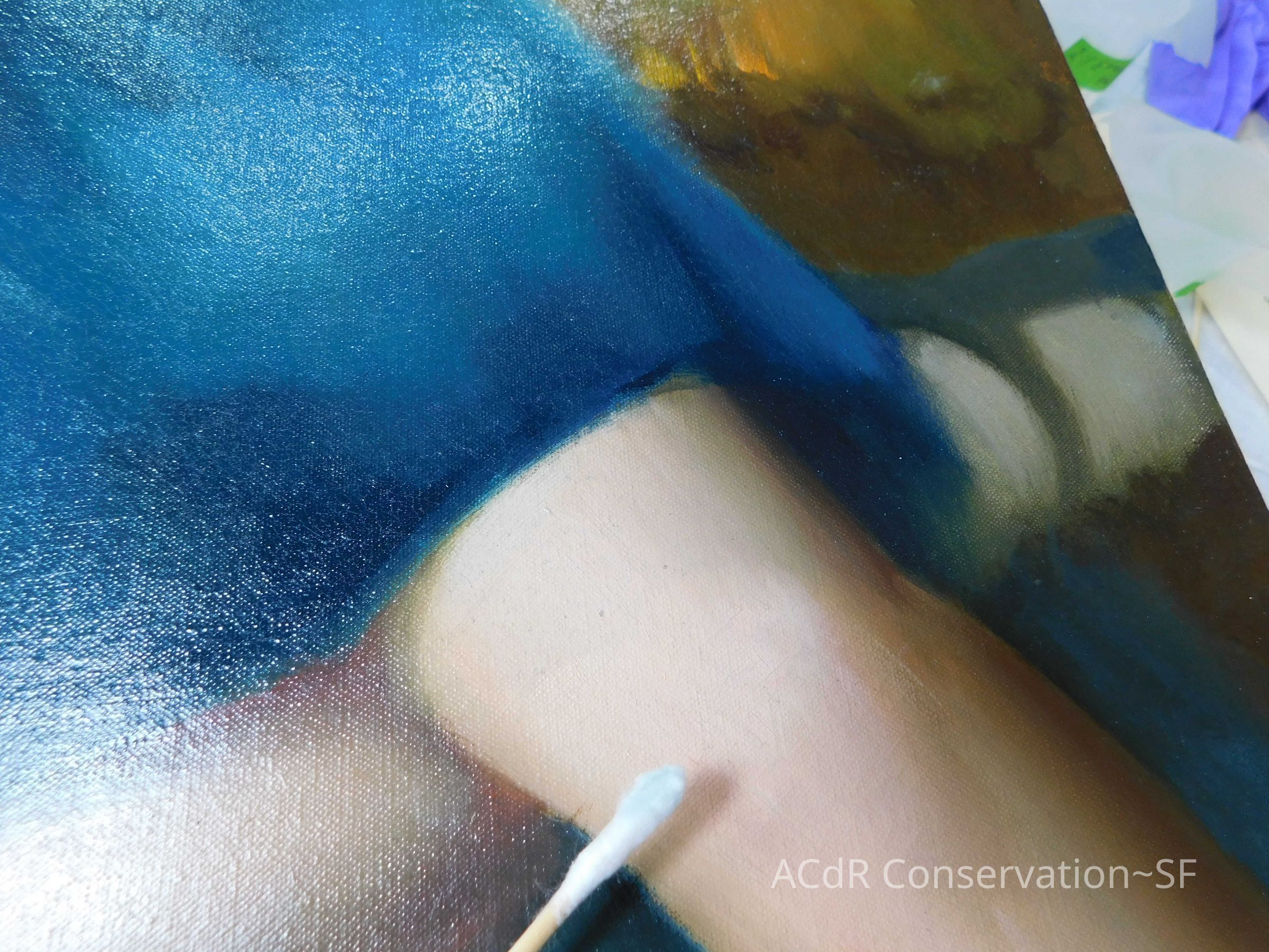 Testing and beginning varnish removal, starting at bottom right corner and moving along bottom edge. Using Naptha, 1/5th of glossy varnish removed. Blue color coming away on swabs confirmed to be due to varnish rather than pigment lifting (did not come up blue on child’s legs). Blue areas still sensitive and susceptible, so being quick in application. Finished varnish removal; reconsolidated cracks in mother’s left arm/child’s right cheek.
