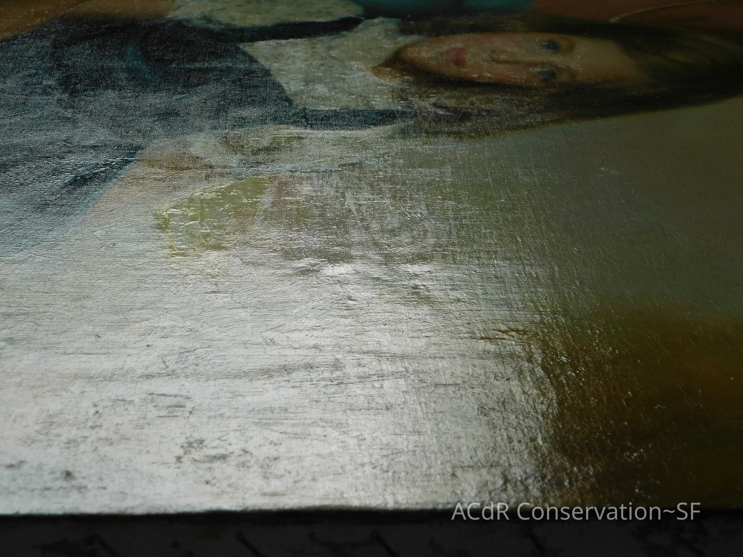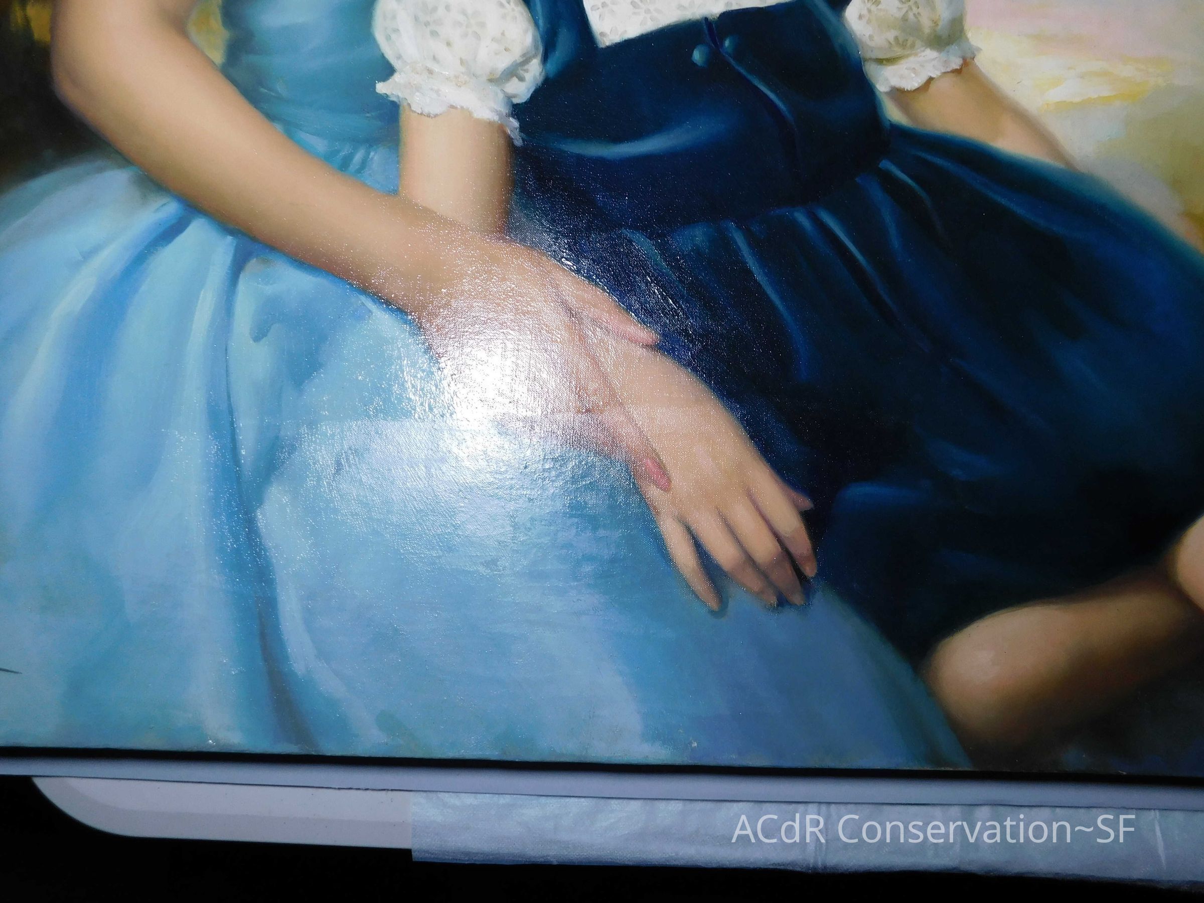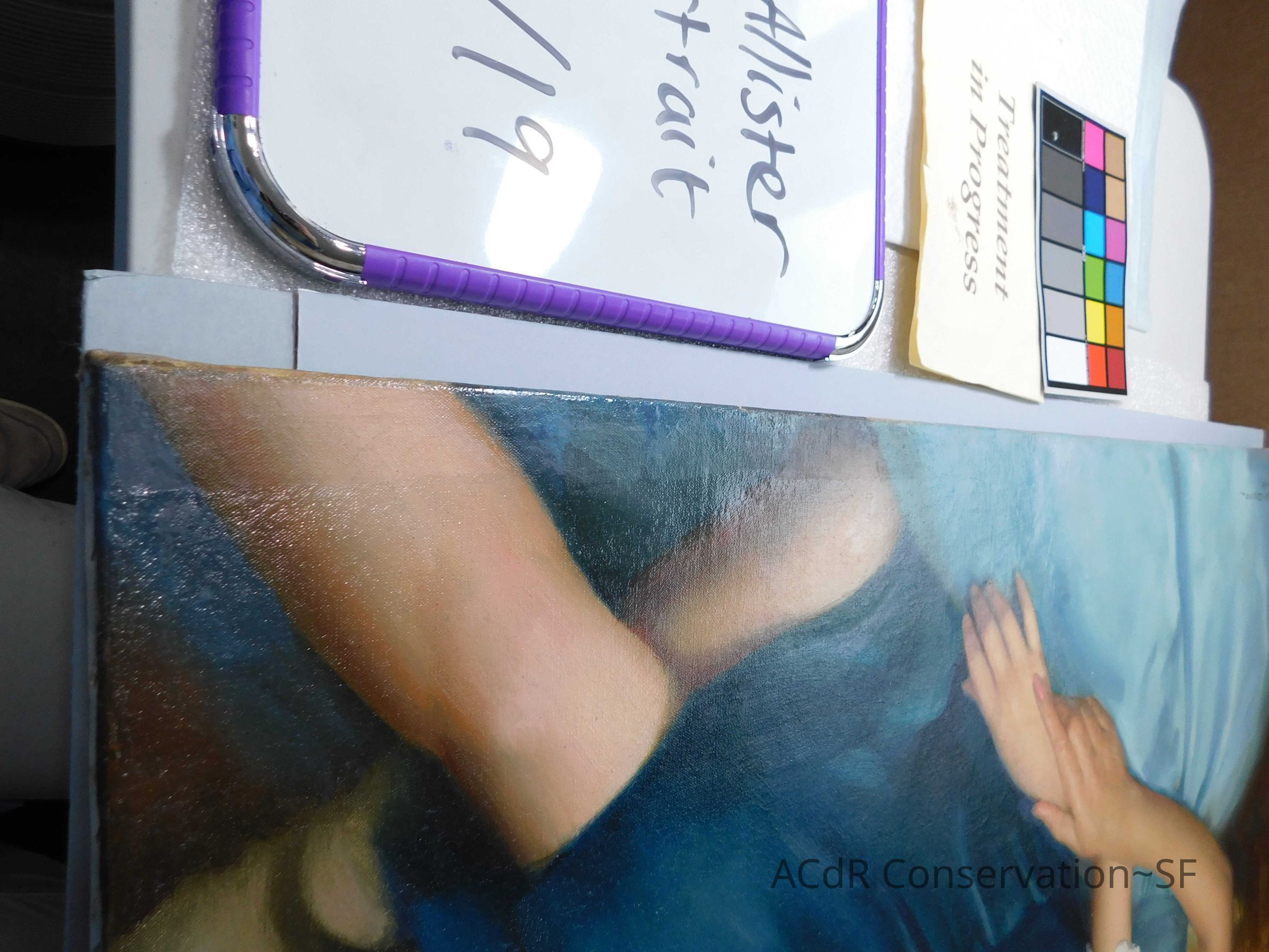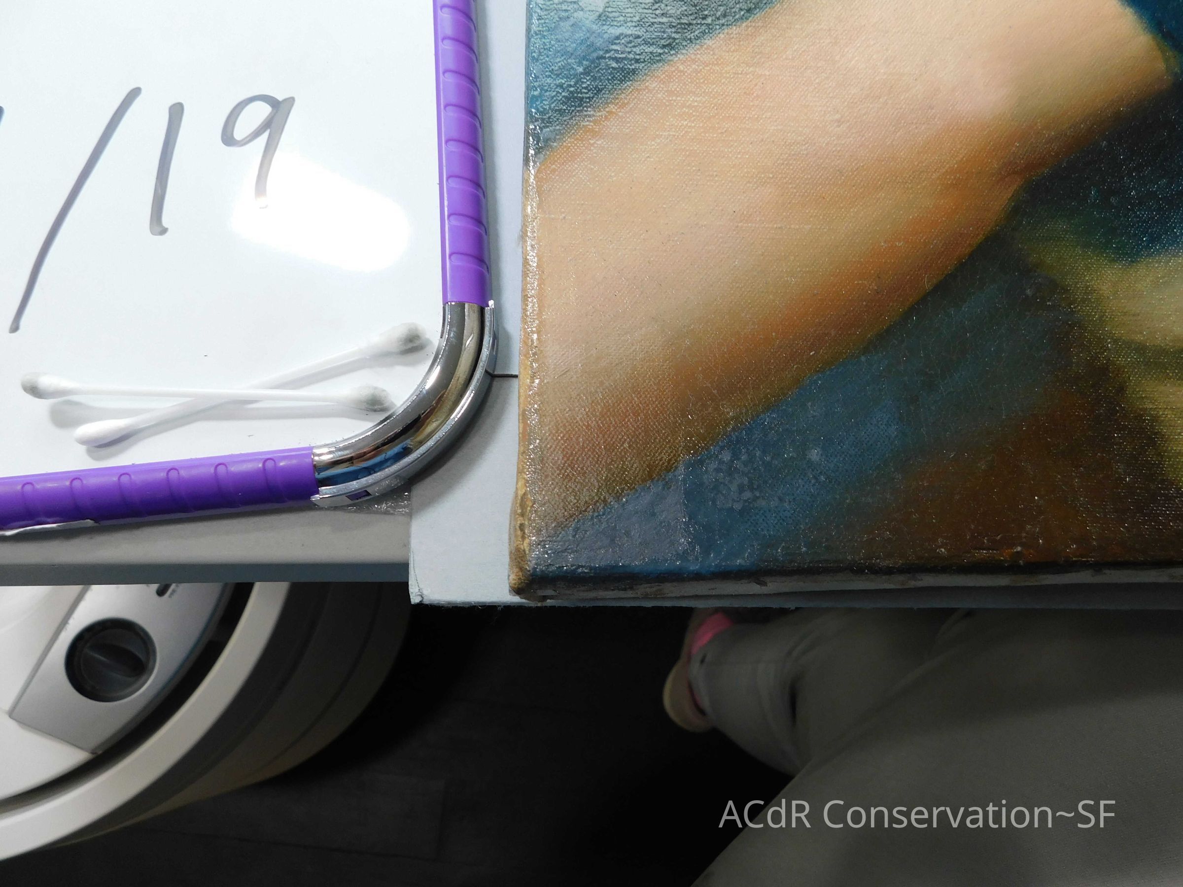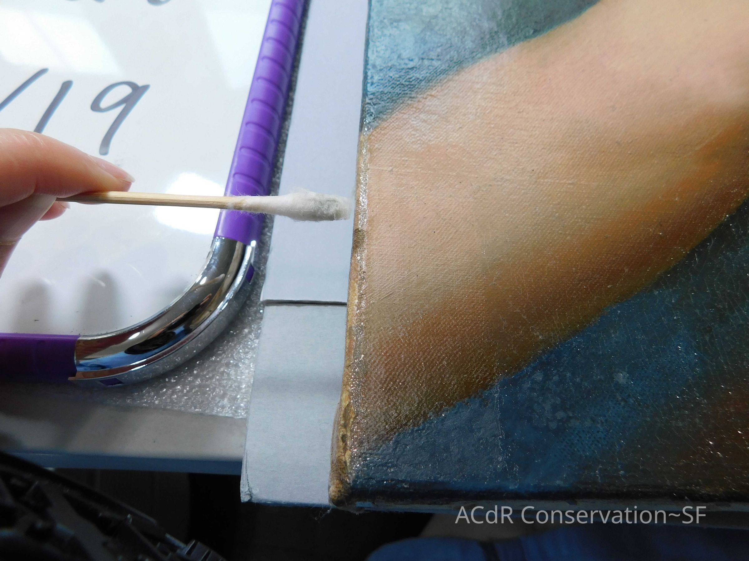 Testing and beginning varnish removal, starting at bottom right corner and moving along bottom edge. Using Naptha, 1/5th of glossy varnish removed. Blue color coming away on swabs confirmed to be due to varnish rather than pigment lifting (did not come up blue on child’s legs). Blue areas still sensitive and susceptible, so being quick in application. Finished varnish removal; reconsolidated cracks in mother’s left arm/child’s right cheek.