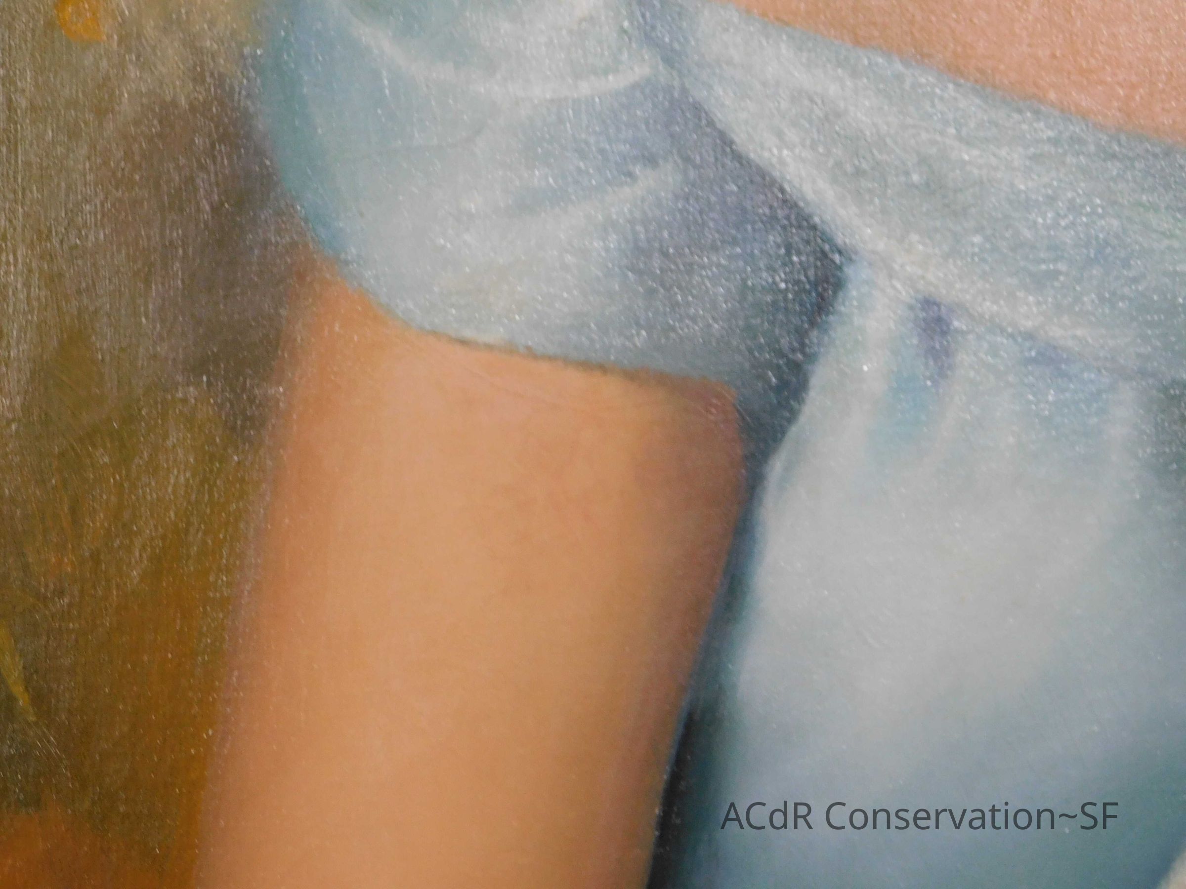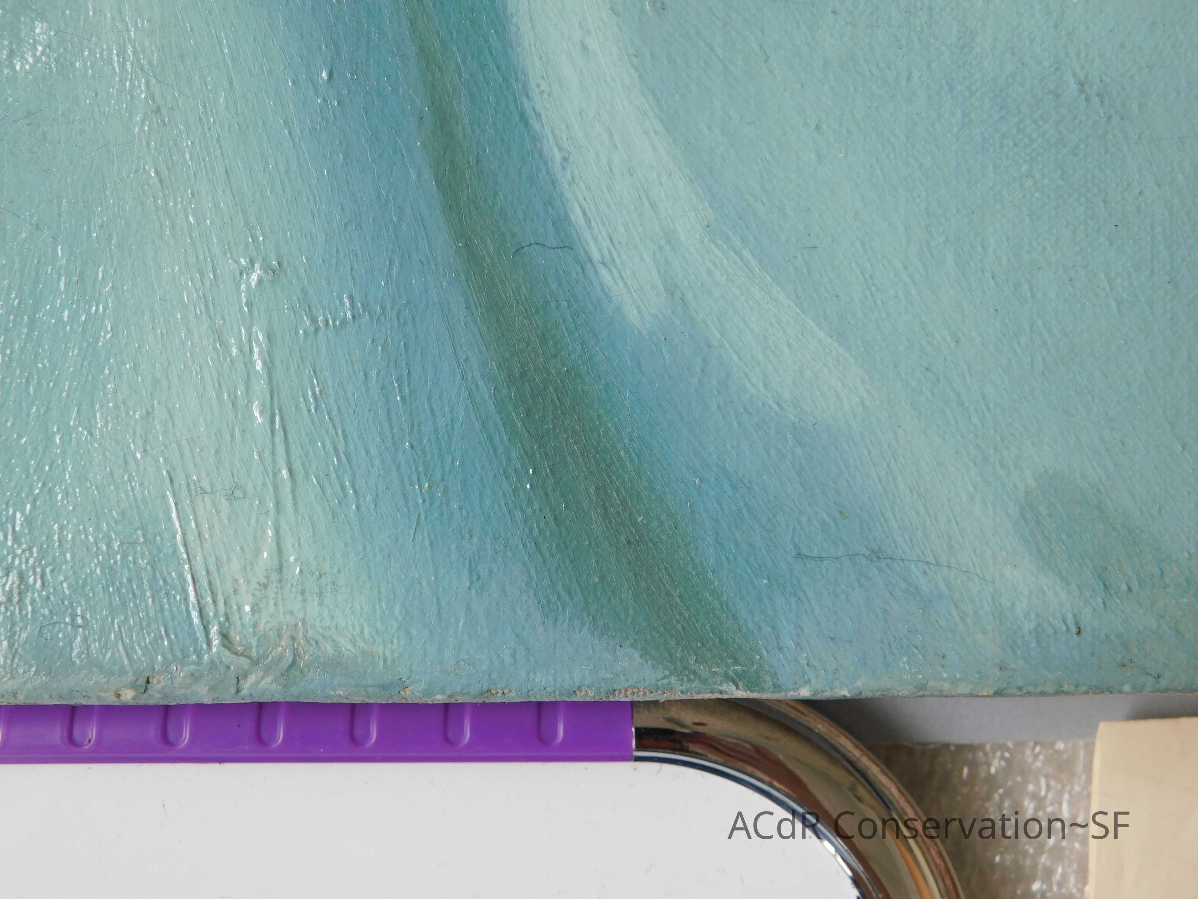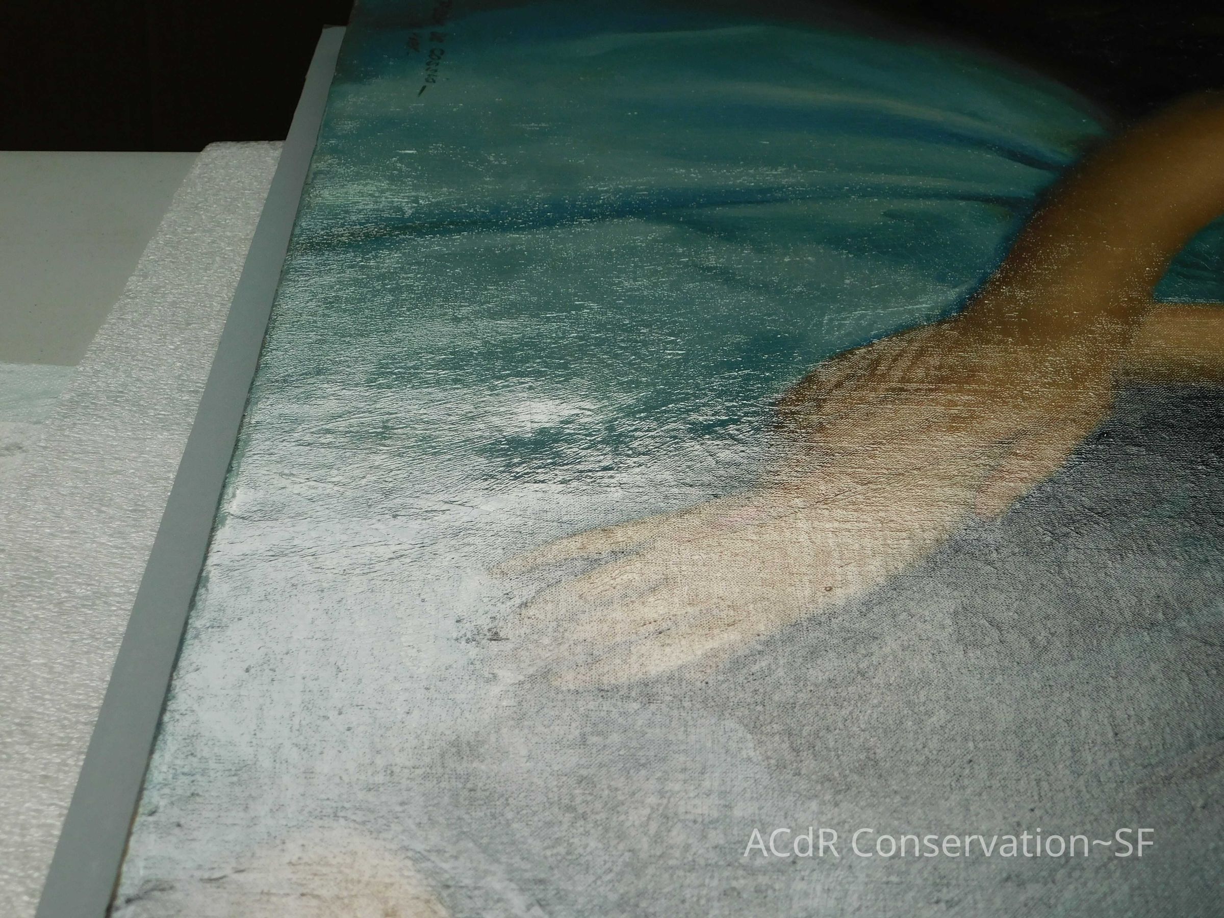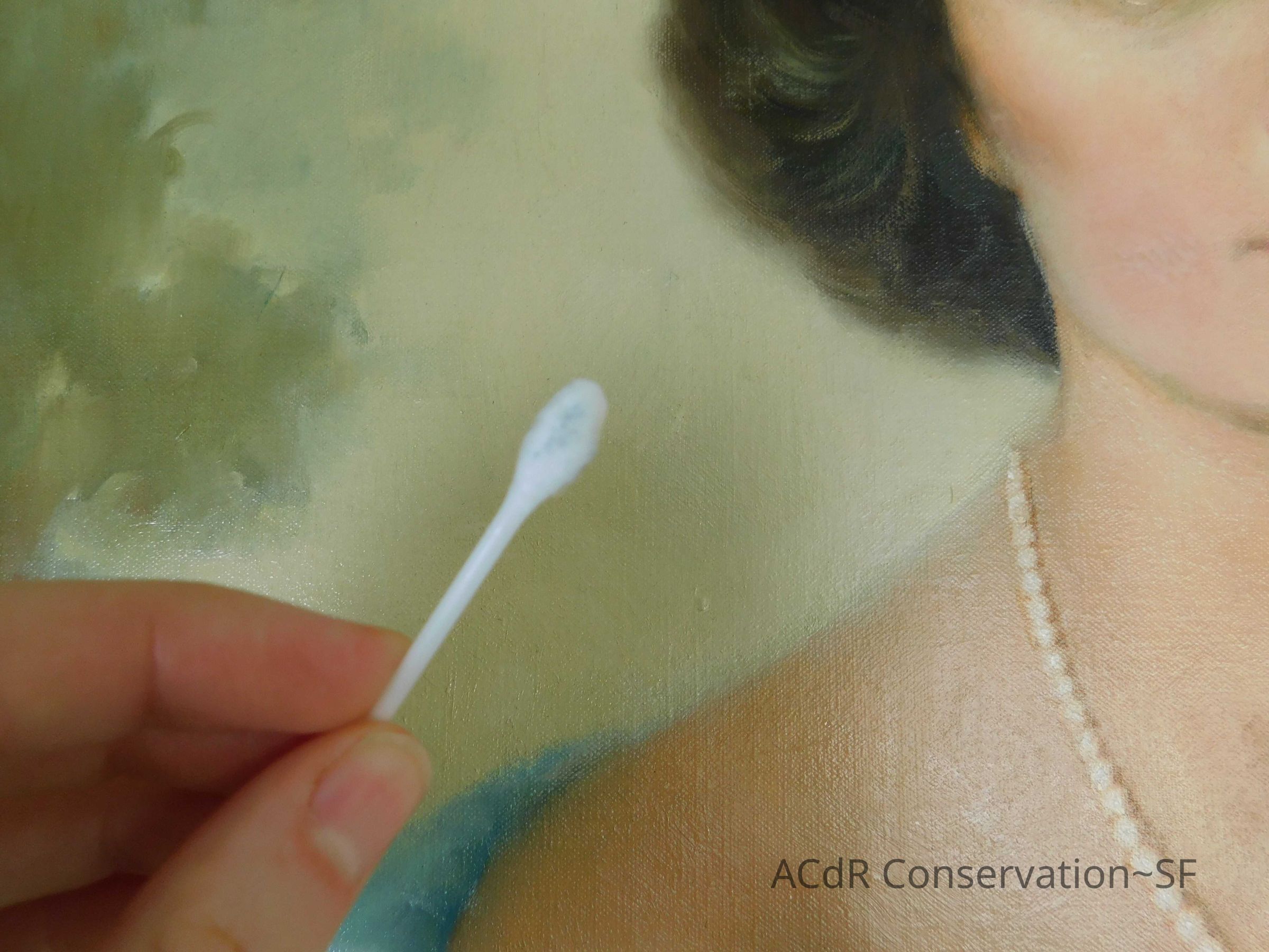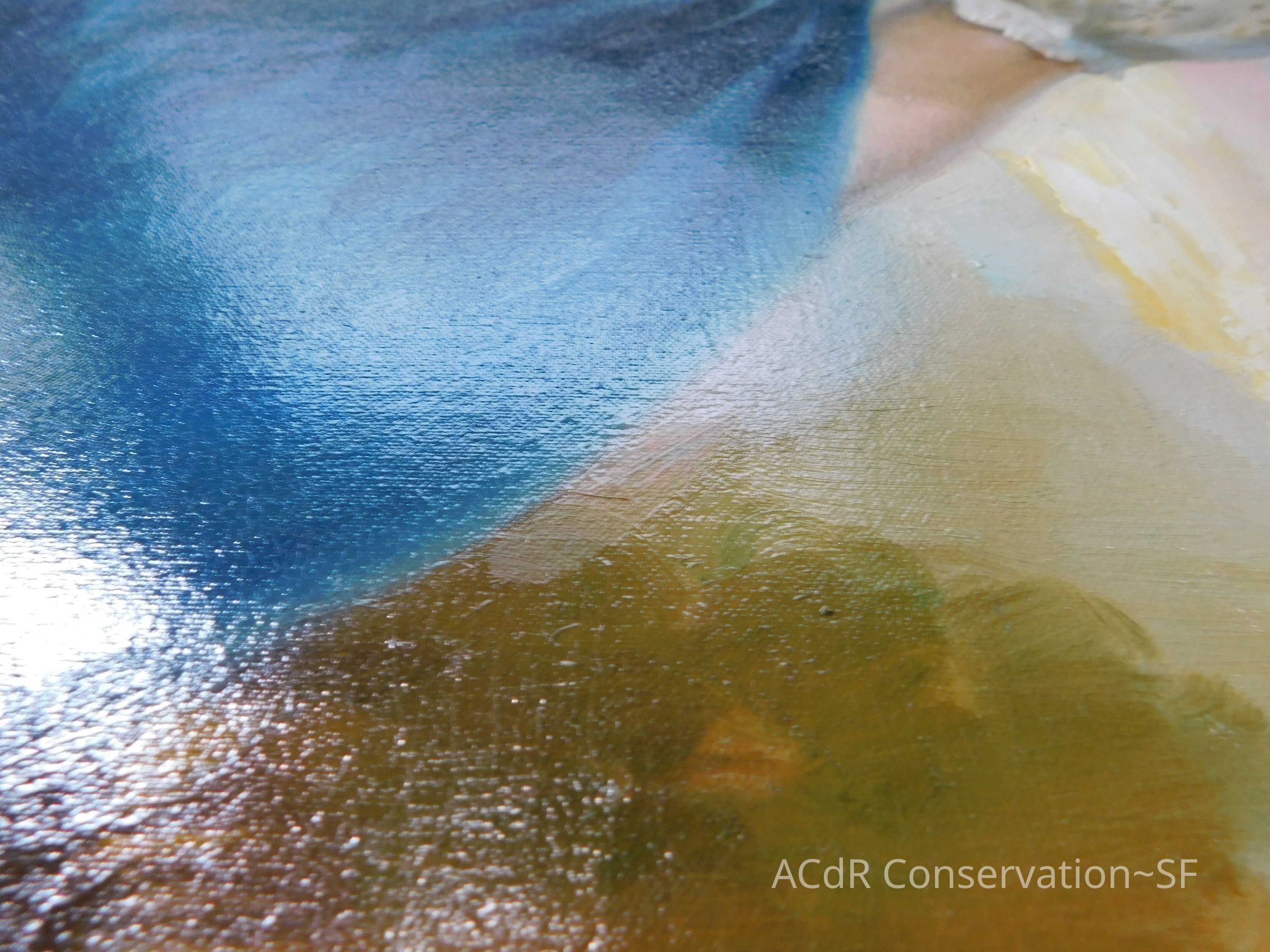 Testing and beginning varnish removal, starting at bottom right corner and moving along bottom edge. Using Naptha, 1/5th of glossy varnish removed. Blue color coming away on swabs confirmed to be due to varnish rather than pigment lifting (did not come up blue on child’s legs). Blue areas still sensitive and susceptible, so being quick in application. Finished varnish removal; reconsolidated cracks in mother’s left arm/child’s right cheek.