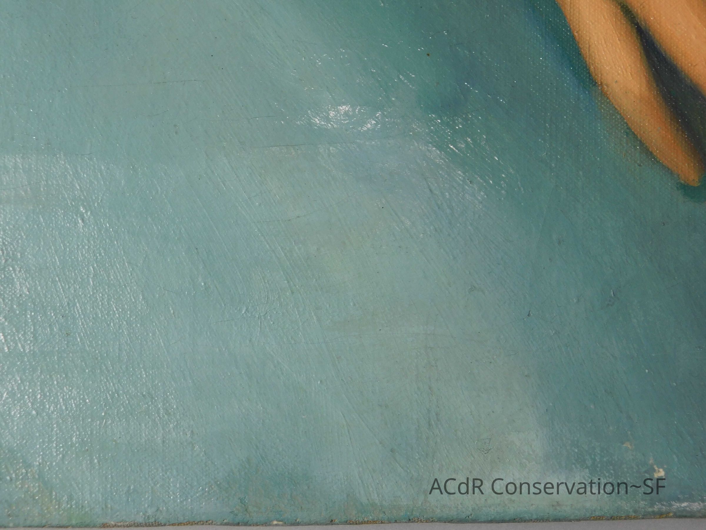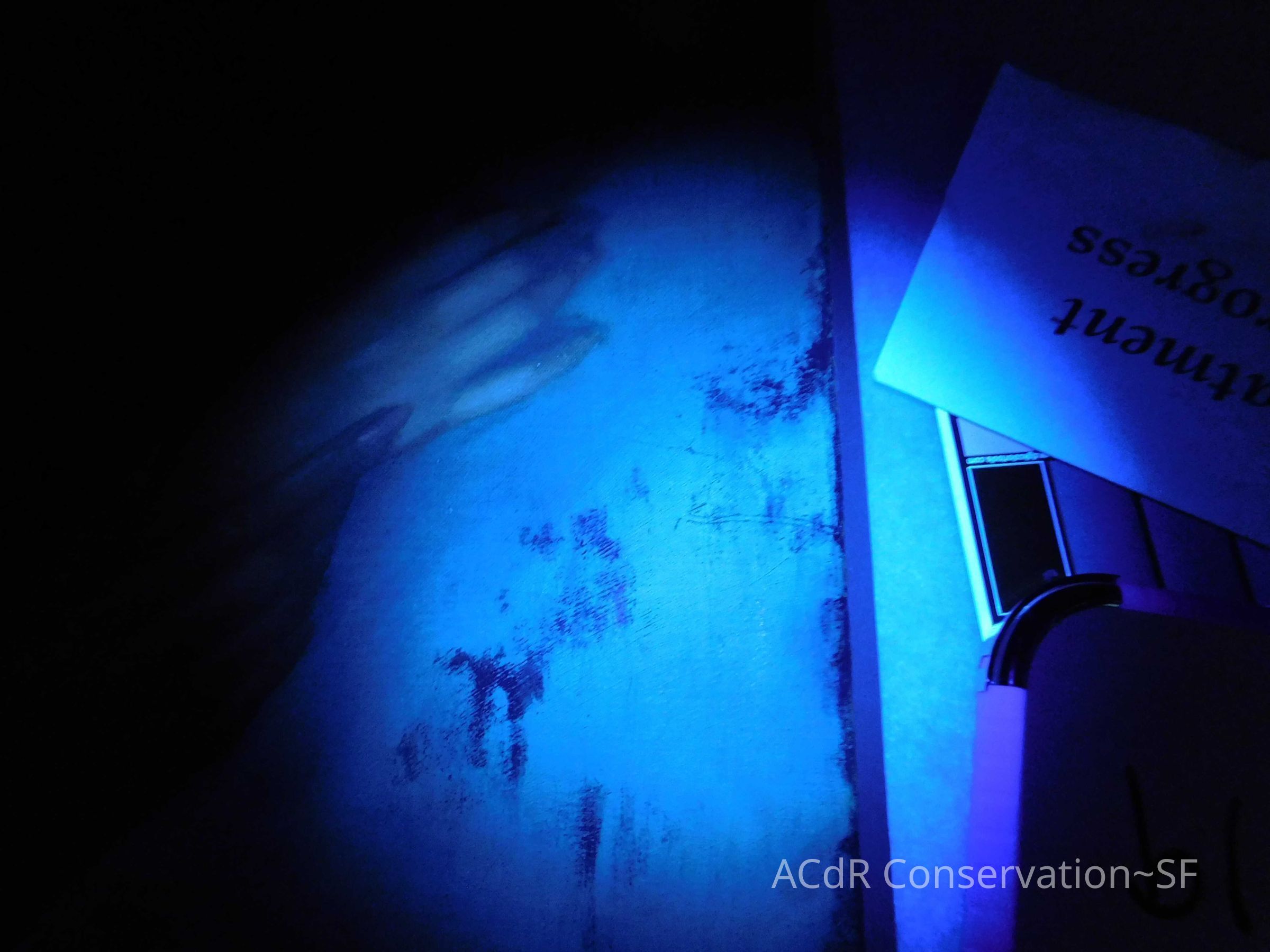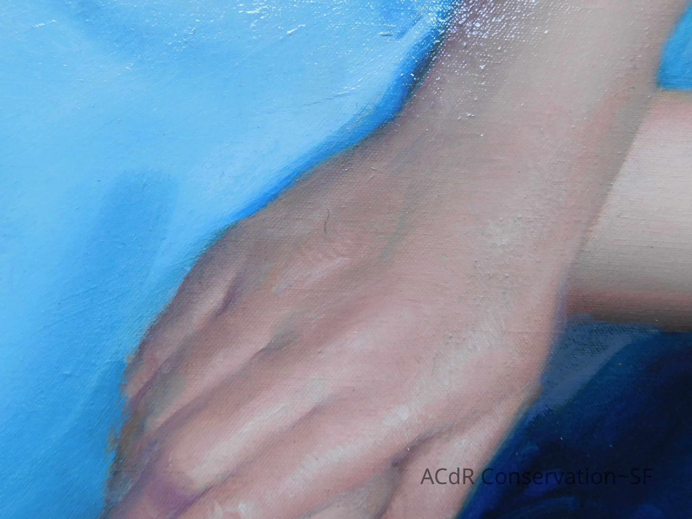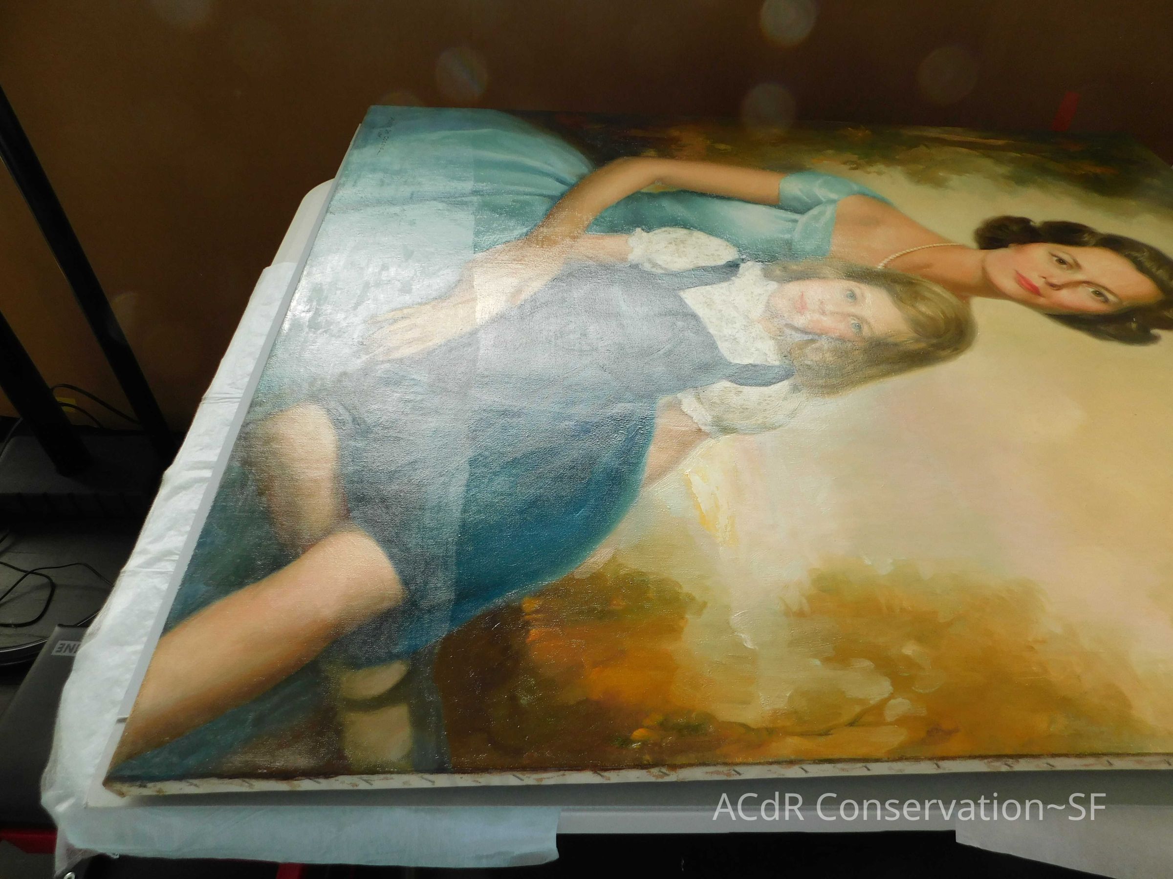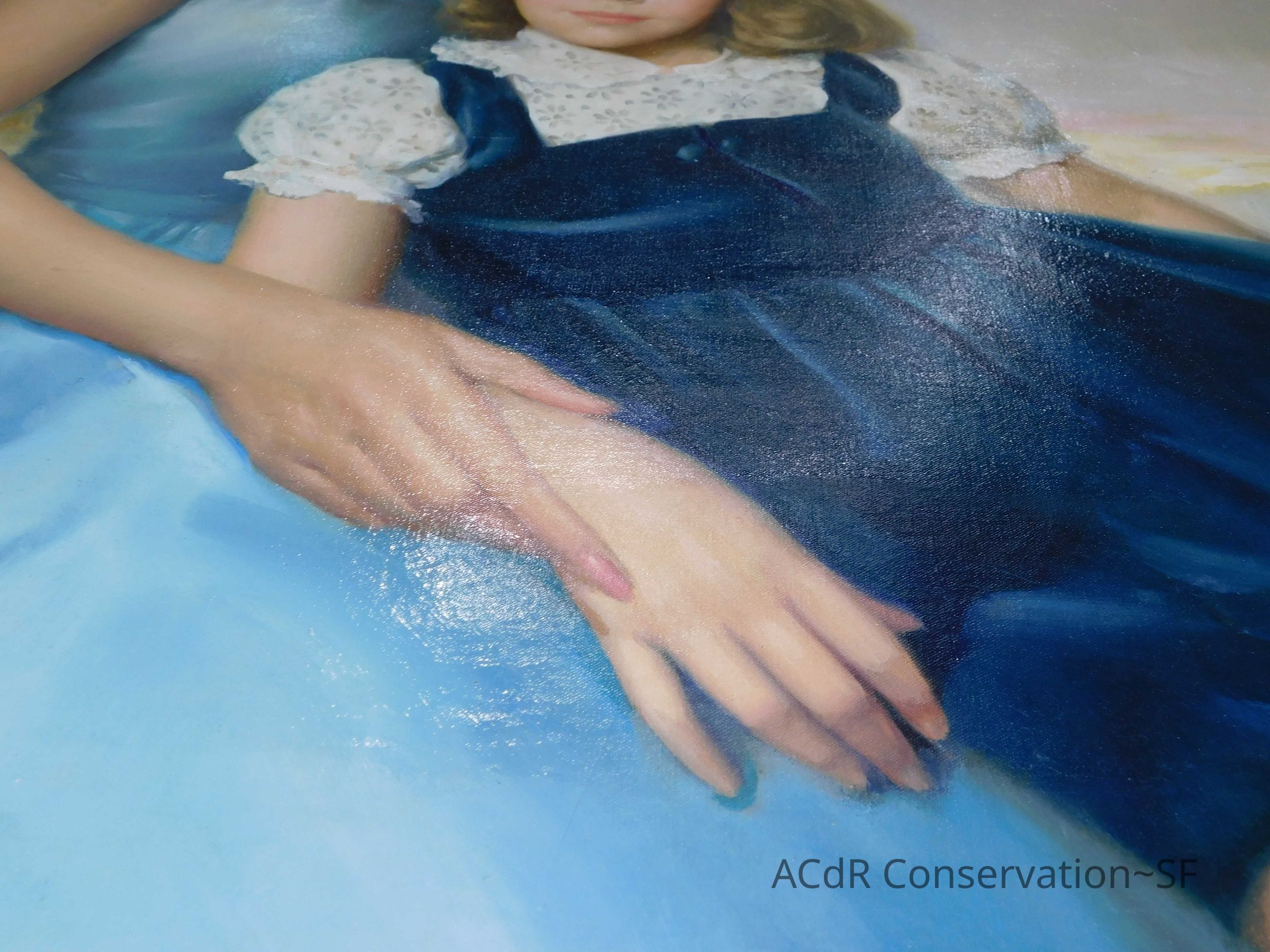 Testing and beginning varnish removal, starting at bottom right corner and moving along bottom edge. Using Naptha, 1/5th of glossy varnish removed. Blue color coming away on swabs confirmed to be due to varnish rather than pigment lifting (did not come up blue on child’s legs). Blue areas still sensitive and susceptible, so being quick in application. Finished varnish removal; reconsolidated cracks in mother’s left arm/child’s right cheek.