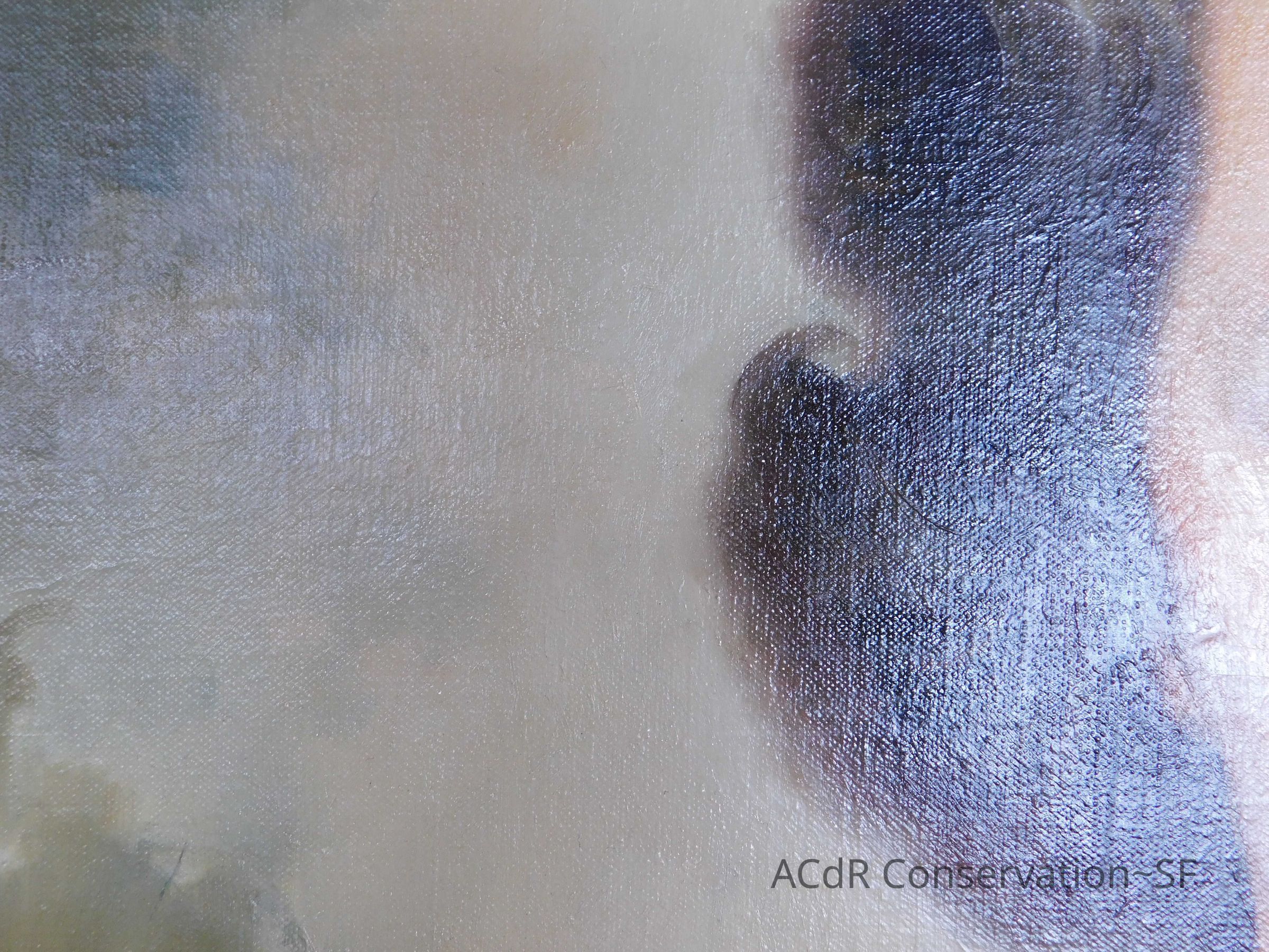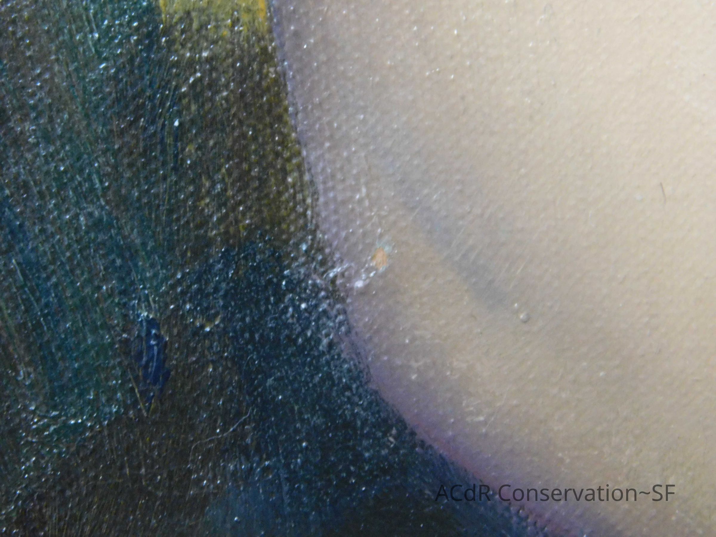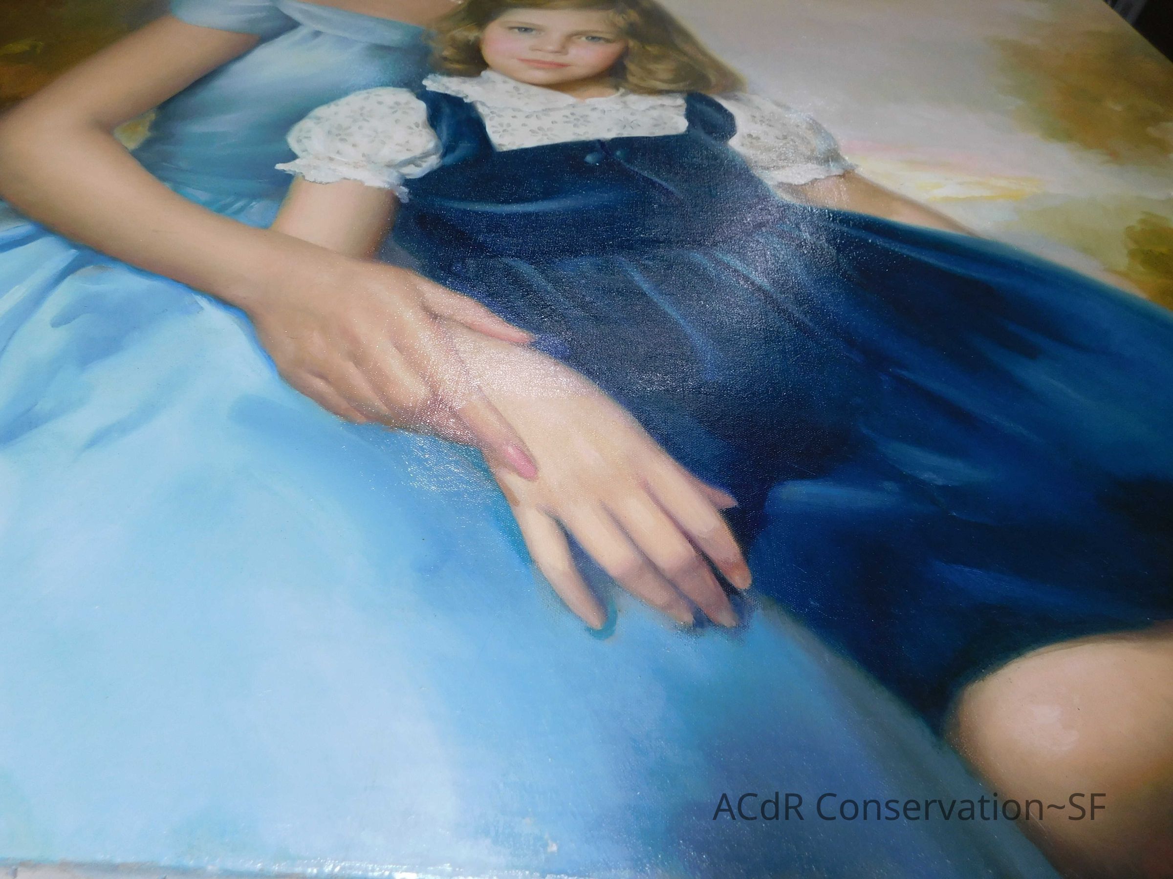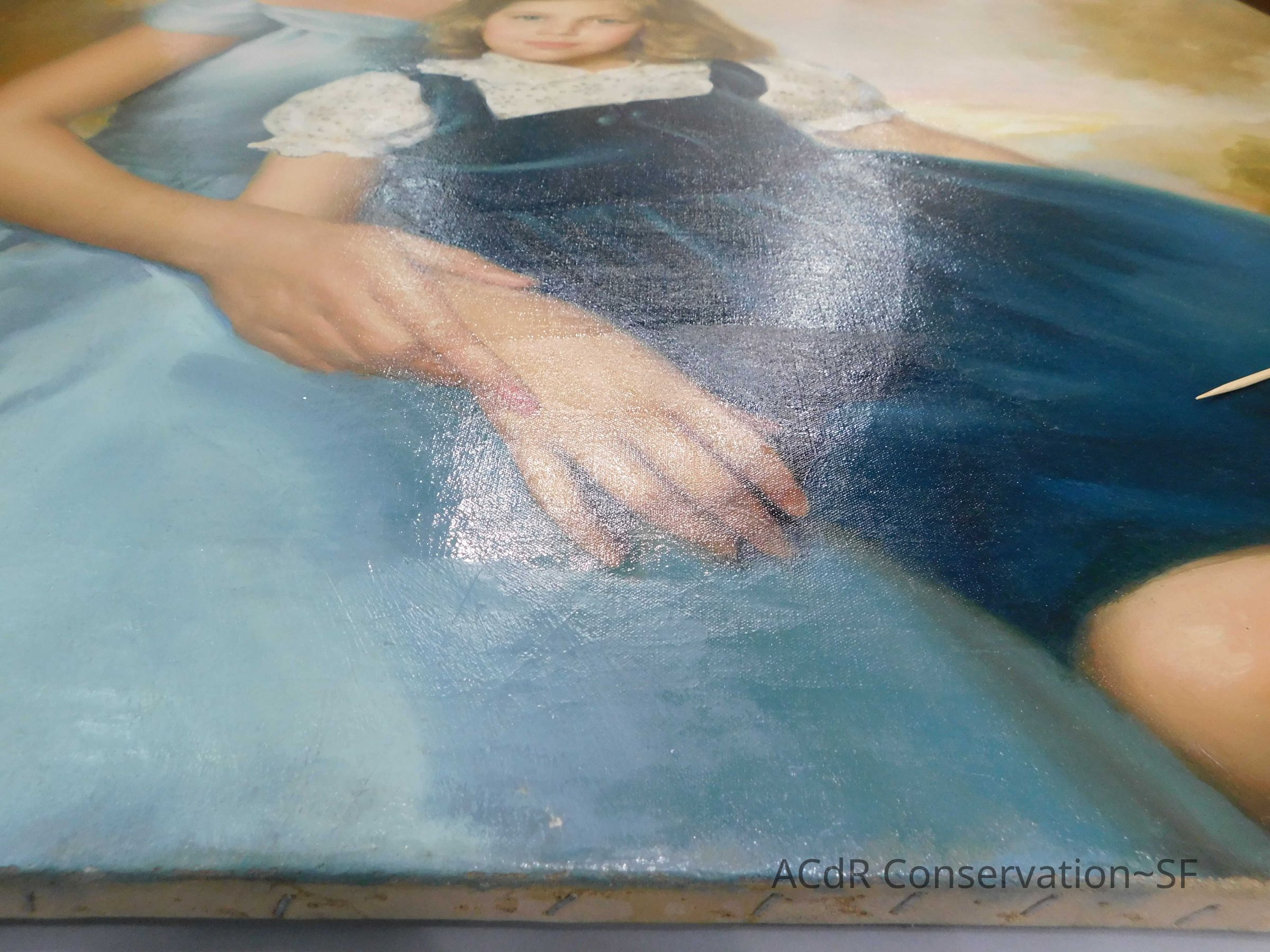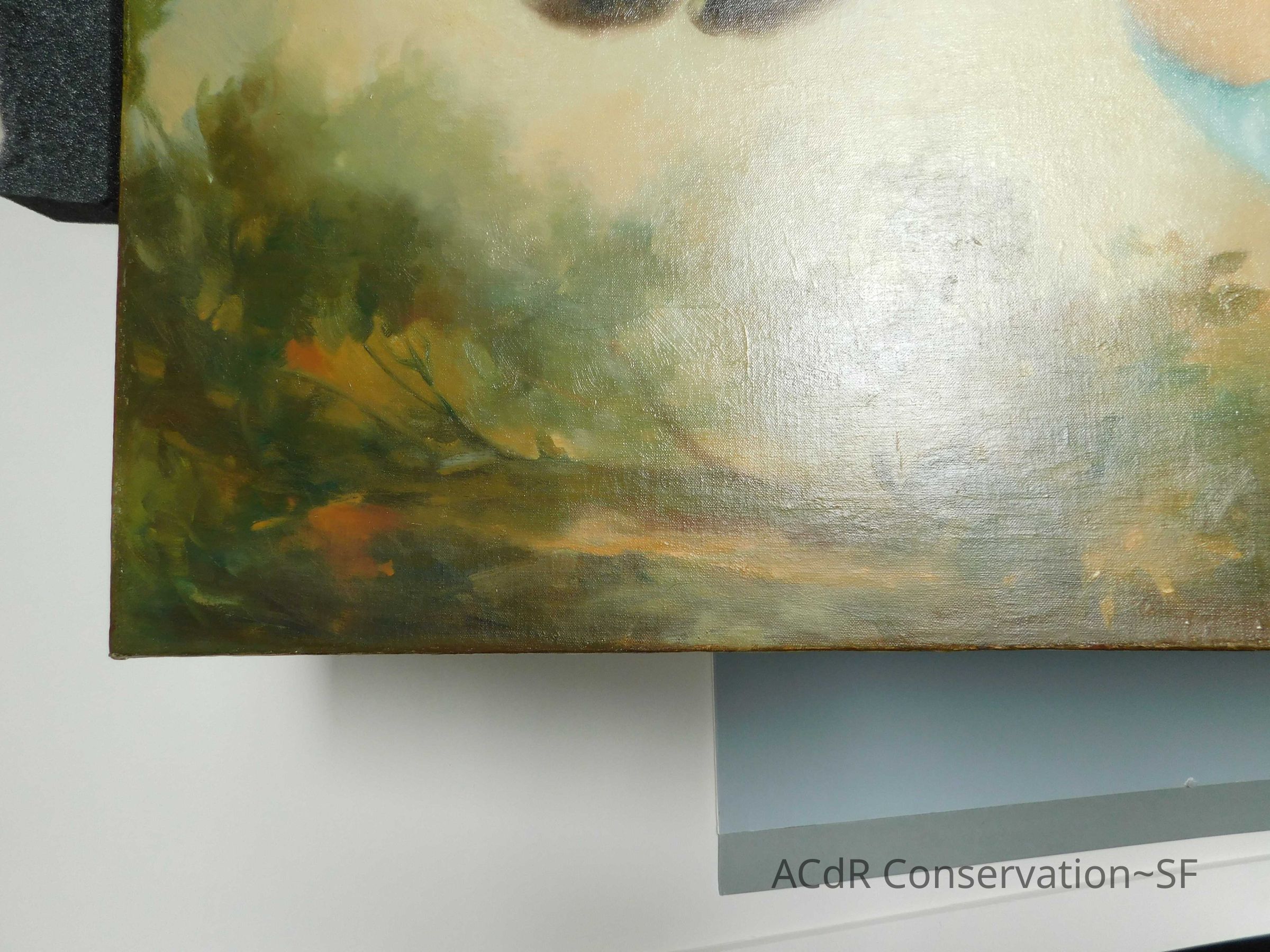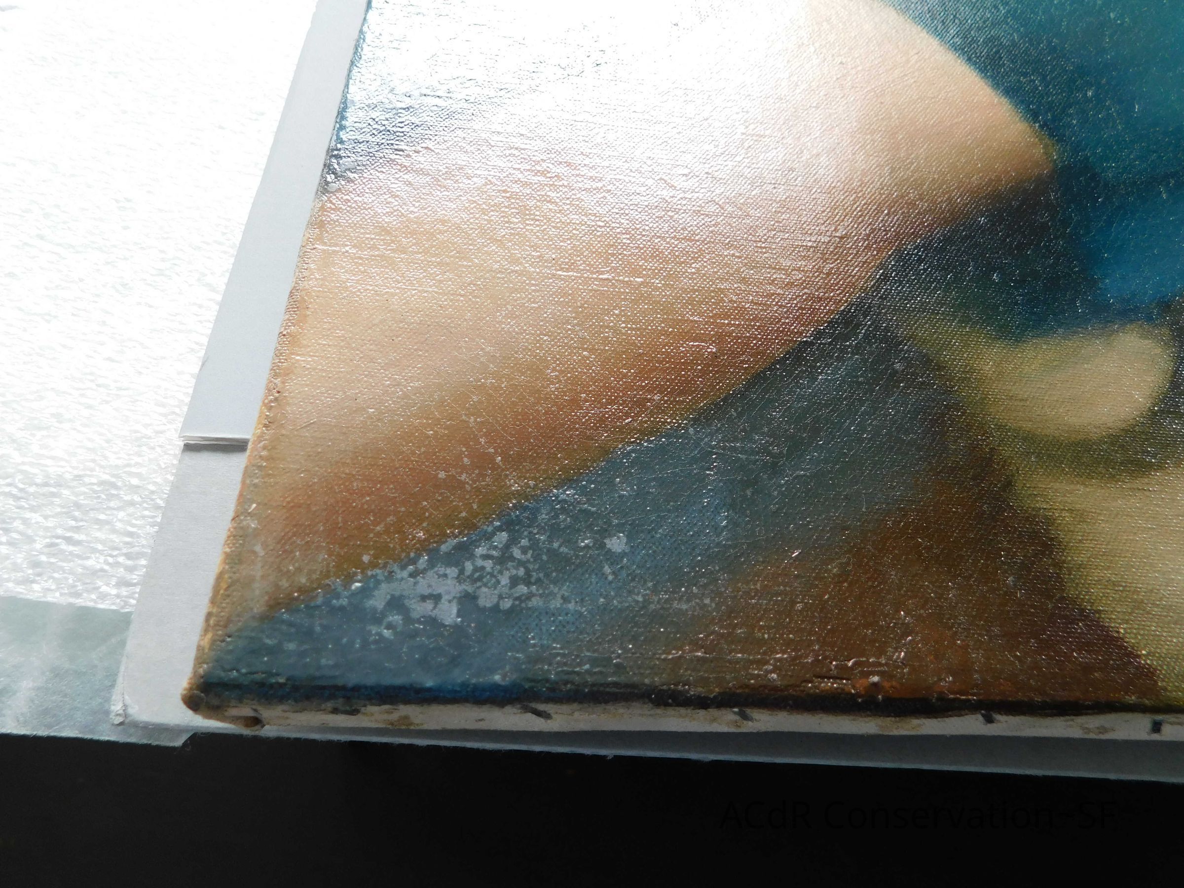 Testing and beginning varnish removal, starting at bottom right corner and moving along bottom edge. Using Naptha, 1/5th of glossy varnish removed. Blue color coming away on swabs confirmed to be due to varnish rather than pigment lifting (did not come up blue on child’s legs). Blue areas still sensitive and susceptible, so being quick in application. Finished varnish removal; reconsolidated cracks in mother’s left arm/child’s right cheek.