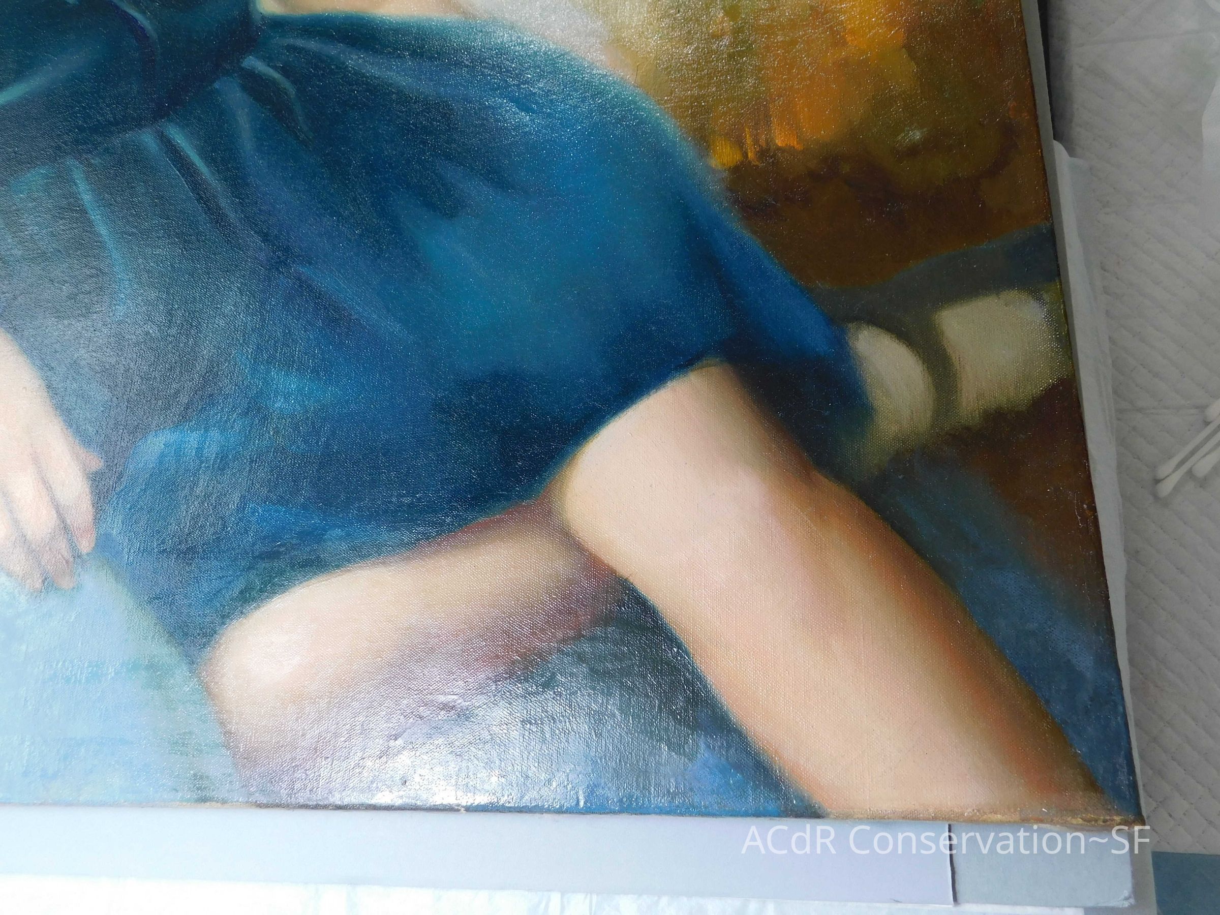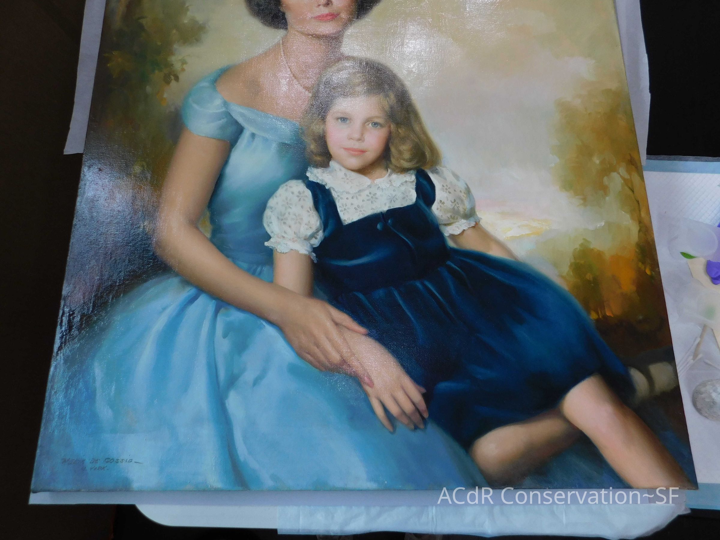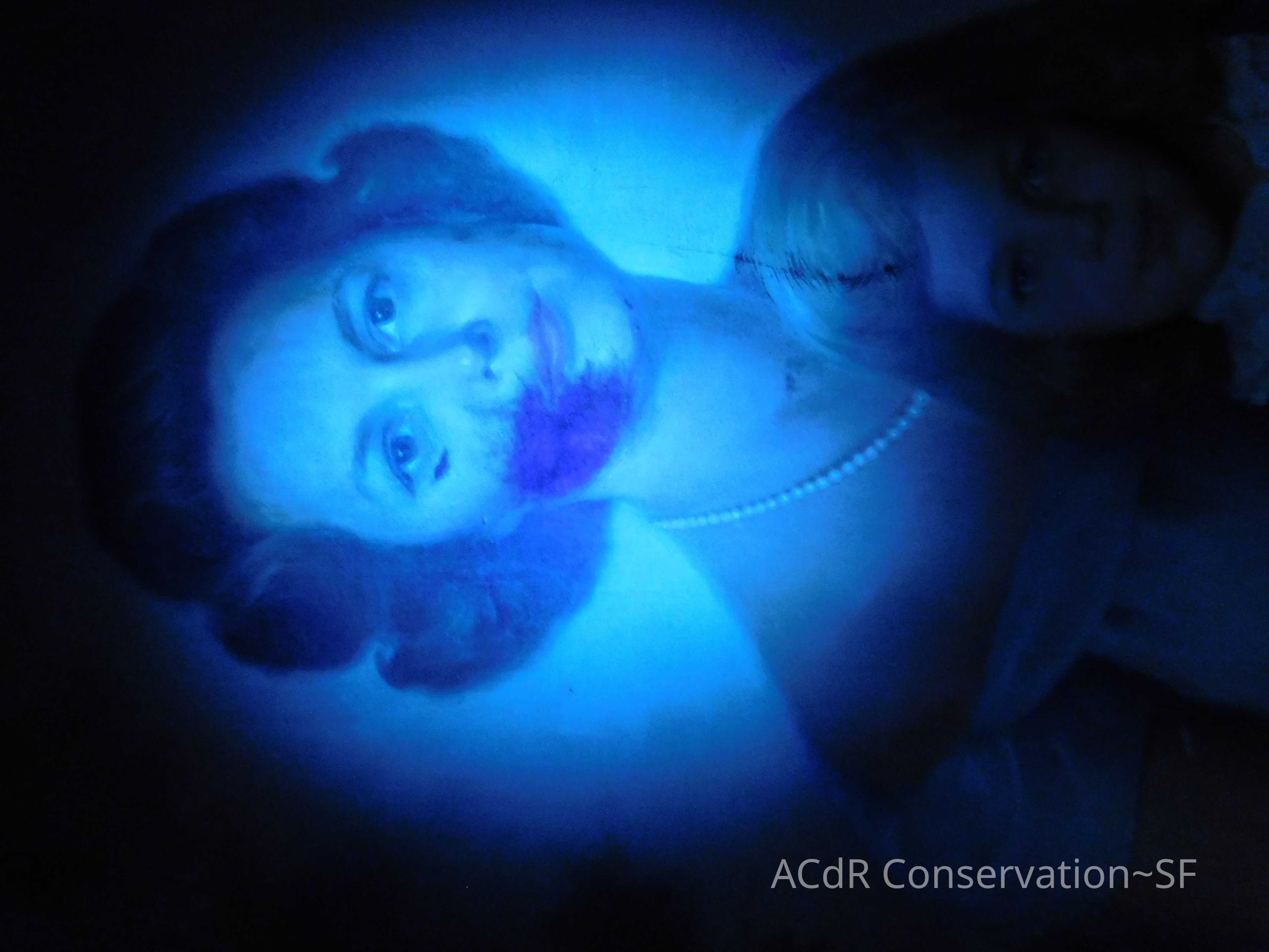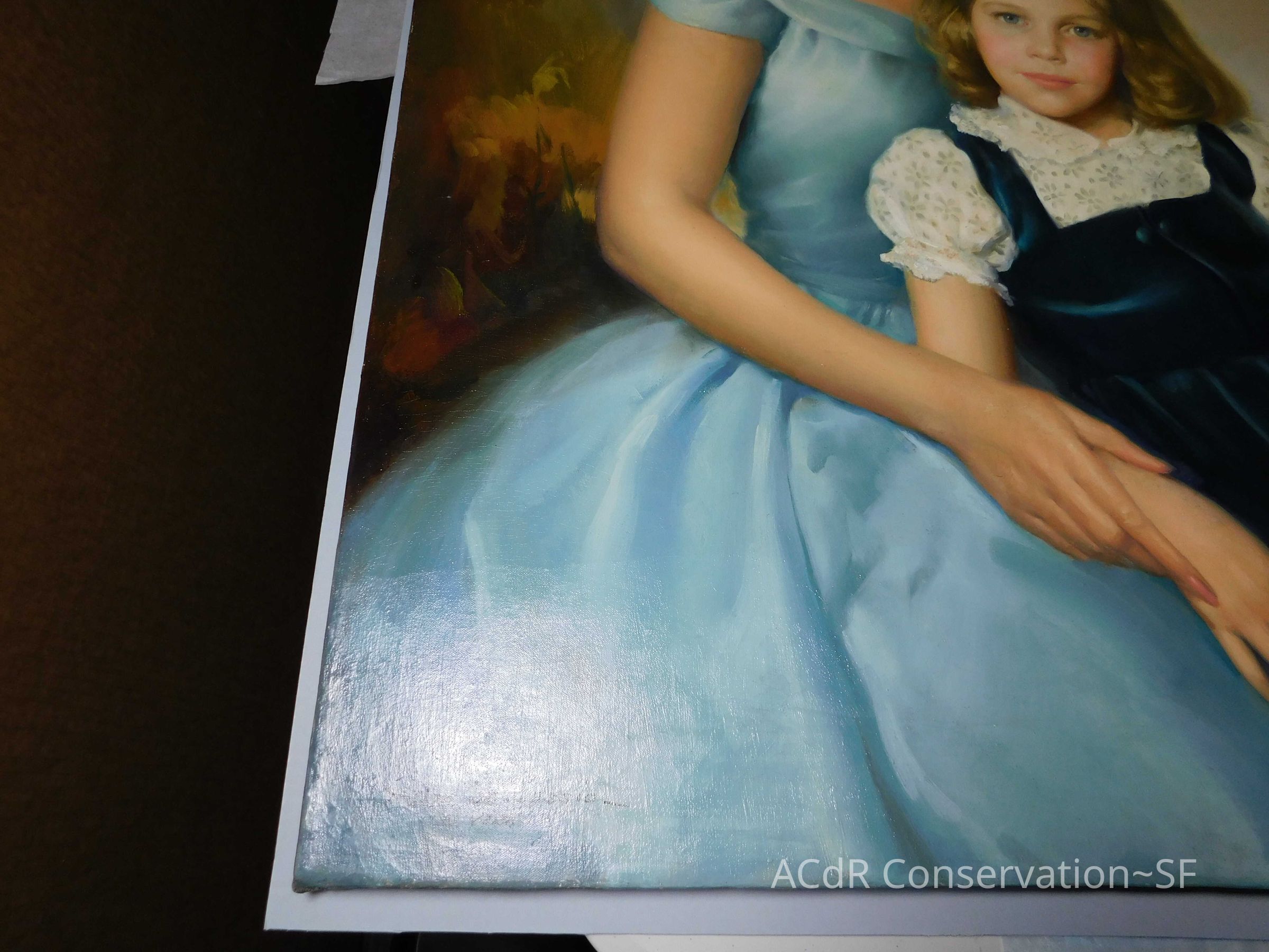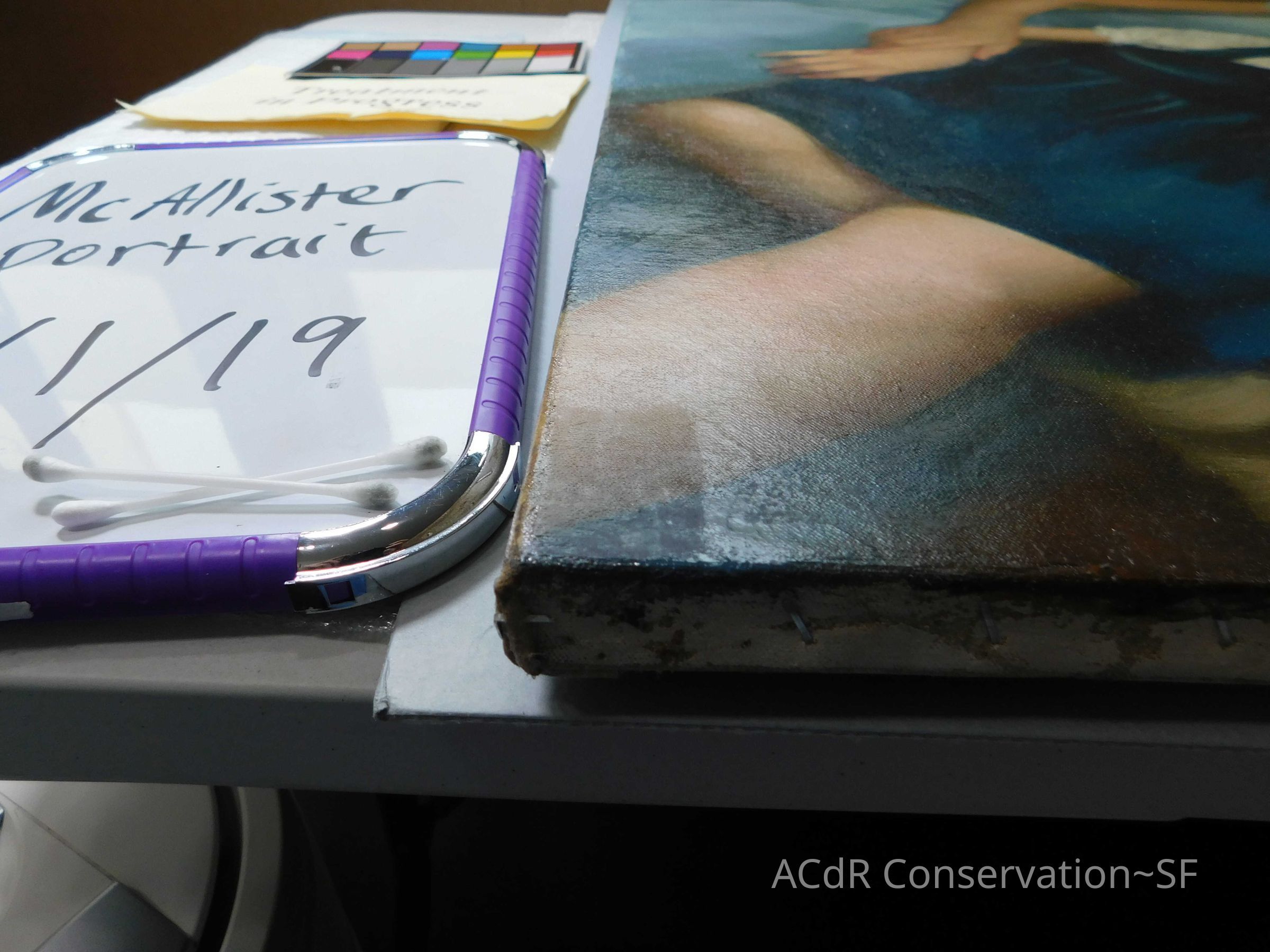 Testing and beginning varnish removal, starting at bottom right corner and moving along bottom edge. Using Naptha, 1/5th of glossy varnish removed. Blue color coming away on swabs confirmed to be due to varnish rather than pigment lifting (did not come up blue on child’s legs). Blue areas still sensitive and susceptible, so being quick in application. Finished varnish removal; reconsolidated cracks in mother’s left arm/child’s right cheek.
