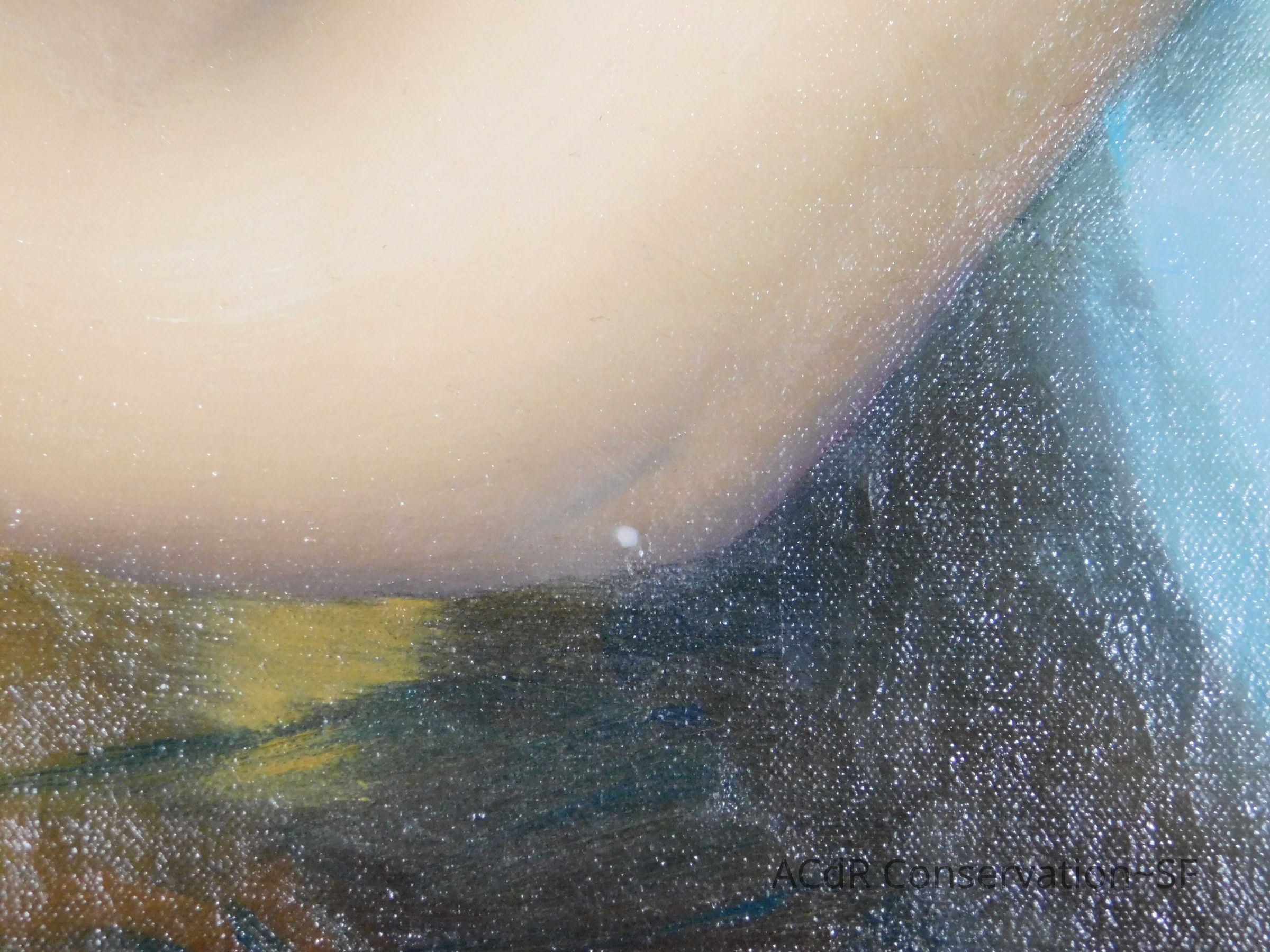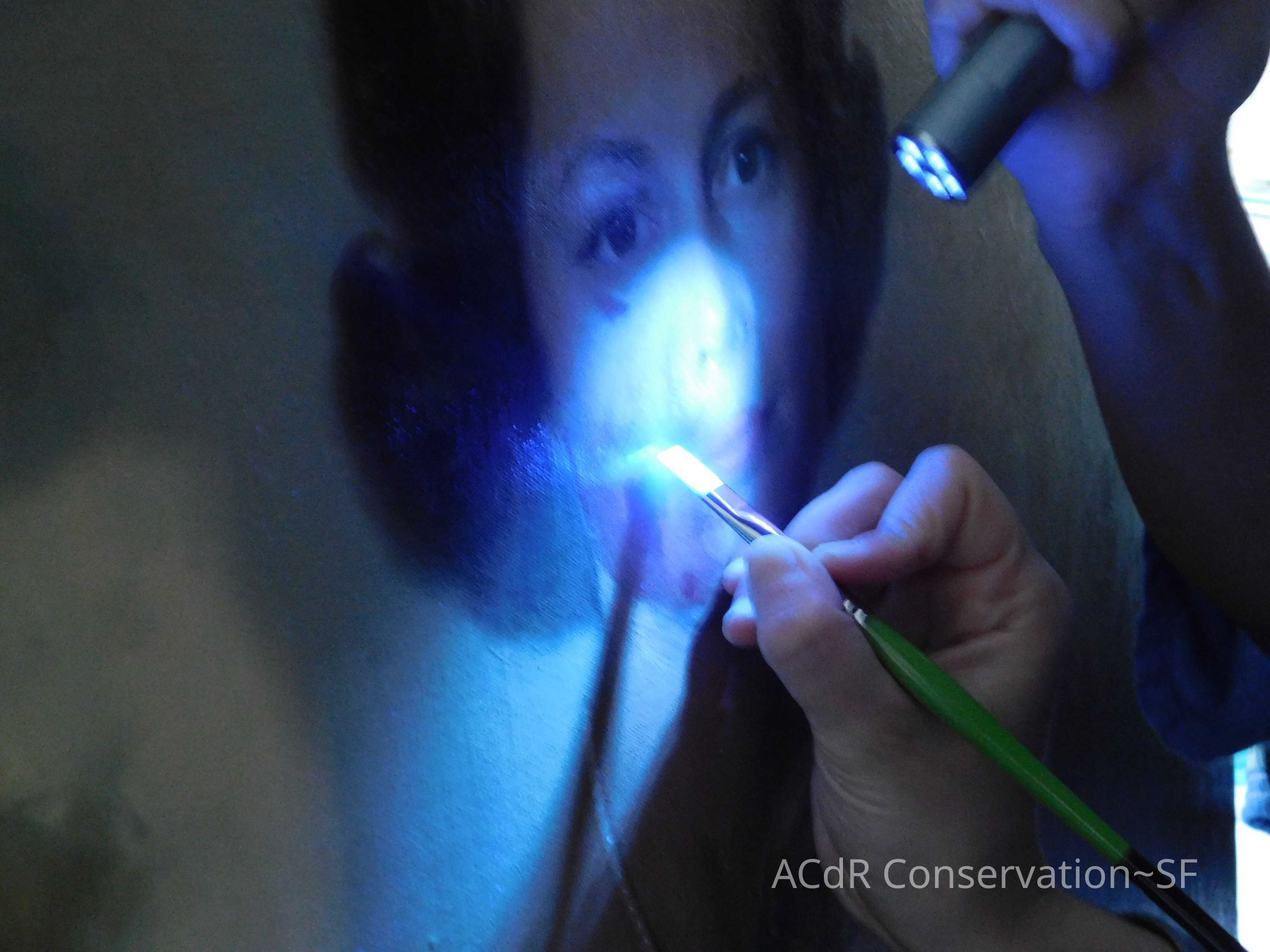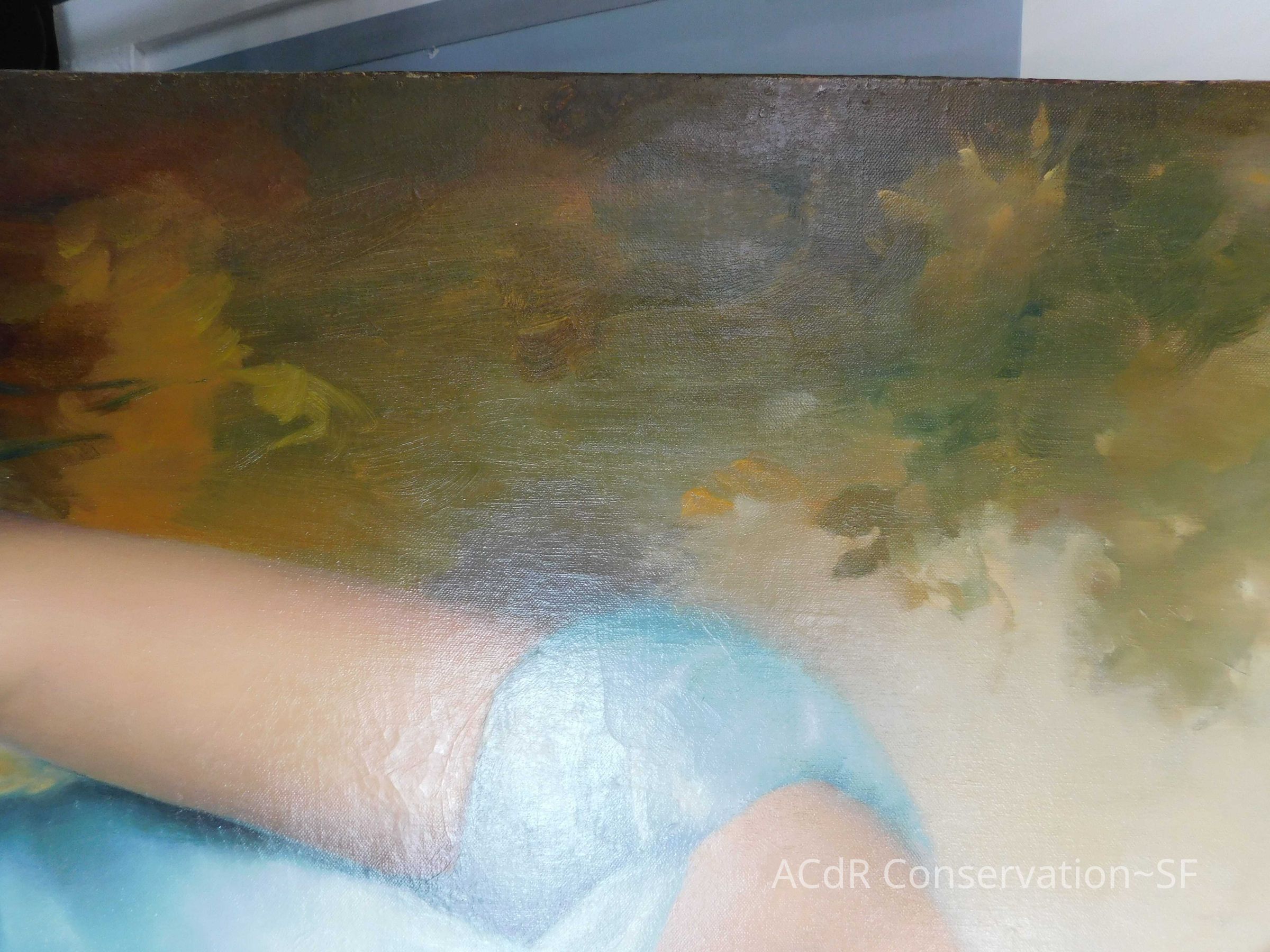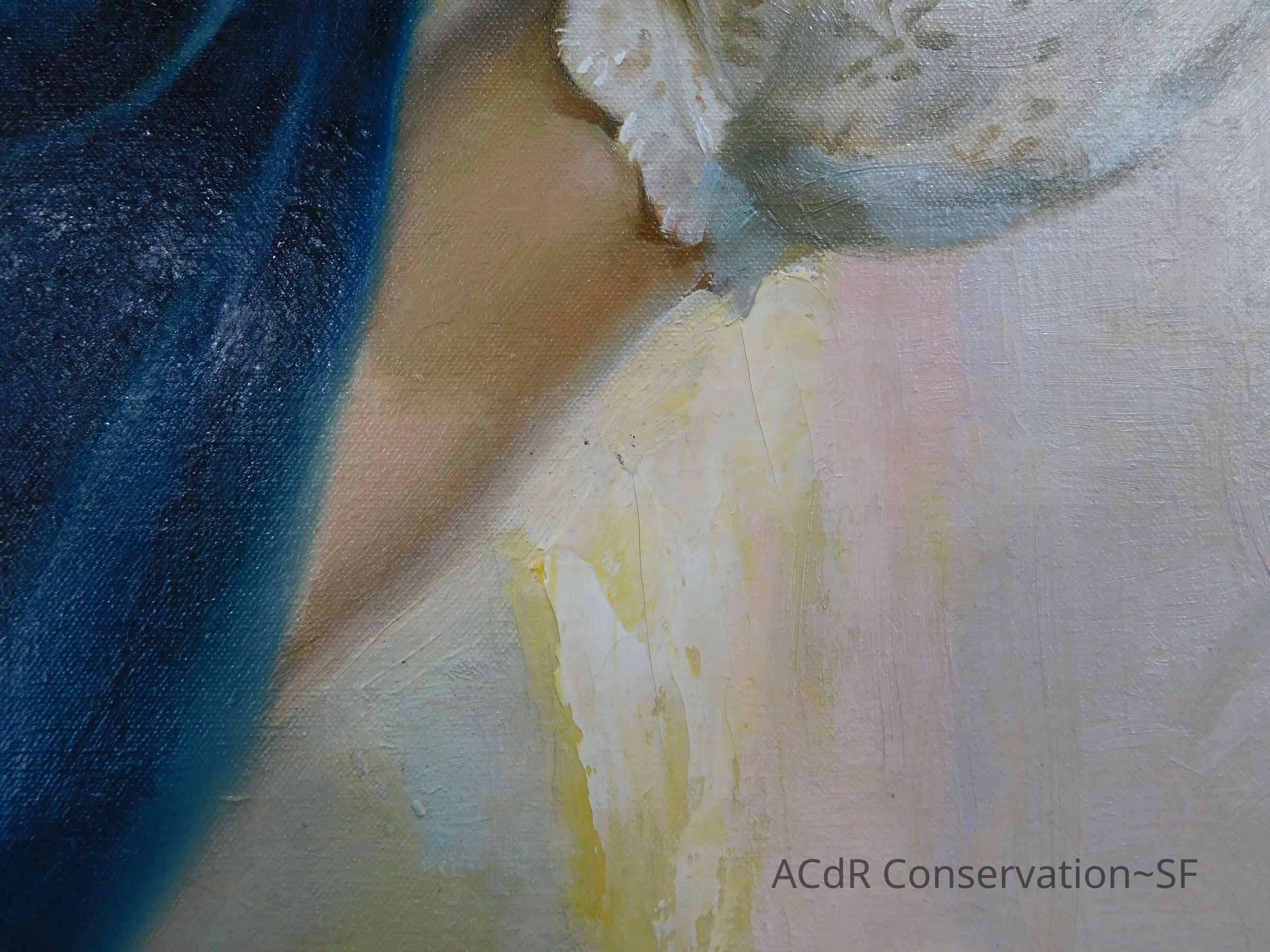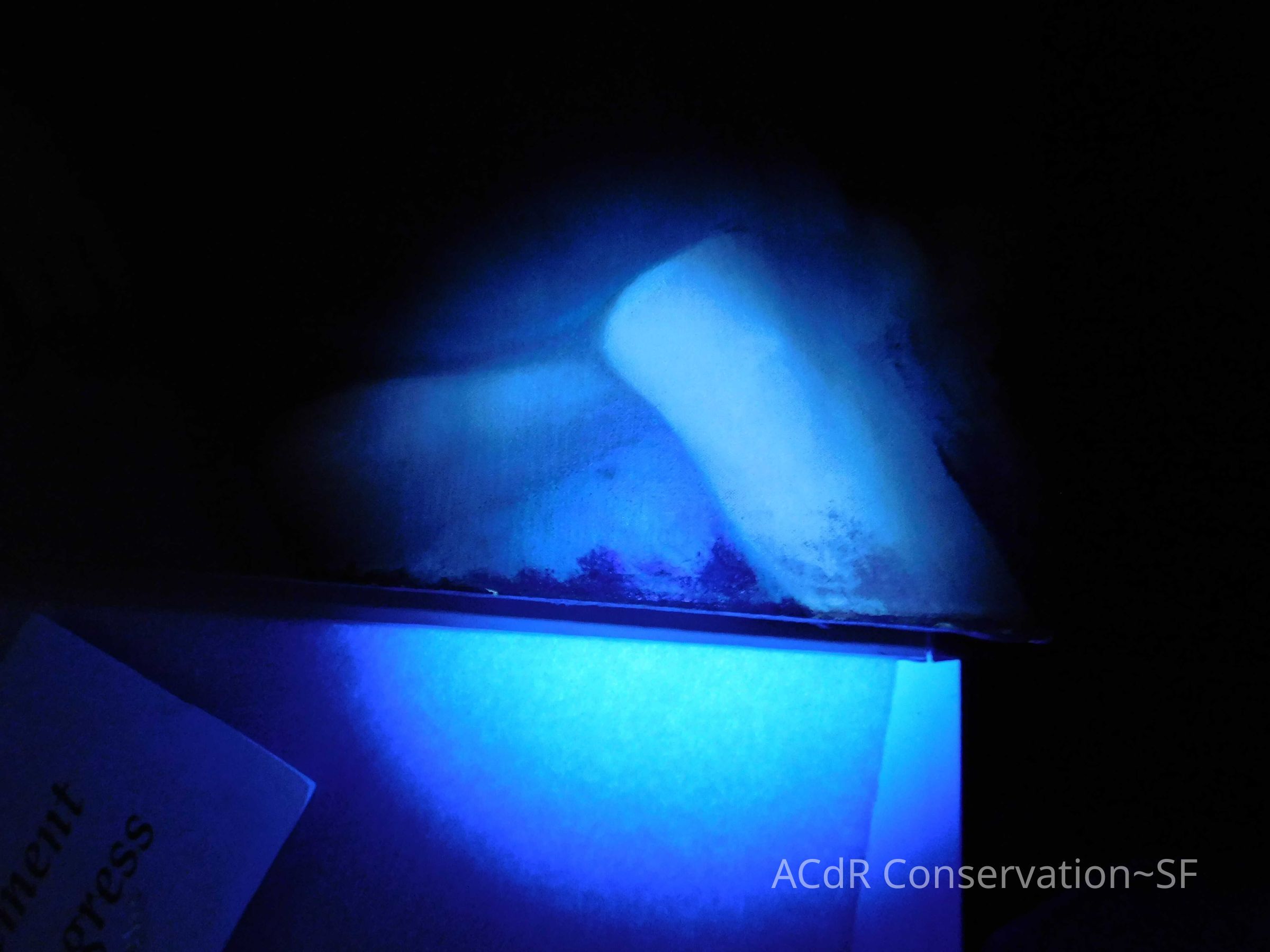 Testing and beginning varnish removal, starting at bottom right corner and moving along bottom edge. Using Naptha, 1/5th of glossy varnish removed. Blue color coming away on swabs confirmed to be due to varnish rather than pigment lifting (did not come up blue on child’s legs). Blue areas still sensitive and susceptible, so being quick in application. Finished varnish removal; reconsolidated cracks in mother’s left arm/child’s right cheek.