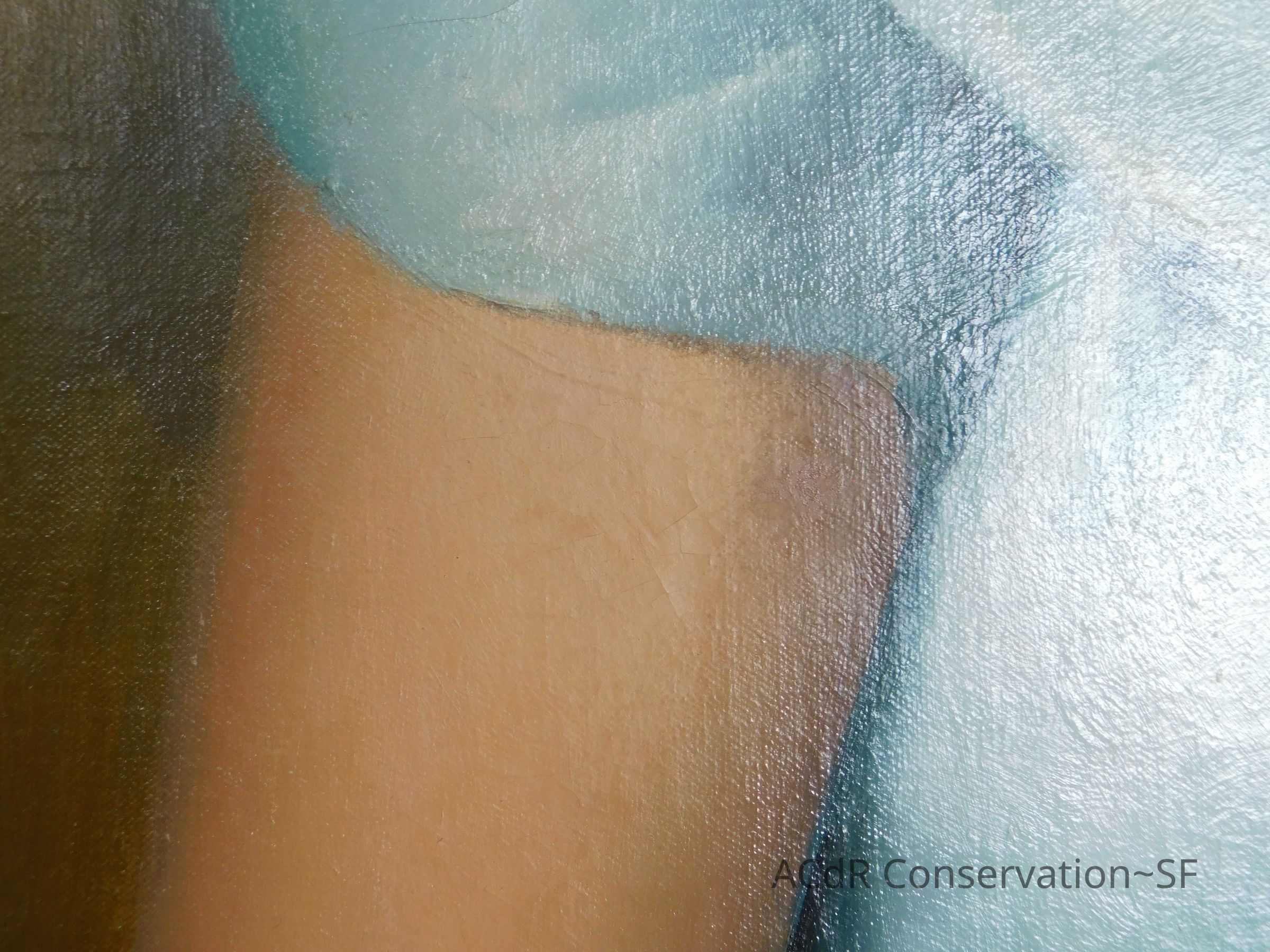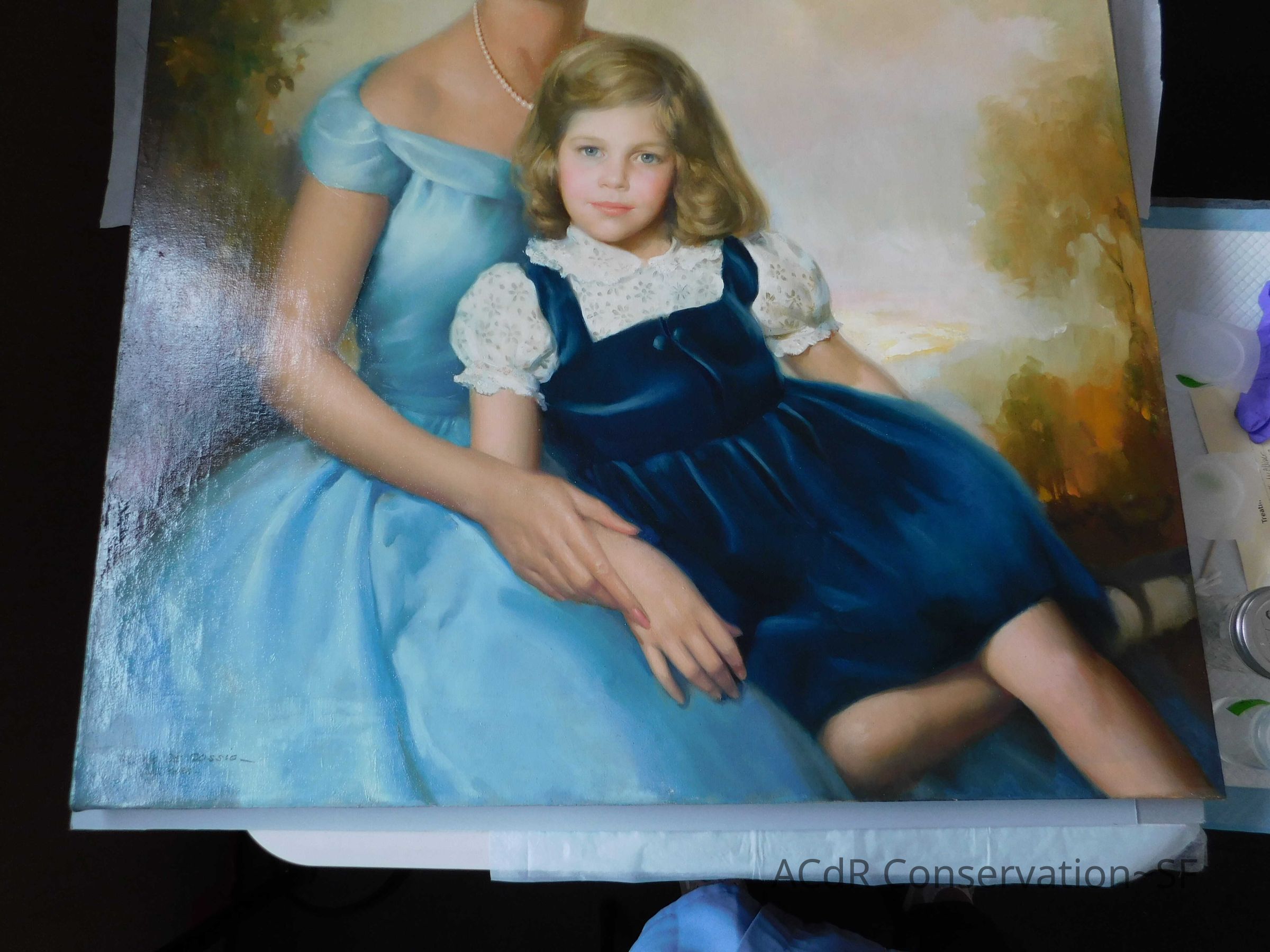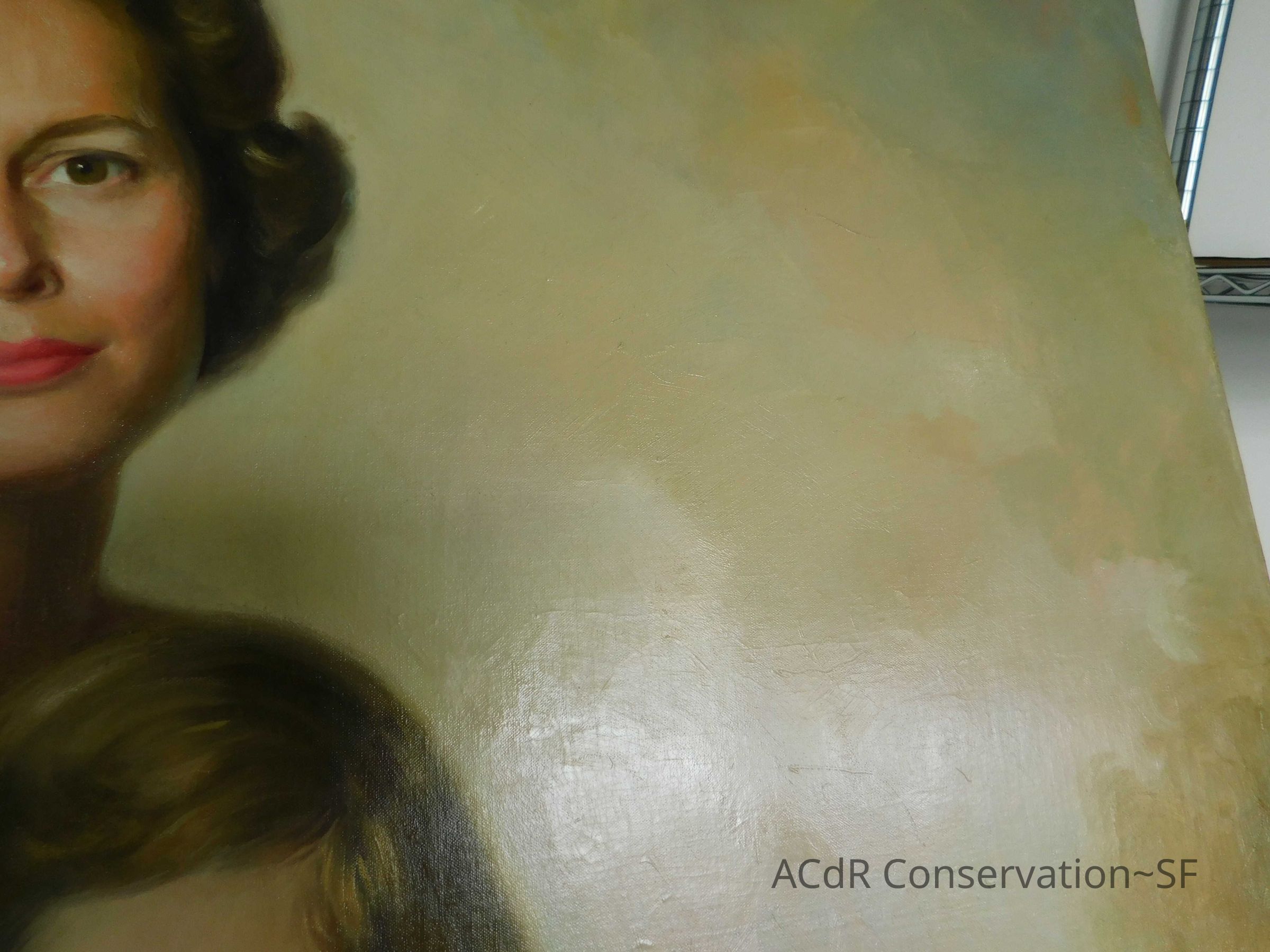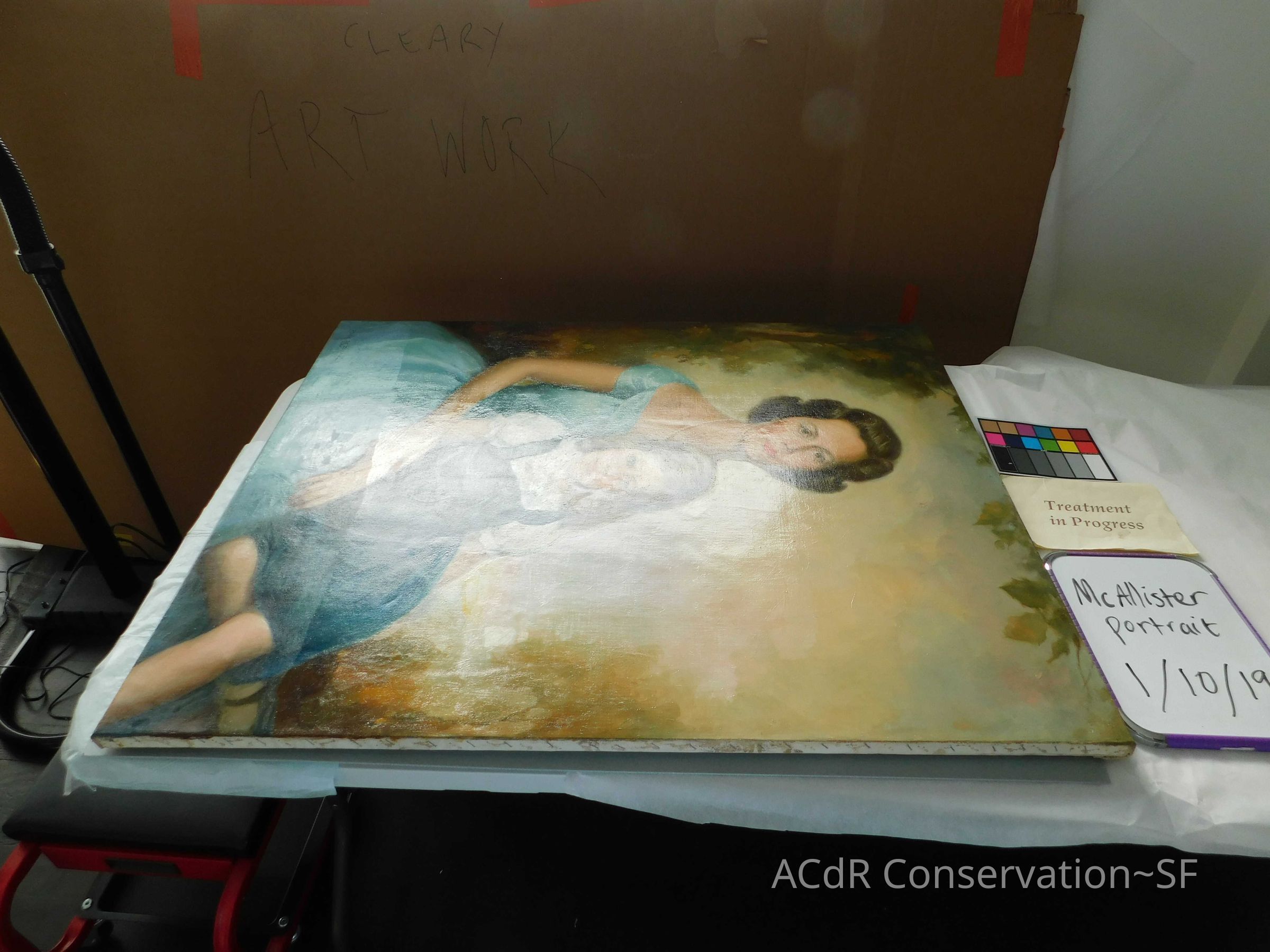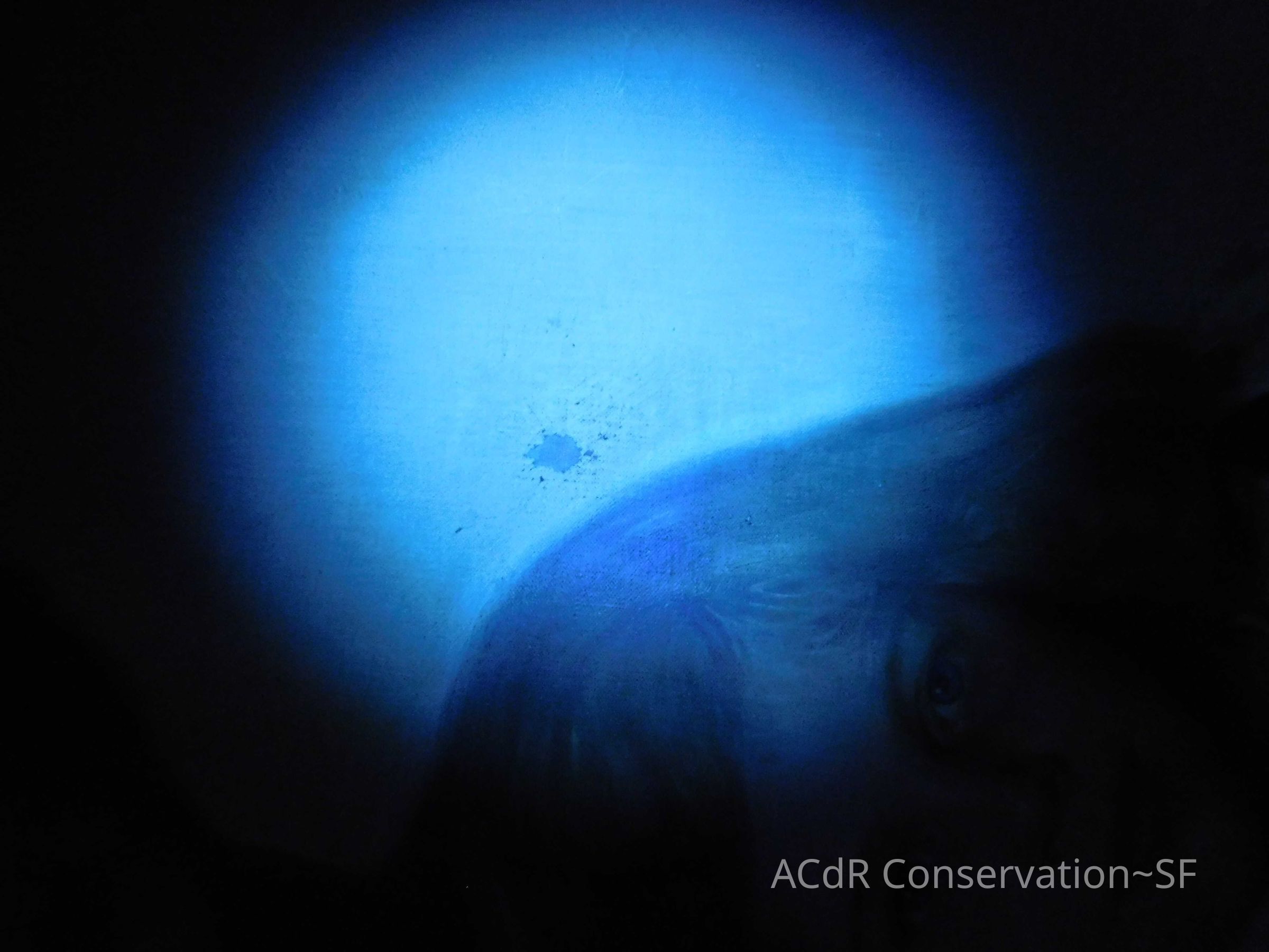 Testing and beginning varnish removal, starting at bottom right corner and moving along bottom edge. Using Naptha, 1/5th of glossy varnish removed. Blue color coming away on swabs confirmed to be due to varnish rather than pigment lifting (did not come up blue on child’s legs). Blue areas still sensitive and susceptible, so being quick in application. Finished varnish removal; reconsolidated cracks in mother’s left arm/child’s right cheek.