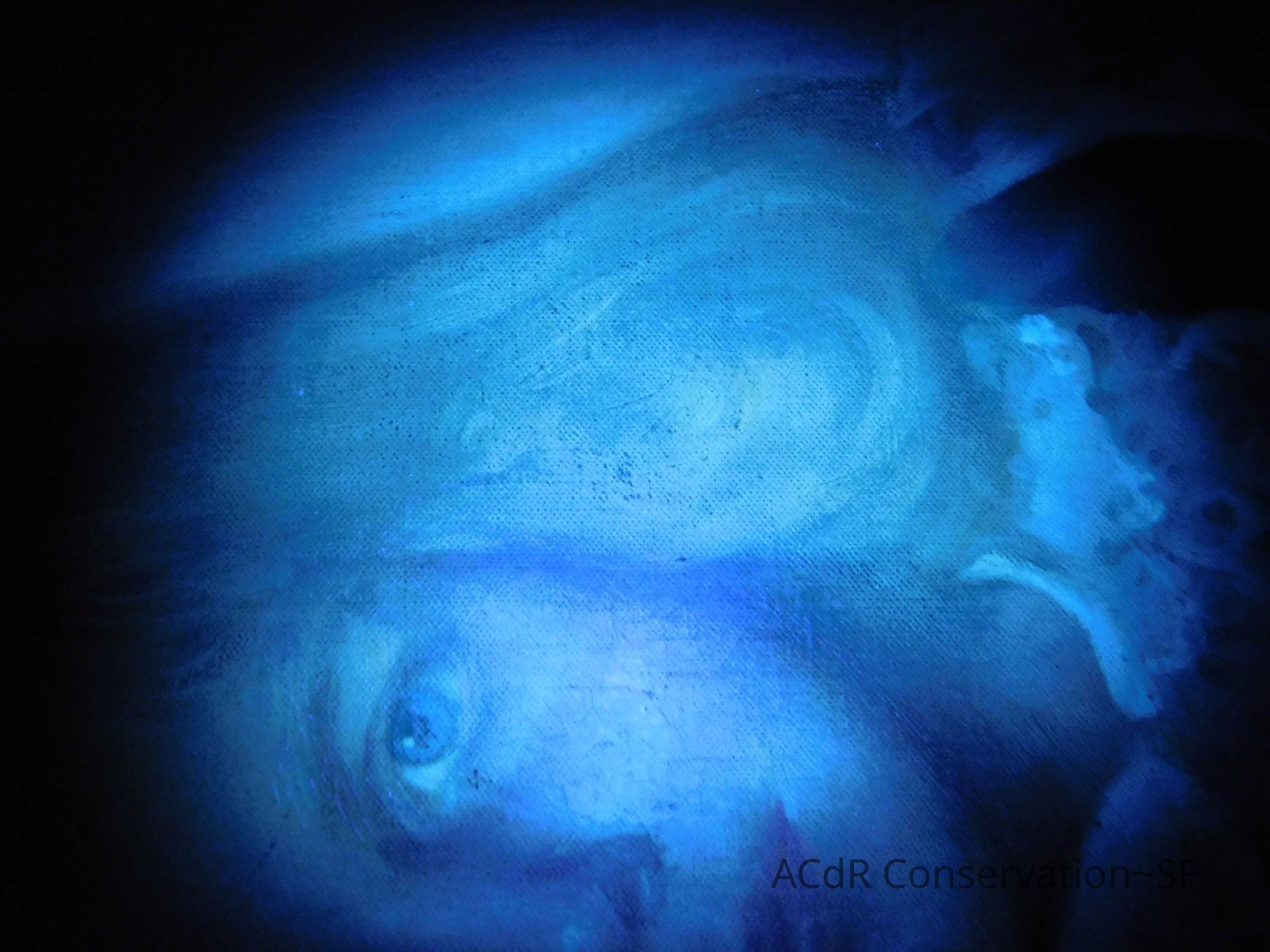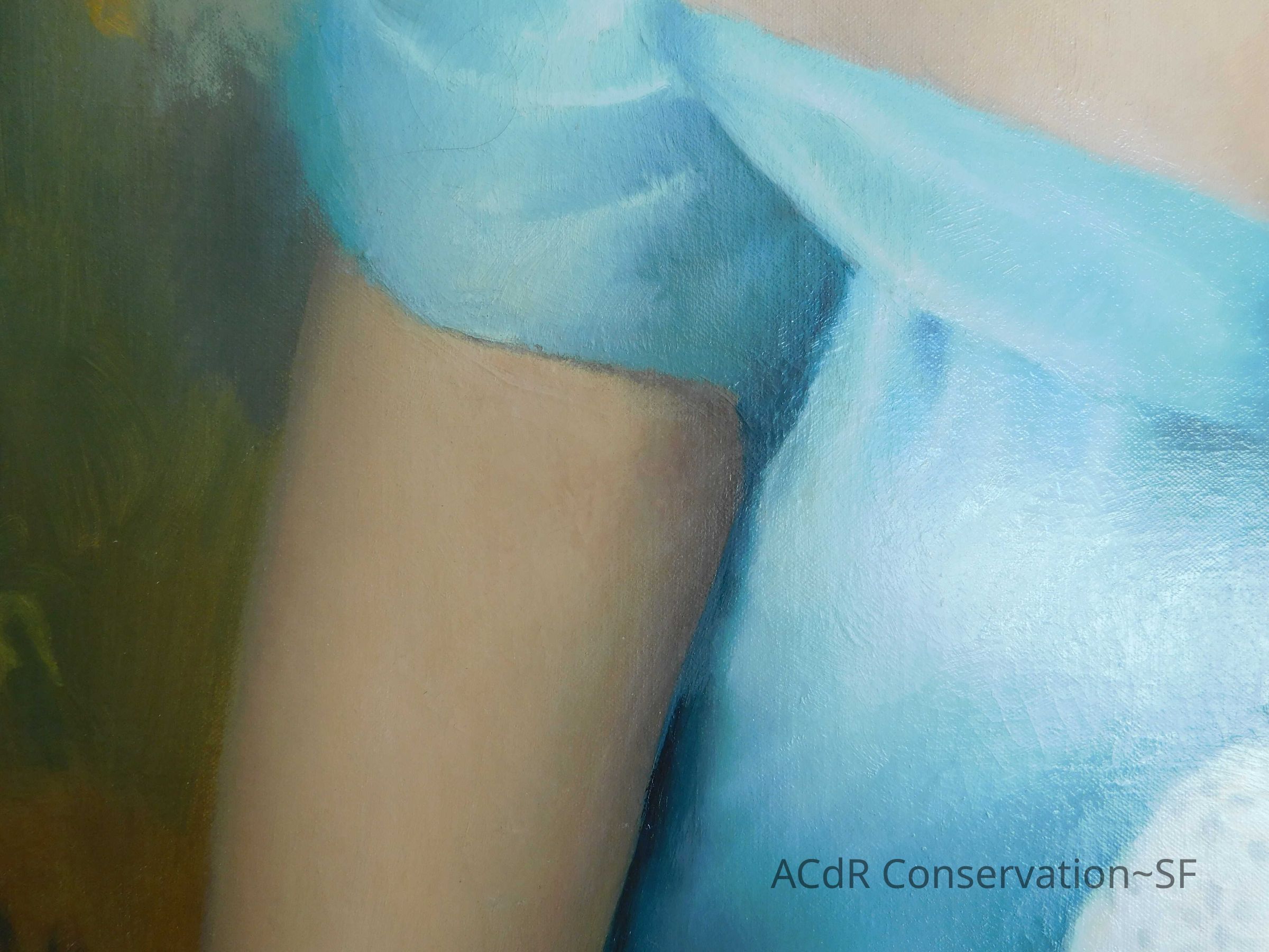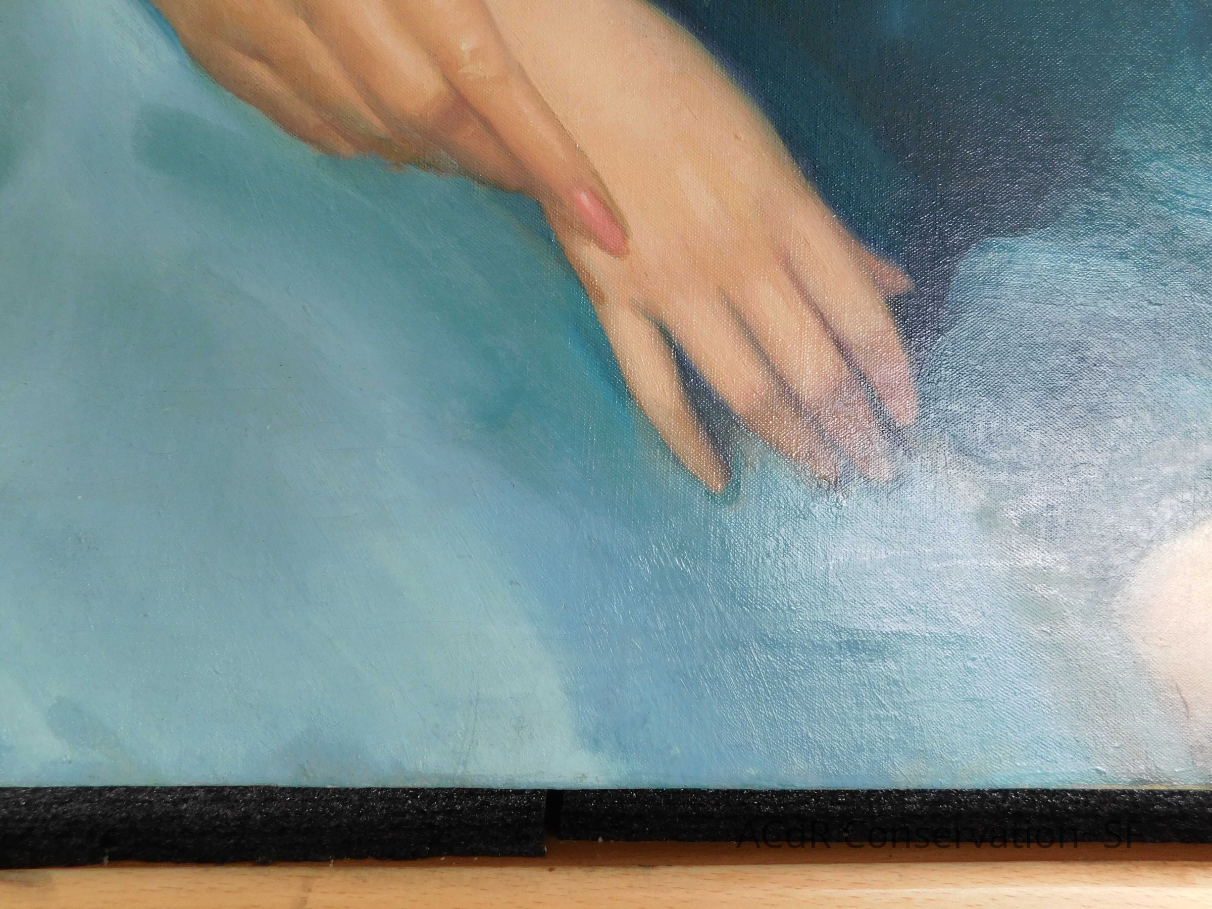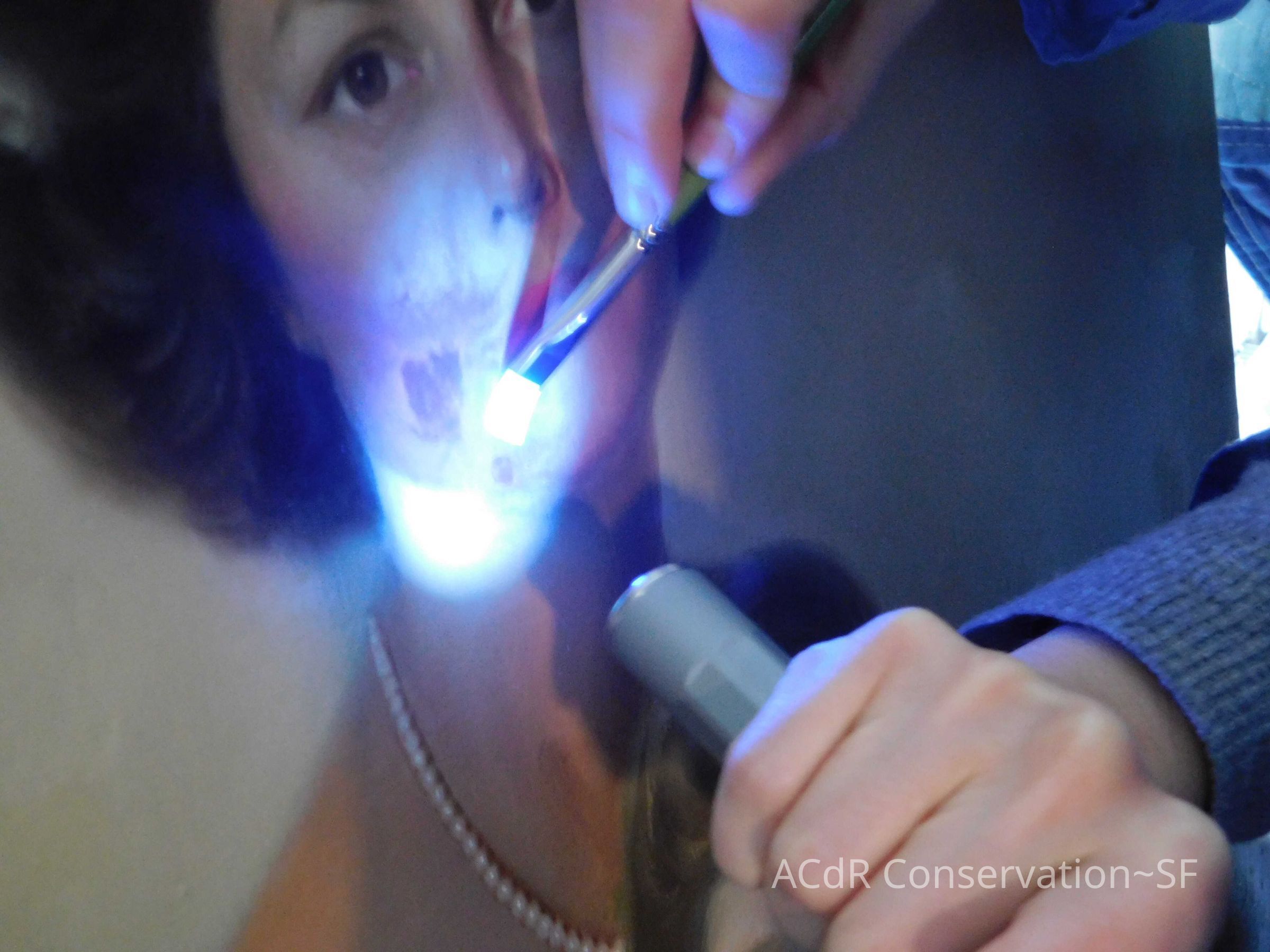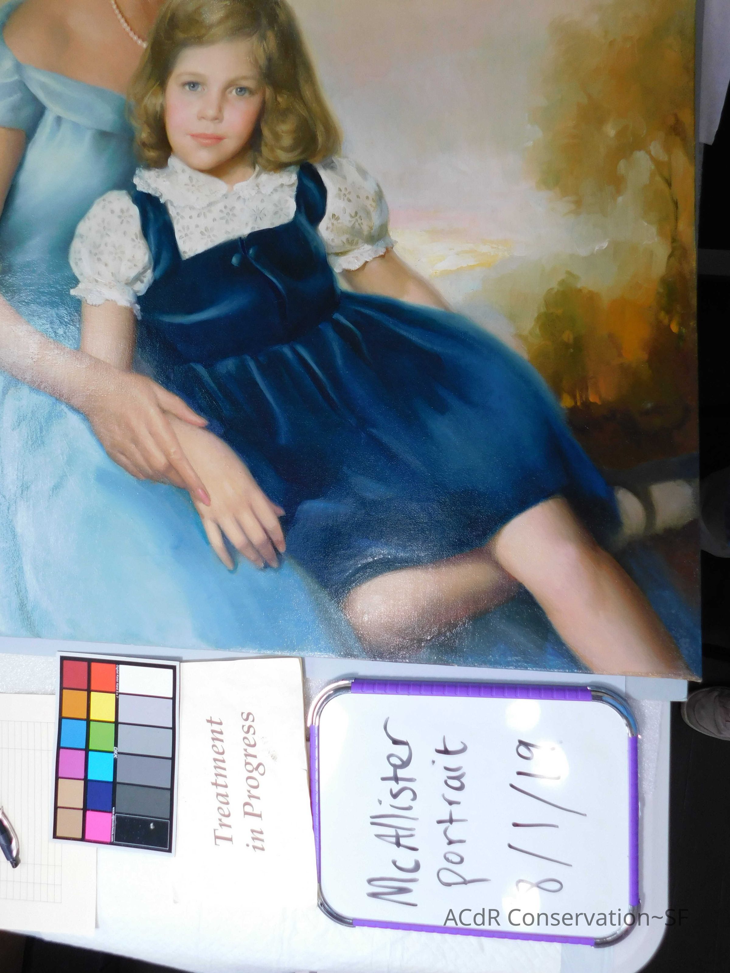 Testing and beginning varnish removal, starting at bottom right corner and moving along bottom edge. Using Naptha, 1/5th of glossy varnish removed. Blue color coming away on swabs confirmed to be due to varnish rather than pigment lifting (did not come up blue on child’s legs). Blue areas still sensitive and susceptible, so being quick in application. Finished varnish removal; reconsolidated cracks in mother’s left arm/child’s right cheek.