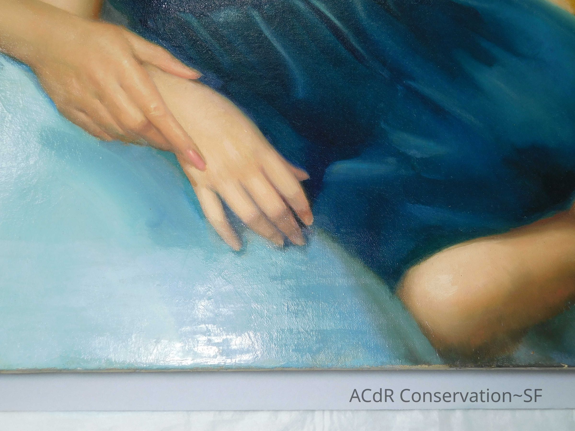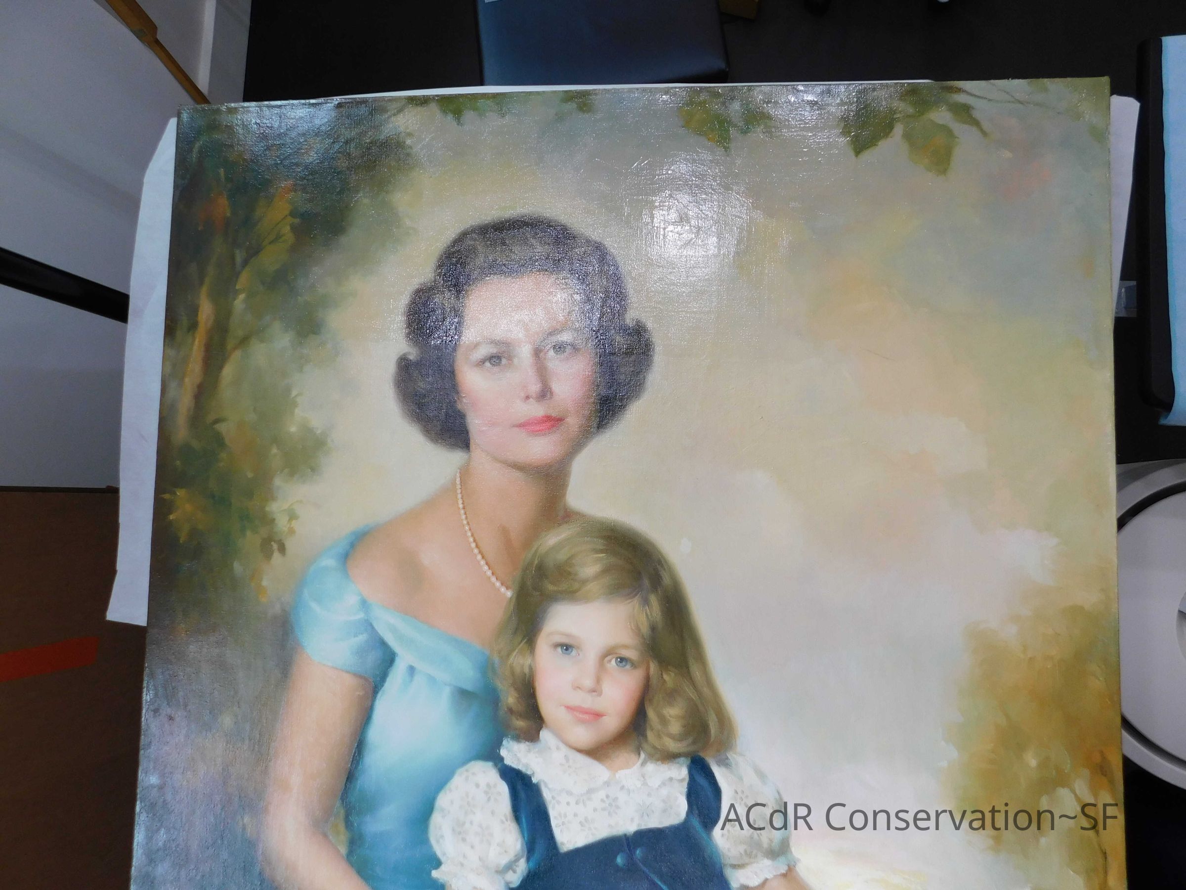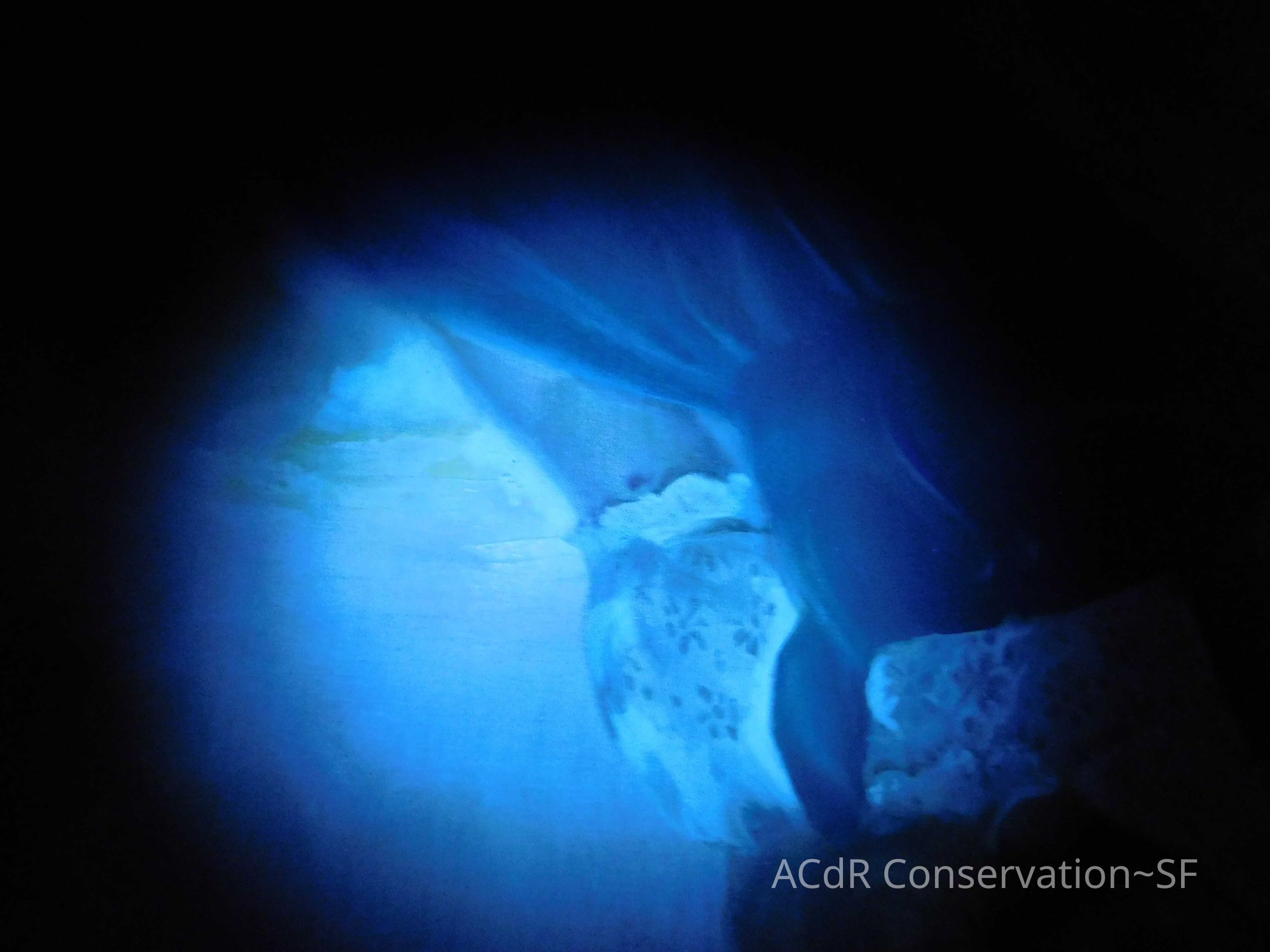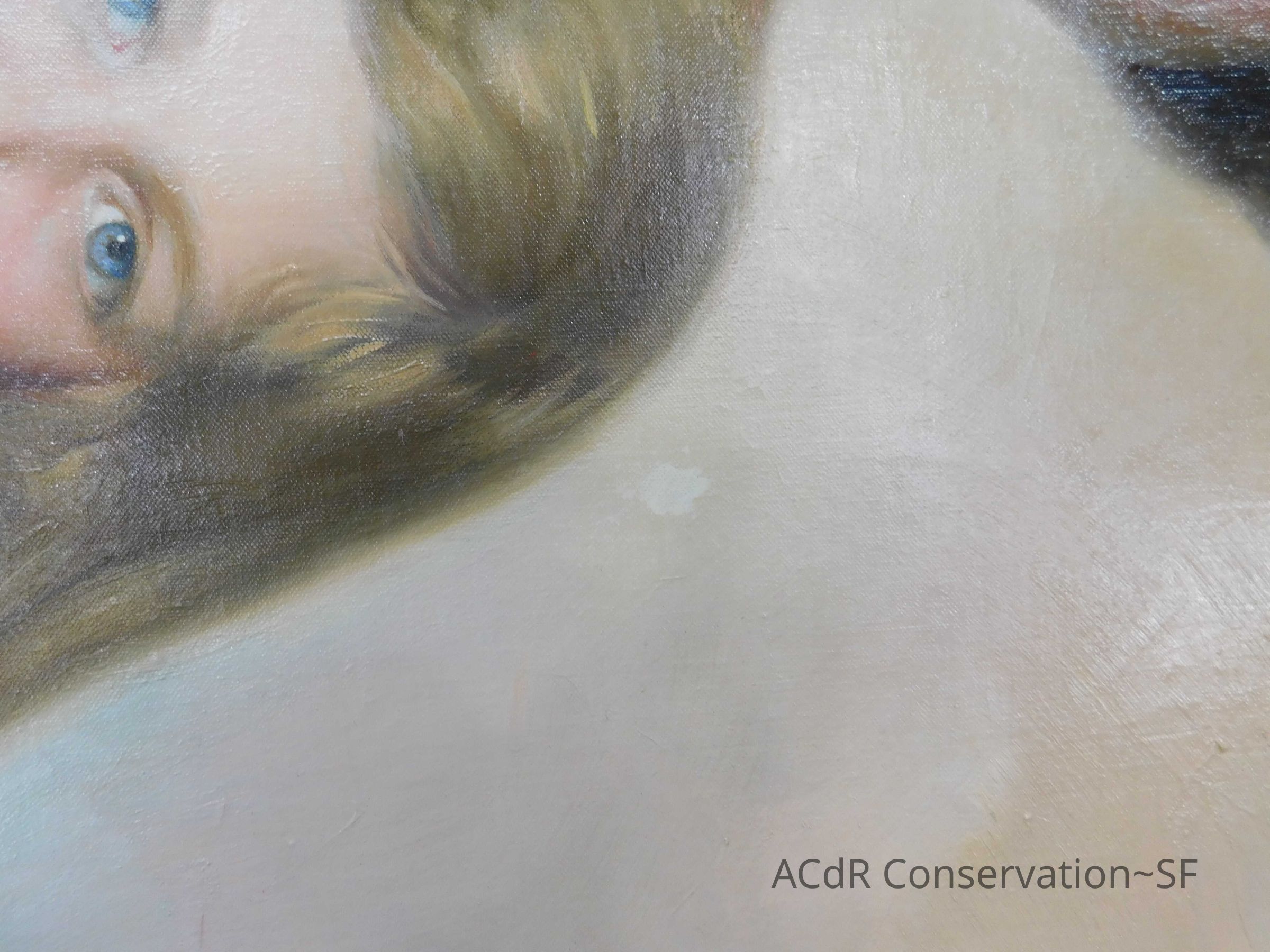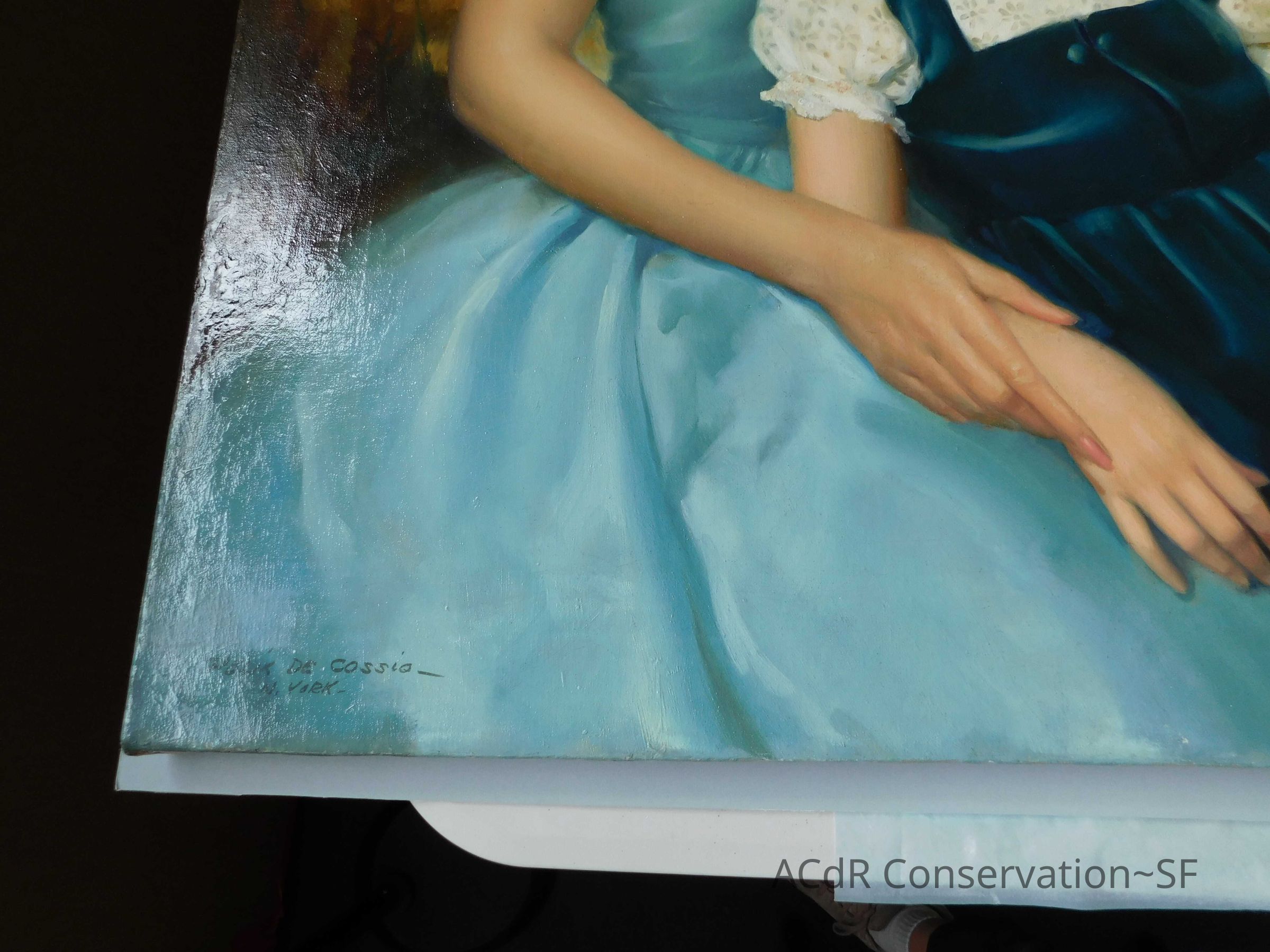 Testing and beginning varnish removal, starting at bottom right corner and moving along bottom edge. Using Naptha, 1/5th of glossy varnish removed. Blue color coming away on swabs confirmed to be due to varnish rather than pigment lifting (did not come up blue on child’s legs). Blue areas still sensitive and susceptible, so being quick in application. Finished varnish removal; reconsolidated cracks in mother’s left arm/child’s right cheek.