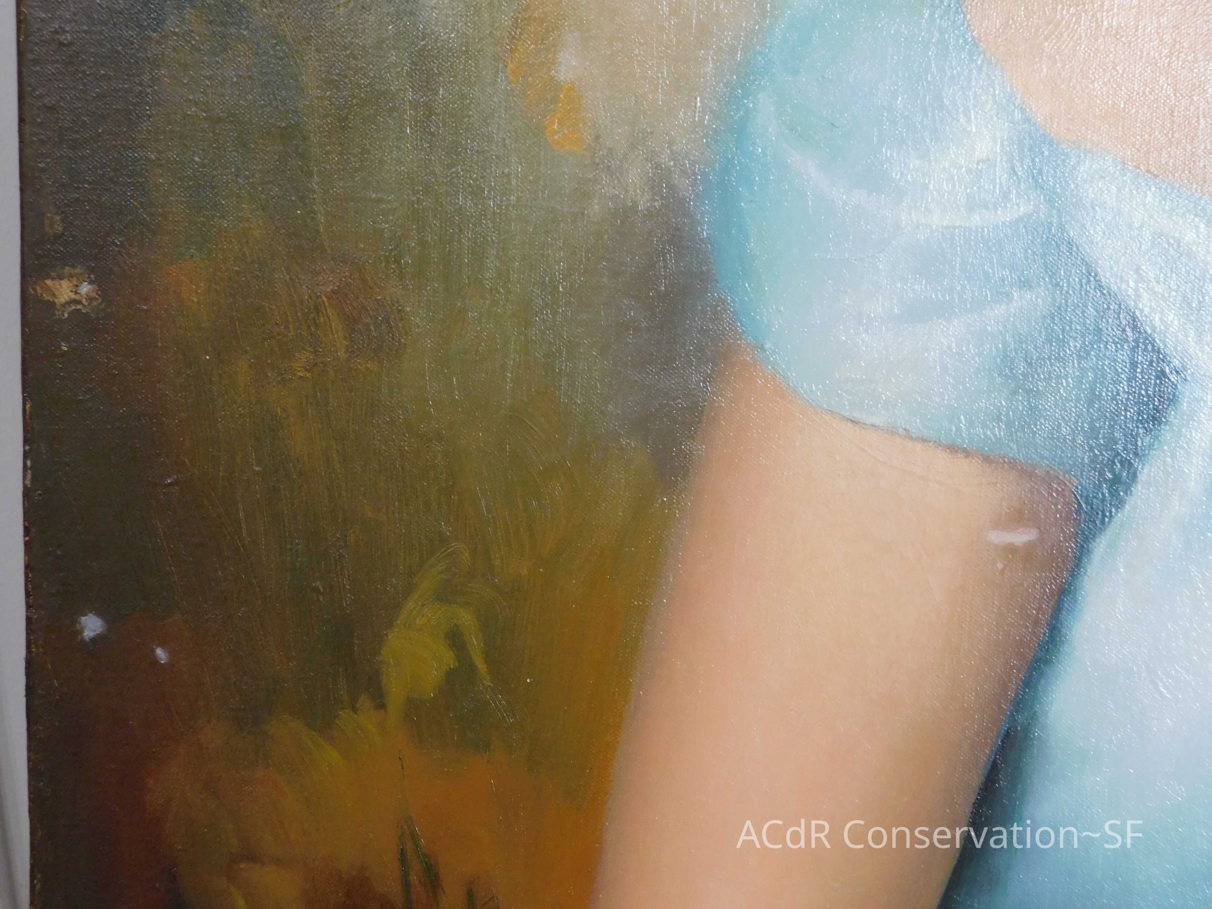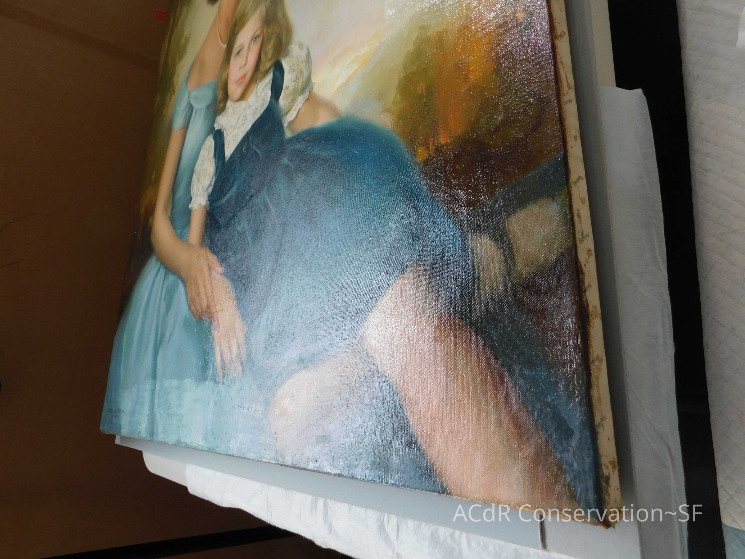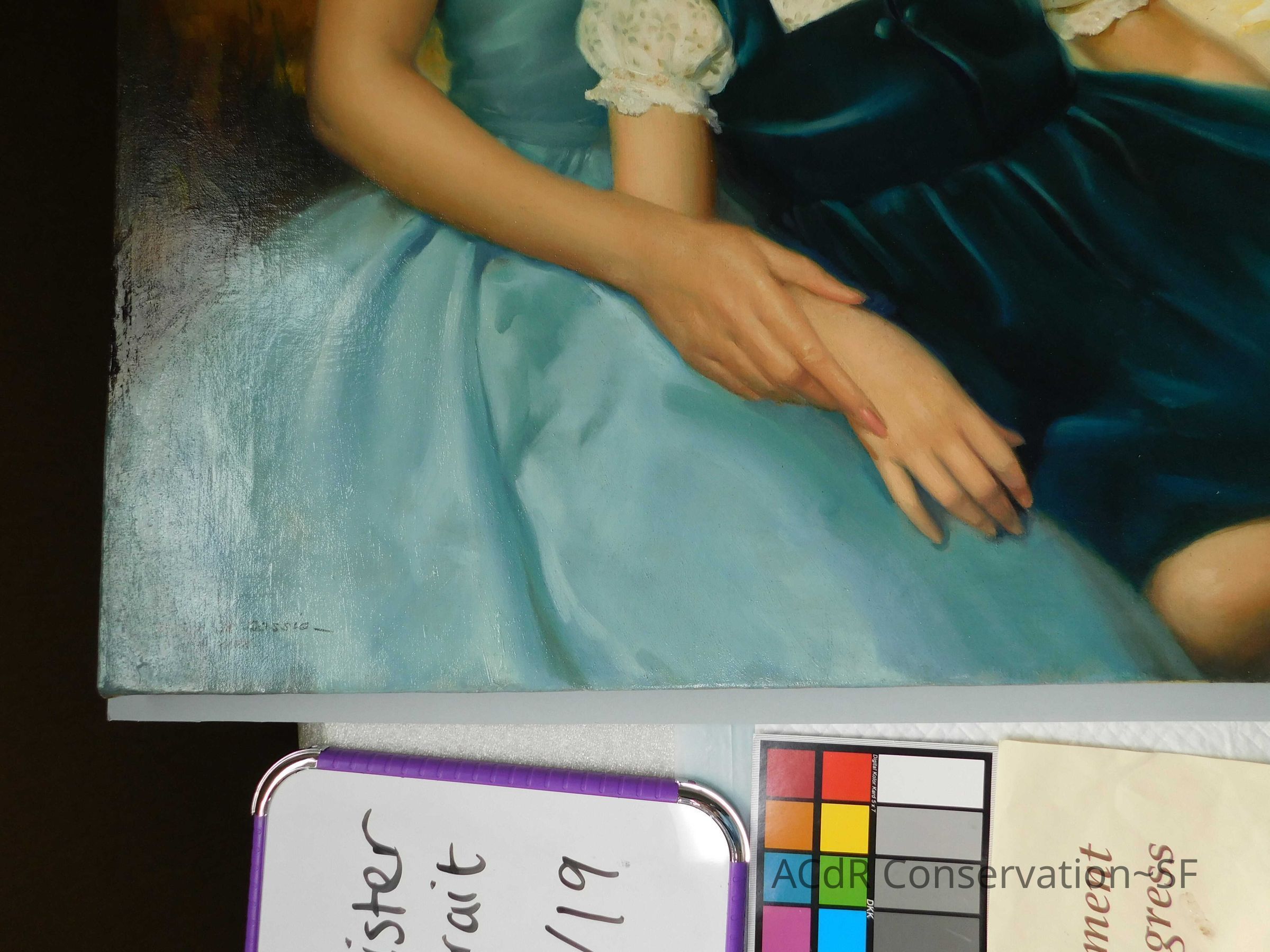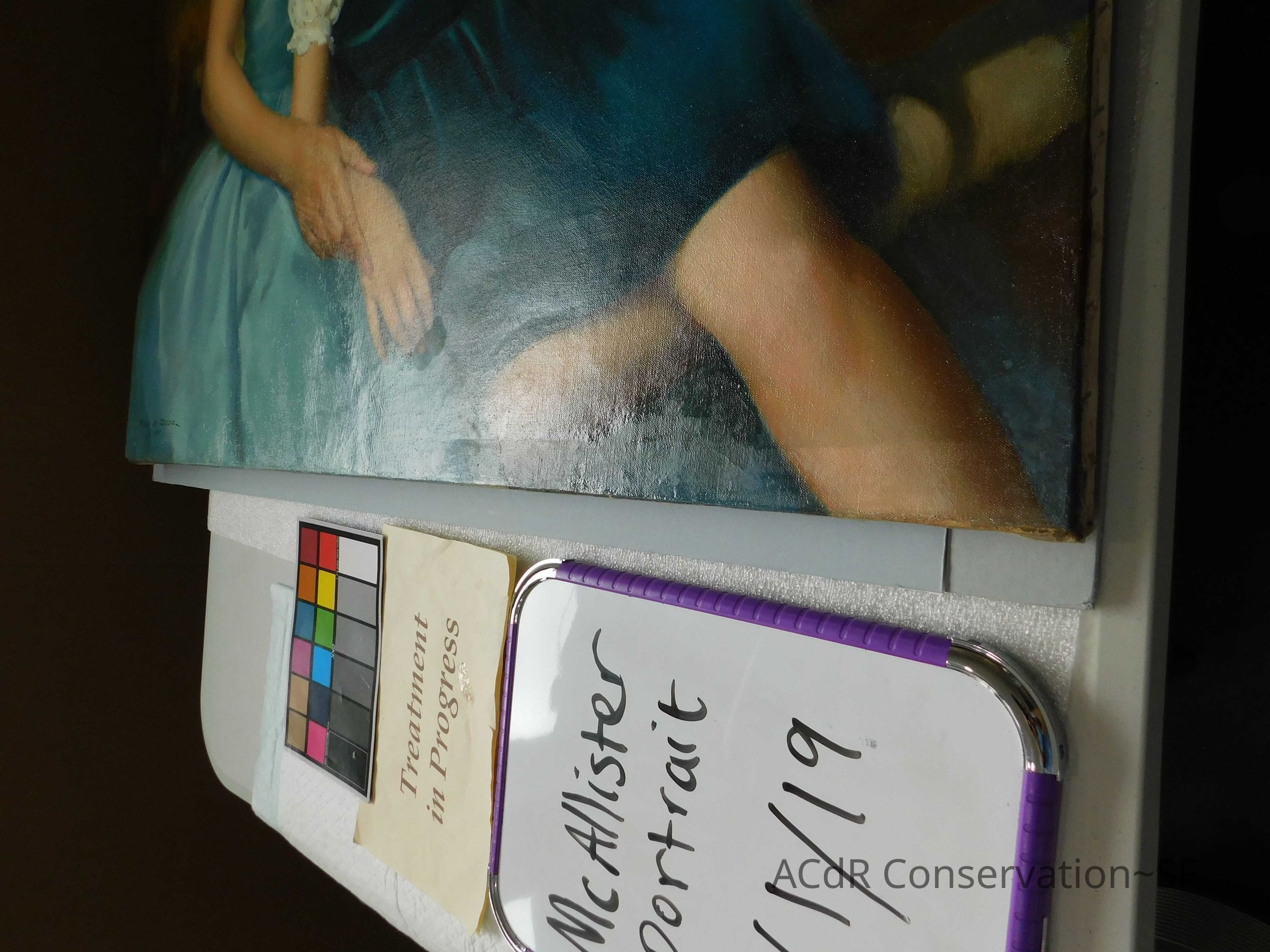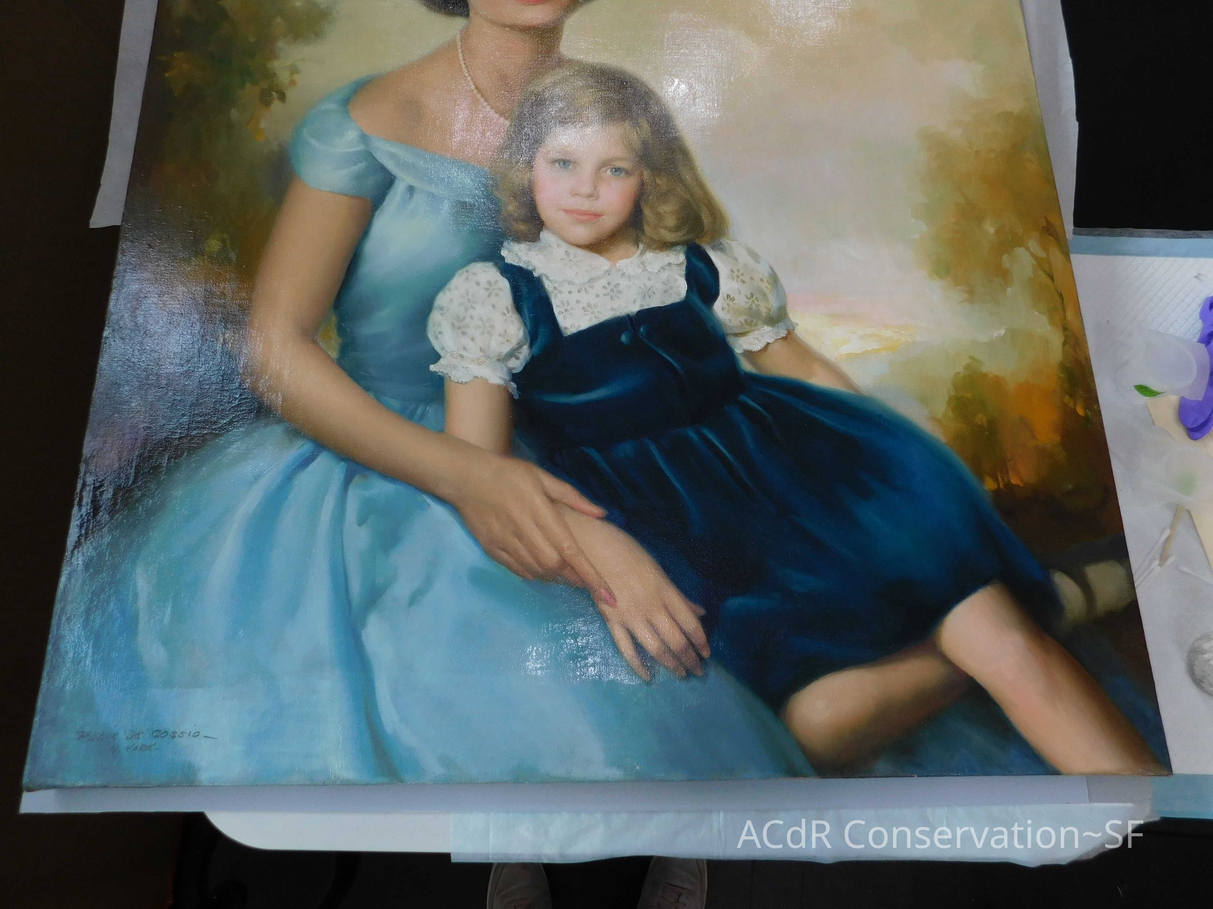 Testing and beginning varnish removal, starting at bottom right corner and moving along bottom edge. Using Naptha, 1/5th of glossy varnish removed. Blue color coming away on swabs confirmed to be due to varnish rather than pigment lifting (did not come up blue on child’s legs). Blue areas still sensitive and susceptible, so being quick in application. Finished varnish removal; reconsolidated cracks in mother’s left arm/child’s right cheek.