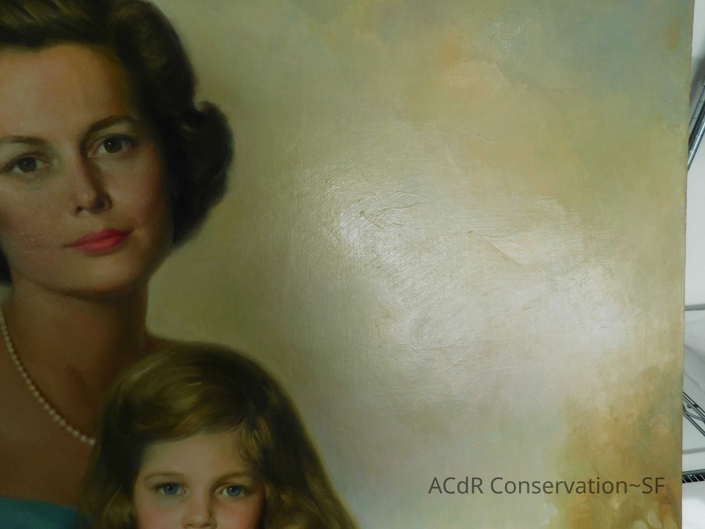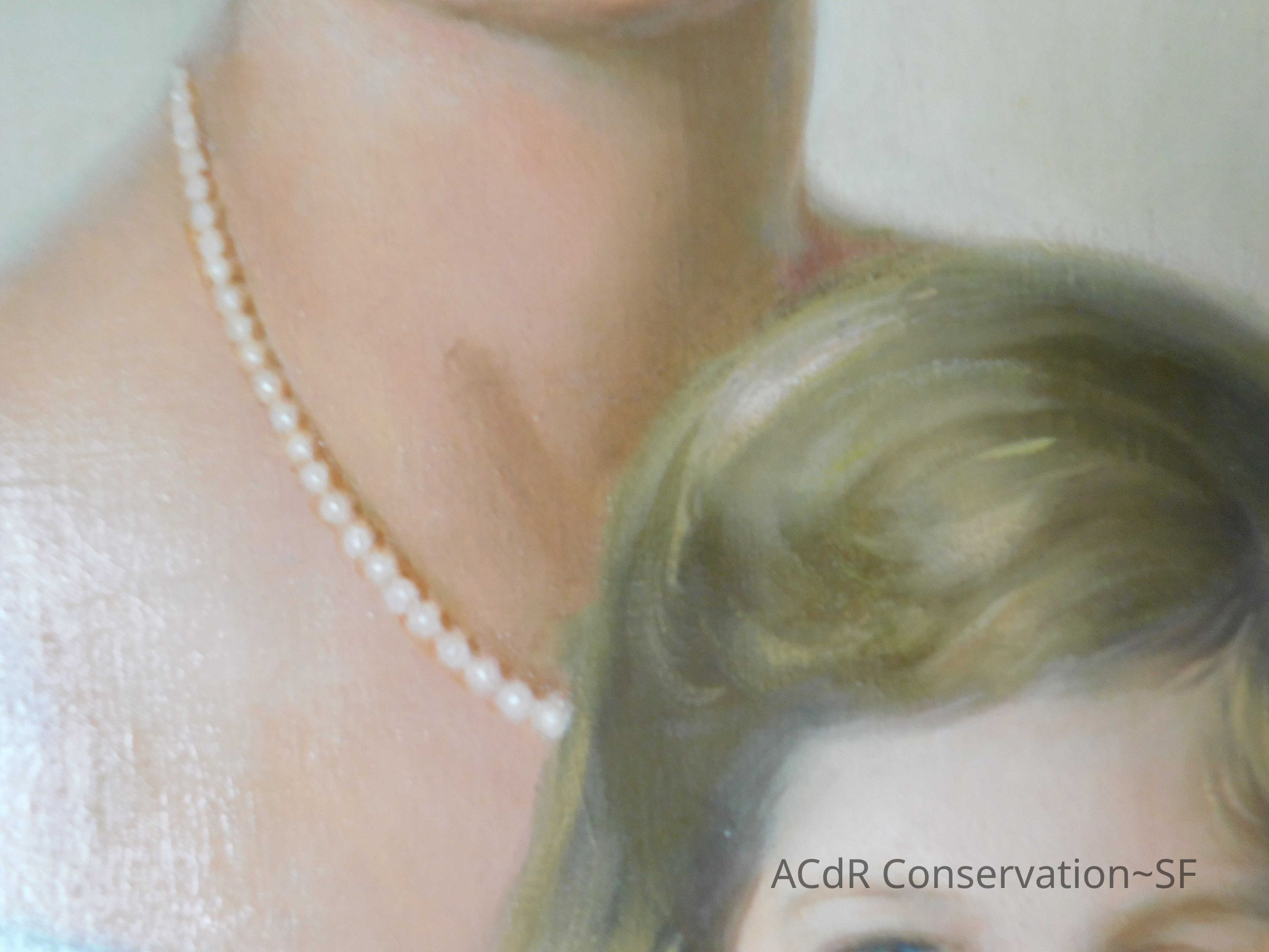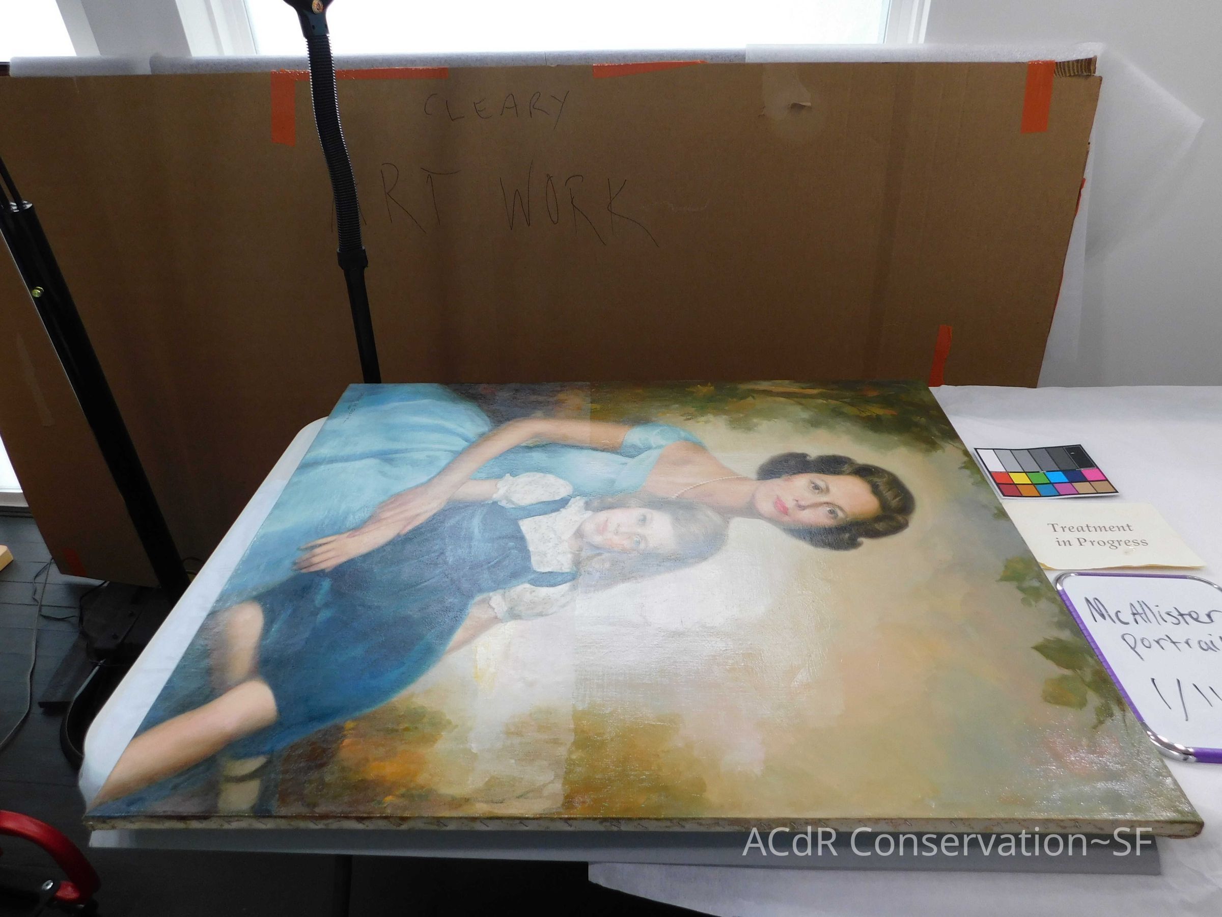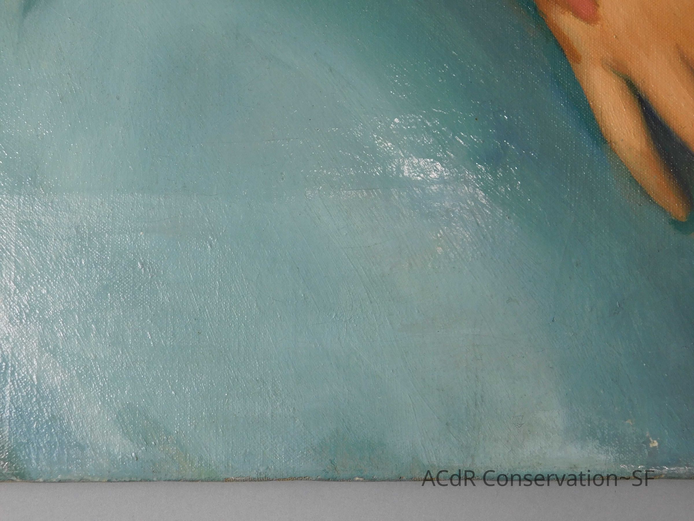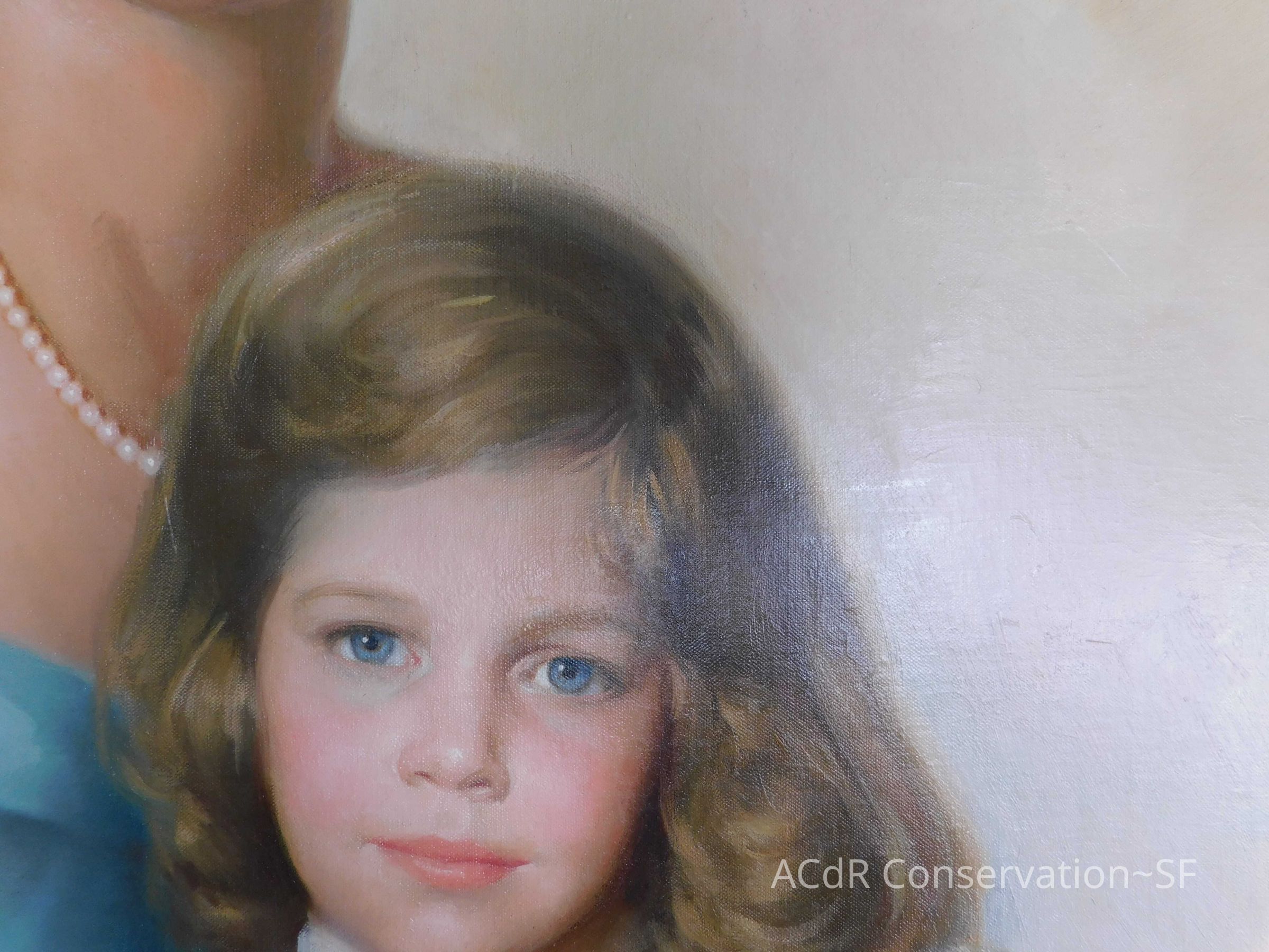 Testing and beginning varnish removal, starting at bottom right corner and moving along bottom edge. Using Naptha, 1/5th of glossy varnish removed. Blue color coming away on swabs confirmed to be due to varnish rather than pigment lifting (did not come up blue on child’s legs). Blue areas still sensitive and susceptible, so being quick in application. Finished varnish removal; reconsolidated cracks in mother’s left arm/child’s right cheek.