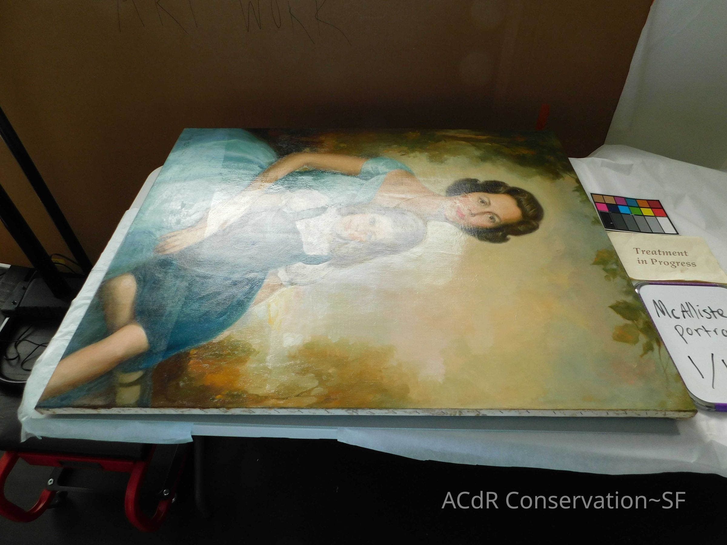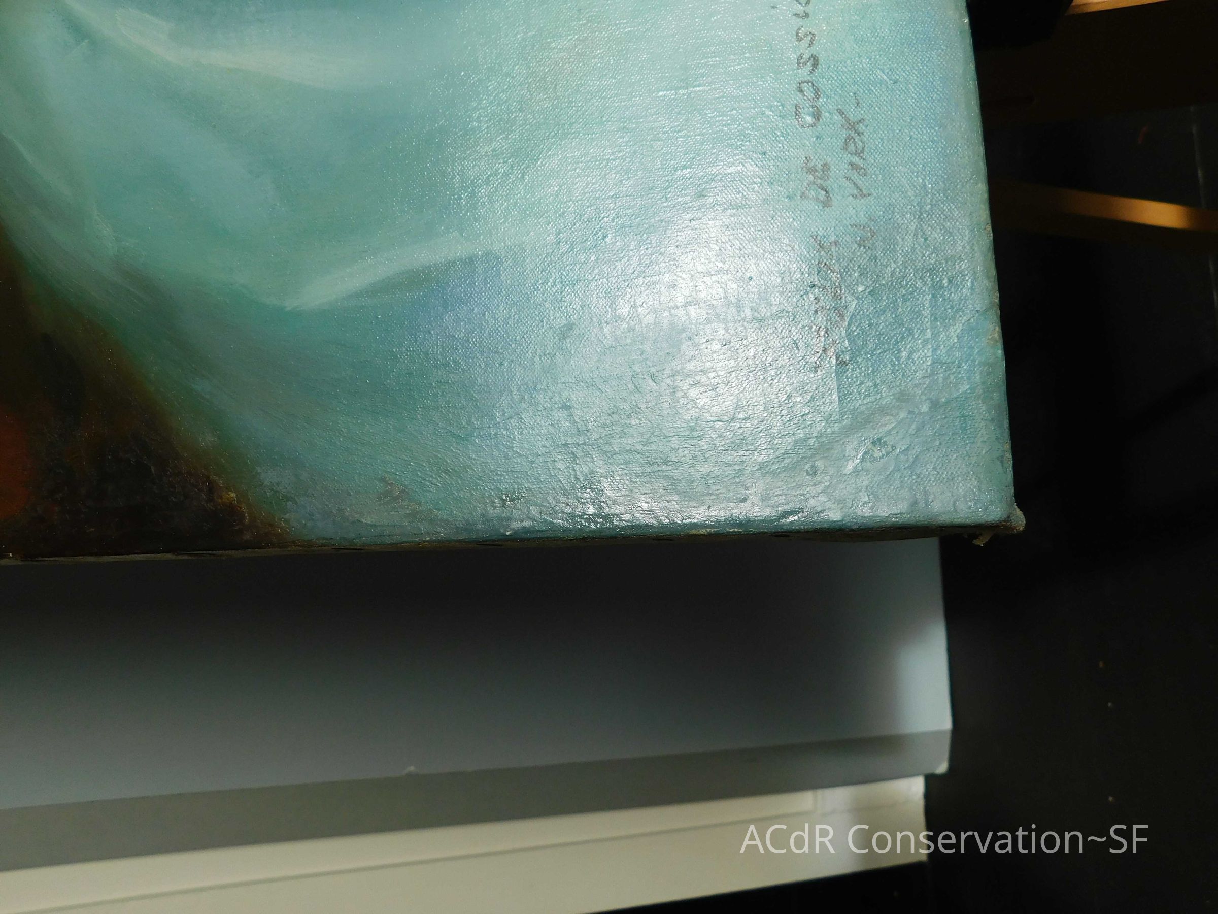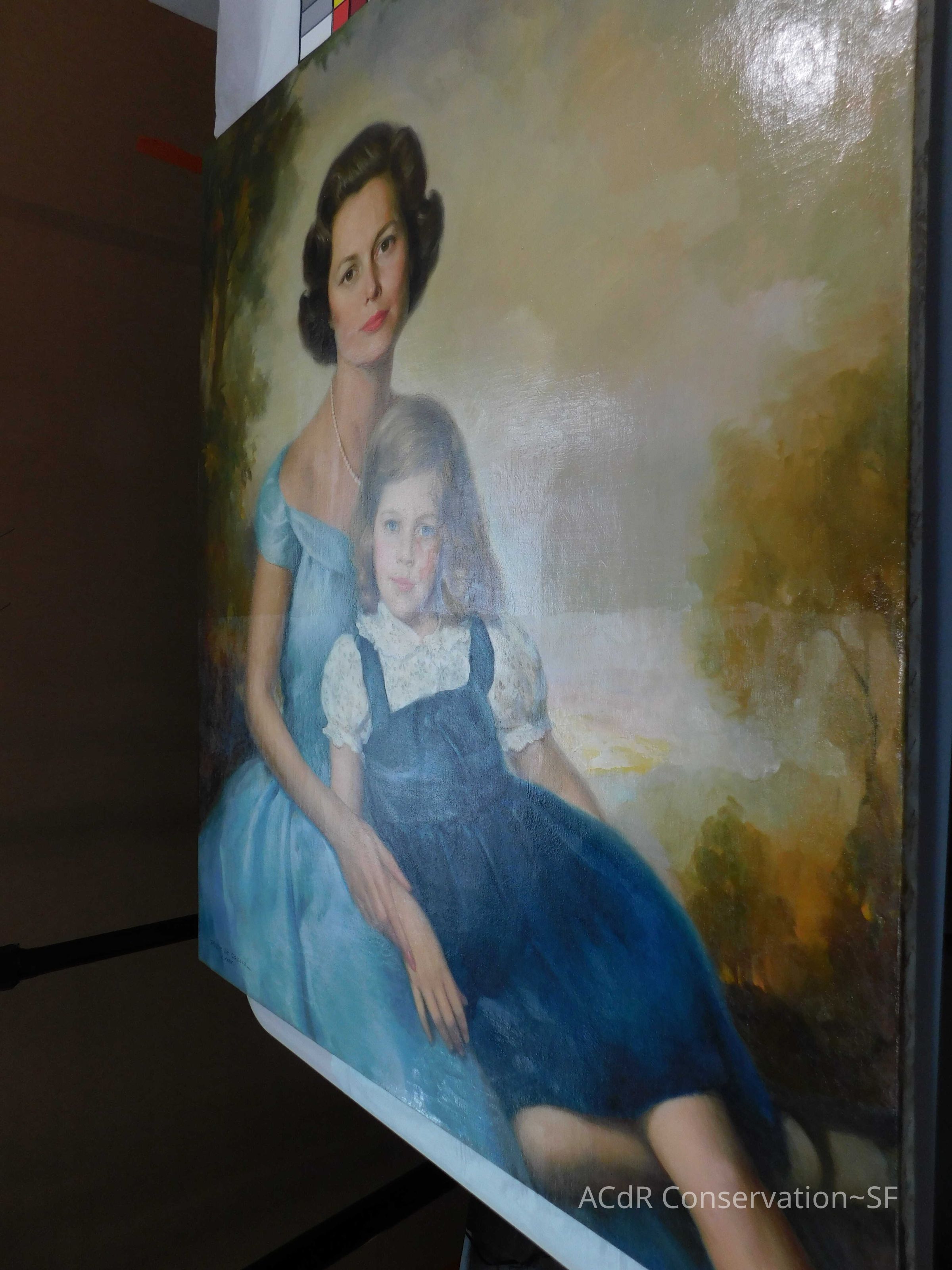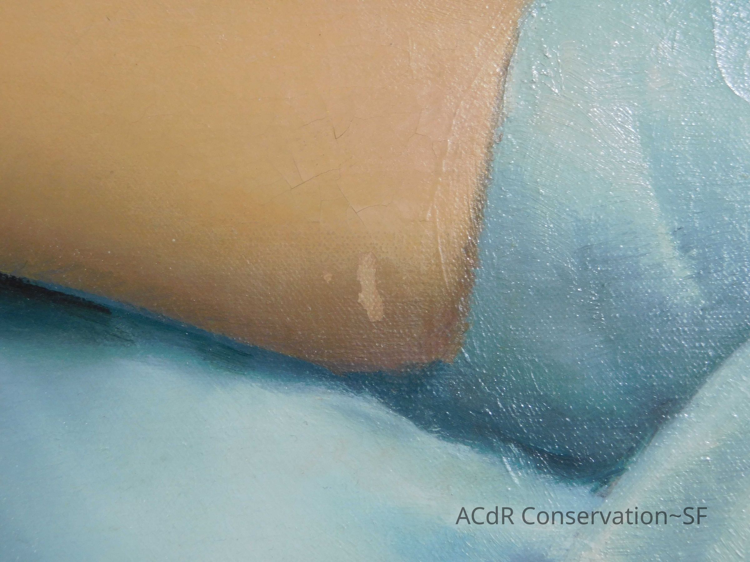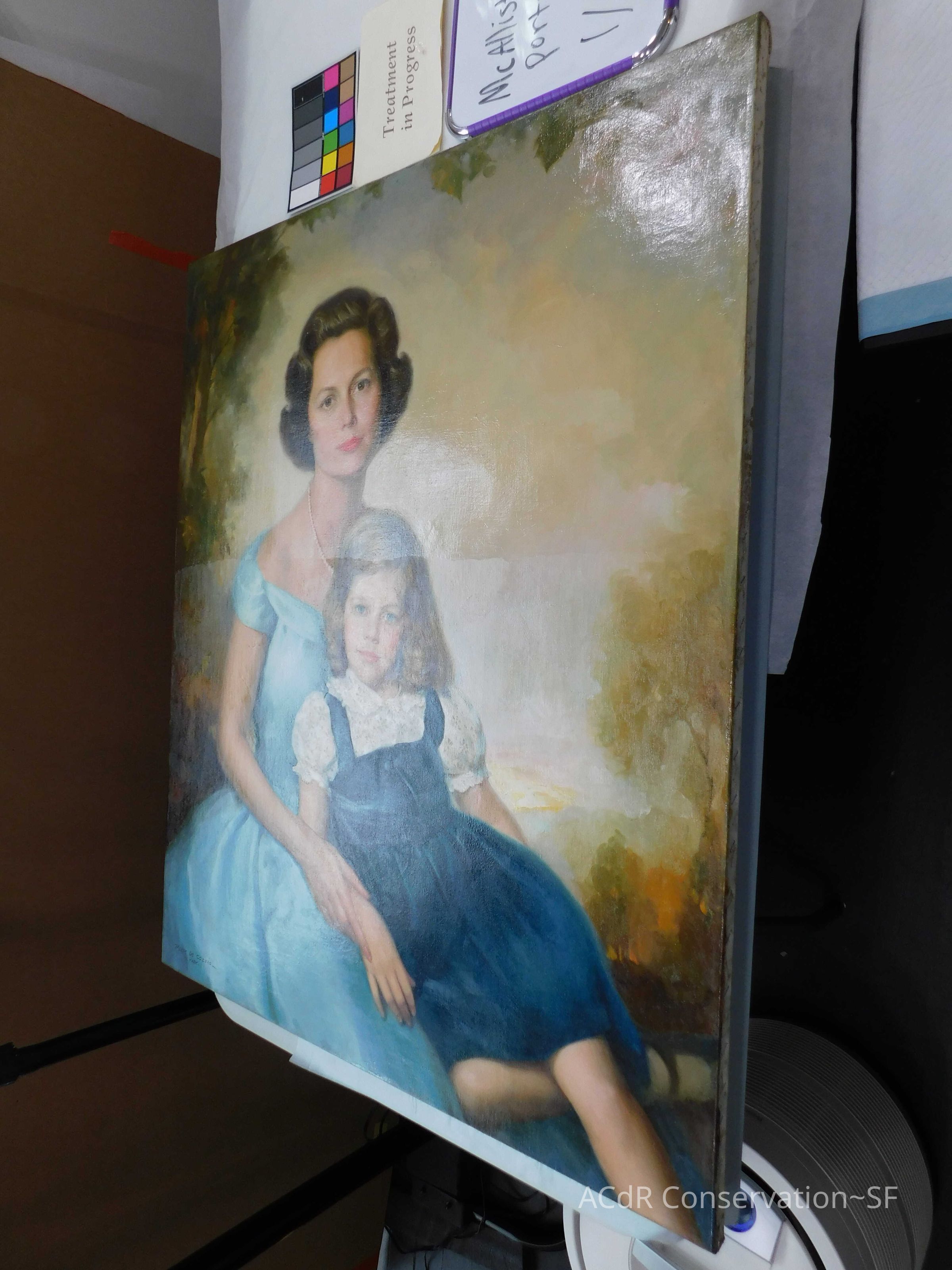 Testing and beginning varnish removal, starting at bottom right corner and moving along bottom edge. Using Naptha, 1/5th of glossy varnish removed. Blue color coming away on swabs confirmed to be due to varnish rather than pigment lifting (did not come up blue on child’s legs). Blue areas still sensitive and susceptible, so being quick in application. Finished varnish removal; reconsolidated cracks in mother’s left arm/child’s right cheek.