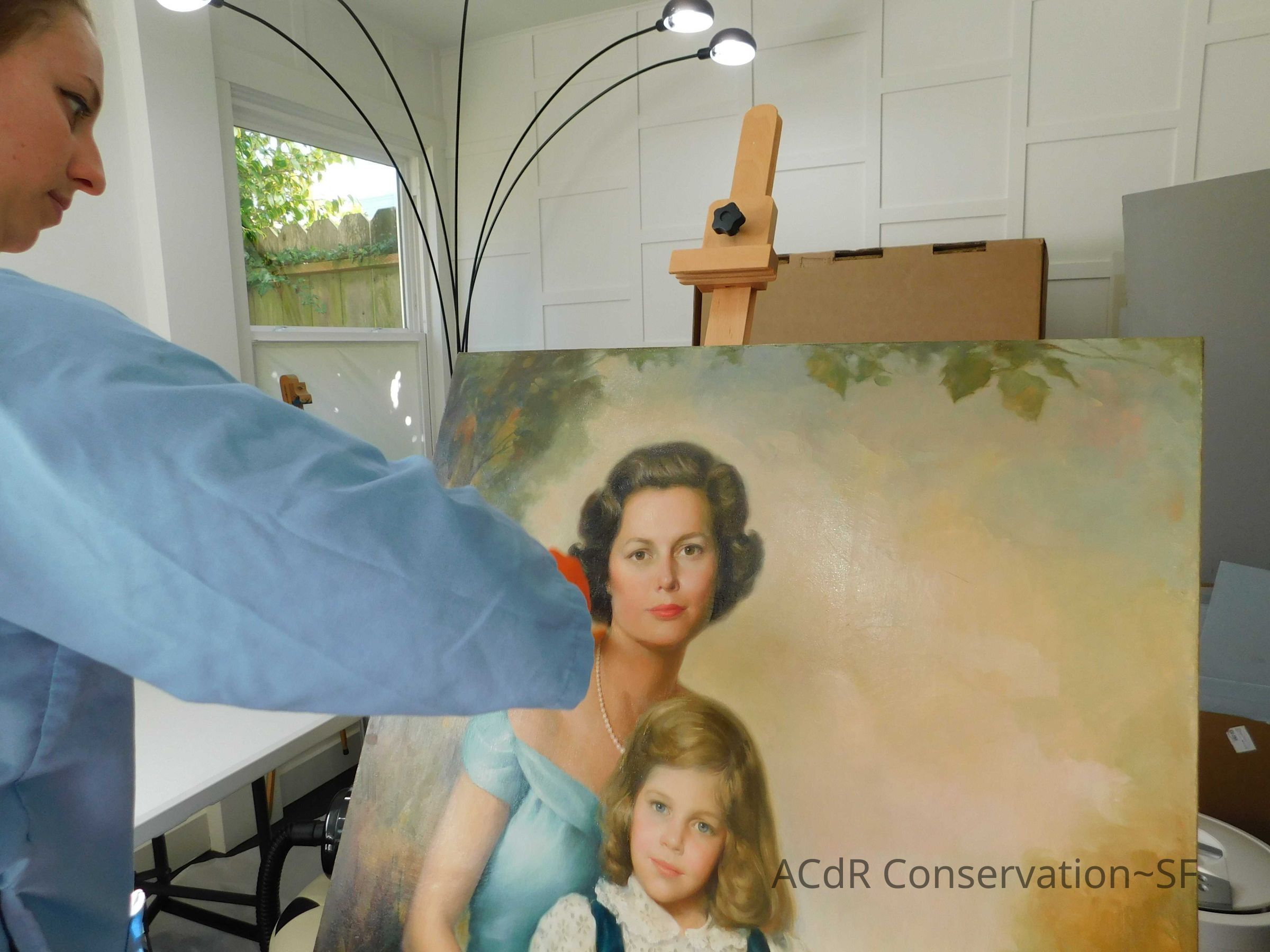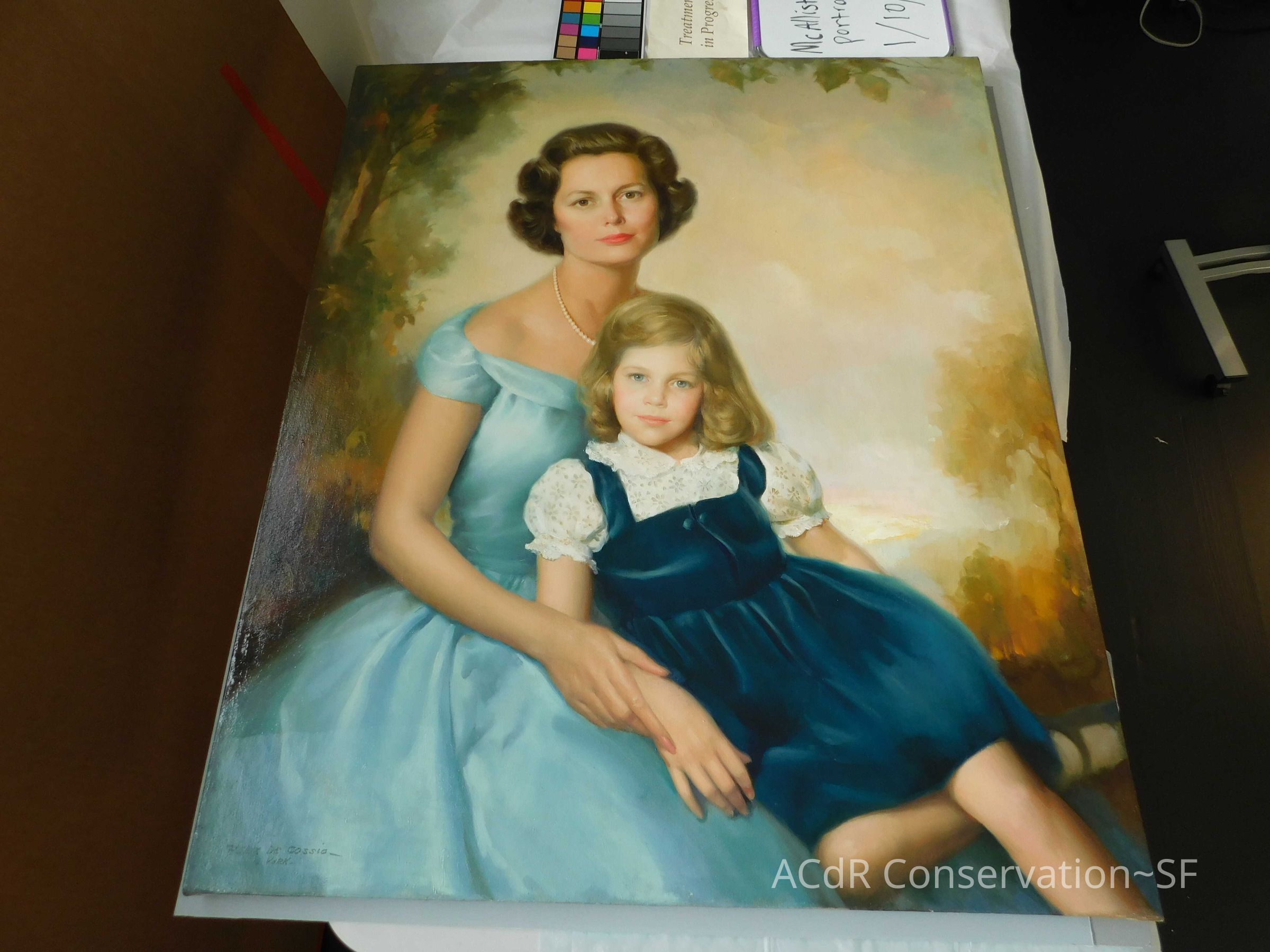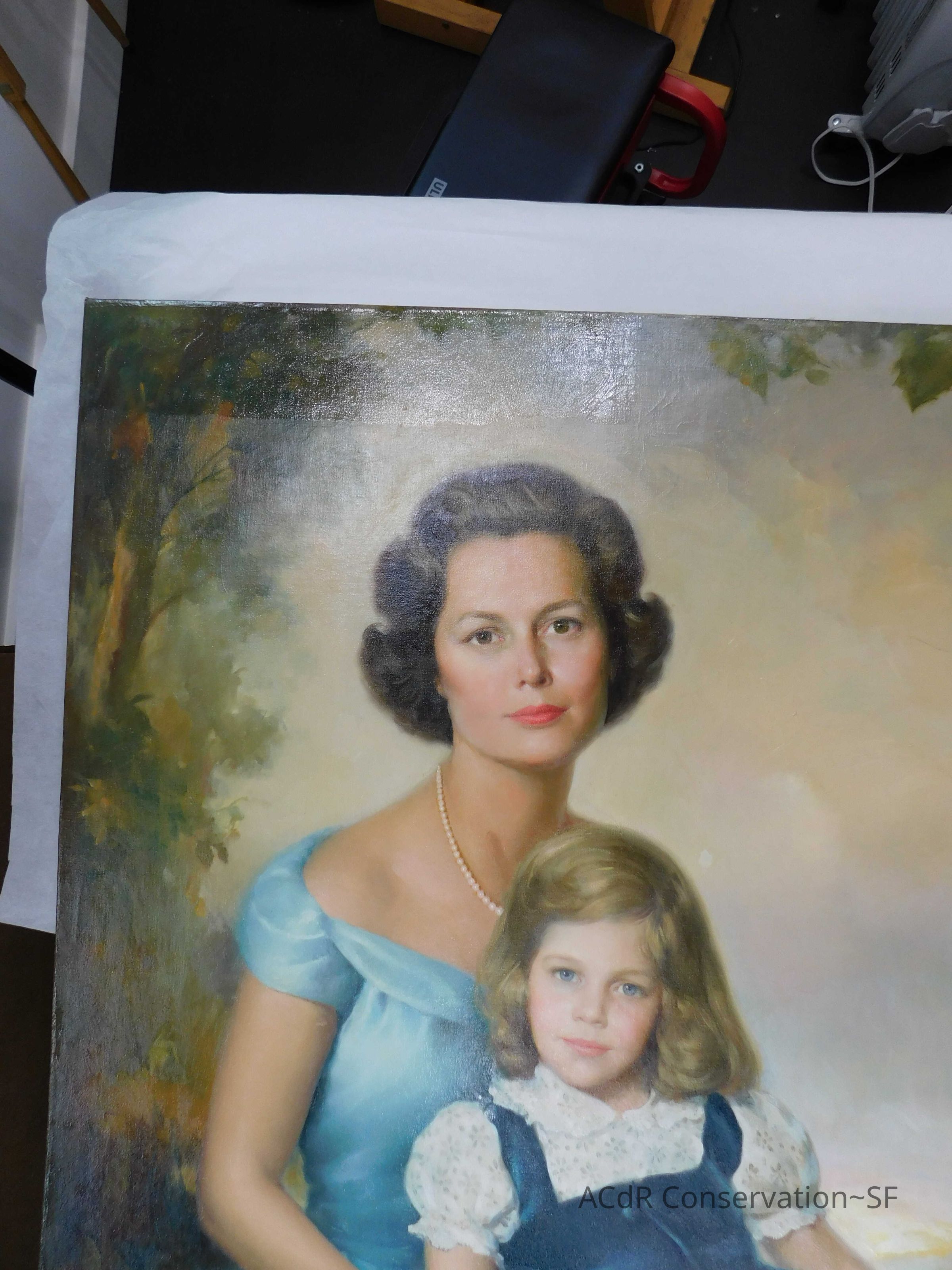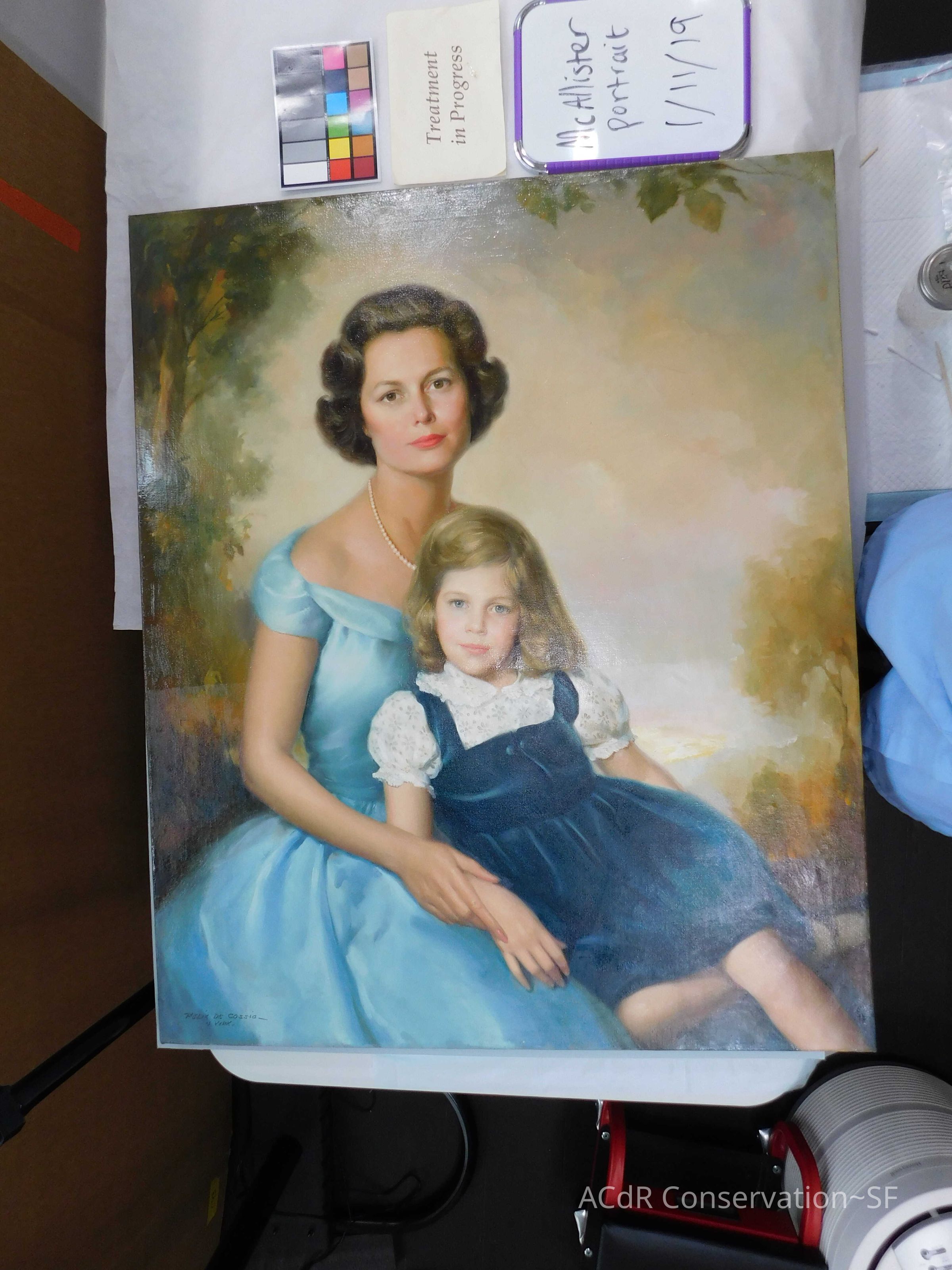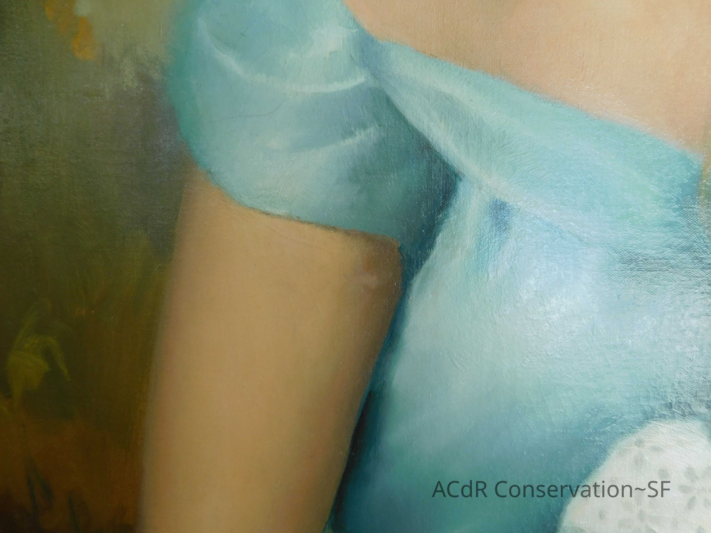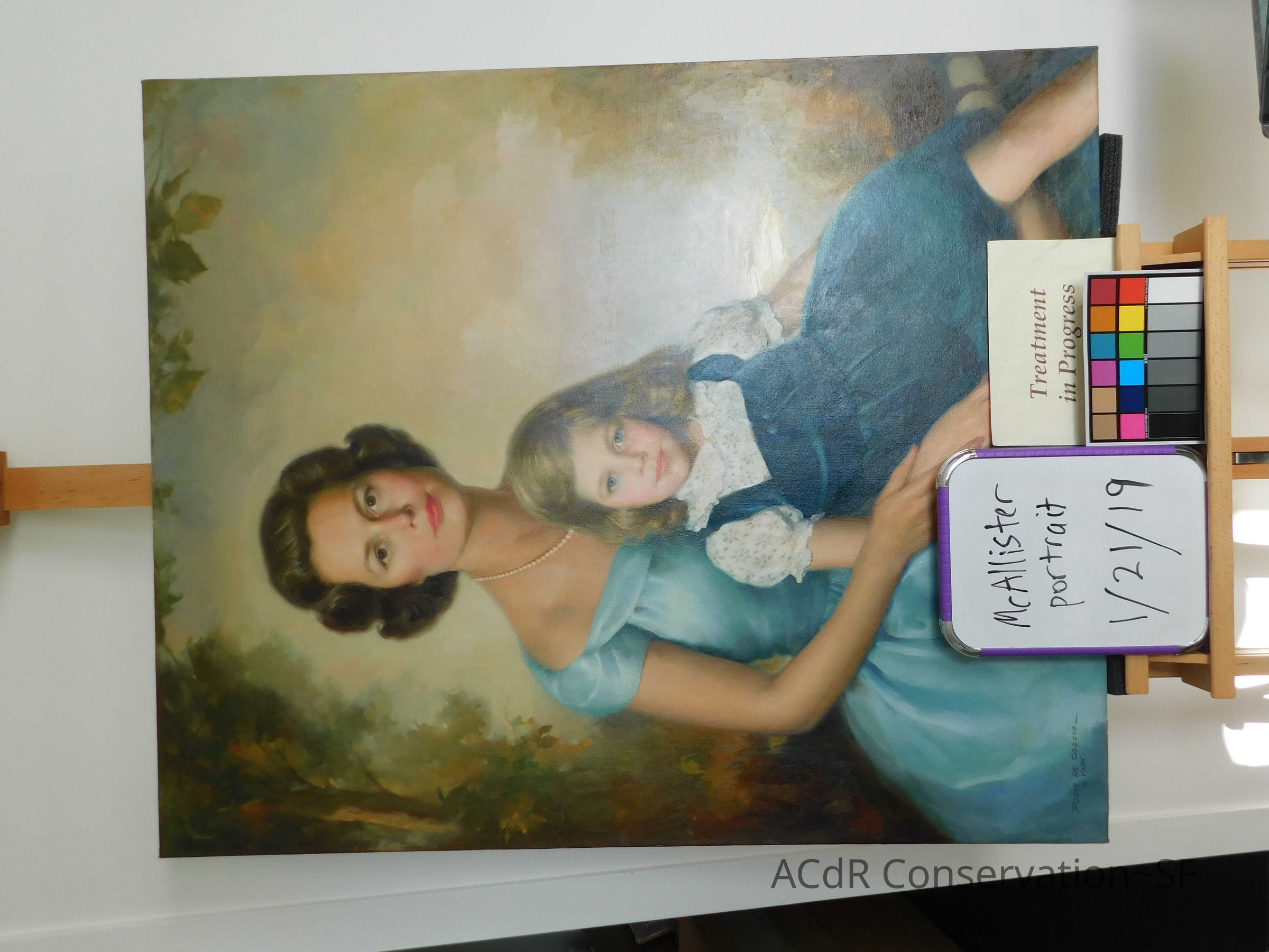 Testing and beginning varnish removal, starting at bottom right corner and moving along bottom edge. Using Naptha, 1/5th of glossy varnish removed. Blue color coming away on swabs confirmed to be due to varnish rather than pigment lifting (did not come up blue on child’s legs). Blue areas still sensitive and susceptible, so being quick in application. Finished varnish removal; reconsolidated cracks in mother’s left arm/child’s right cheek.