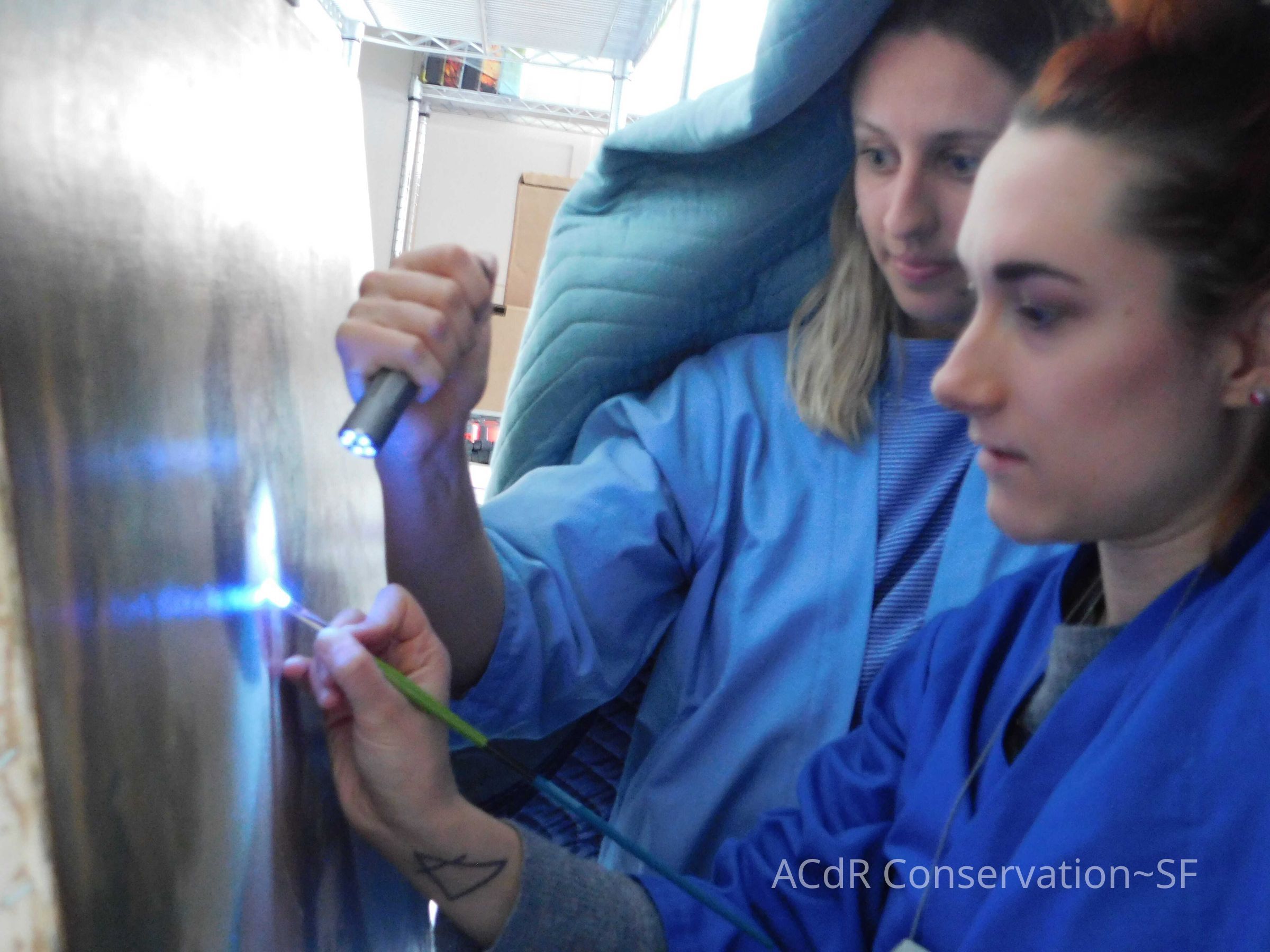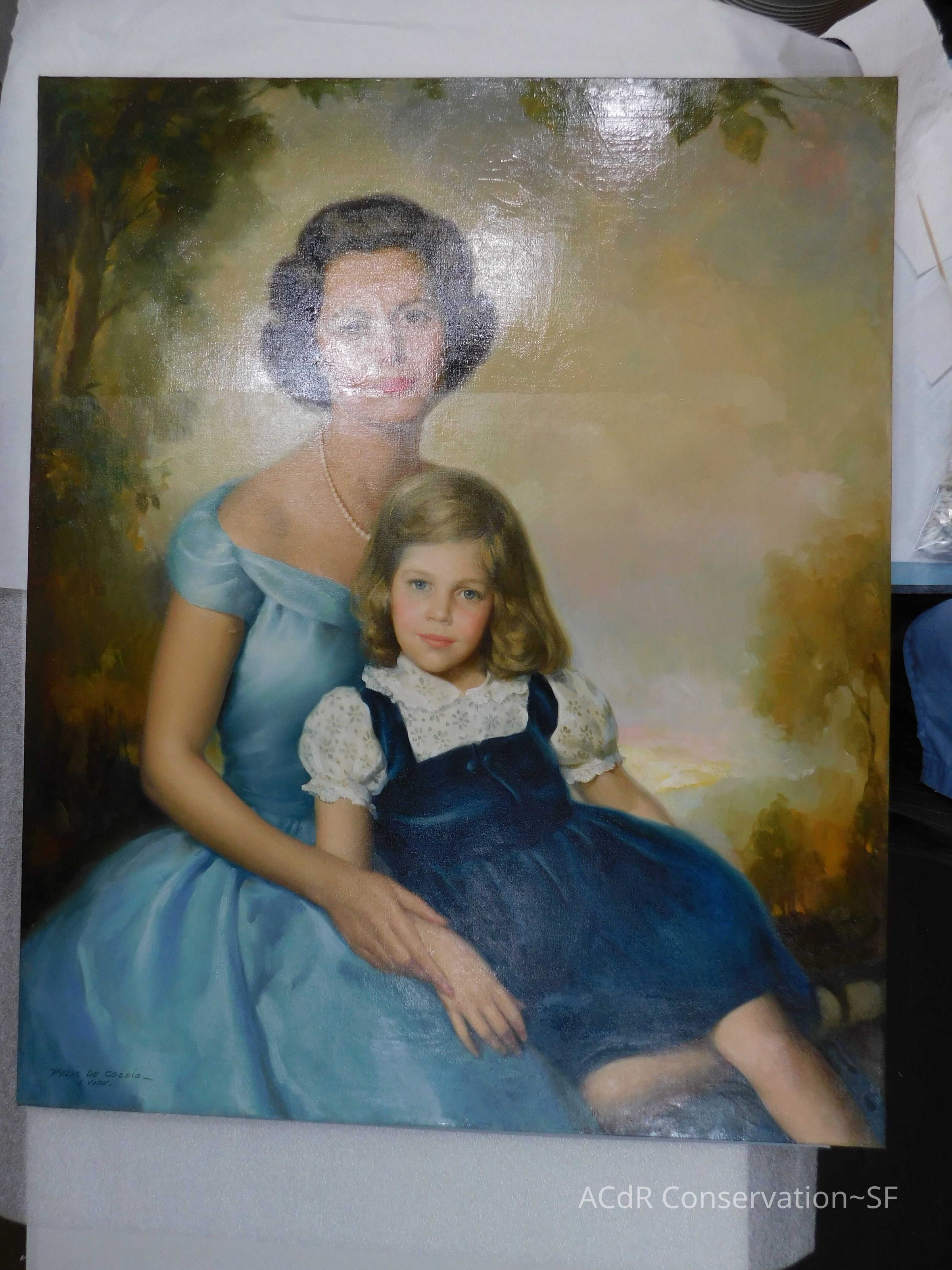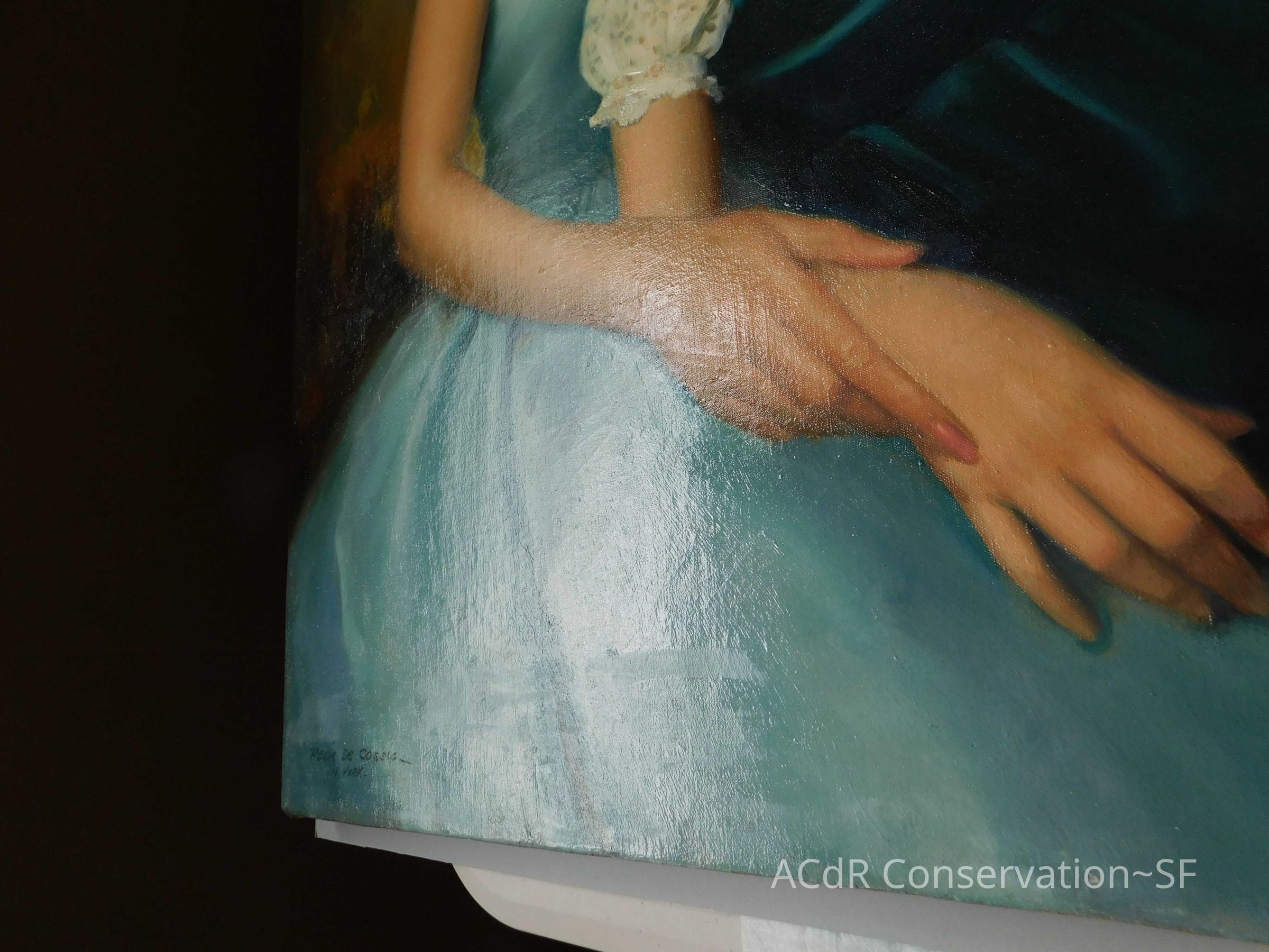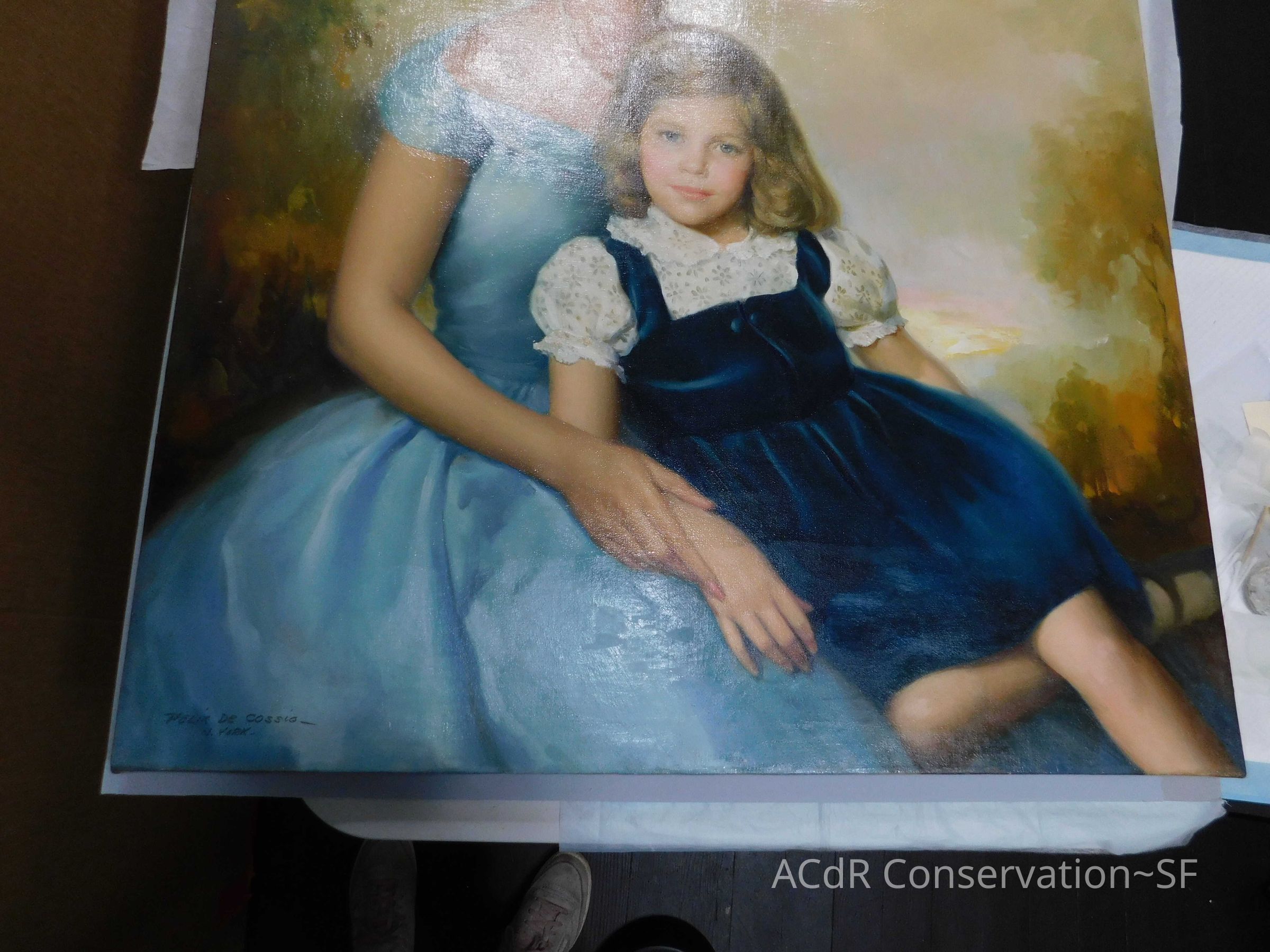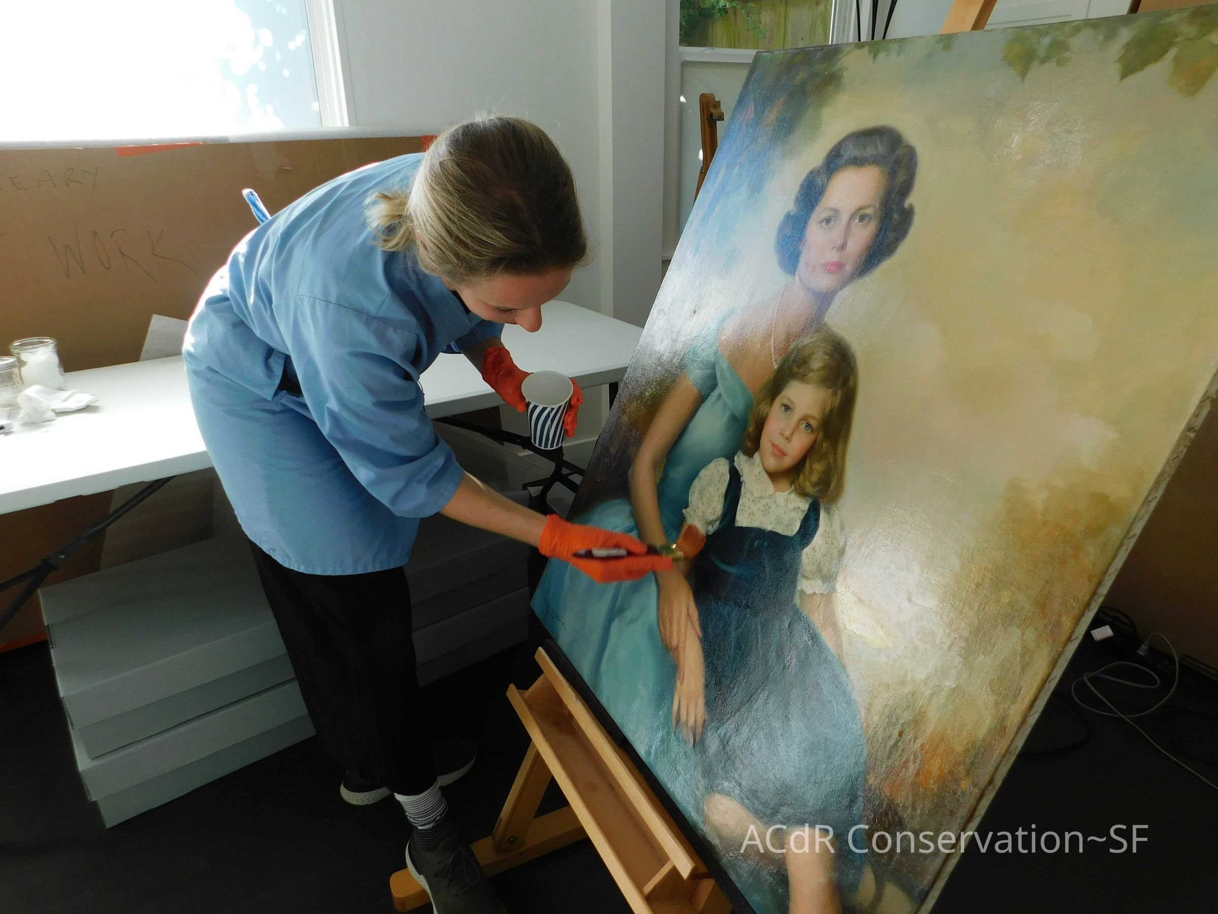 Testing and beginning varnish removal, starting at bottom right corner and moving along bottom edge. Using Naptha, 1/5th of glossy varnish removed. Blue color coming away on swabs confirmed to be due to varnish rather than pigment lifting (did not come up blue on child’s legs). Blue areas still sensitive and susceptible, so being quick in application. Finished varnish removal; reconsolidated cracks in mother’s left arm/child’s right cheek.