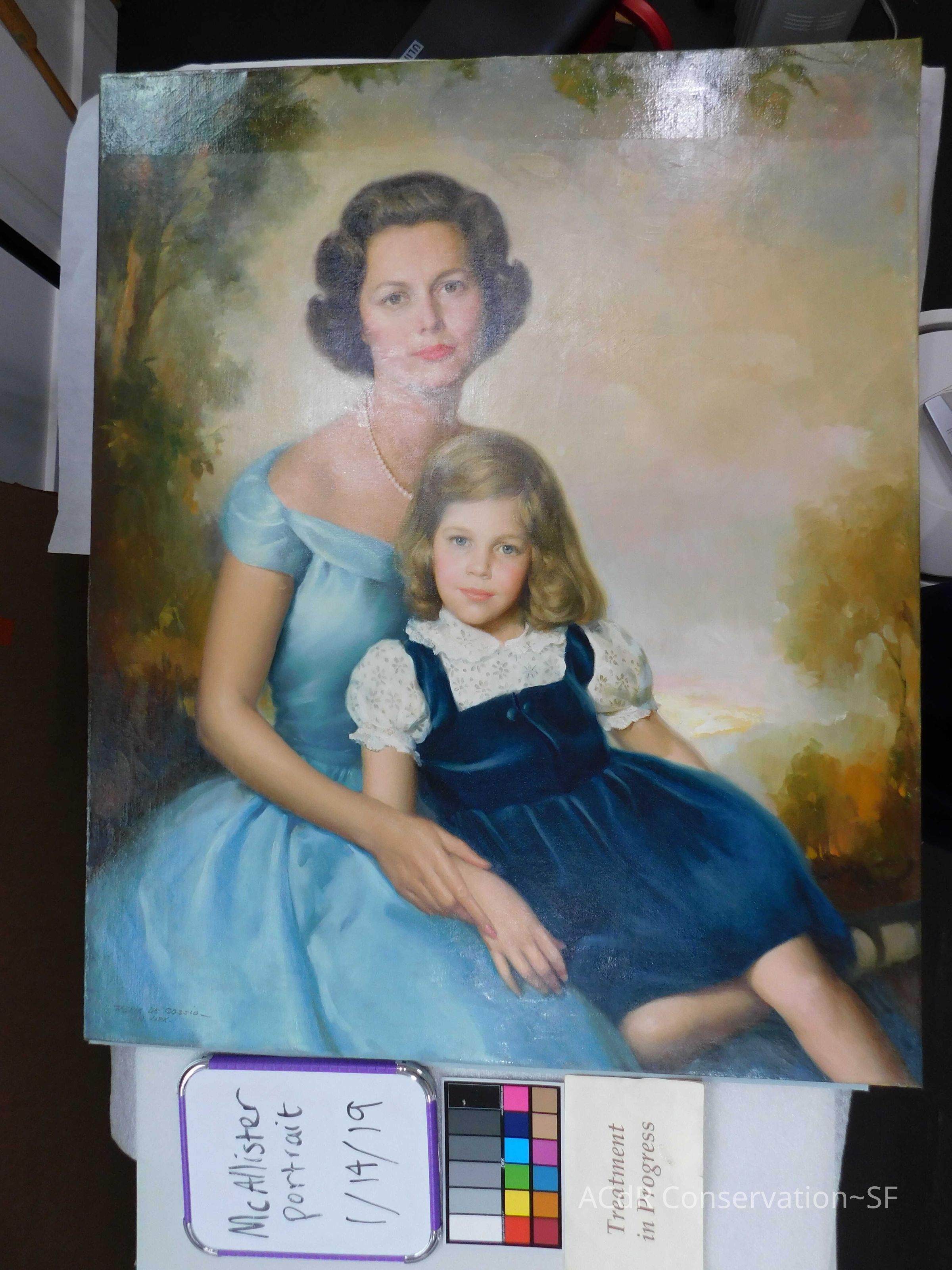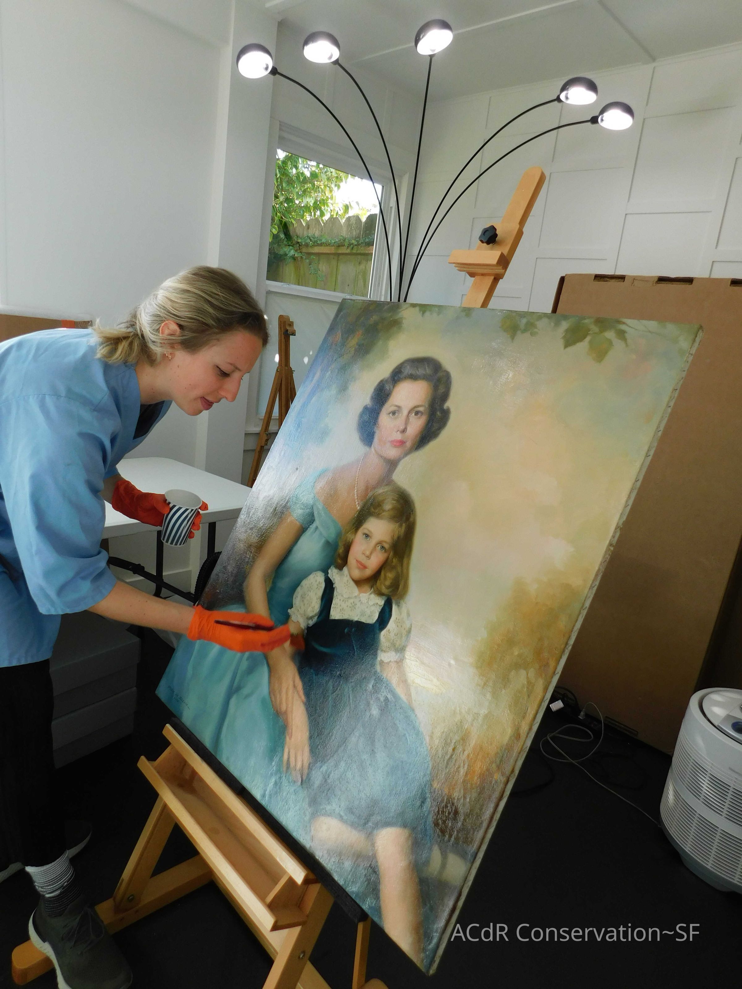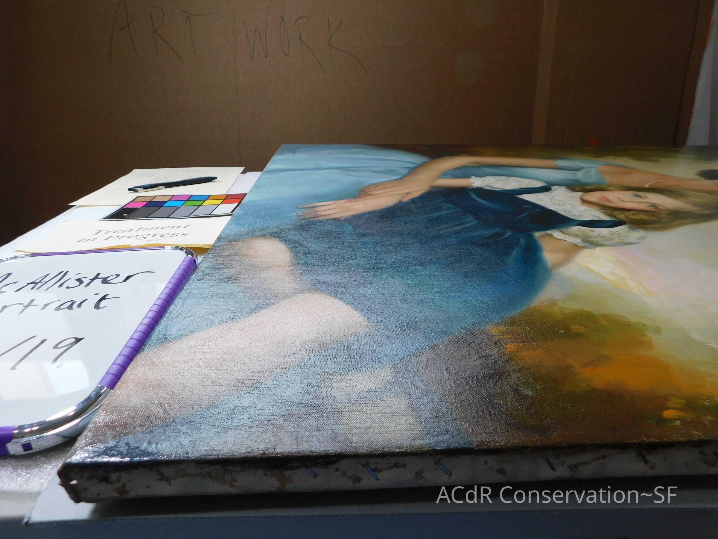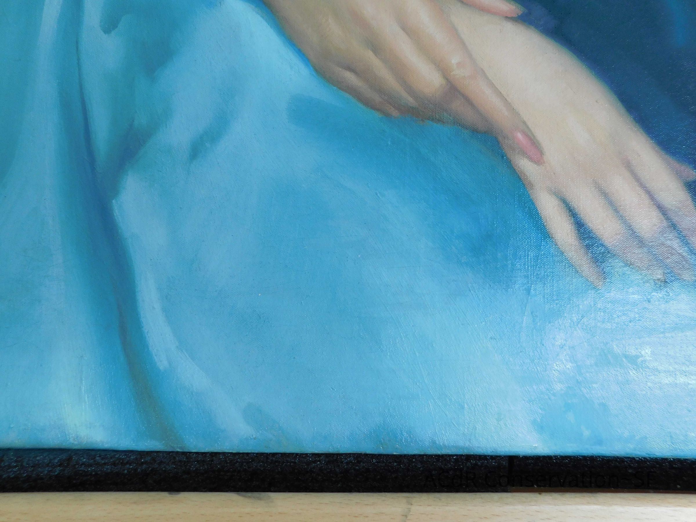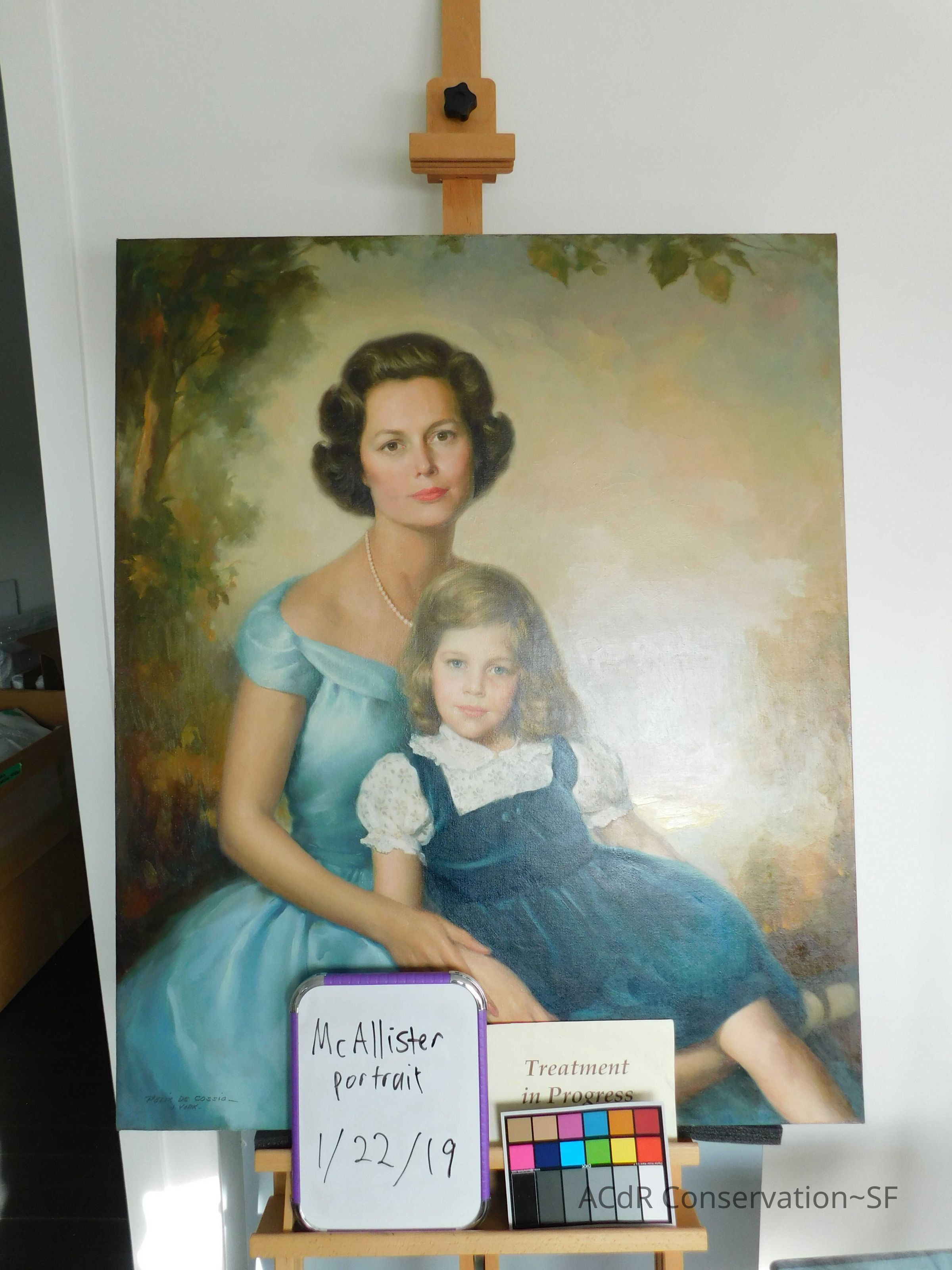 Testing and beginning varnish removal, starting at bottom right corner and moving along bottom edge. Using Naptha, 1/5th of glossy varnish removed. Blue color coming away on swabs confirmed to be due to varnish rather than pigment lifting (did not come up blue on child’s legs). Blue areas still sensitive and susceptible, so being quick in application. Finished varnish removal; reconsolidated cracks in mother’s left arm/child’s right cheek.