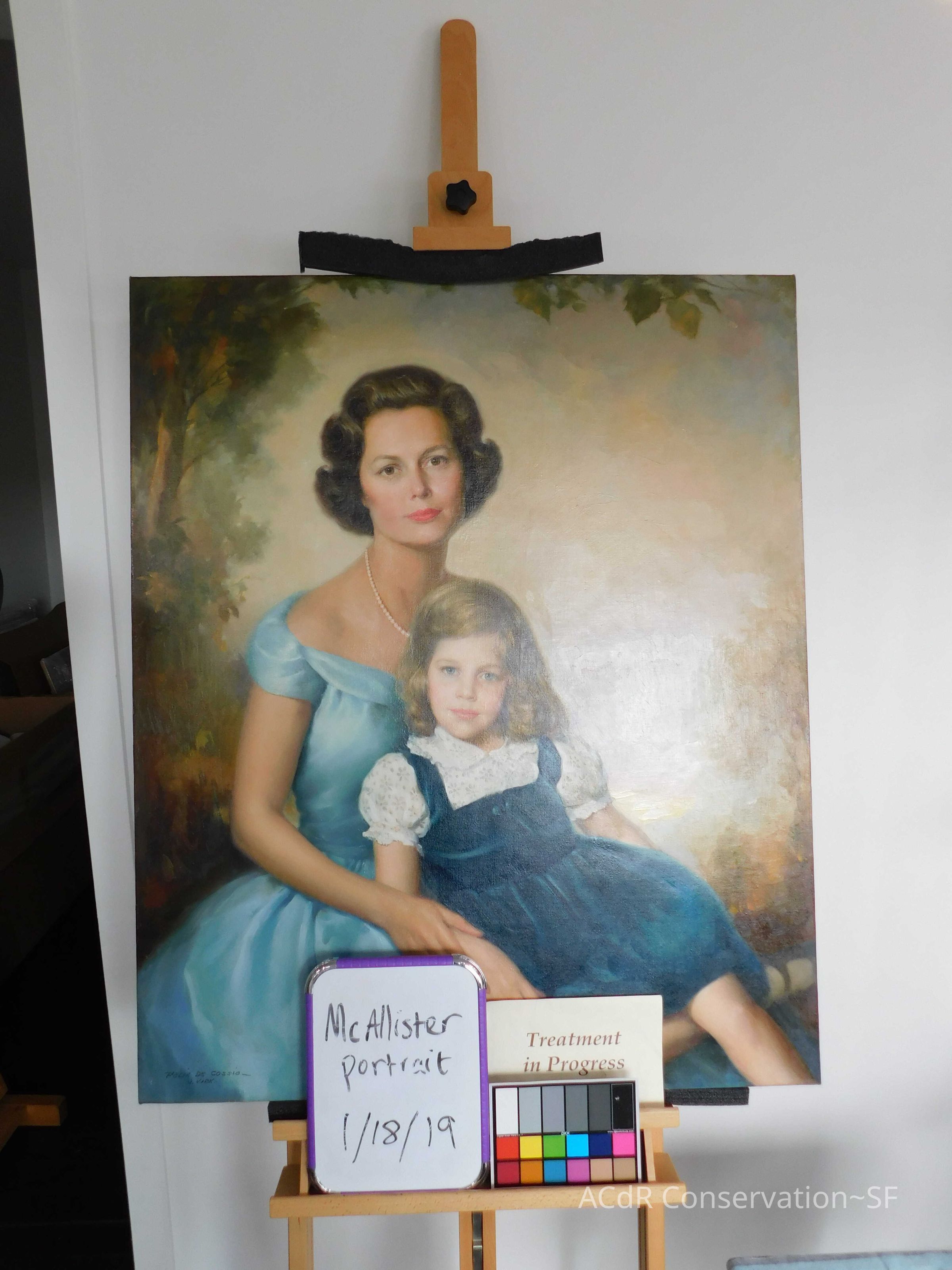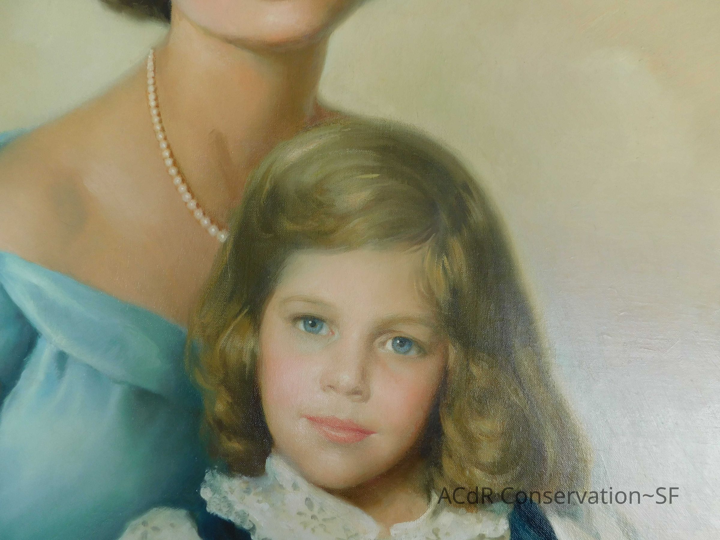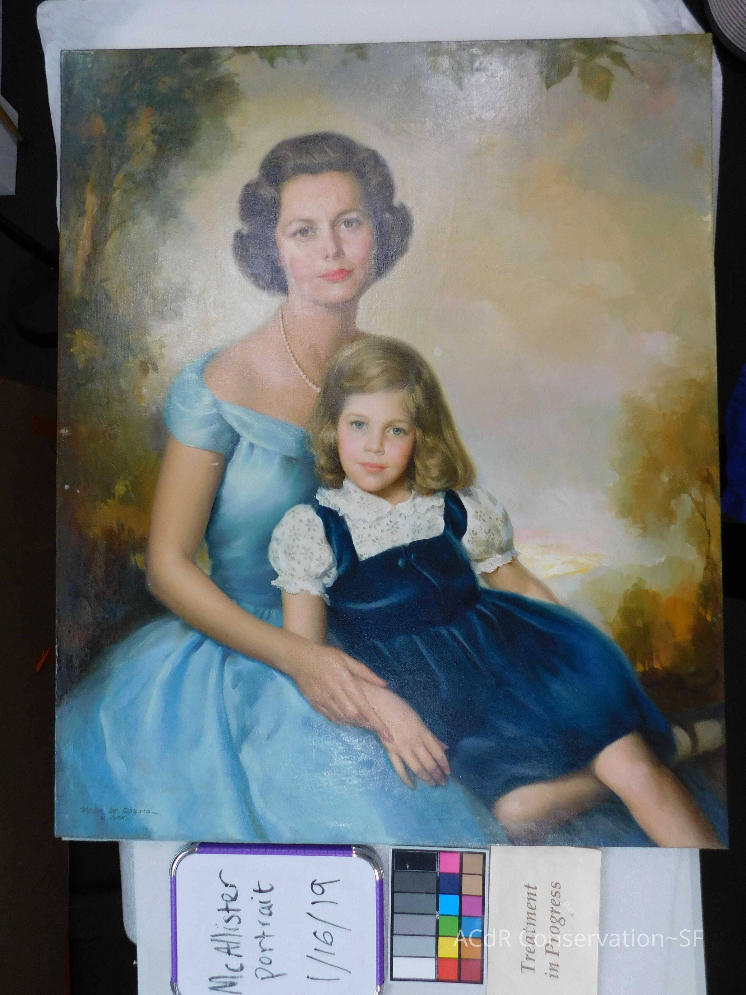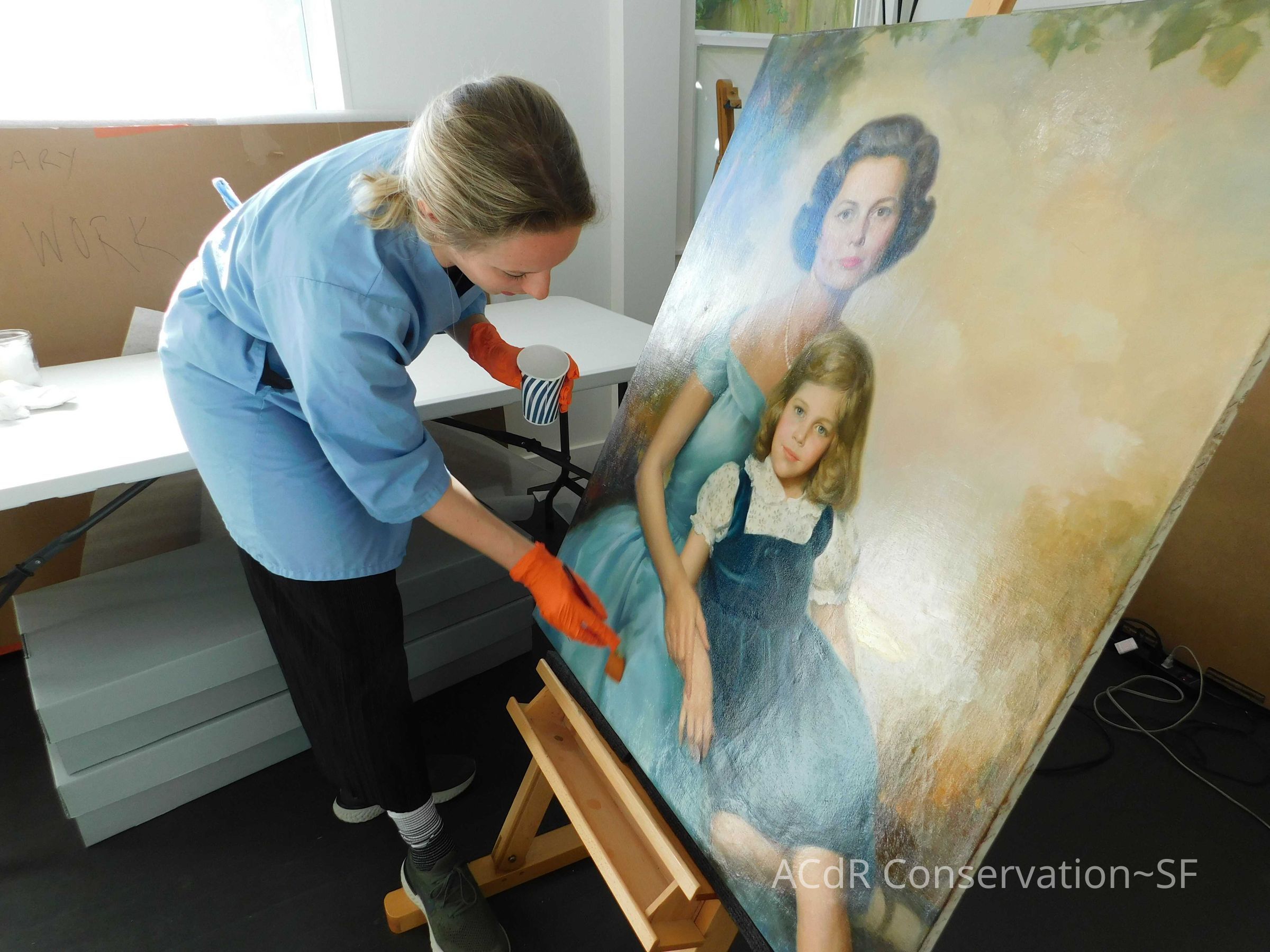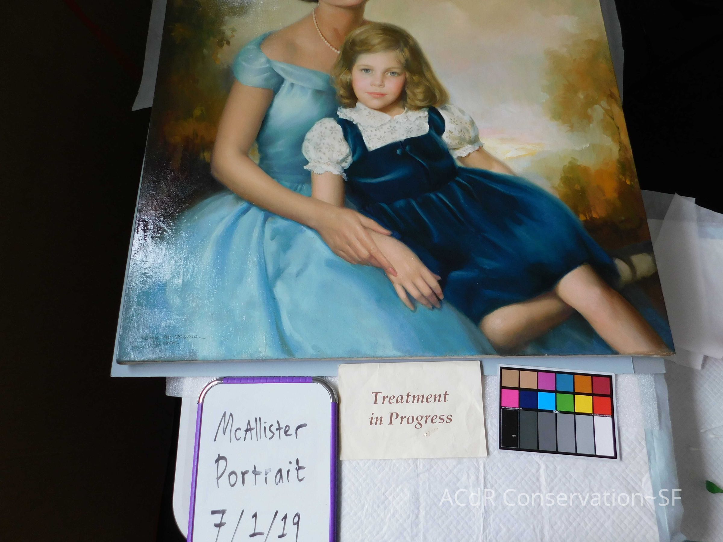 Testing and beginning varnish removal, starting at bottom right corner and moving along bottom edge. Using Naptha, 1/5th of glossy varnish removed. Blue color coming away on swabs confirmed to be due to varnish rather than pigment lifting (did not come up blue on child’s legs). Blue areas still sensitive and susceptible, so being quick in application. Finished varnish removal; reconsolidated cracks in mother’s left arm/child’s right cheek.