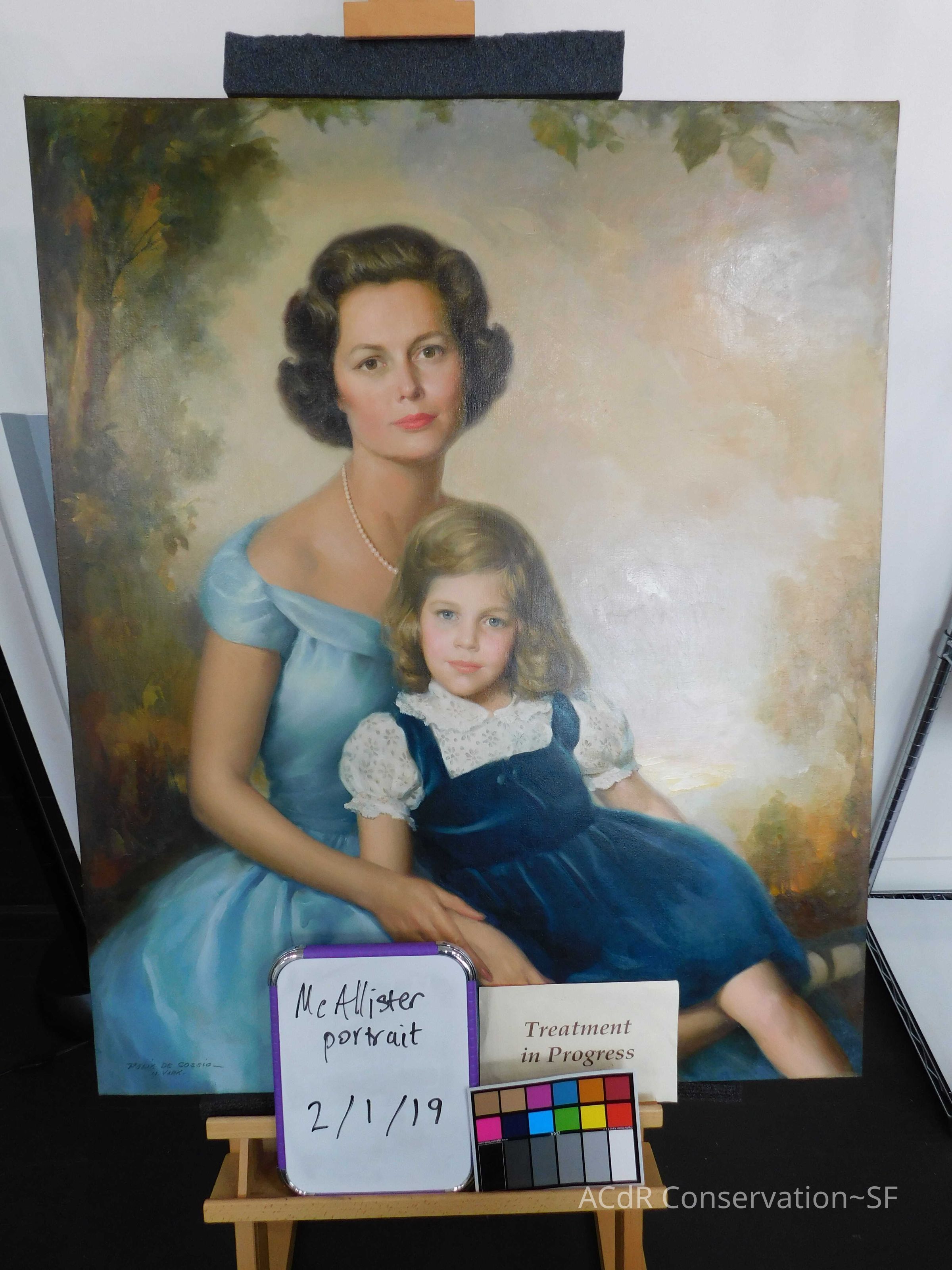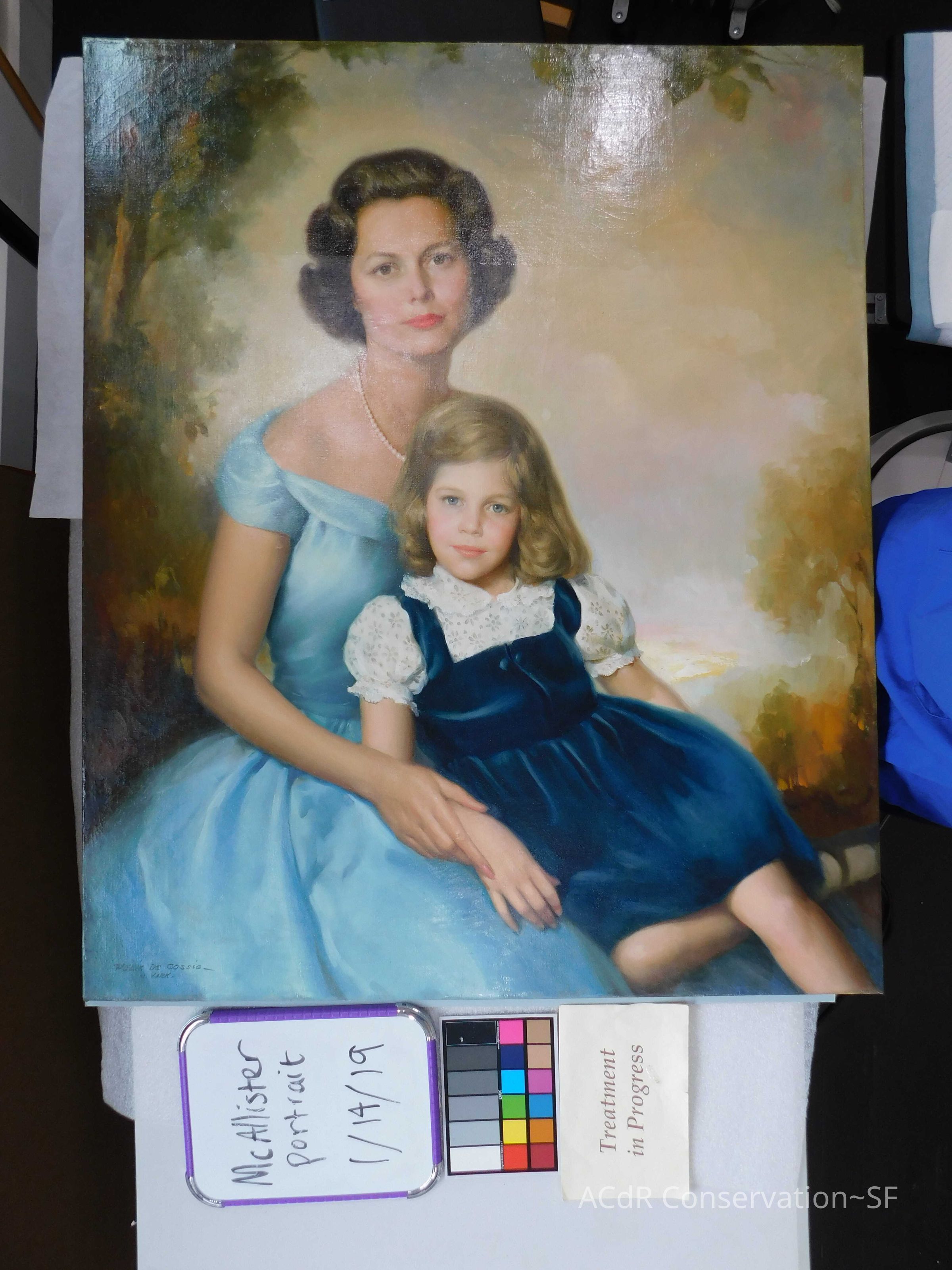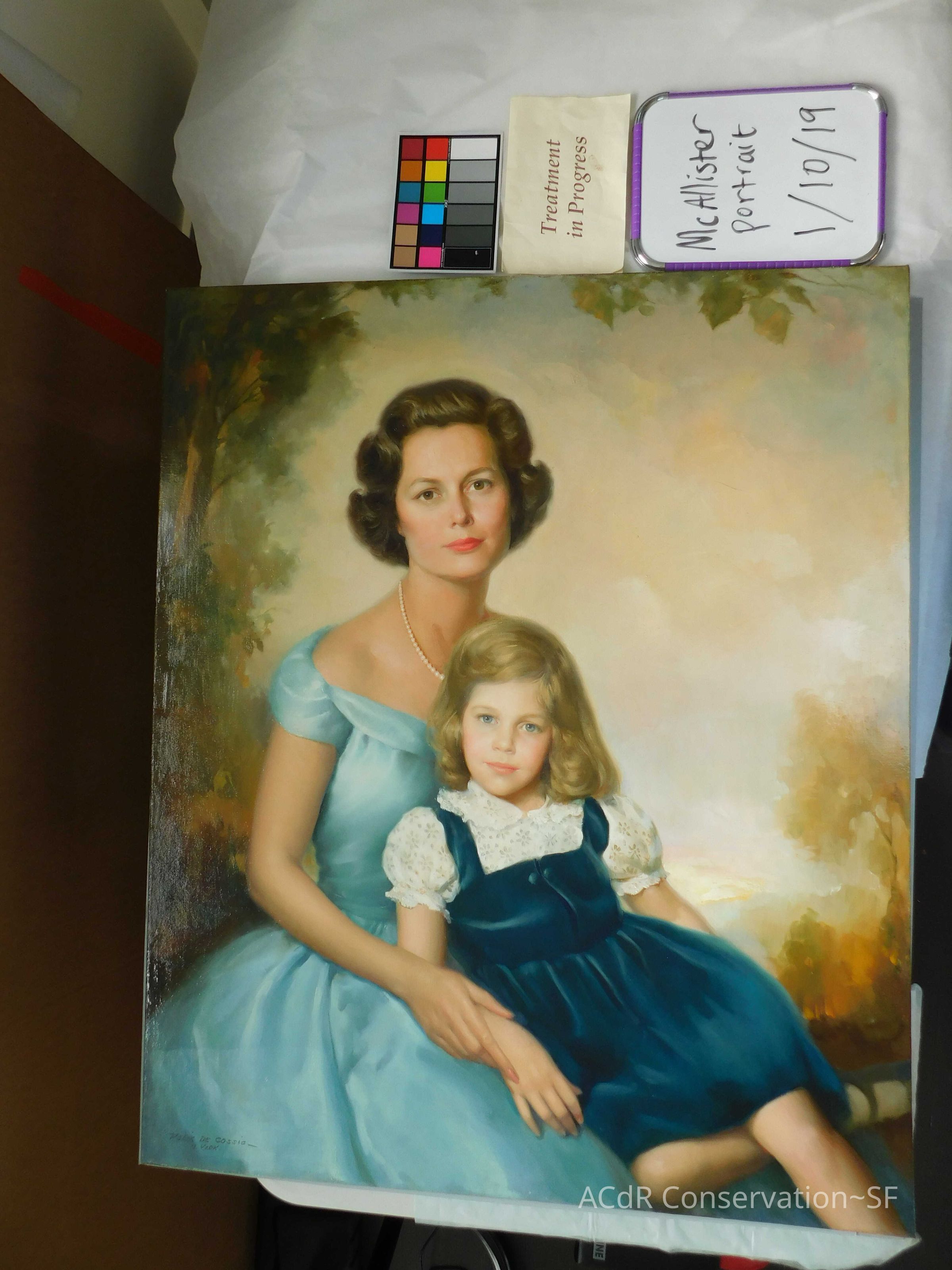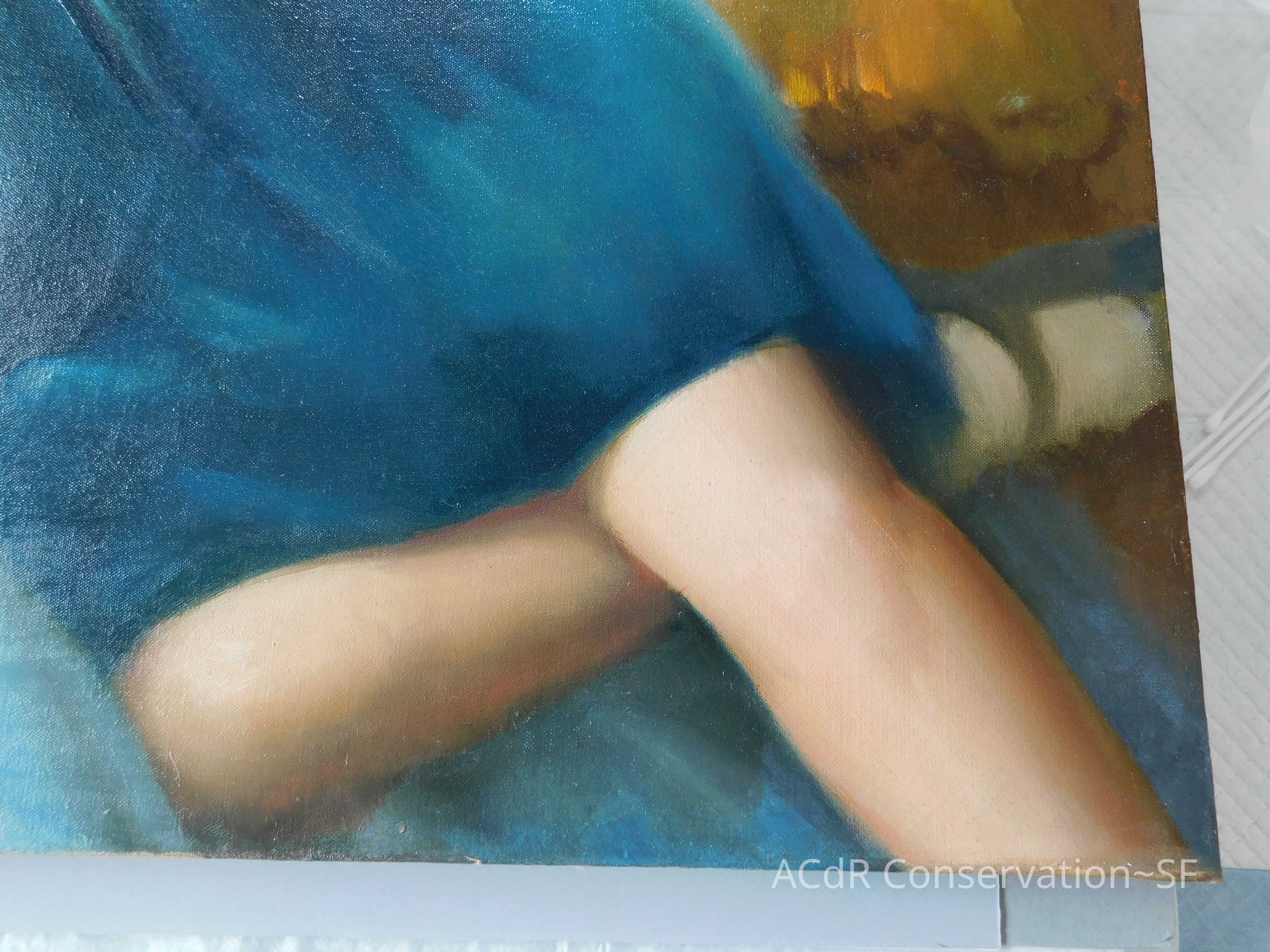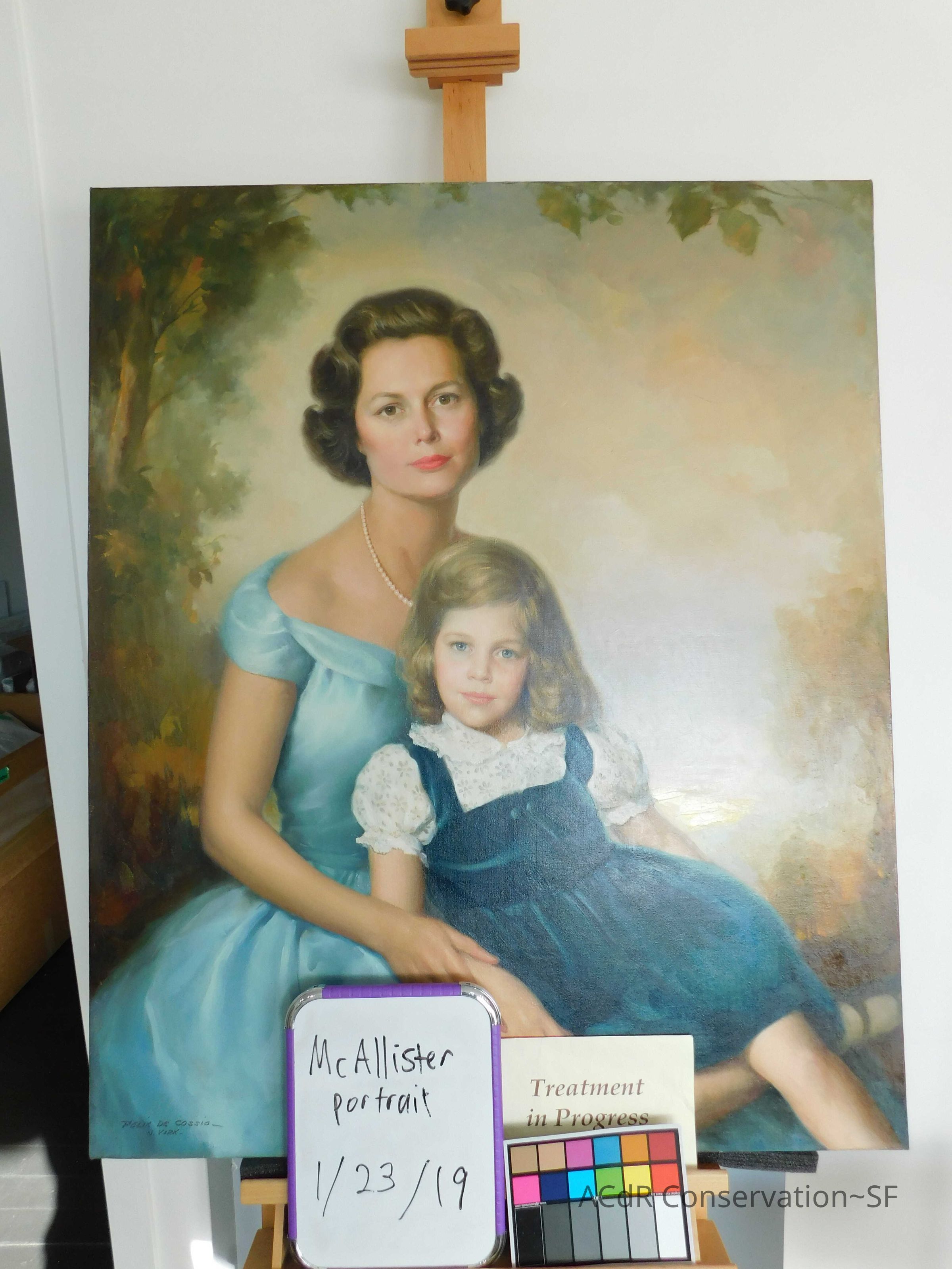 Testing and beginning varnish removal, starting at bottom right corner and moving along bottom edge. Using Naptha, 1/5th of glossy varnish removed. Blue color coming away on swabs confirmed to be due to varnish rather than pigment lifting (did not come up blue on child’s legs). Blue areas still sensitive and susceptible, so being quick in application. Finished varnish removal; reconsolidated cracks in mother’s left arm/child’s right cheek.