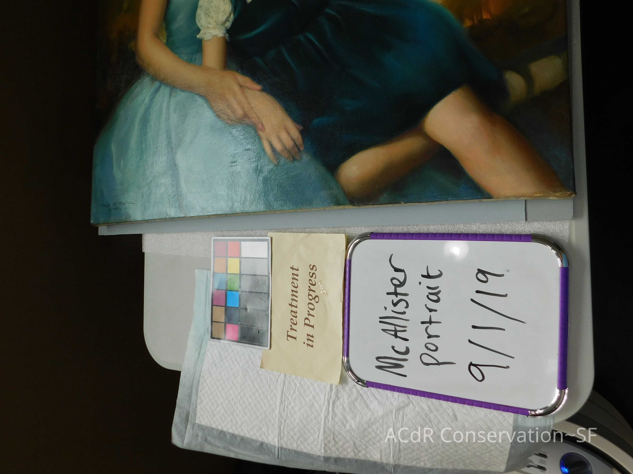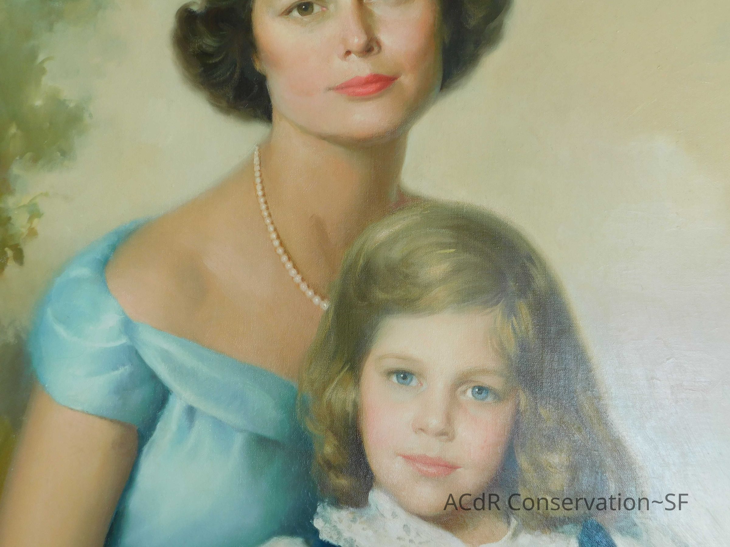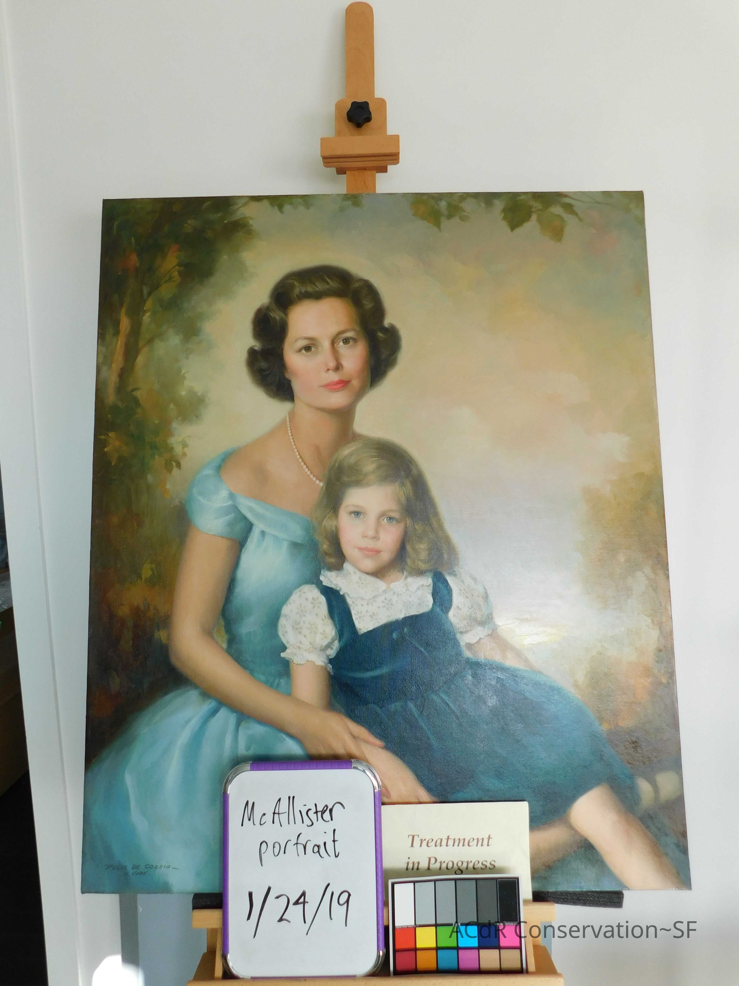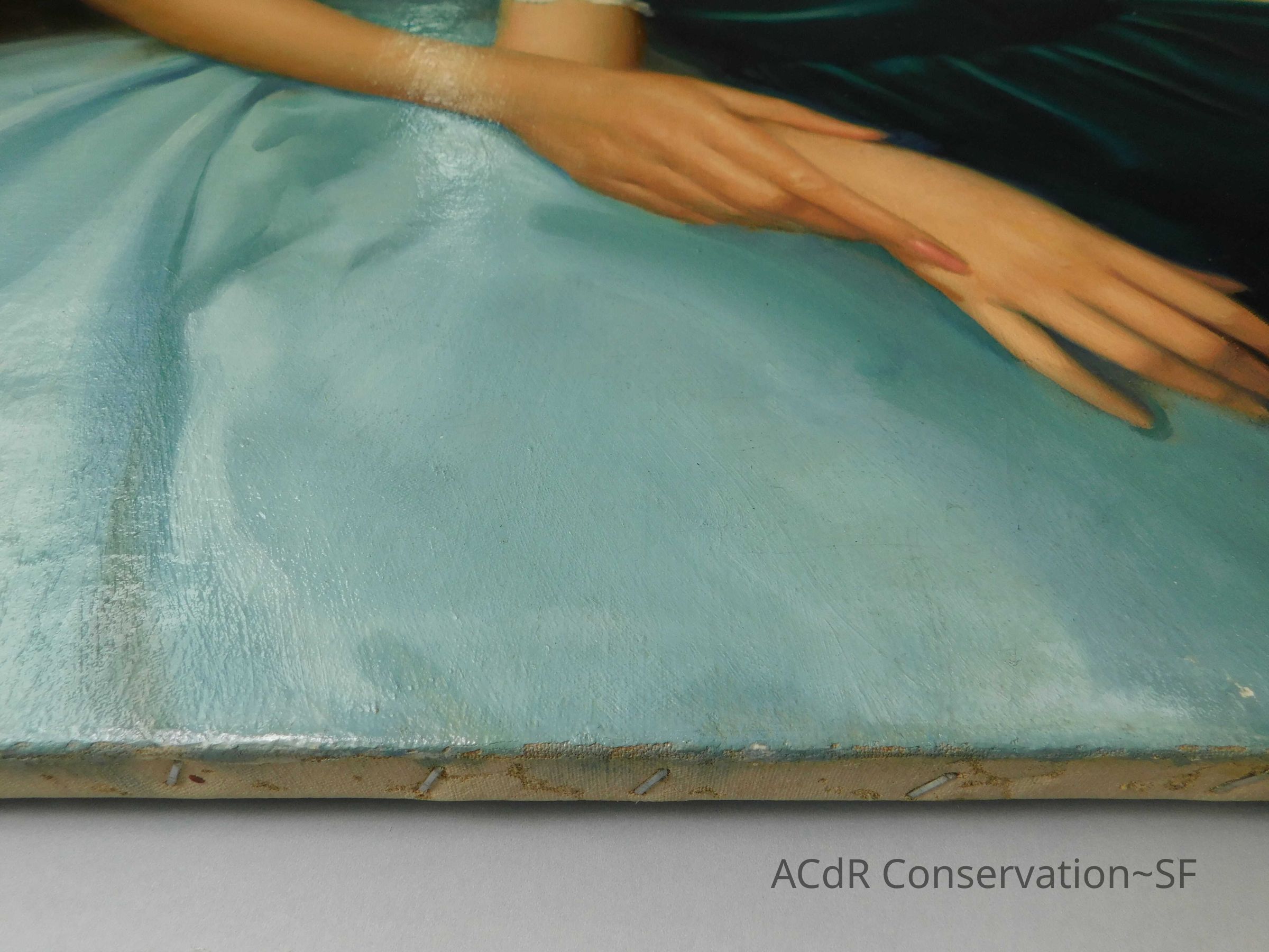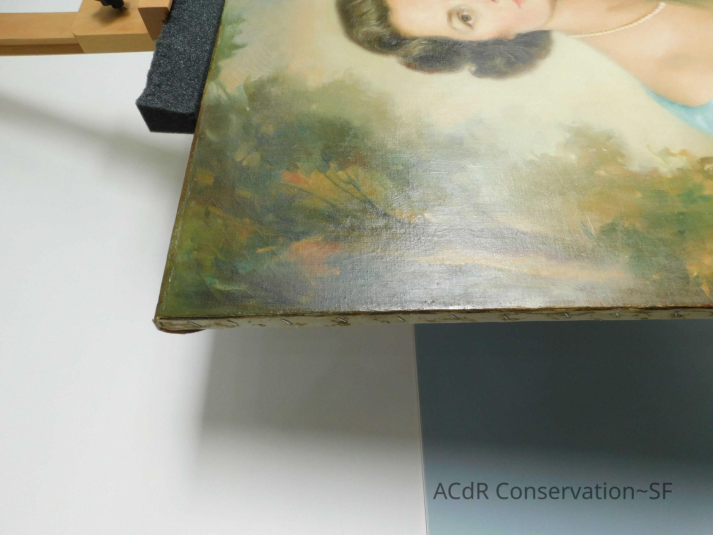 Testing and beginning varnish removal, starting at bottom right corner and moving along bottom edge. Using Naptha, 1/5th of glossy varnish removed. Blue color coming away on swabs confirmed to be due to varnish rather than pigment lifting (did not come up blue on child’s legs). Blue areas still sensitive and susceptible, so being quick in application. Finished varnish removal; reconsolidated cracks in mother’s left arm/child’s right cheek.