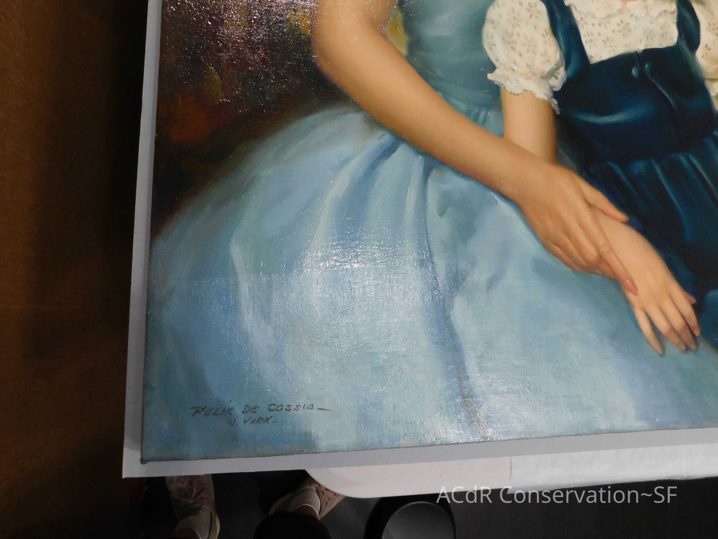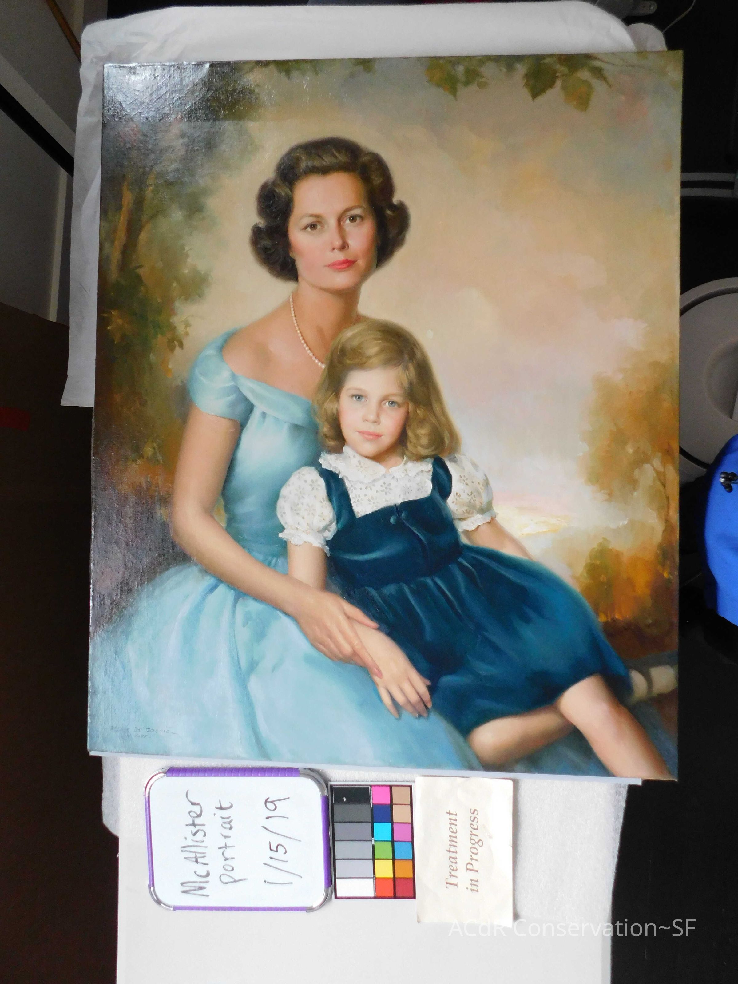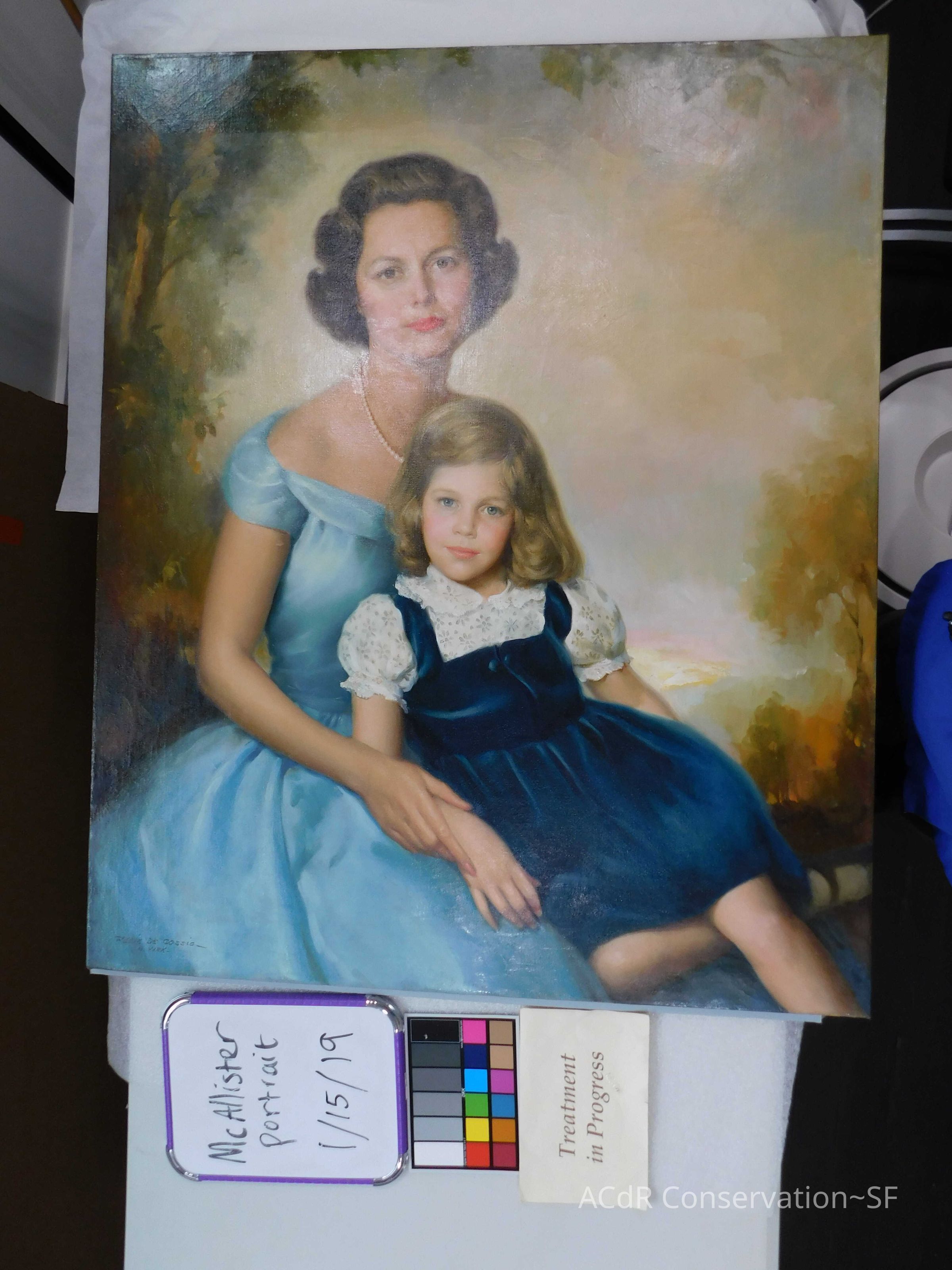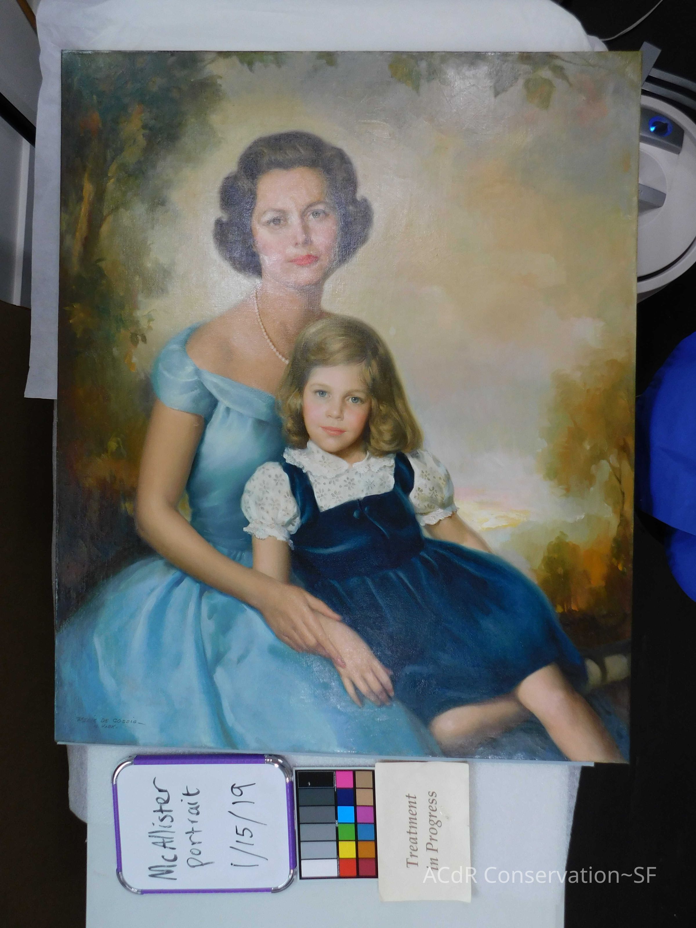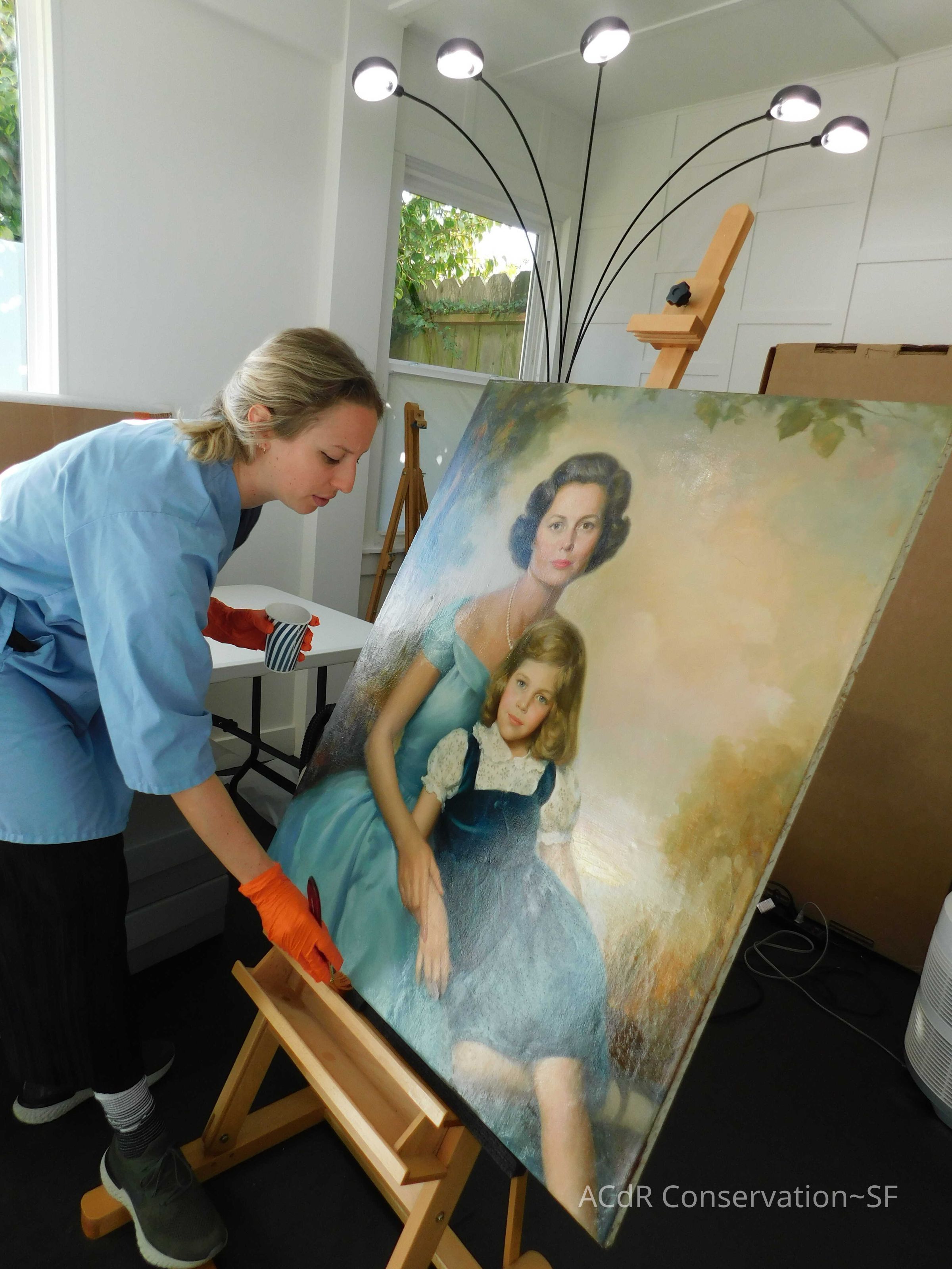 Testing and beginning varnish removal, starting at bottom right corner and moving along bottom edge. Using Naptha, 1/5th of glossy varnish removed. Blue color coming away on swabs confirmed to be due to varnish rather than pigment lifting (did not come up blue on child’s legs). Blue areas still sensitive and susceptible, so being quick in application. Finished varnish removal; reconsolidated cracks in mother’s left arm/child’s right cheek.