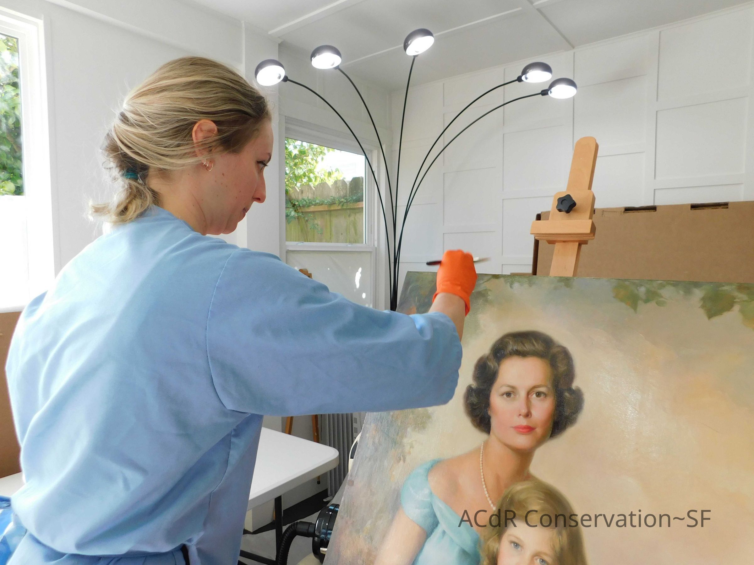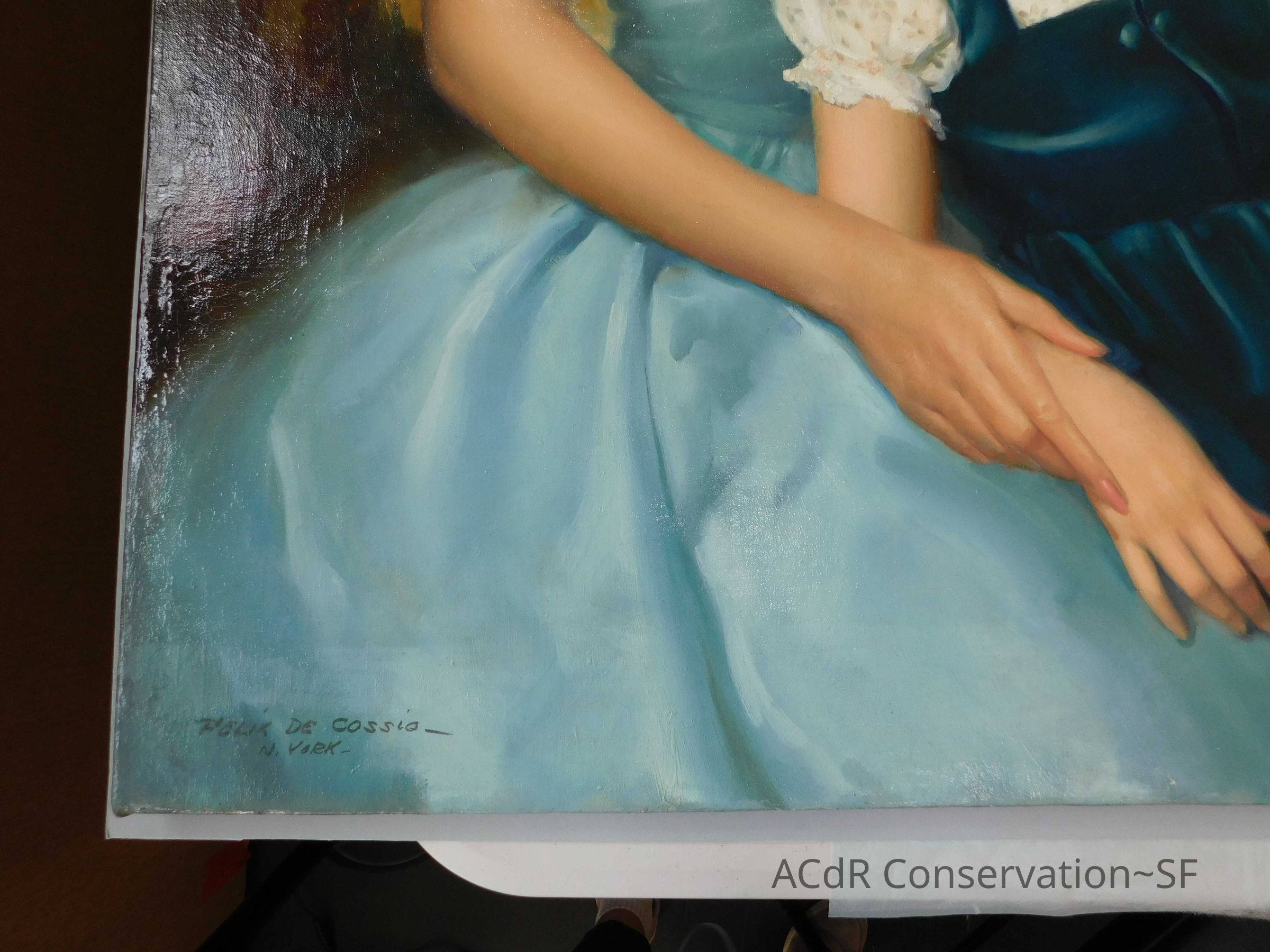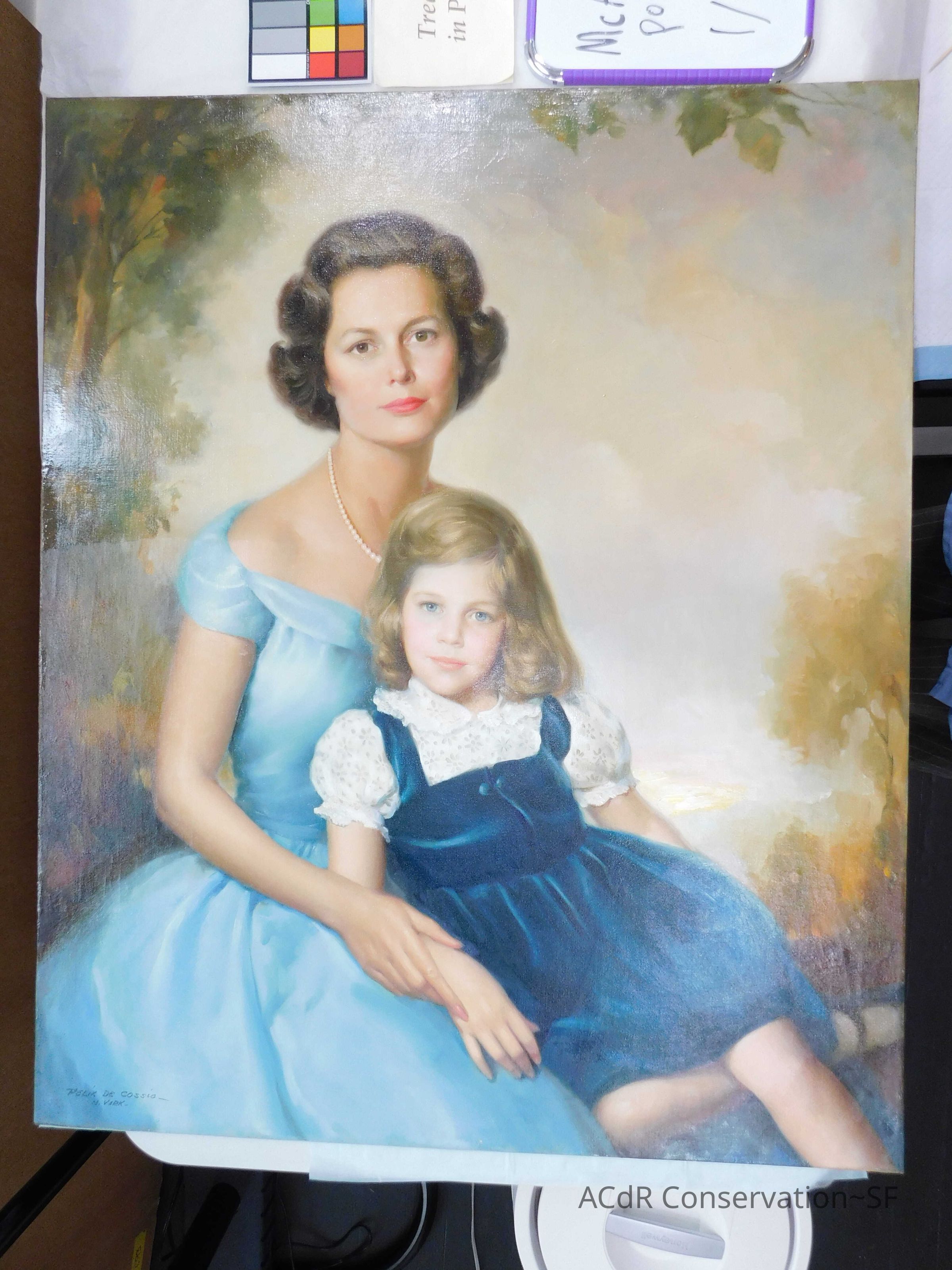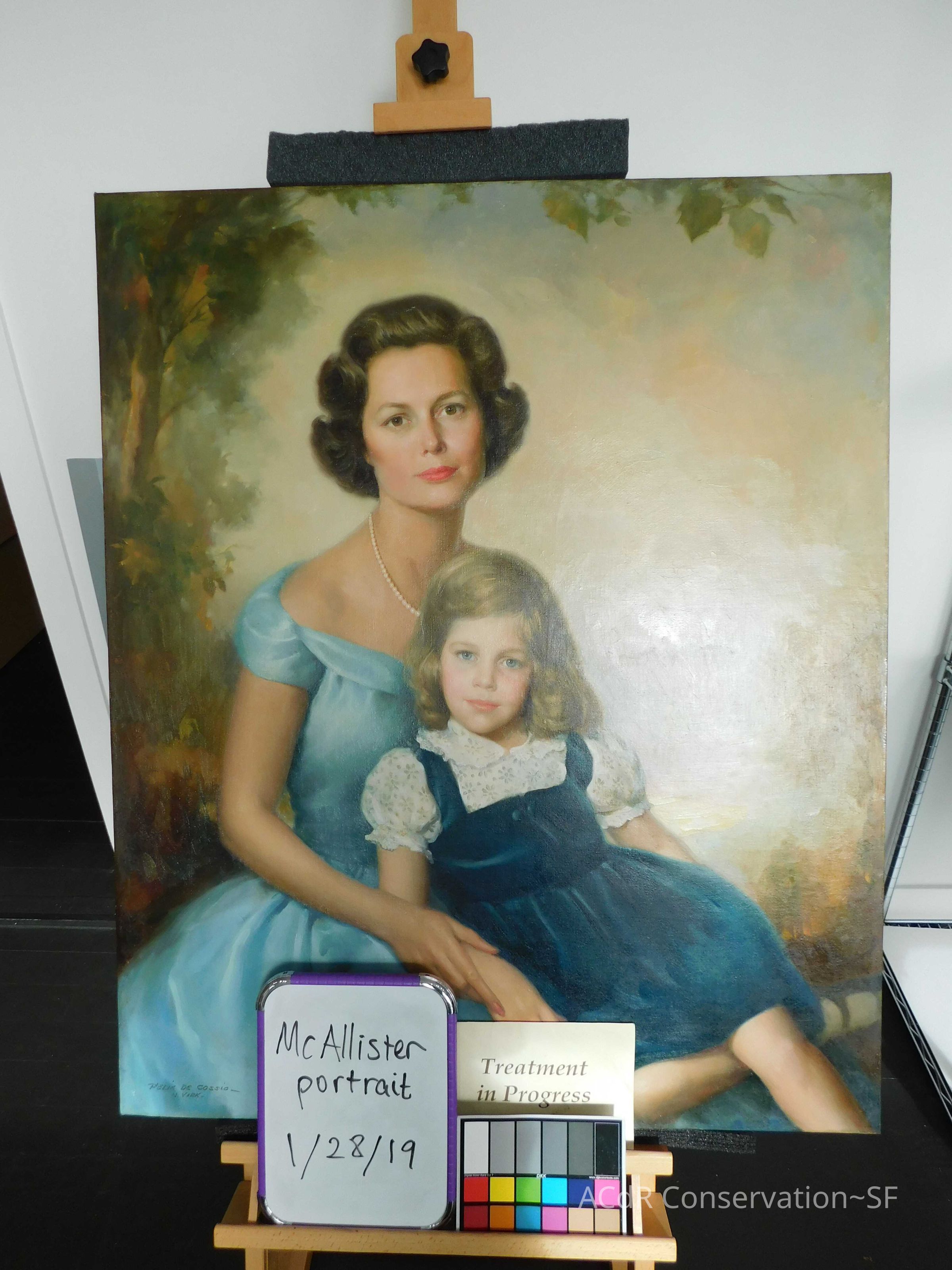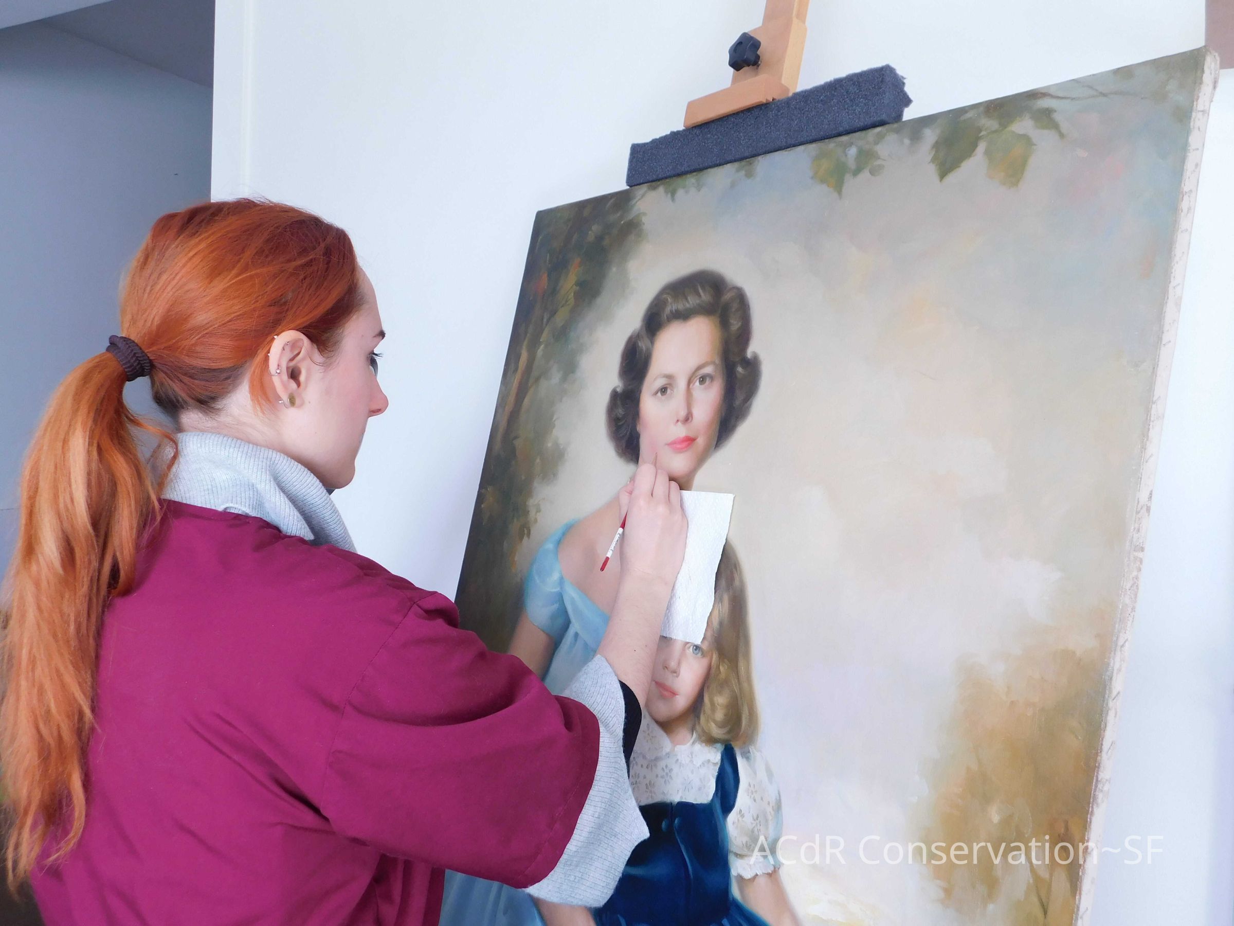 Testing and beginning varnish removal, starting at bottom right corner and moving along bottom edge. Using Naptha, 1/5th of glossy varnish removed. Blue color coming away on swabs confirmed to be due to varnish rather than pigment lifting (did not come up blue on child’s legs). Blue areas still sensitive and susceptible, so being quick in application. Finished varnish removal; reconsolidated cracks in mother’s left arm/child’s right cheek.