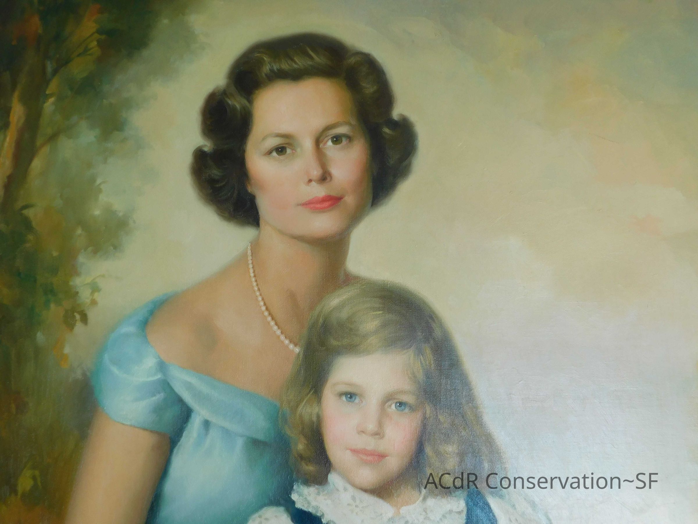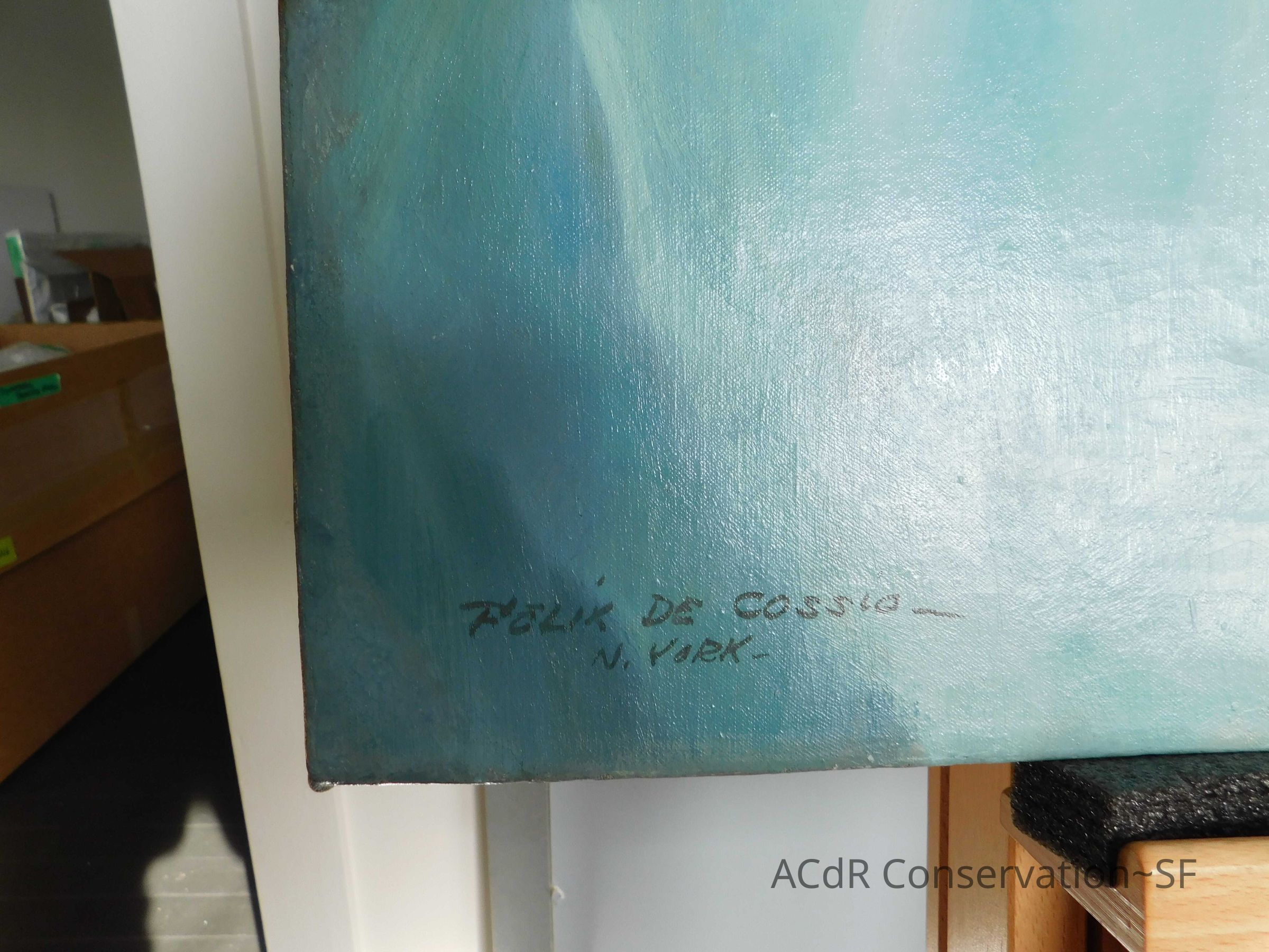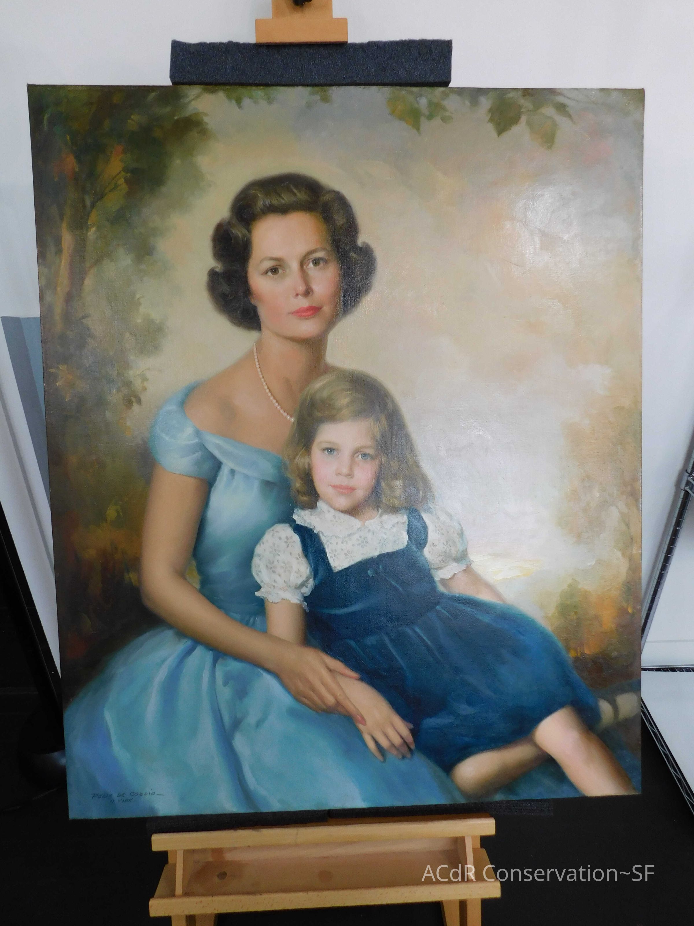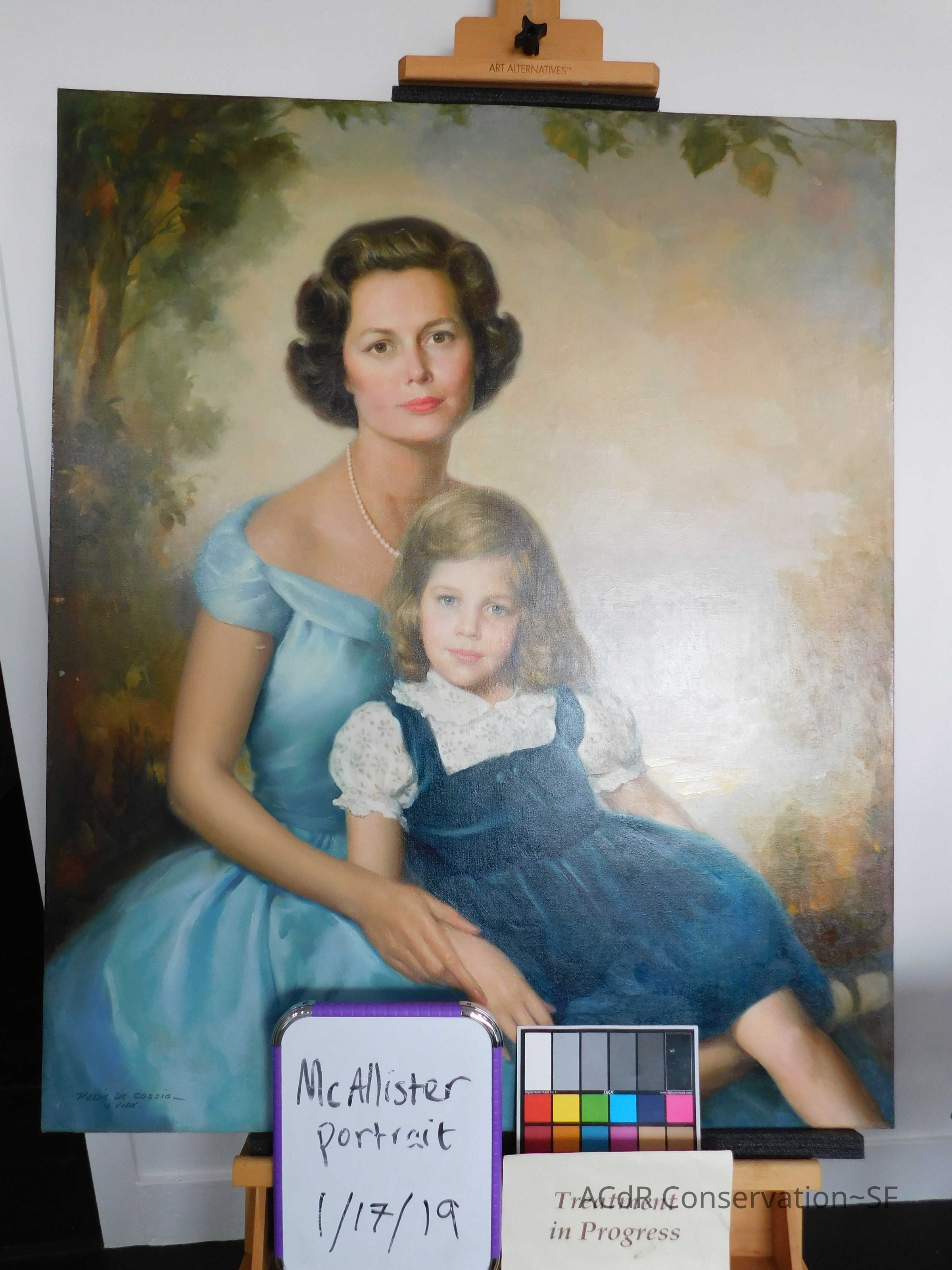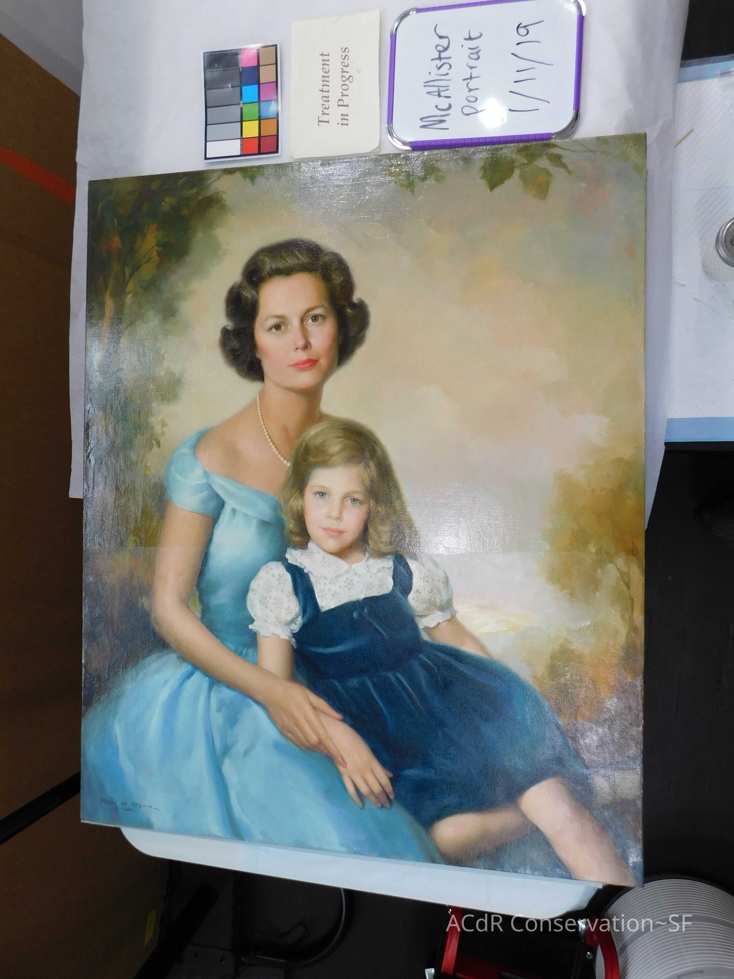 Testing and beginning varnish removal, starting at bottom right corner and moving along bottom edge. Using Naptha, 1/5th of glossy varnish removed. Blue color coming away on swabs confirmed to be due to varnish rather than pigment lifting (did not come up blue on child’s legs). Blue areas still sensitive and susceptible, so being quick in application. Finished varnish removal; reconsolidated cracks in mother’s left arm/child’s right cheek.