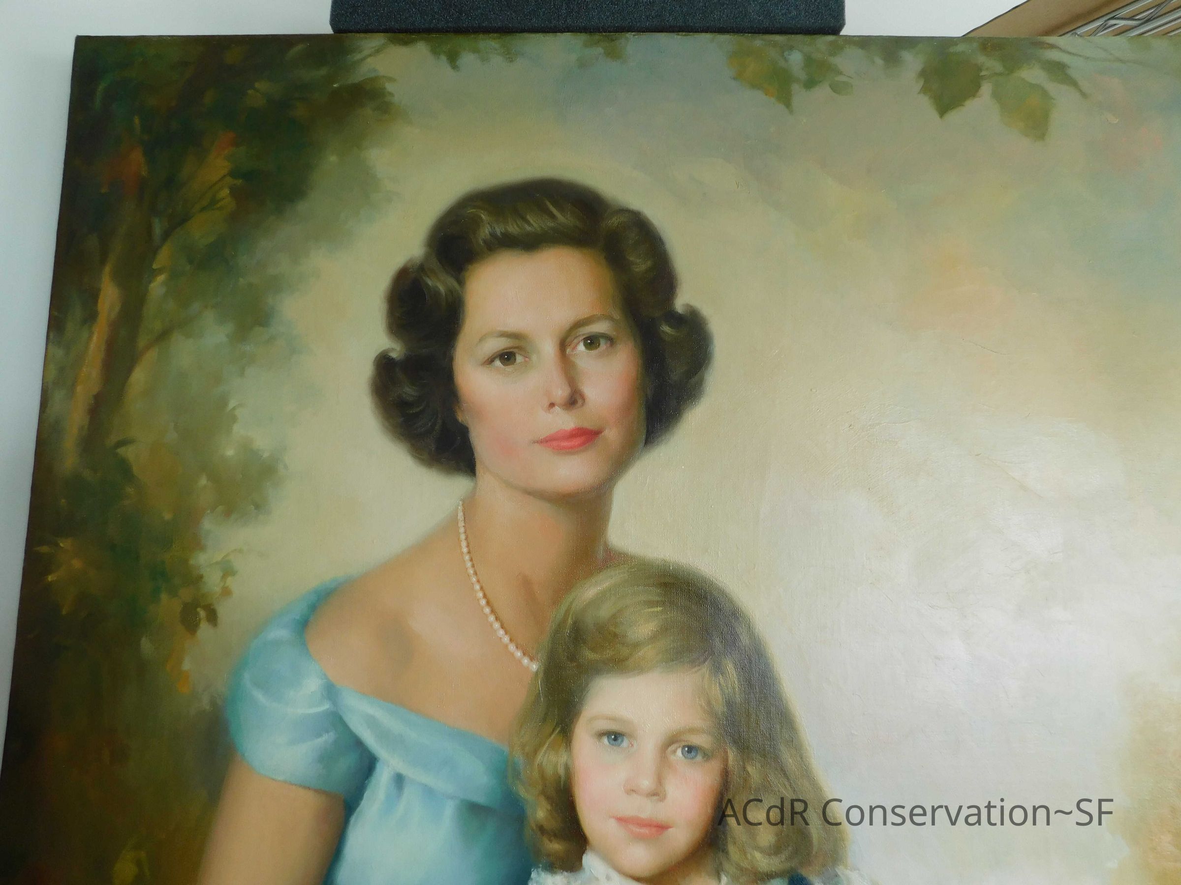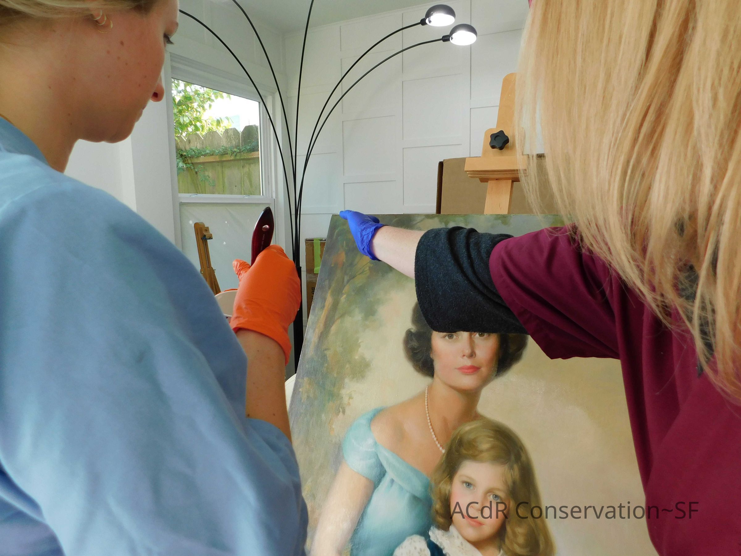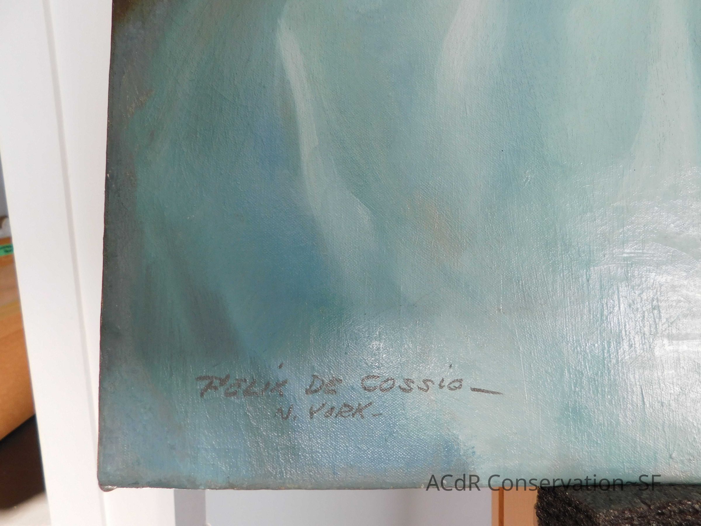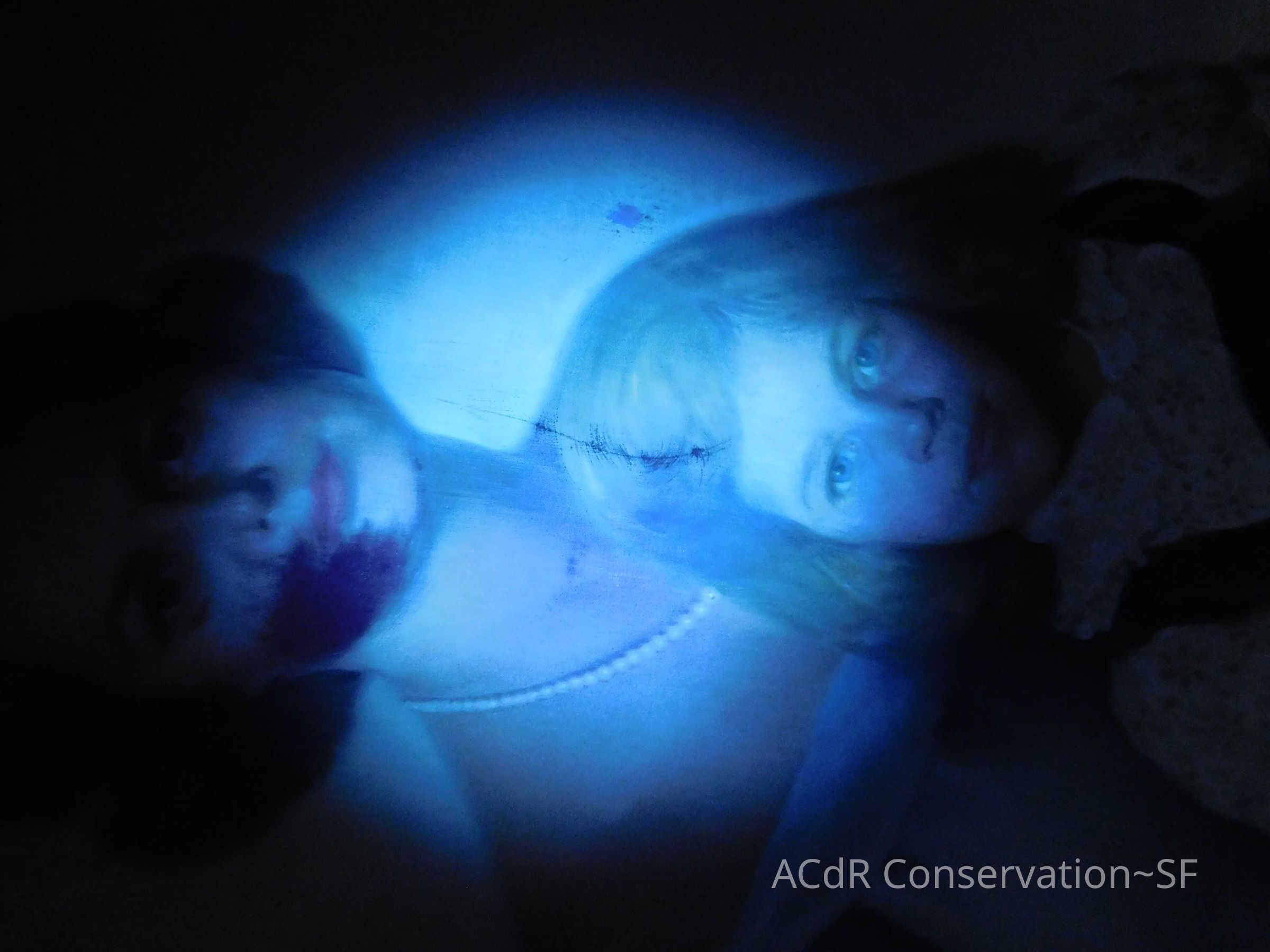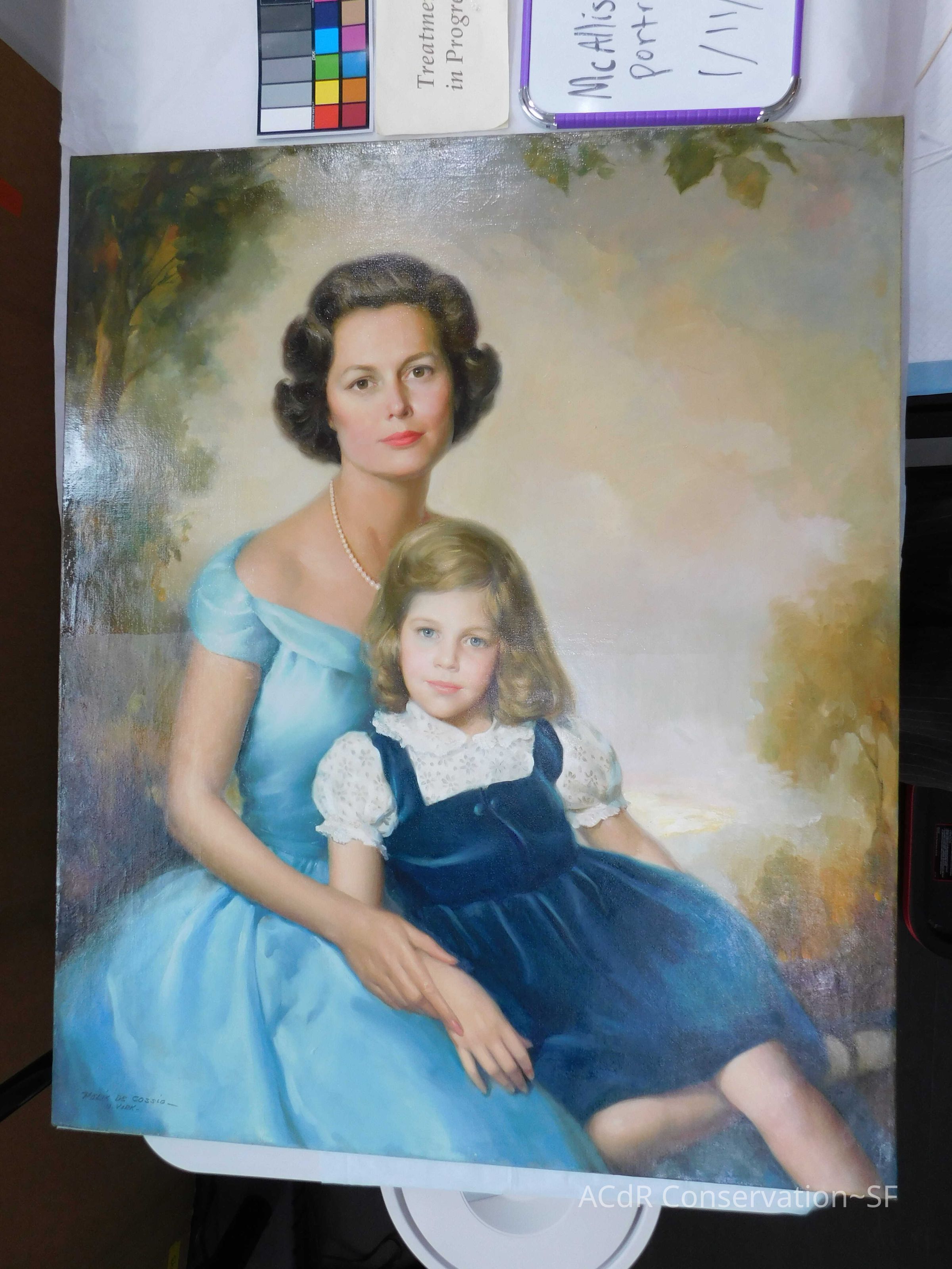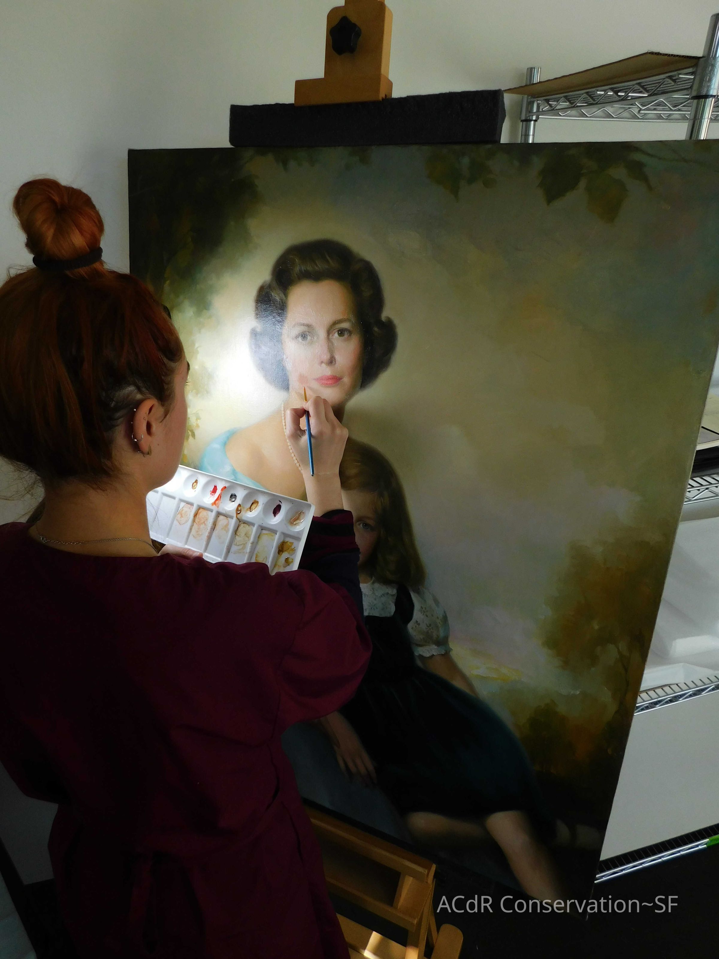 Testing and beginning varnish removal, starting at bottom right corner and moving along bottom edge. Using Naptha, 1/5th of glossy varnish removed. Blue color coming away on swabs confirmed to be due to varnish rather than pigment lifting (did not come up blue on child’s legs). Blue areas still sensitive and susceptible, so being quick in application. Finished varnish removal; reconsolidated cracks in mother’s left arm/child’s right cheek.