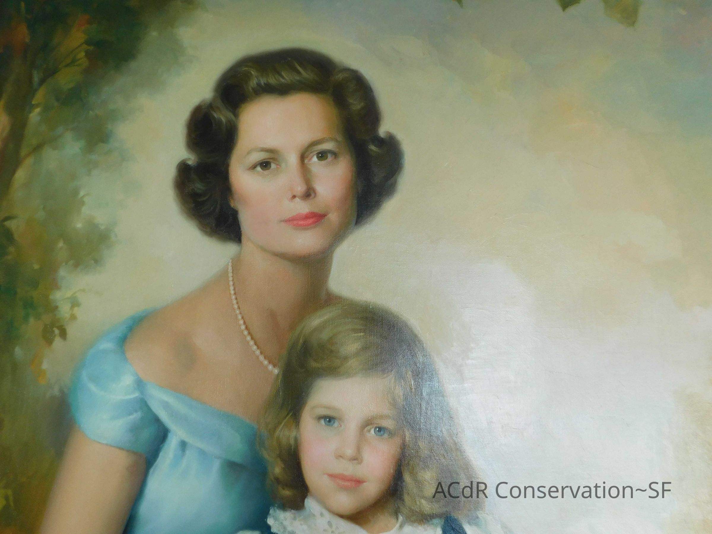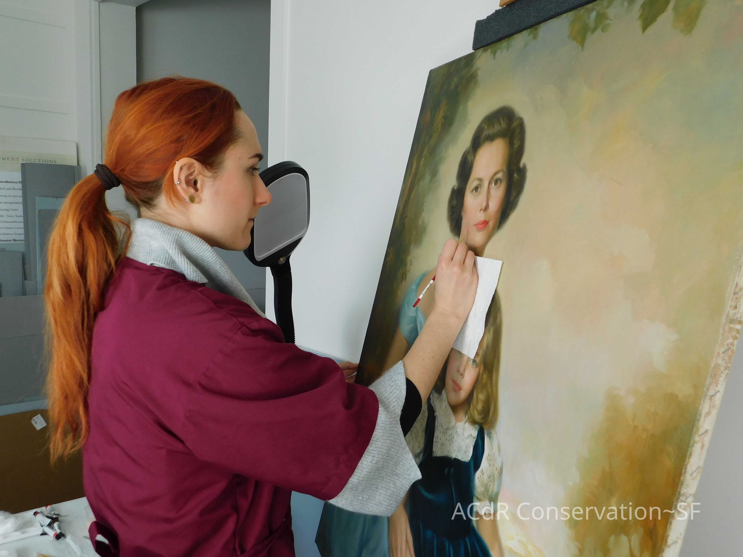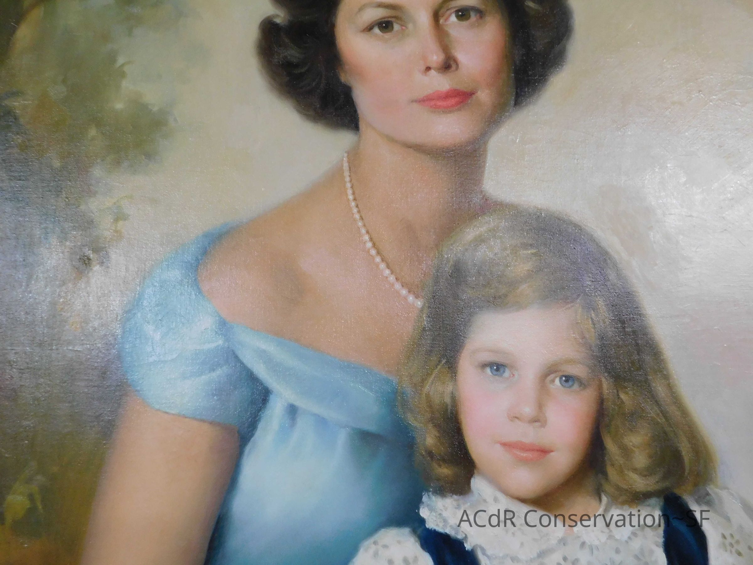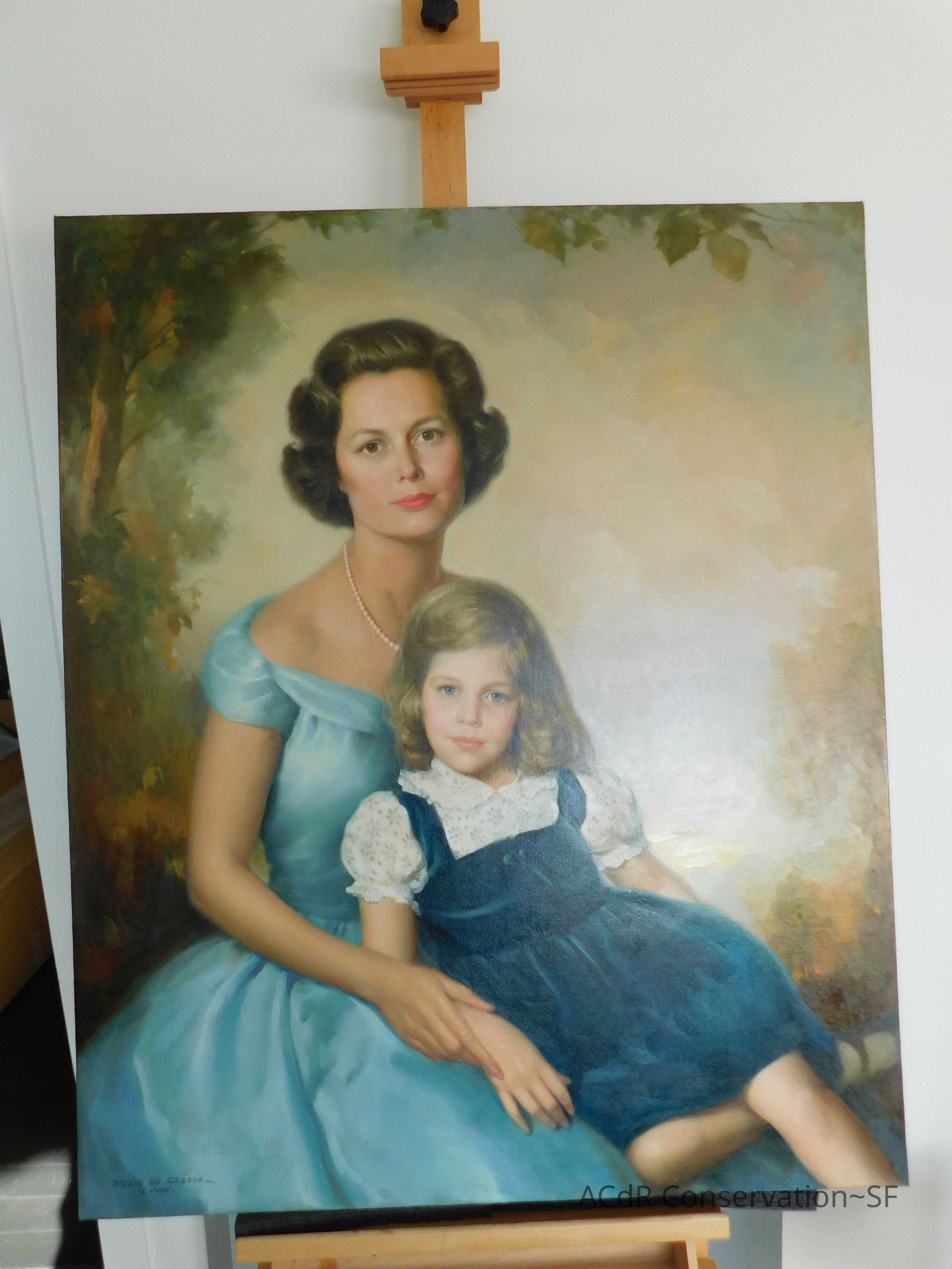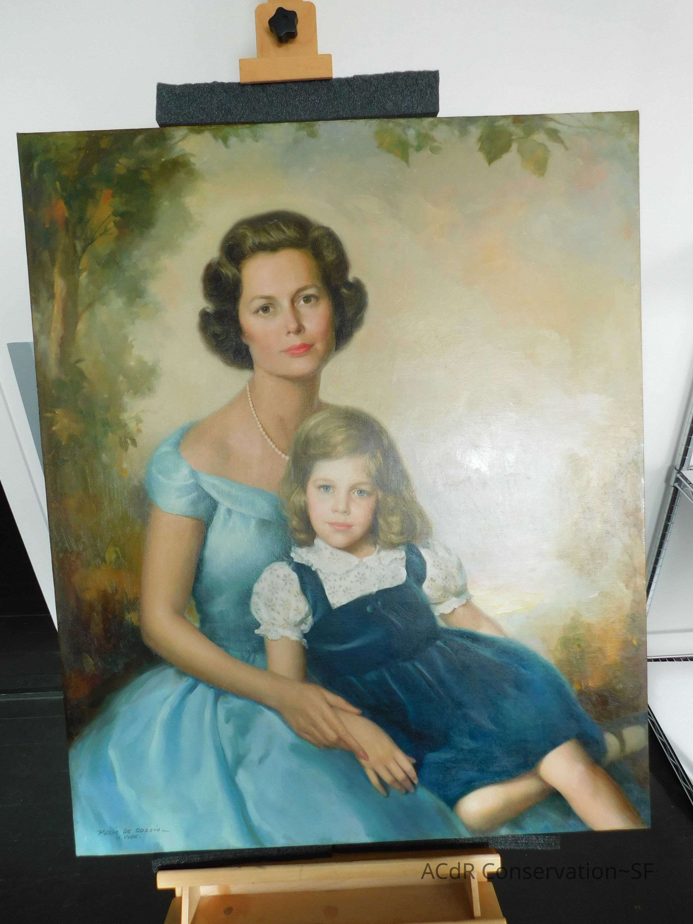 Testing and beginning varnish removal, starting at bottom right corner and moving along bottom edge. Using Naptha, 1/5th of glossy varnish removed. Blue color coming away on swabs confirmed to be due to varnish rather than pigment lifting (did not come up blue on child’s legs). Blue areas still sensitive and susceptible, so being quick in application. Finished varnish removal; reconsolidated cracks in mother’s left arm/child’s right cheek.